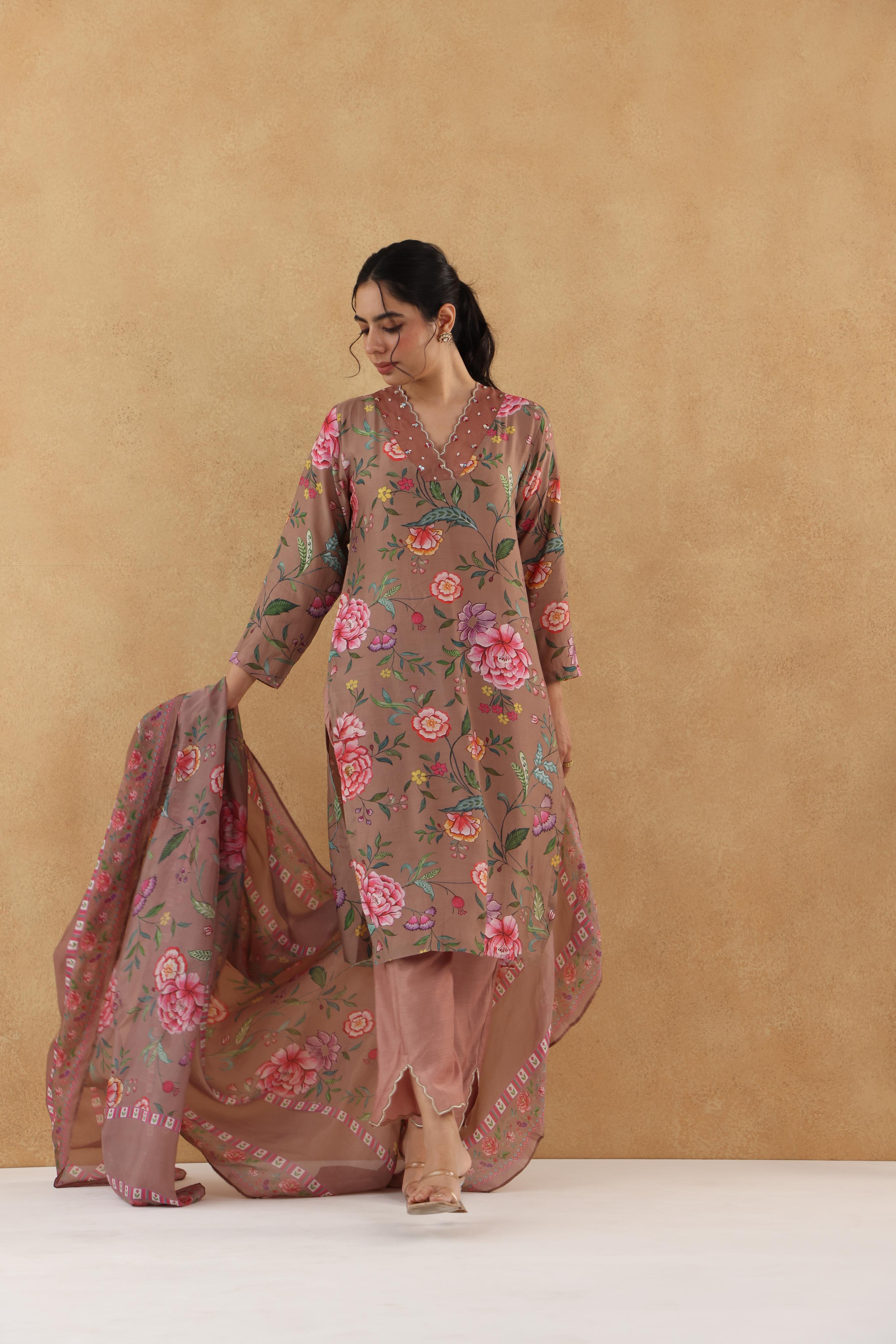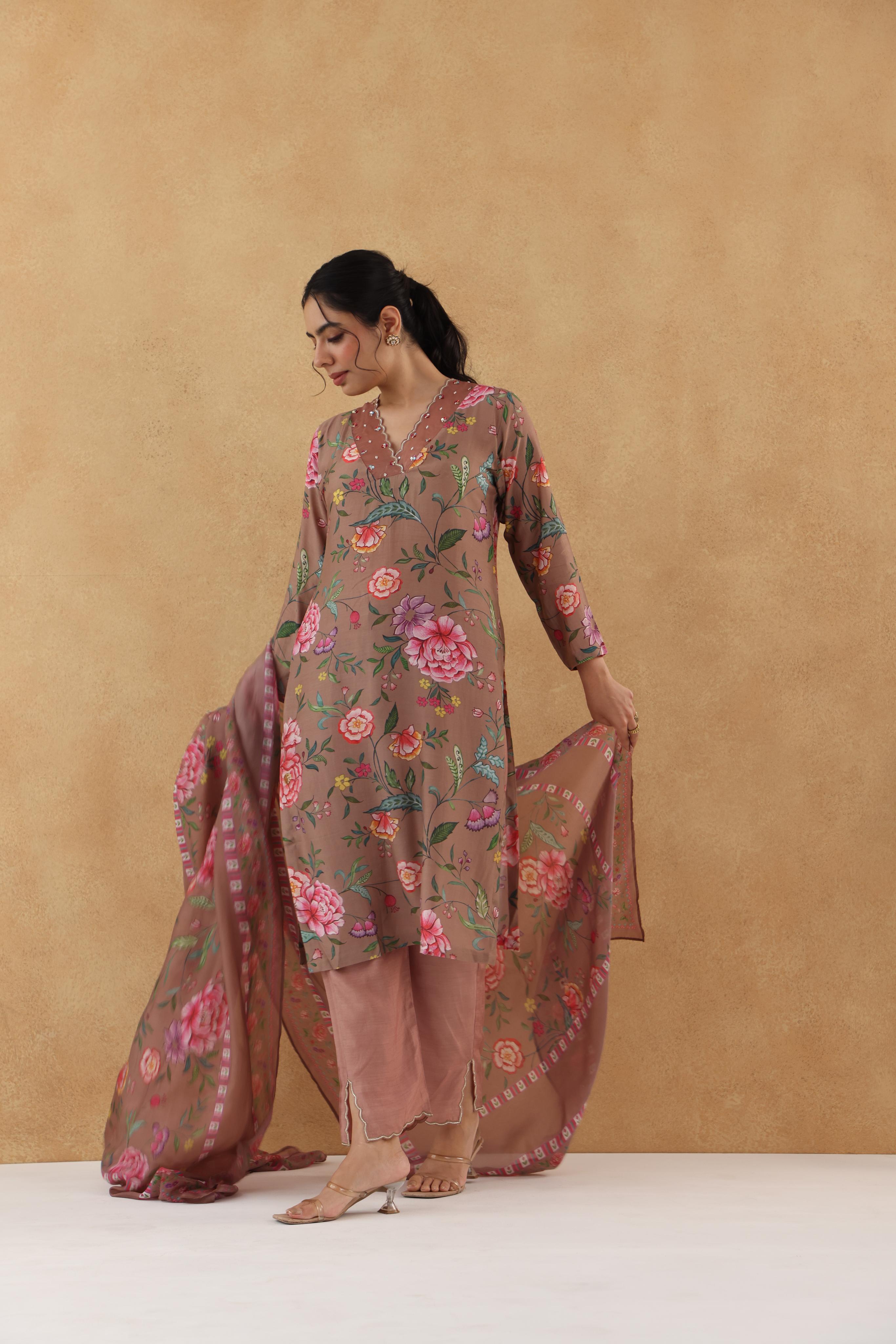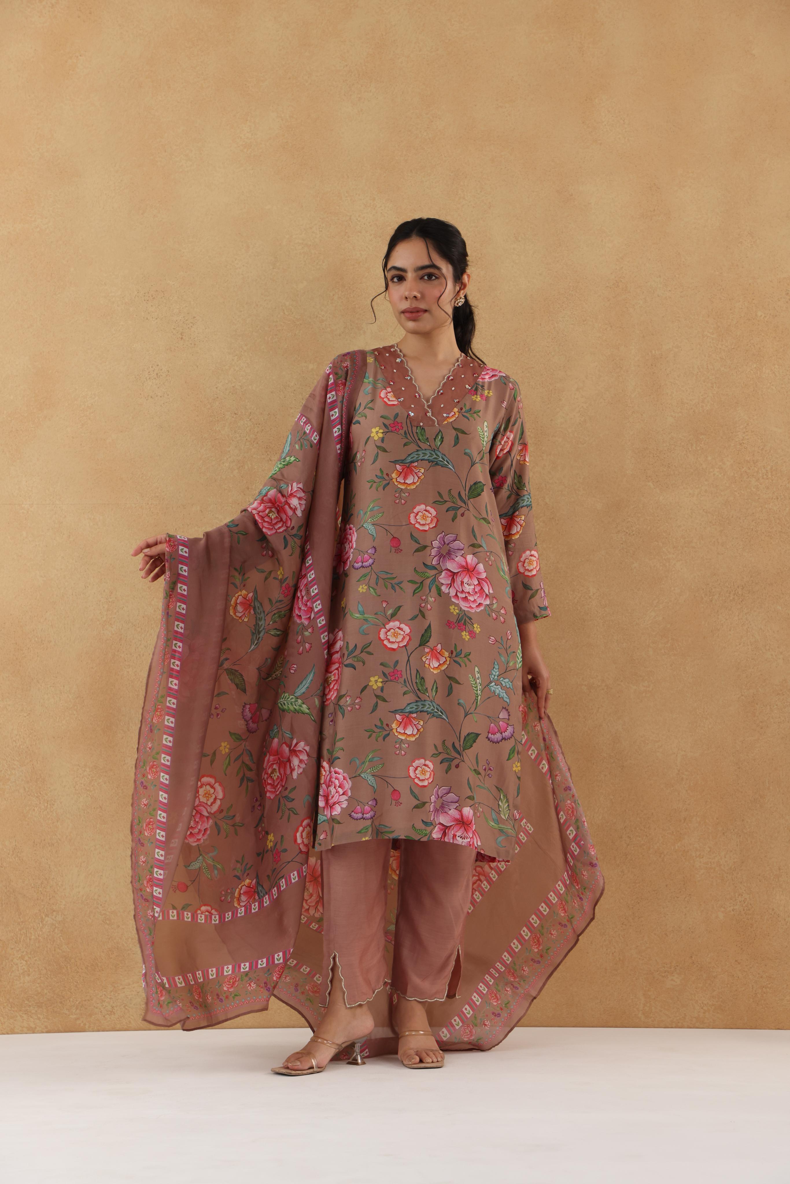 Expertly crafted from luxurious cotton silk, the AKS BROWN KURTA SET is adorned with intricate hand embroidery on flattering V-neckline. Paired with scalloped edge cotton silk pants and a digital printed silk dupatta, this set exudes elegance and sophistication. Elevate your wardrobe with this versatile and stylish ensemble.