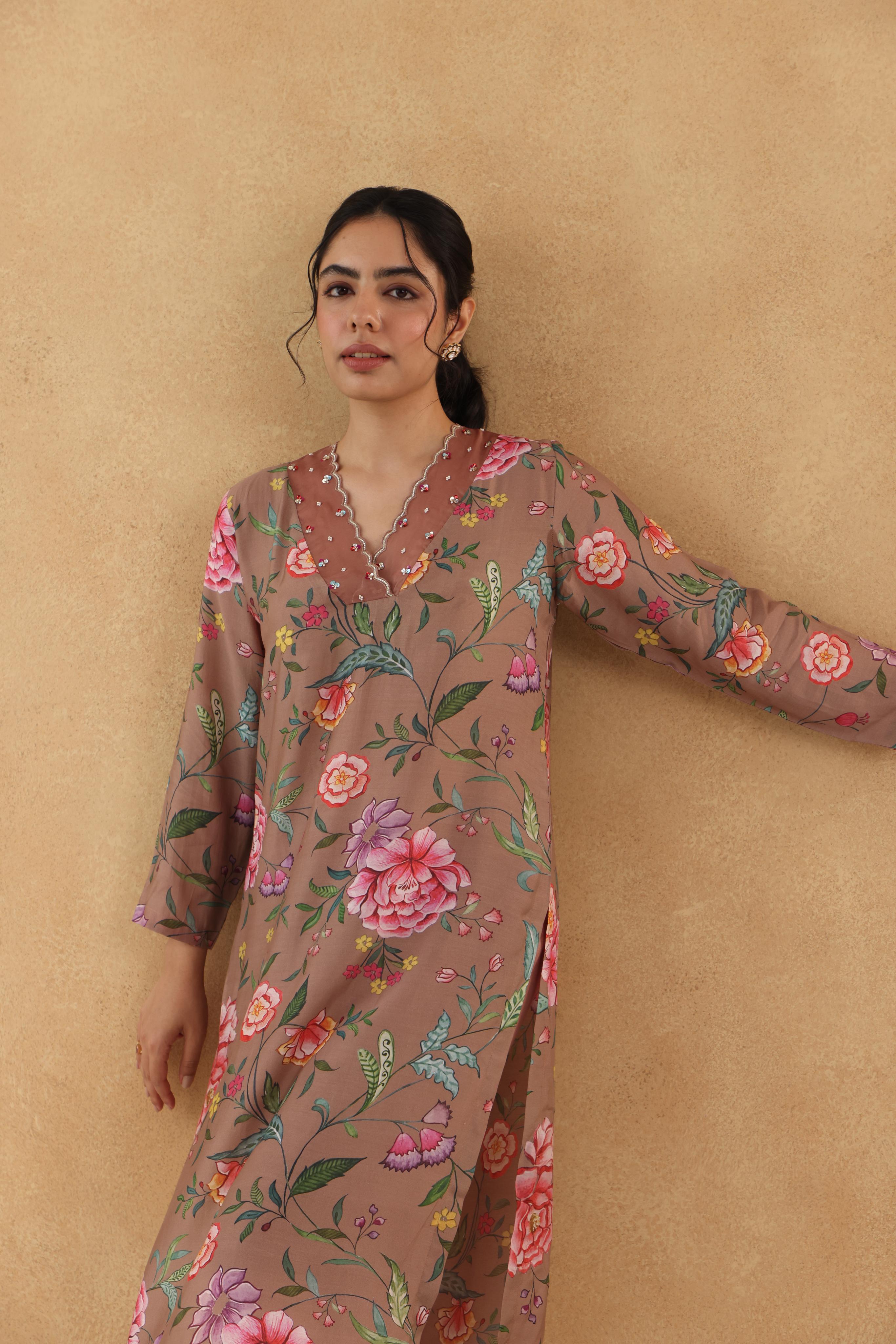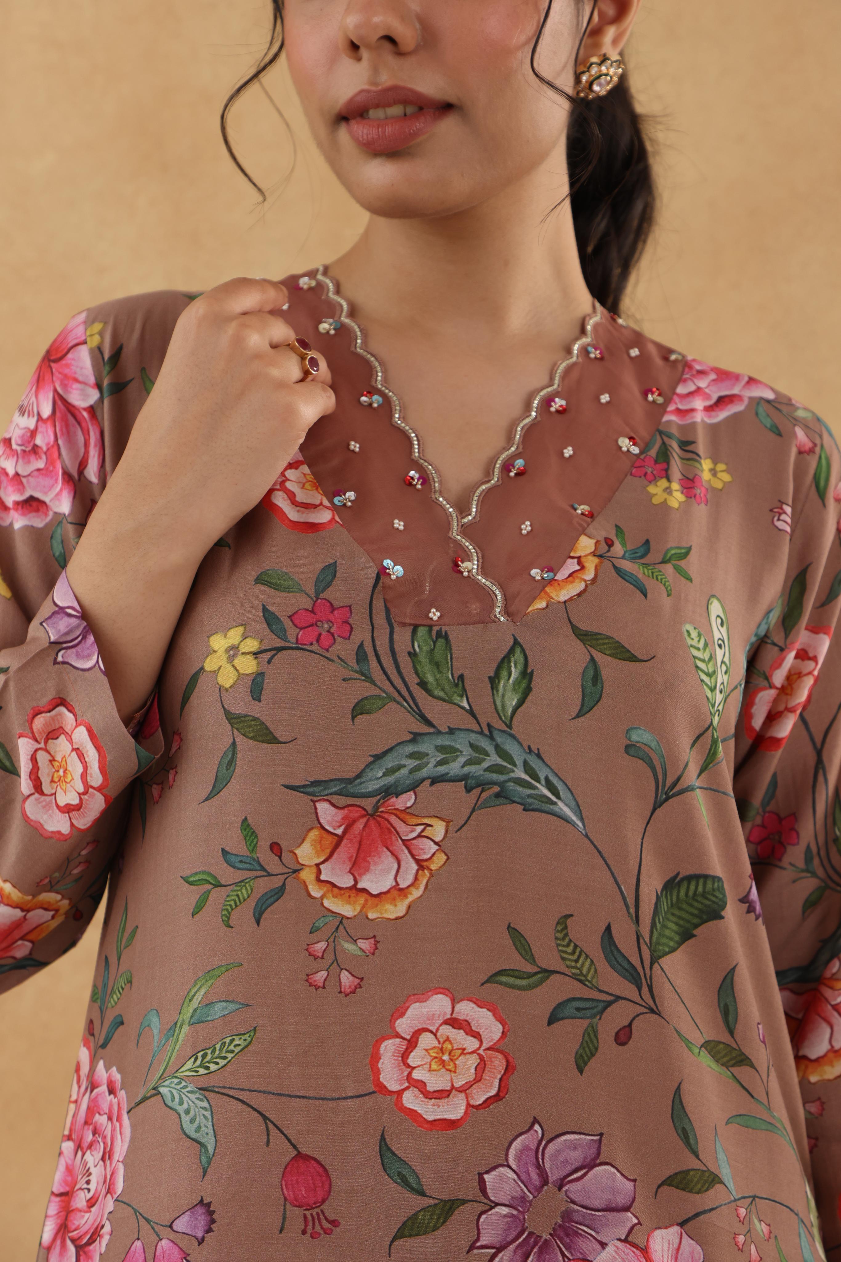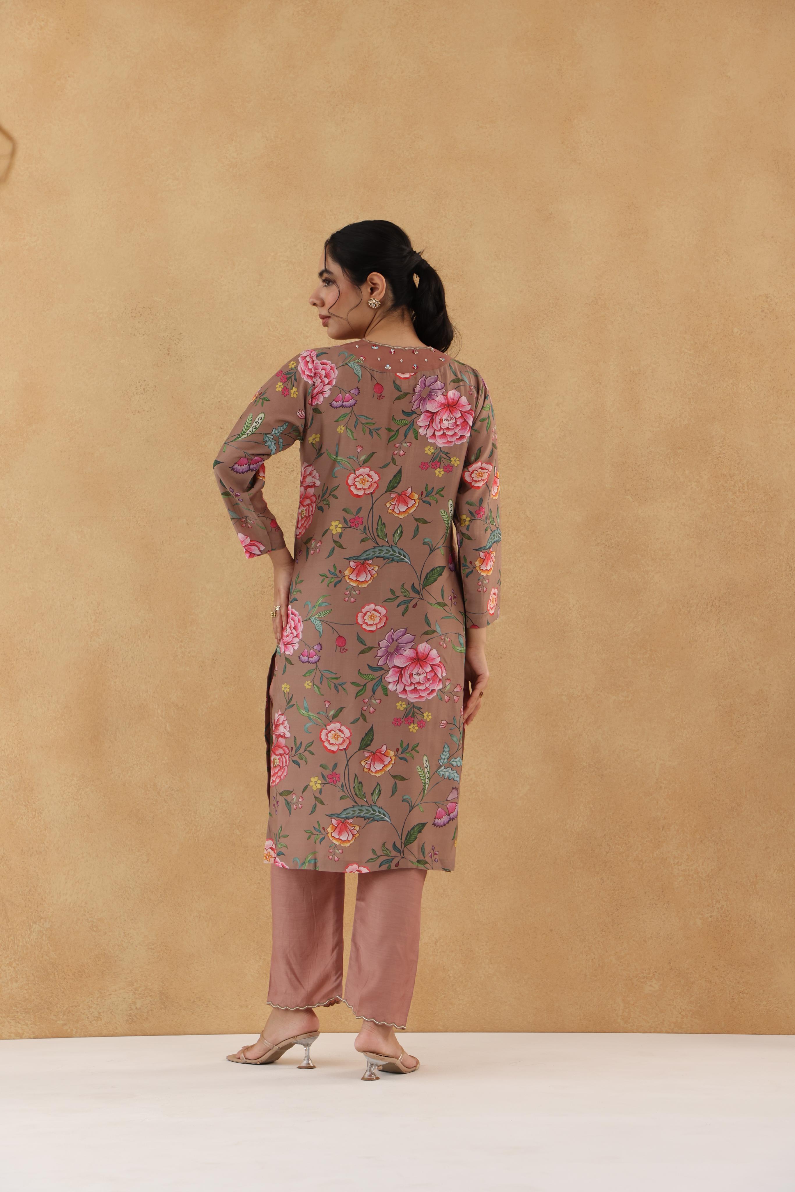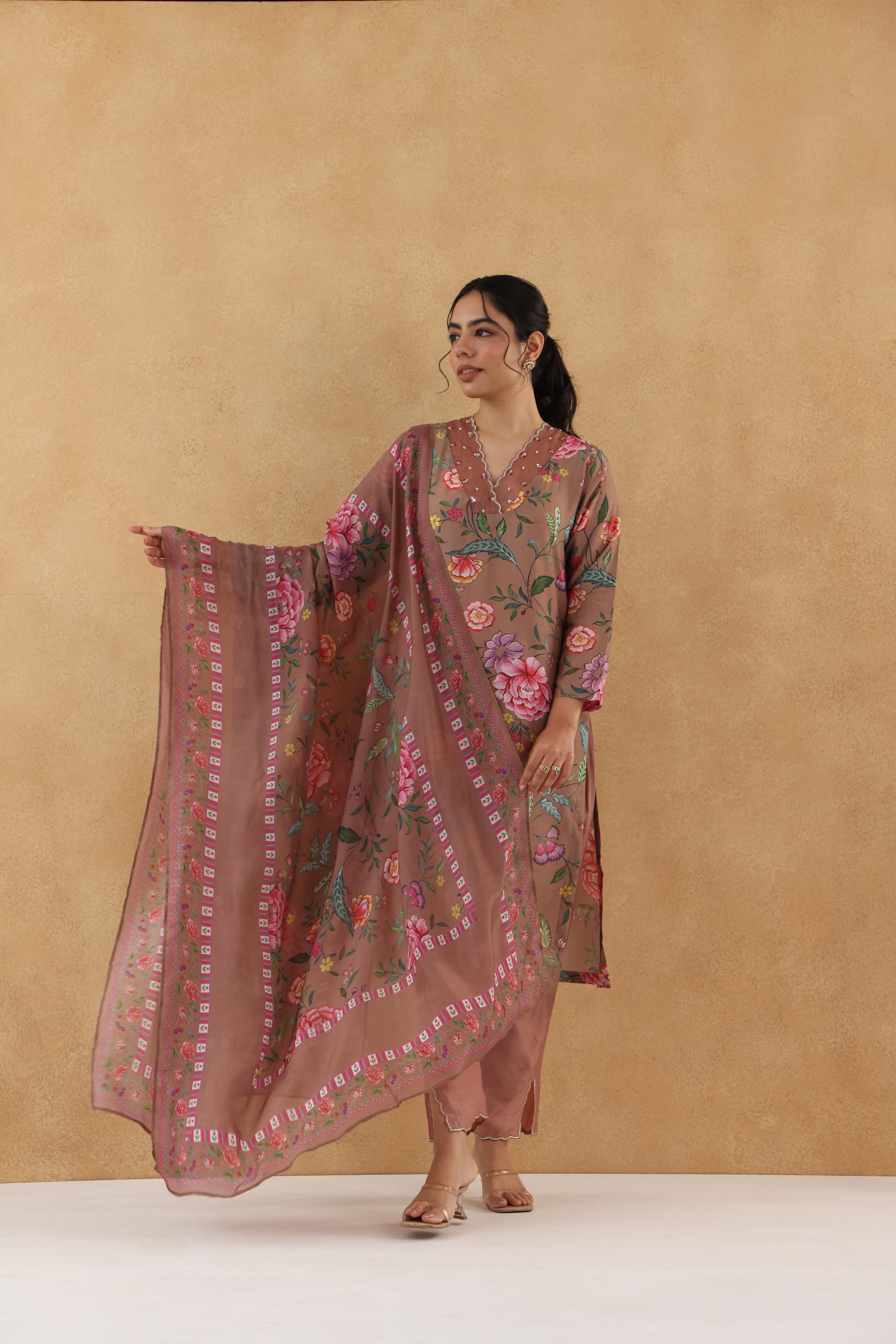 Expertly crafted from luxurious cotton silk, the AKS BROWN KURTA SET is adorned with intricate hand embroidery on flattering V-neckline. Paired with scalloped edge cotton silk pants and a digital printed silk dupatta, this set exudes elegance and sophistication. Elevate your wardrobe with this versatile and stylish ensemble.