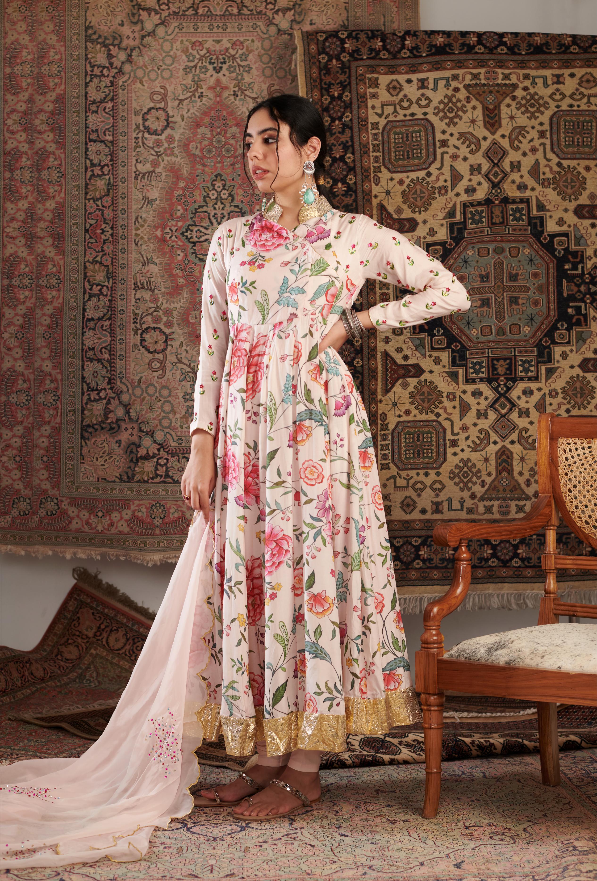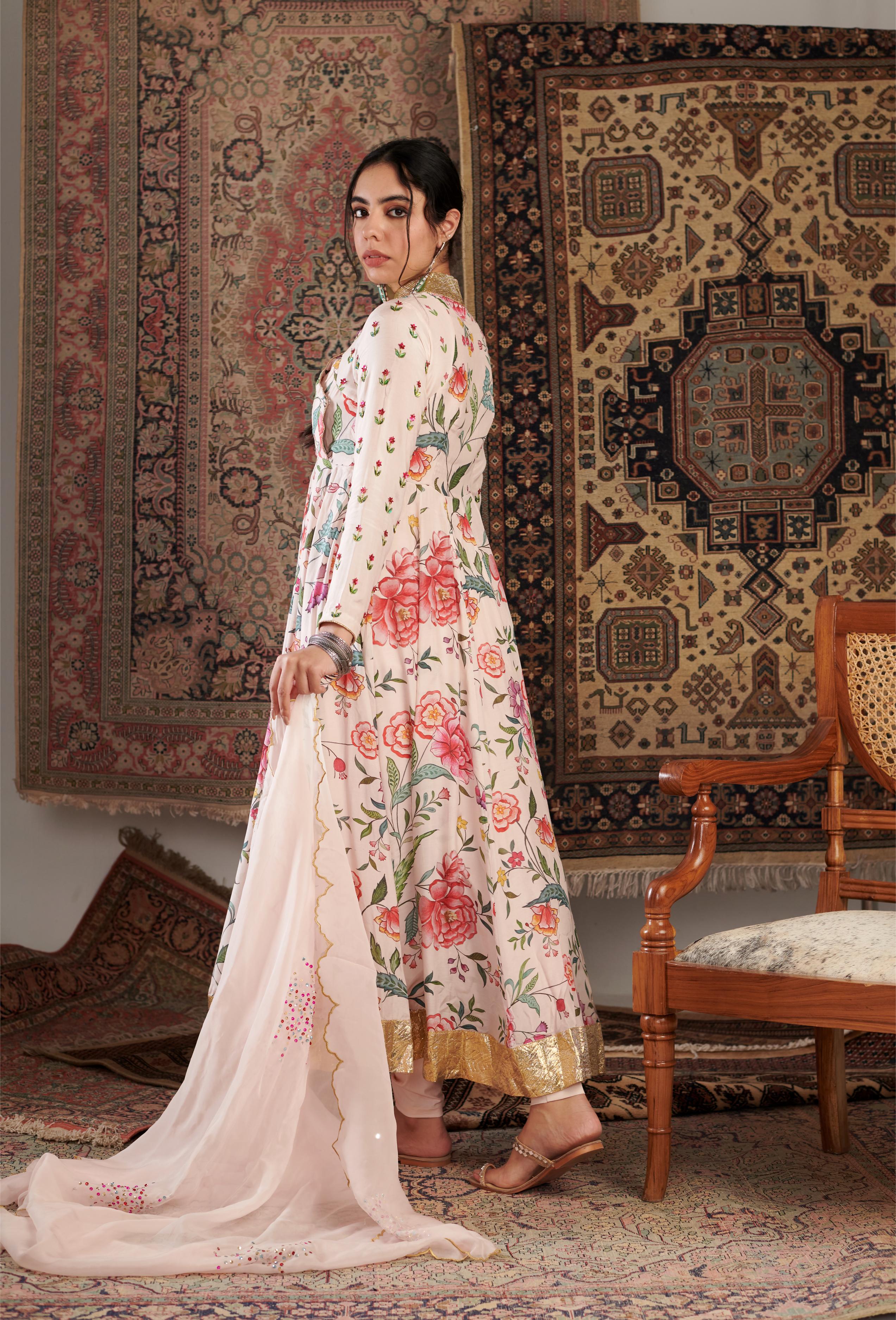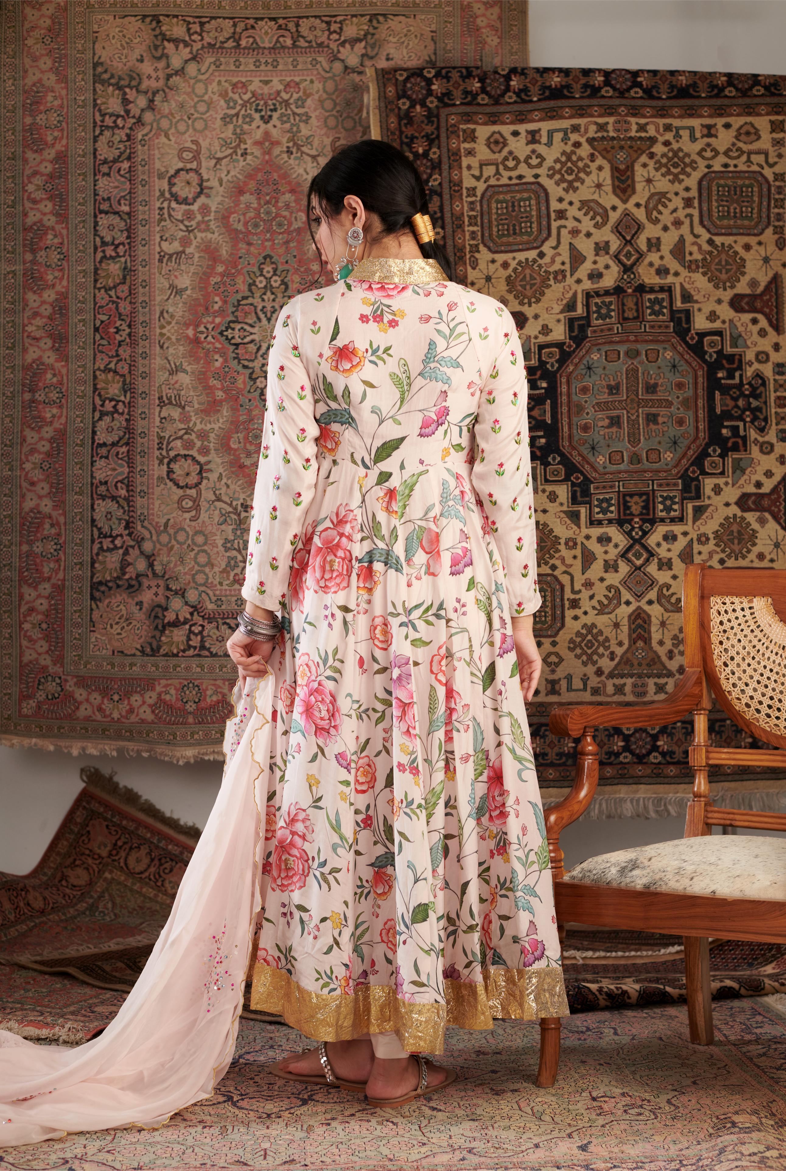 Presenting to you the AKS IVORY ANARKALI SET. Made with comfortable cotton silk and attached mul lining, this Anarkali features exquisite hand embroidery on the sleeves, highlighted by gotta lace on the hemline and collar. Accompanied by a lycra choodidar and a lovely organza dupatta, finished with delicate hand embroidery and scalloped edges.