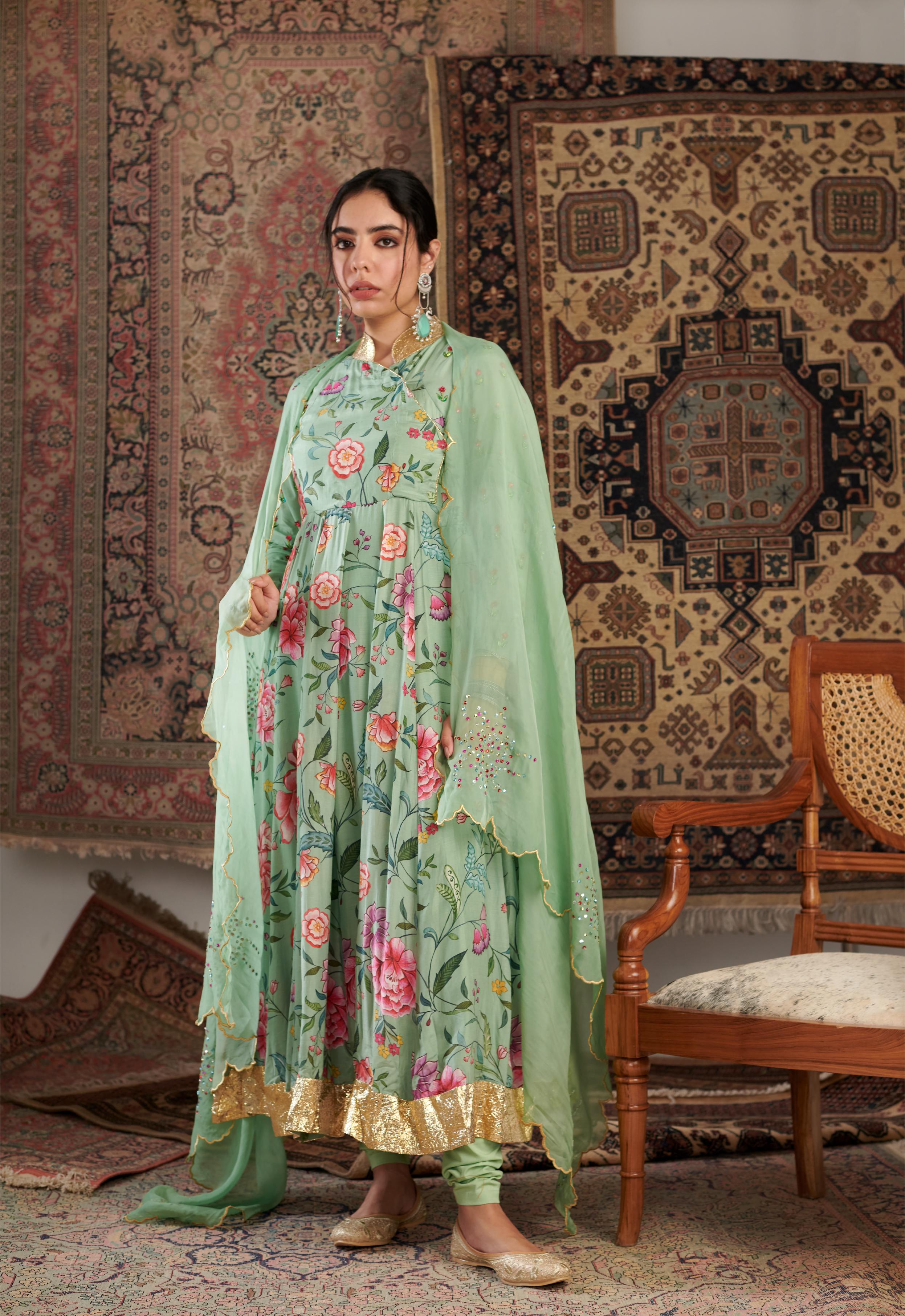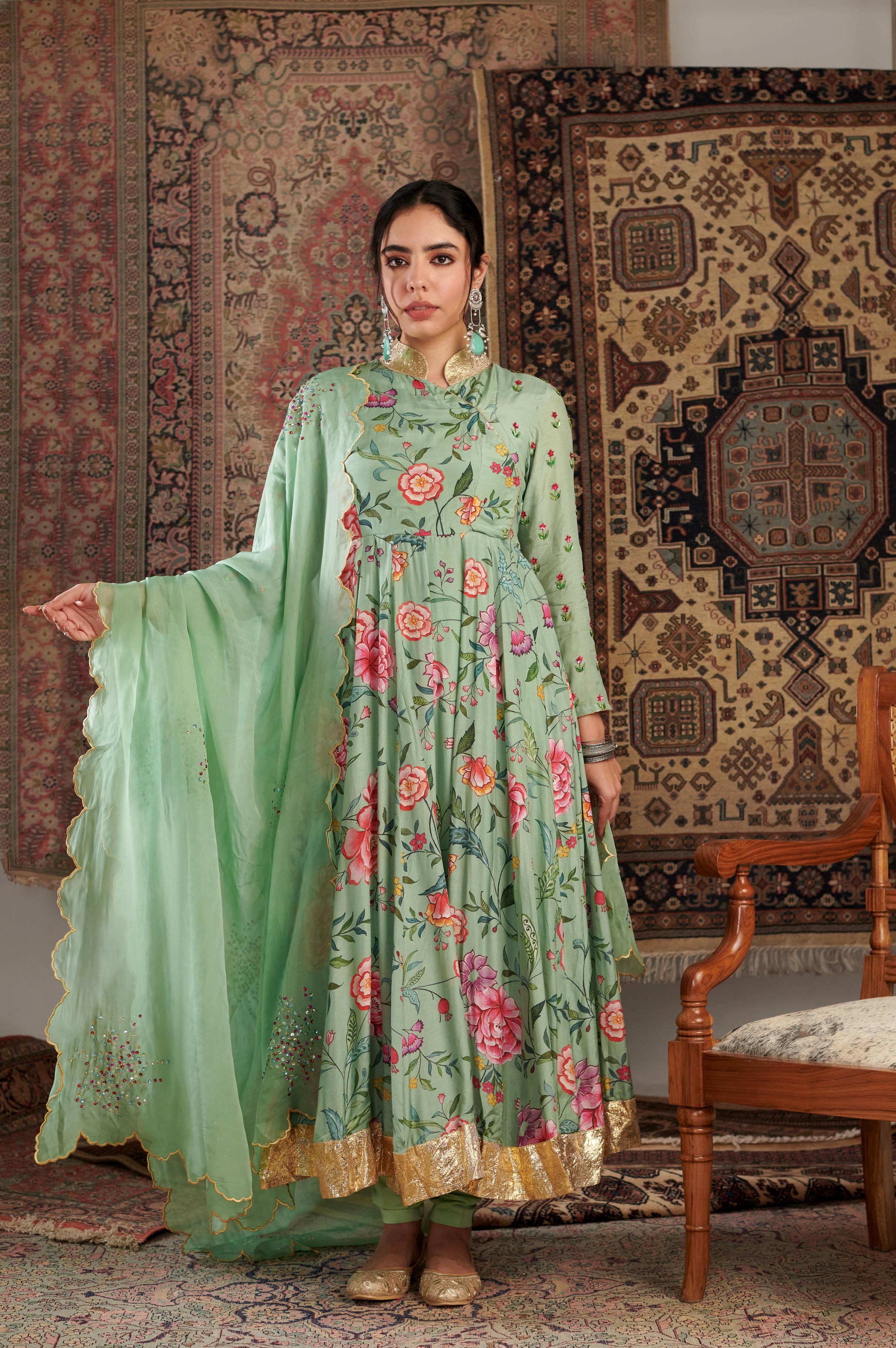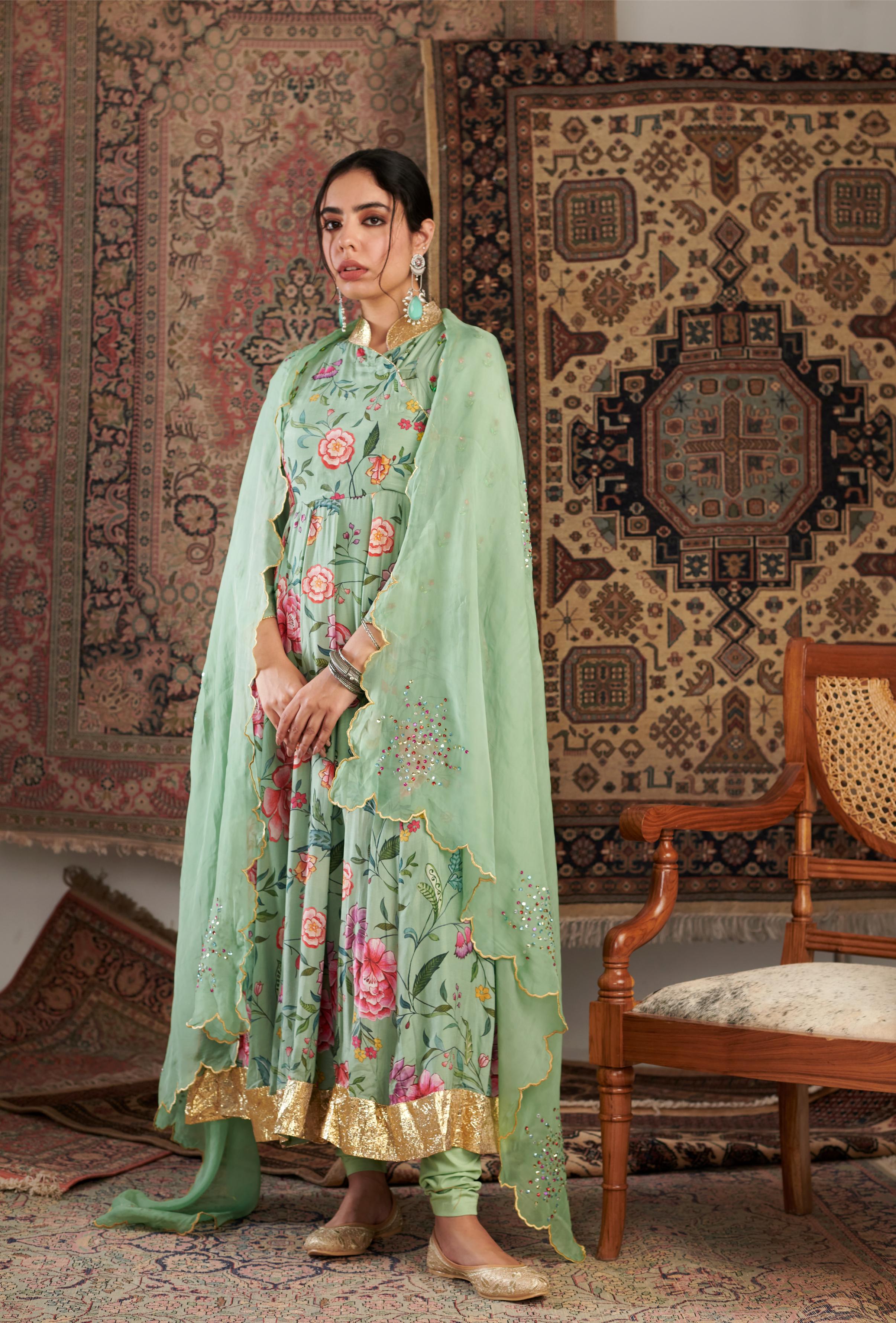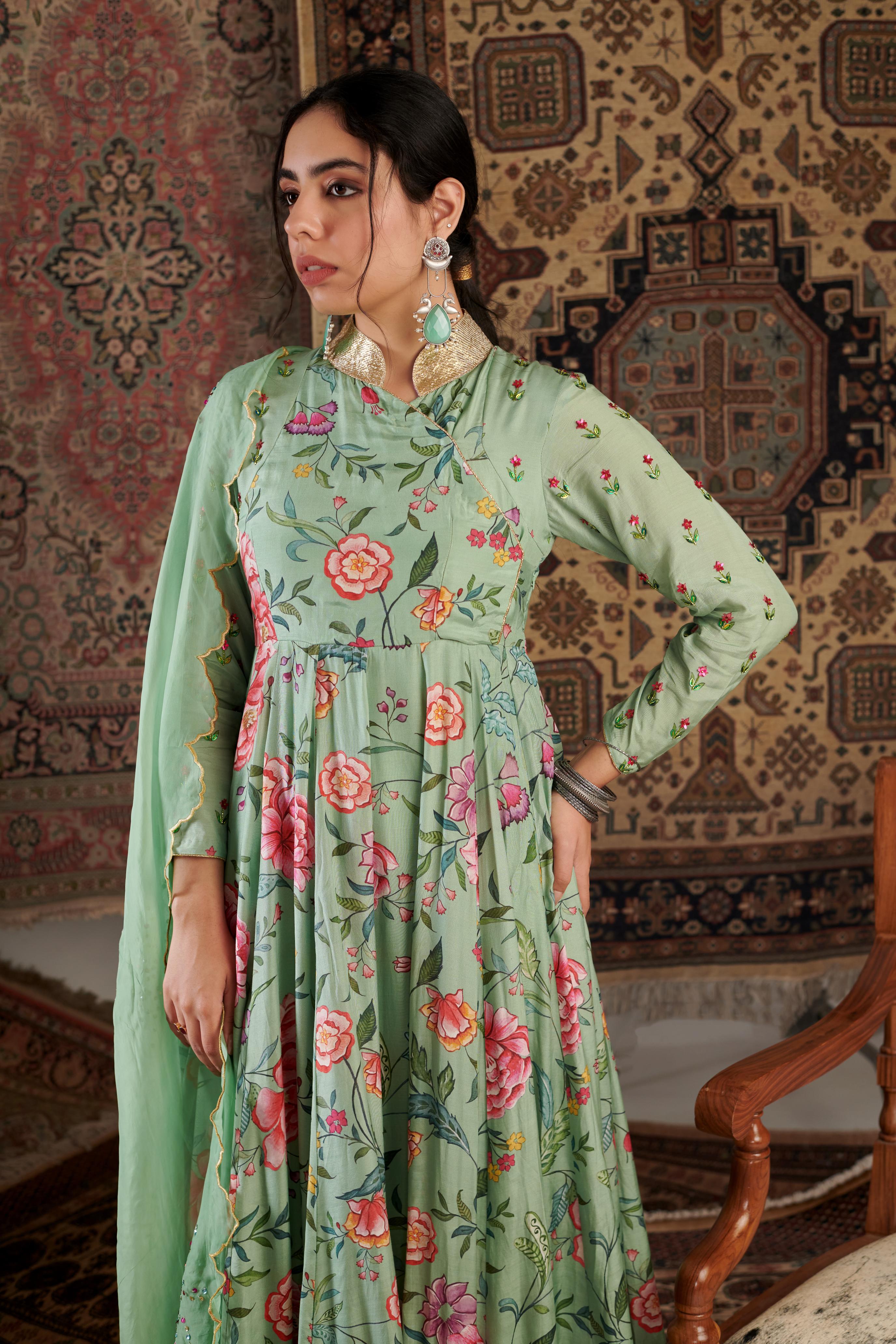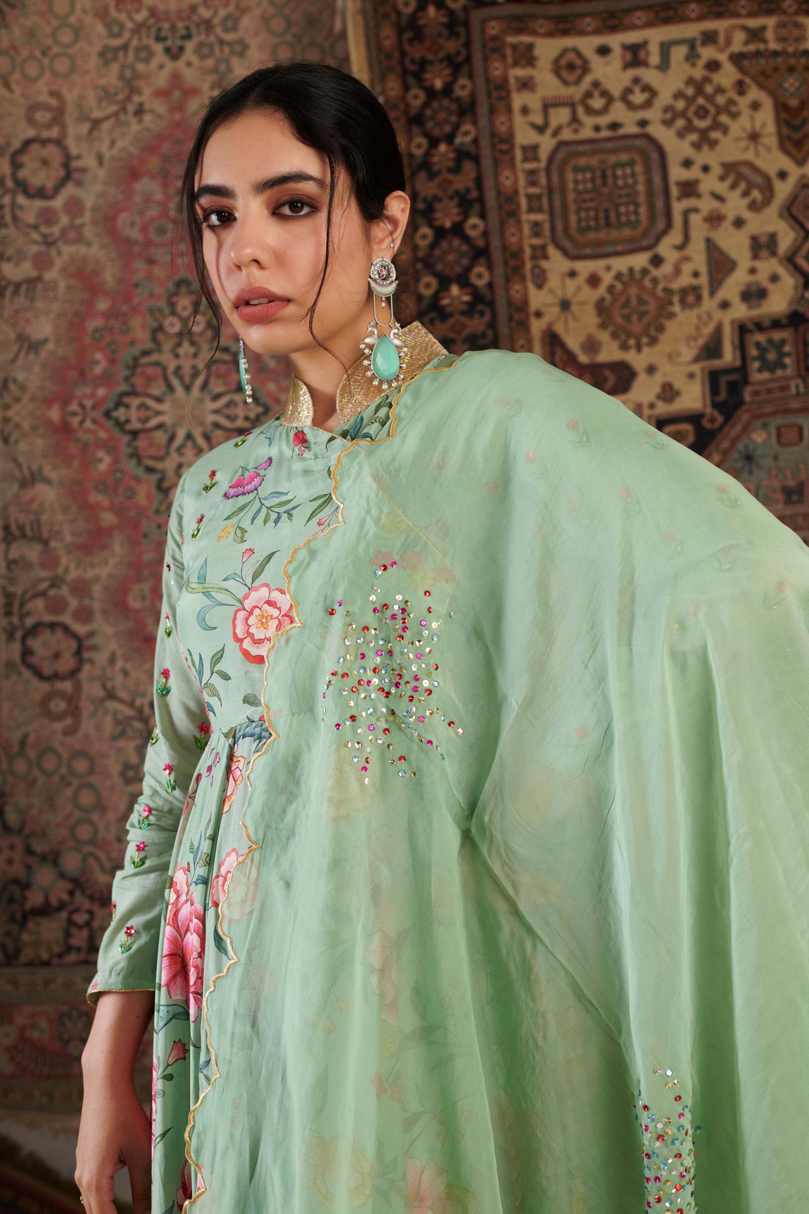 Presenting to you the AKS MINT GREEN ANARKALI SET. Made with comfortable cotton silk and attached mul lining, this Anarkali features exquisite hand embroidery on the sleeves, highlighted by gotta lace on the hemline and collar. Accompanied by a lycra choodidar and a lovely organza dupatta, finished with delicate hand embroidery and scalloped edges.