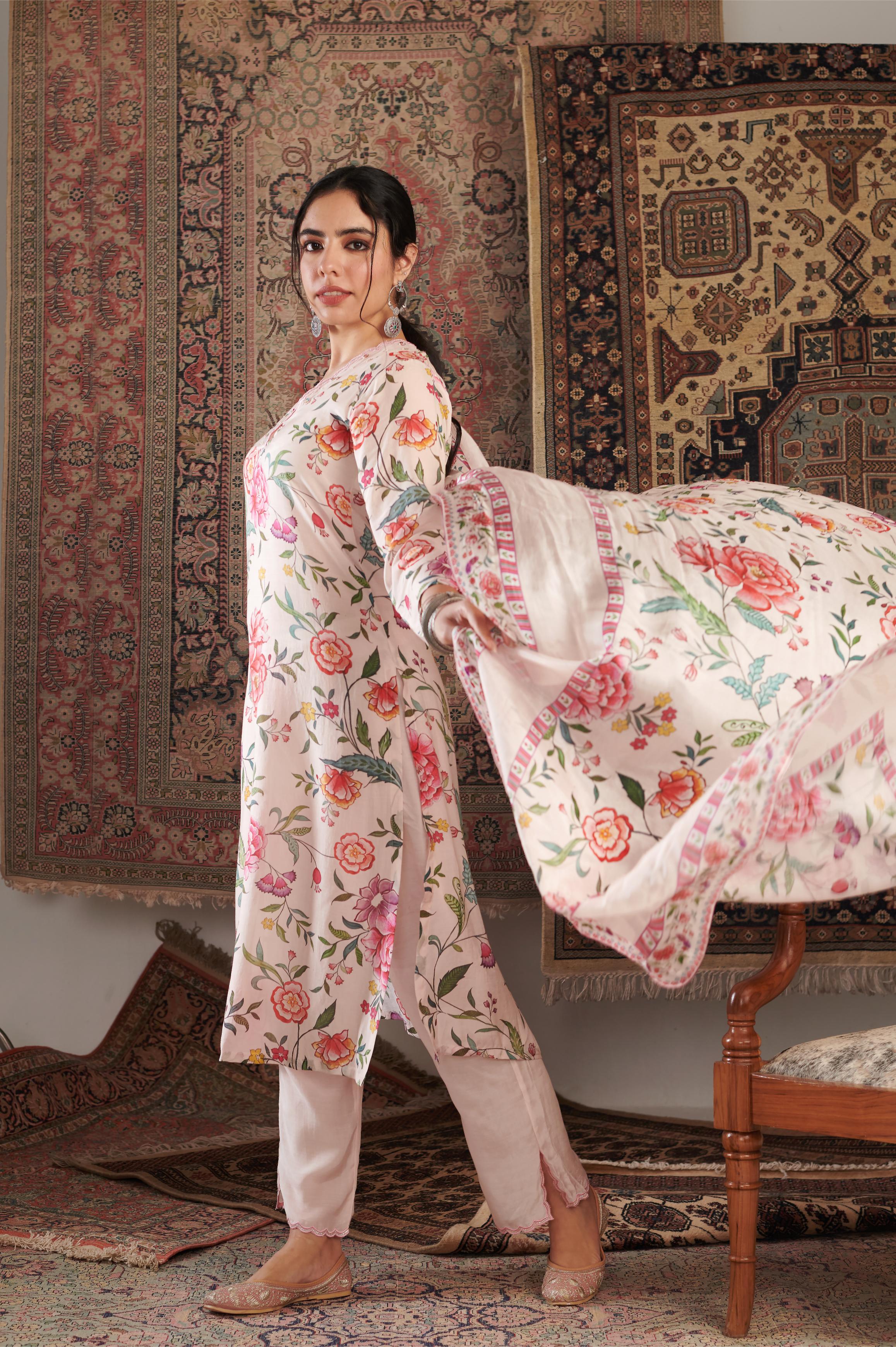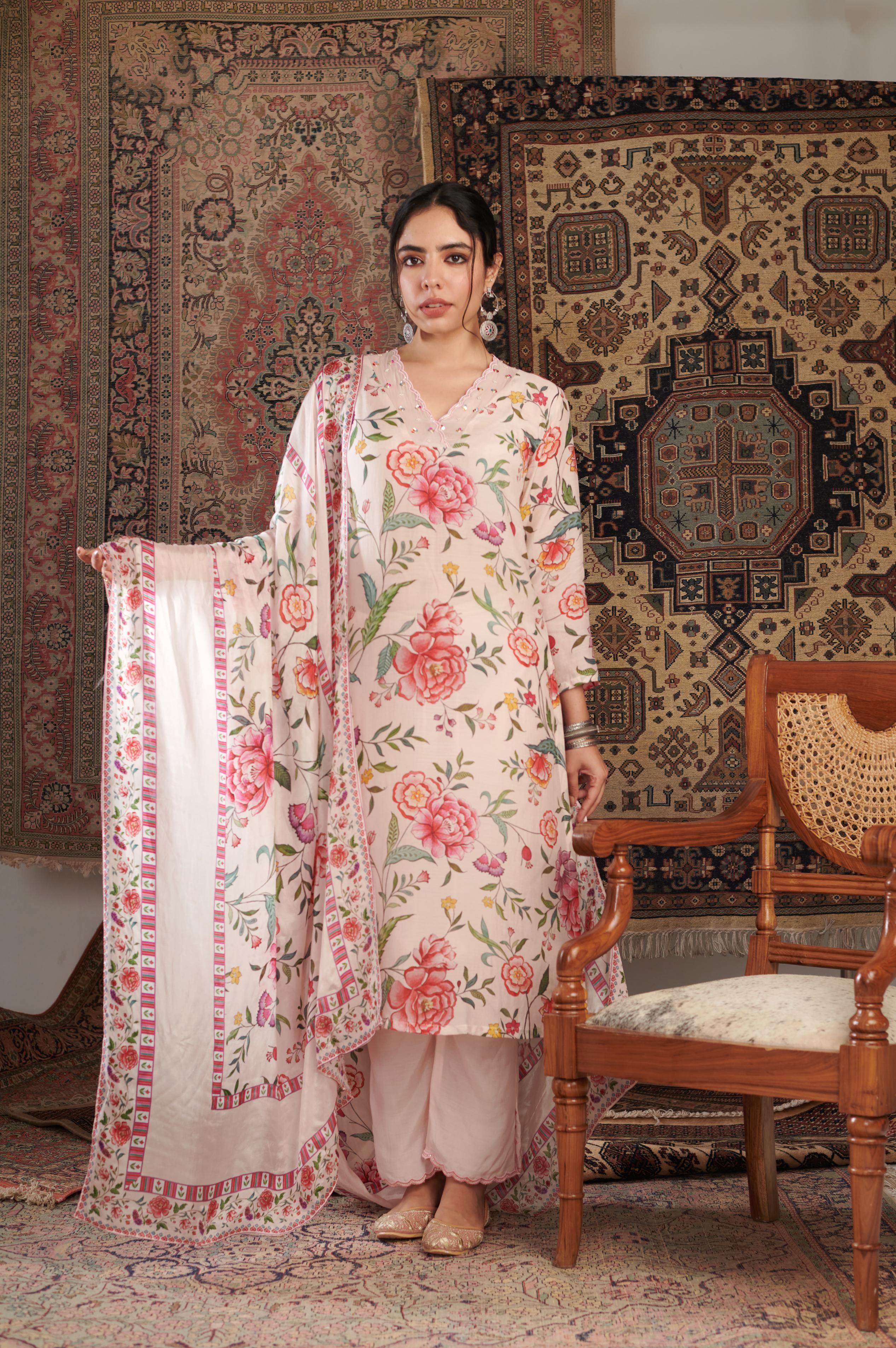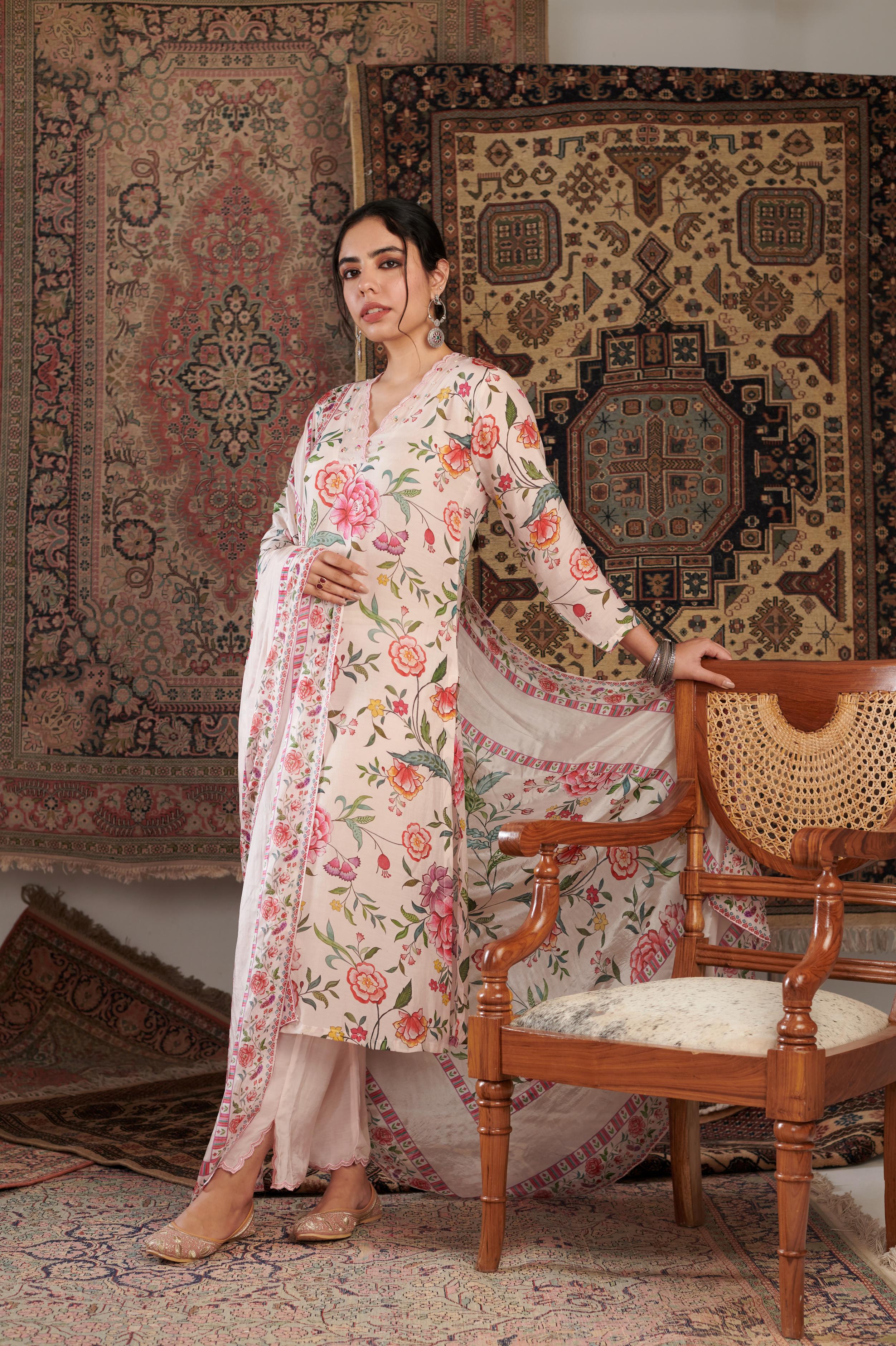 Expertly crafted from luxurious cotton silk, the AKS IVORY KURTA SET is adorned with intricate hand embroidery on flattering V-neckline. Paired with scalloped edge cotton silk pants and a digital printed silk dupatta, this set exudes elegance and sophistication. Elevate your wardrobe with this versatile and stylish ensemble.