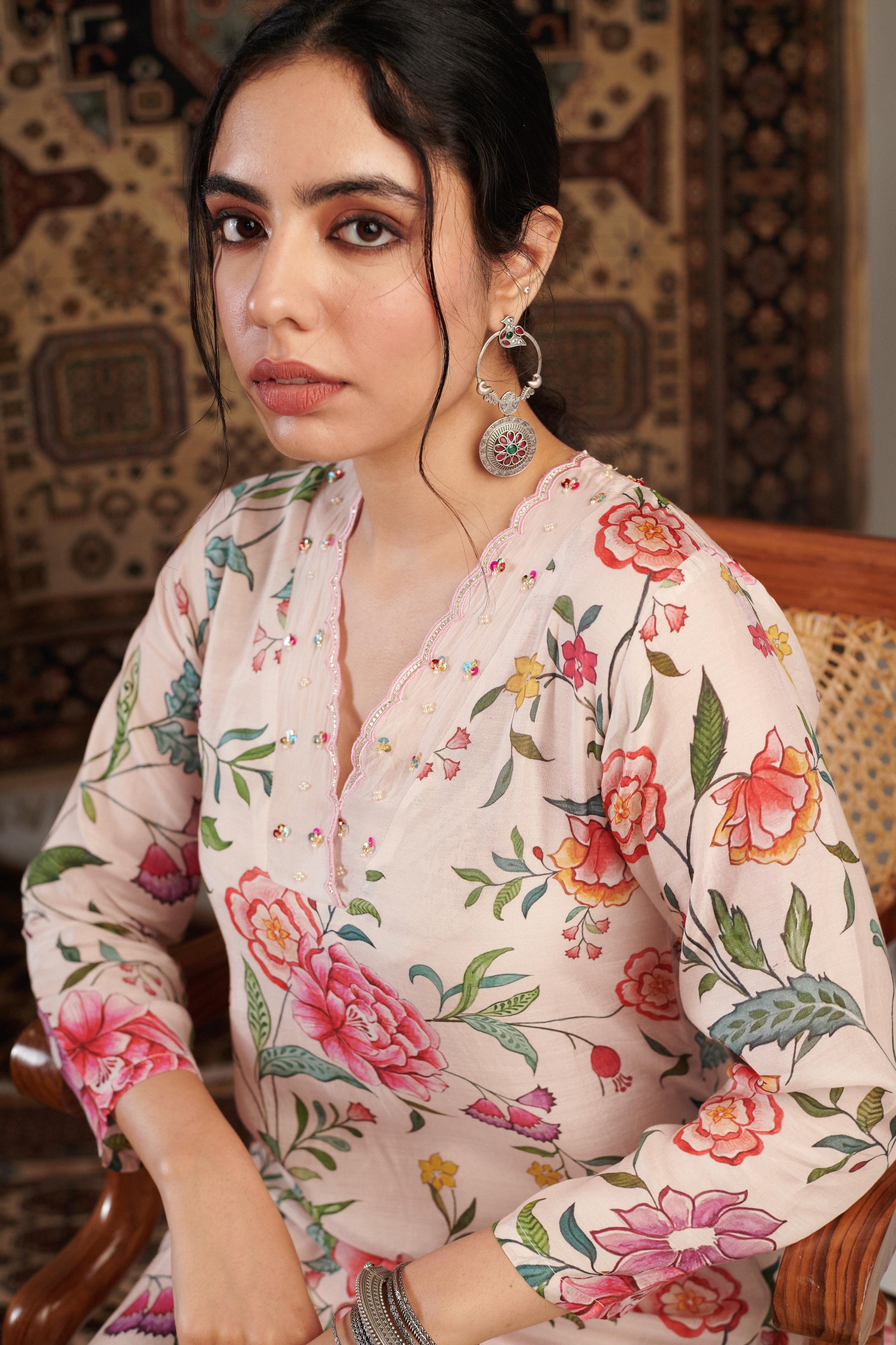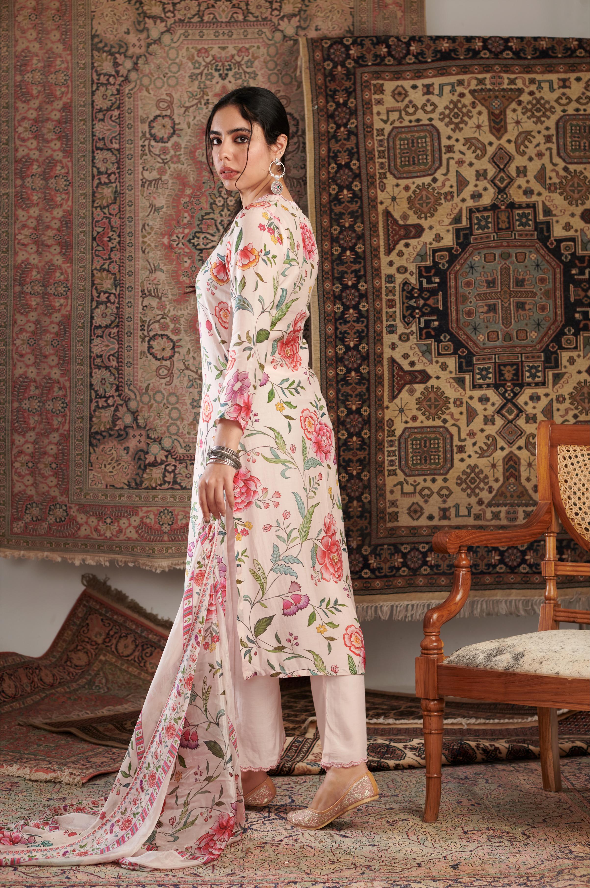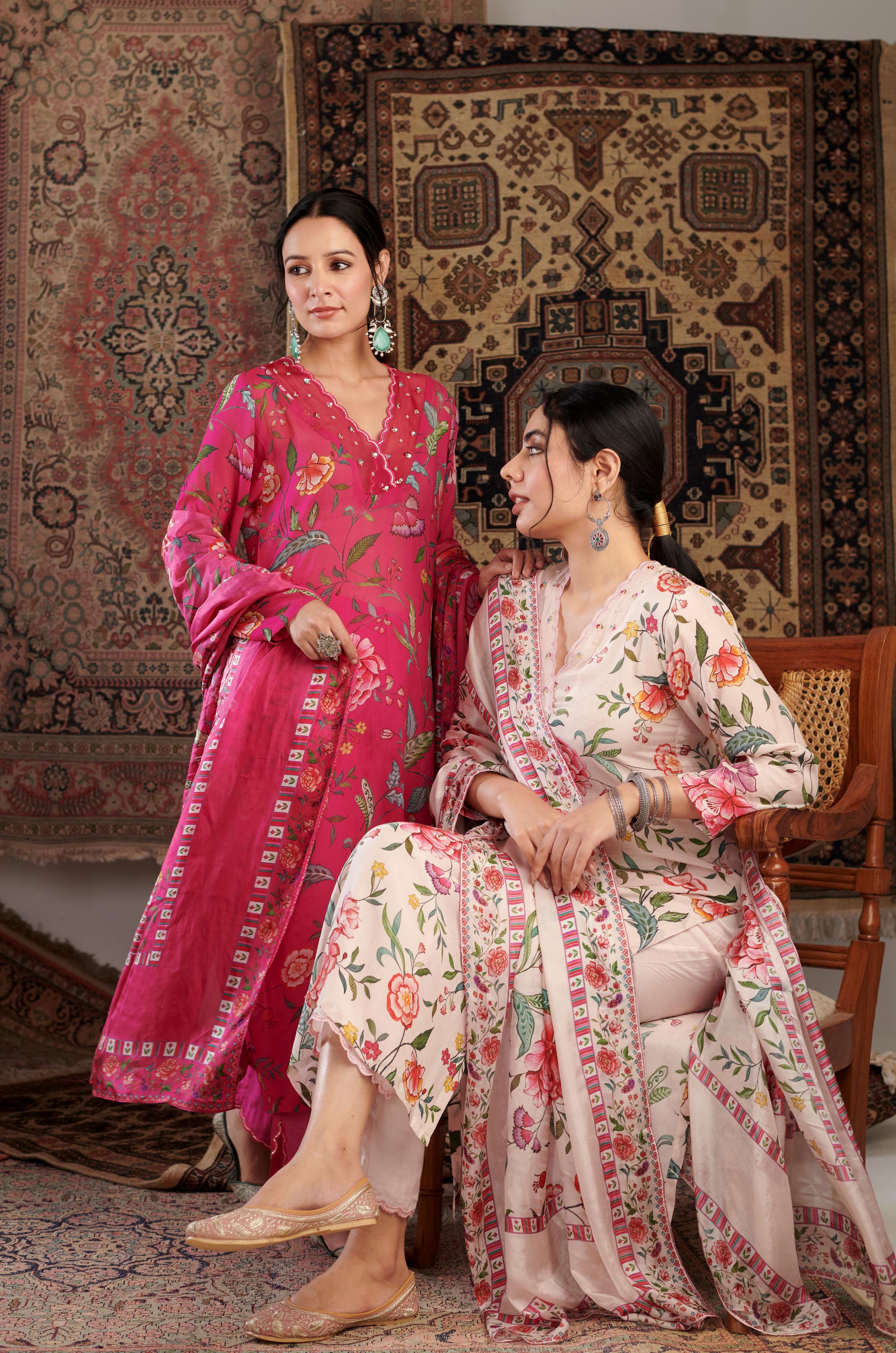 Expertly crafted from luxurious cotton silk, the AKS IVORY KURTA SET is adorned with intricate hand embroidery on flattering V-neckline. Paired with scalloped edge cotton silk pants and a digital printed silk dupatta, this set exudes elegance and sophistication. Elevate your wardrobe with this versatile and stylish ensemble.