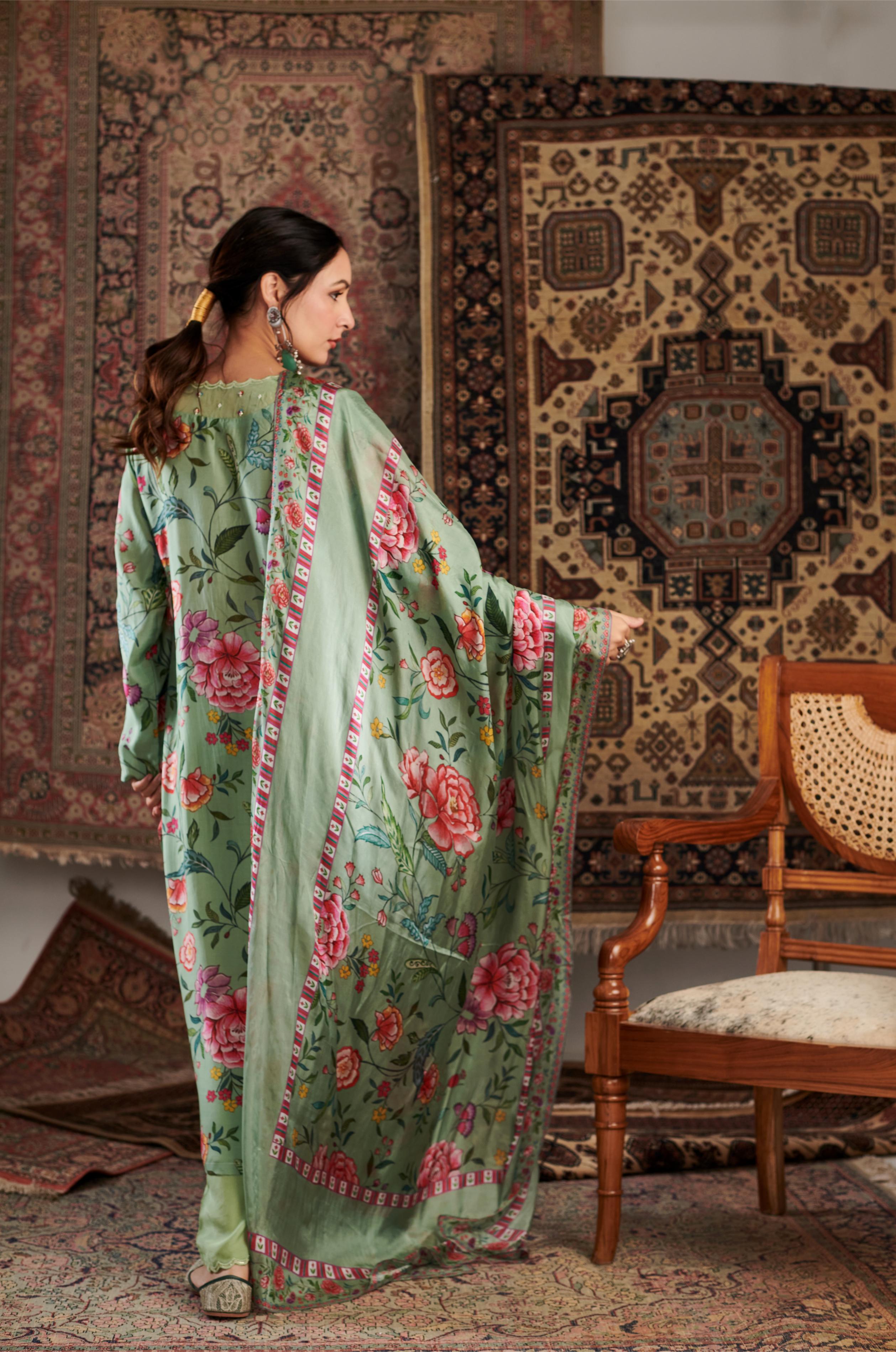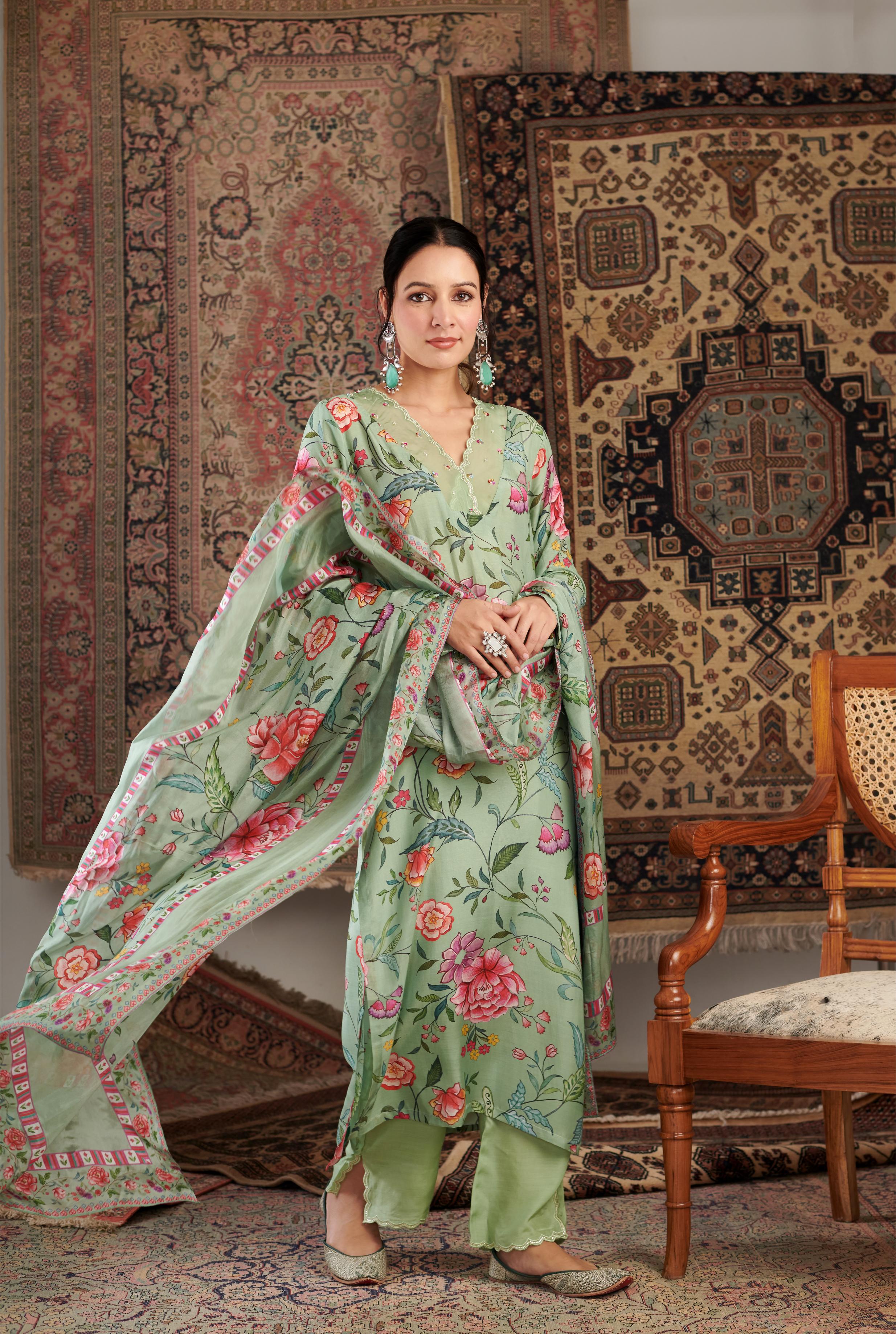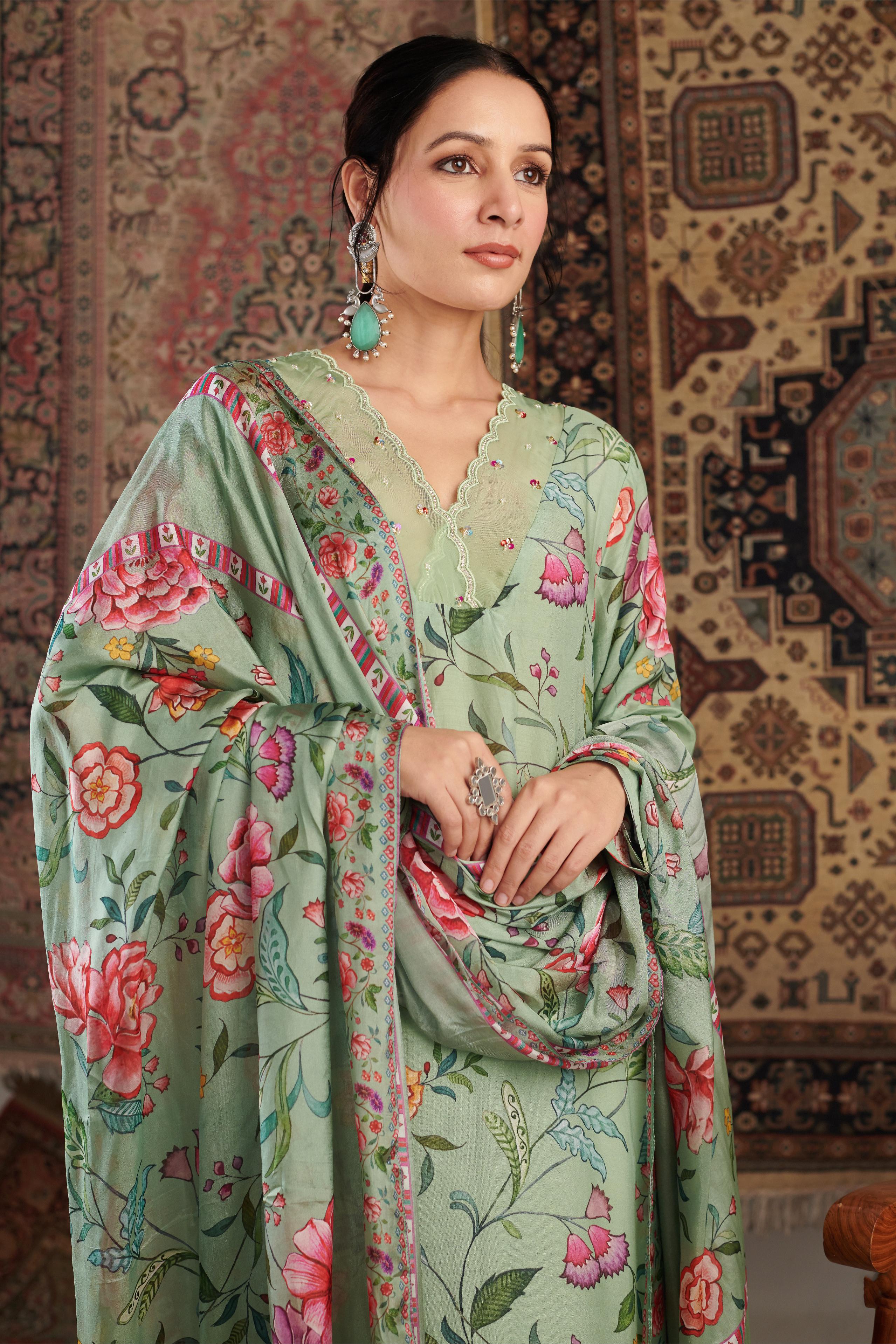 Expertly crafted from luxurious cotton silk, the AKS MINT GREEN KURTA SET is adorned with intricate hand embroidery on flattering V-neckline. Paired with scalloped edge cotton silk pants and a digital printed silk dupatta, this set exudes elegance and sophistication. Elevate your wardrobe with this versatile and stylish ensemble.