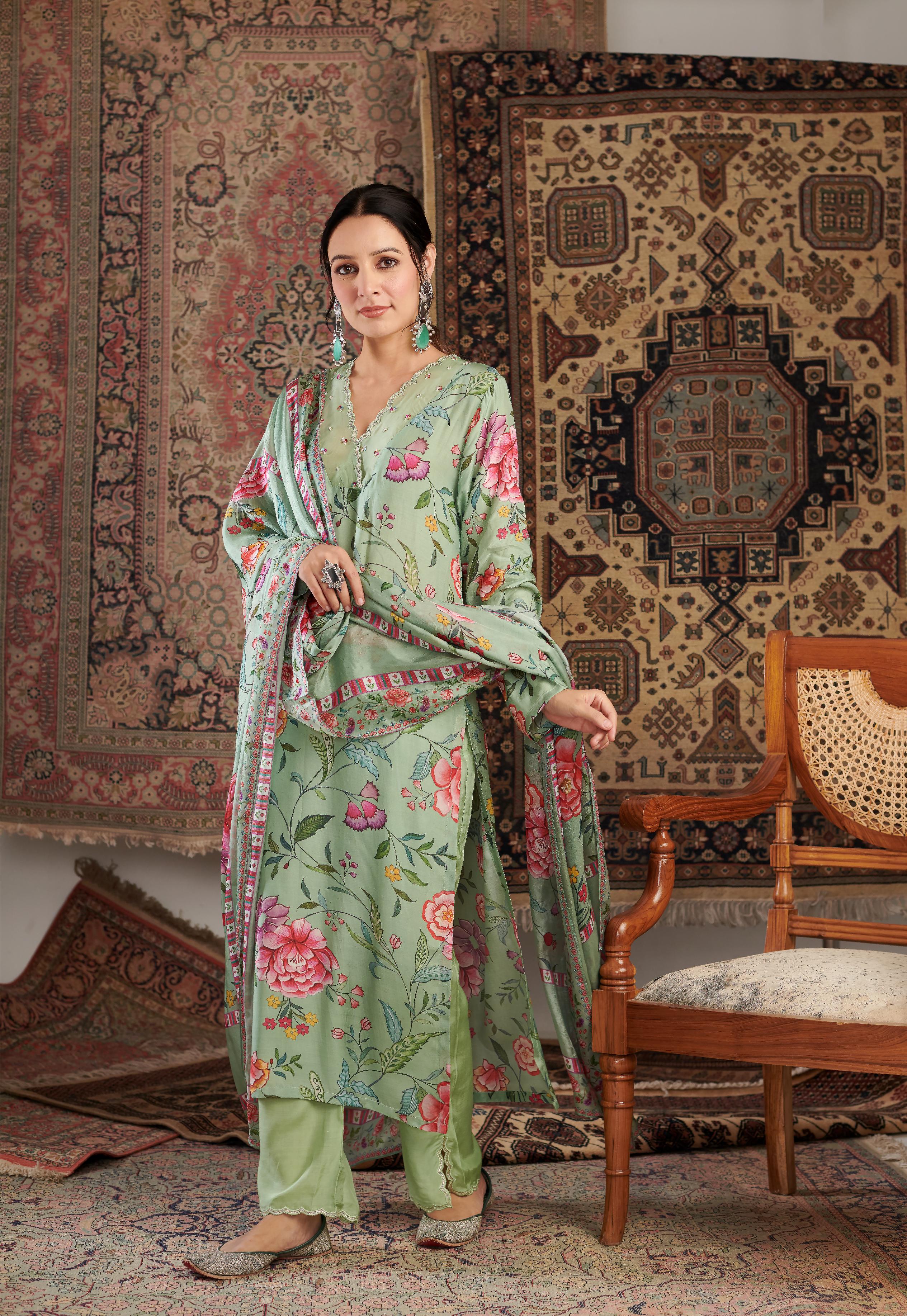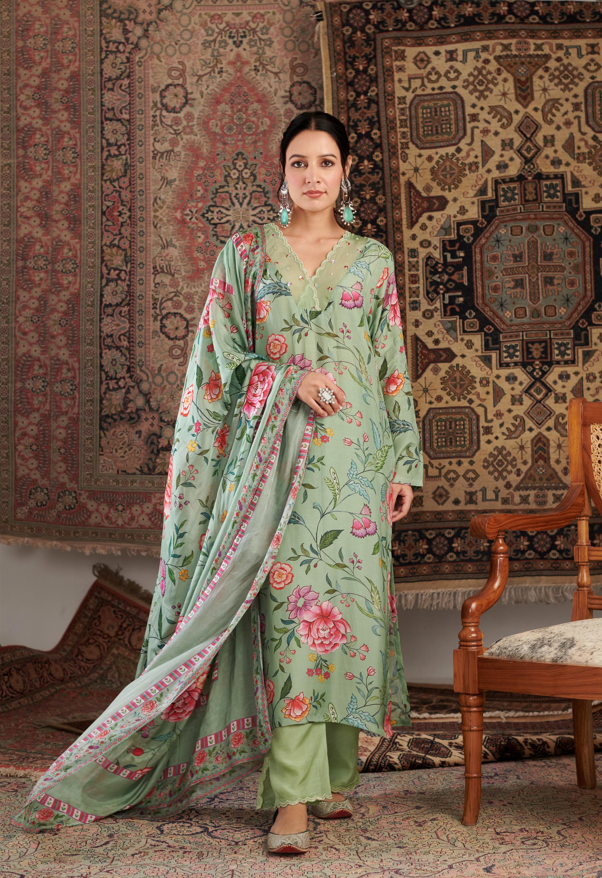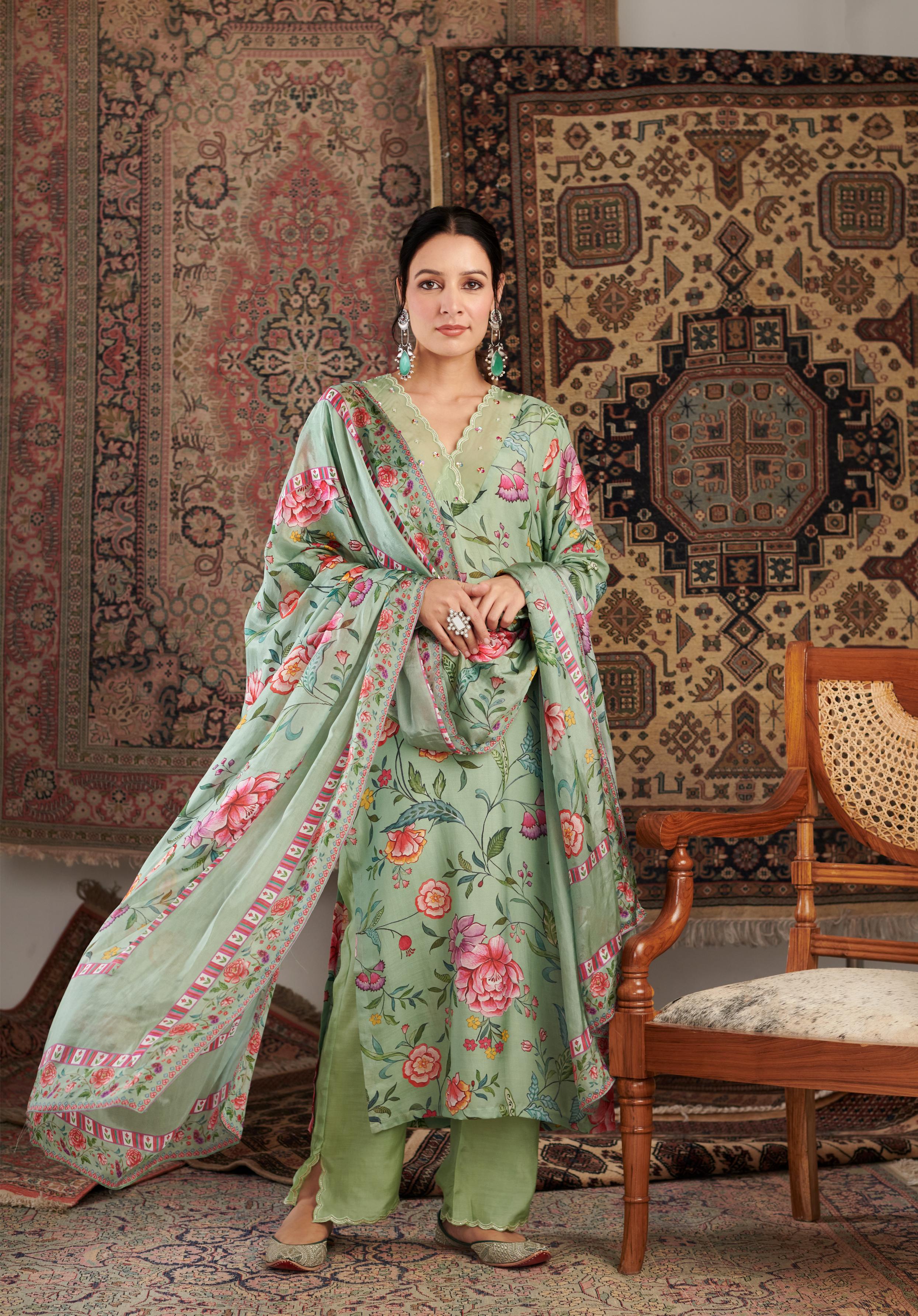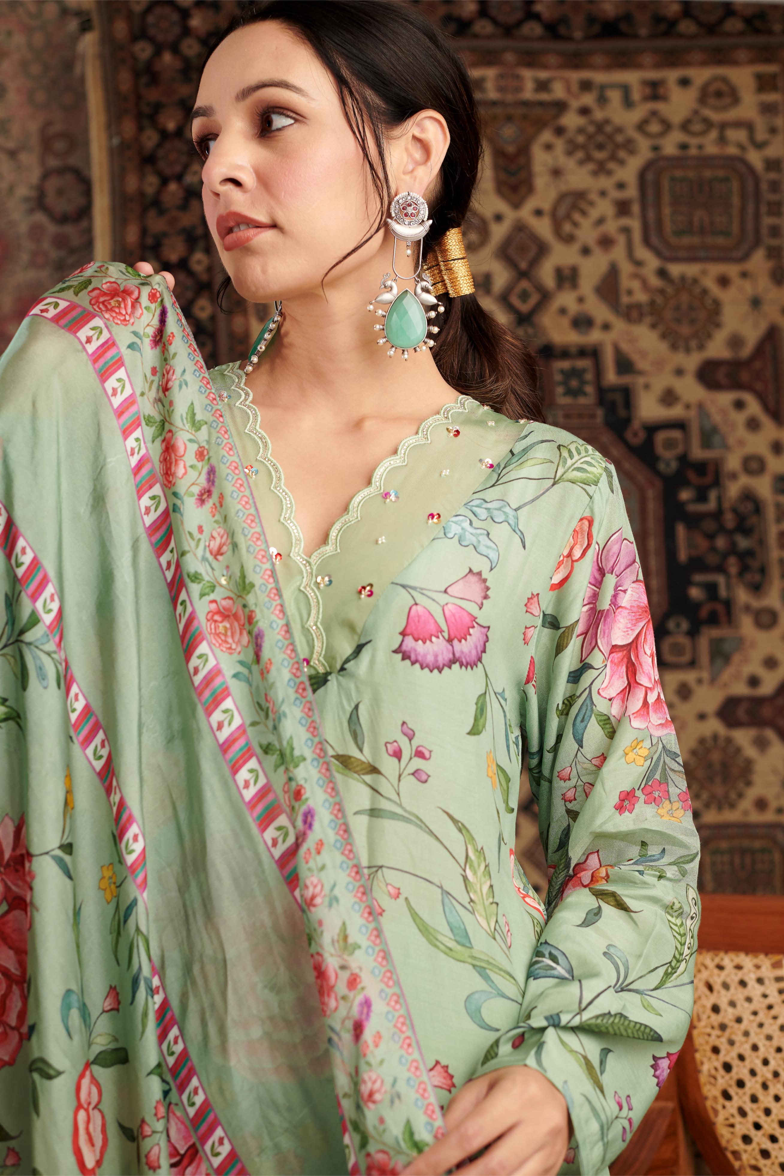 Expertly crafted from luxurious cotton silk, the AKS MINT GREEN KURTA SET is adorned with intricate hand embroidery on flattering V-neckline. Paired with scalloped edge cotton silk pants and a digital printed silk dupatta, this set exudes elegance and sophistication. Elevate your wardrobe with this versatile and stylish ensemble.