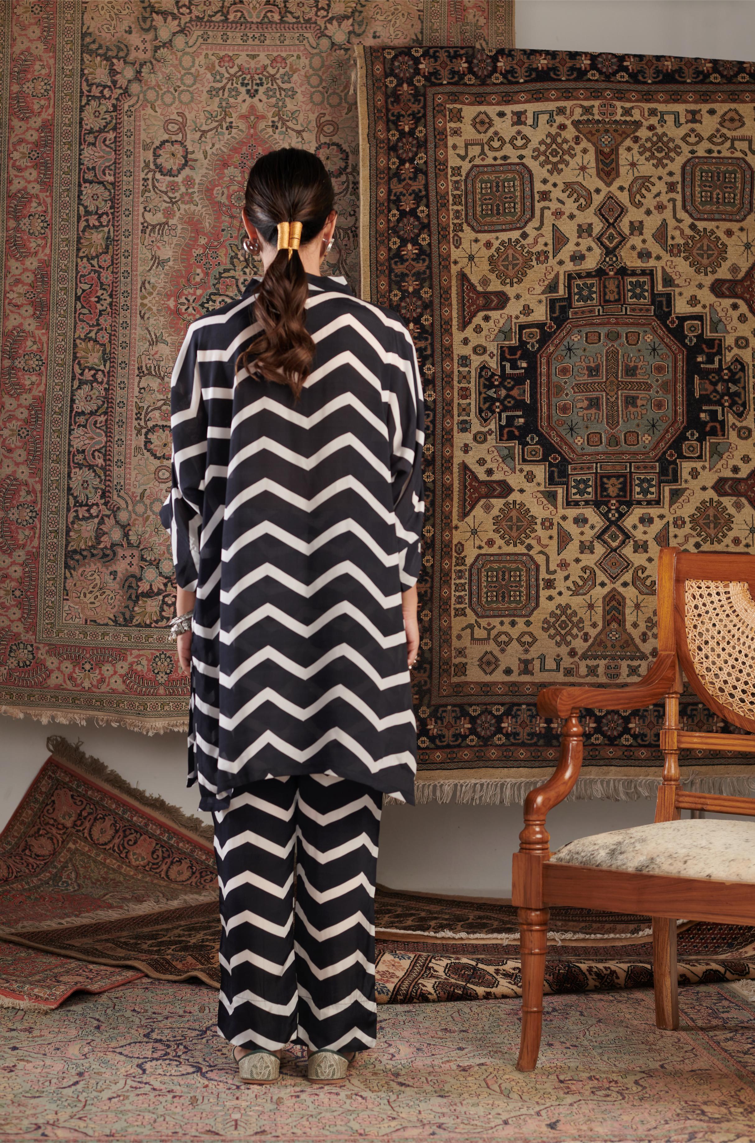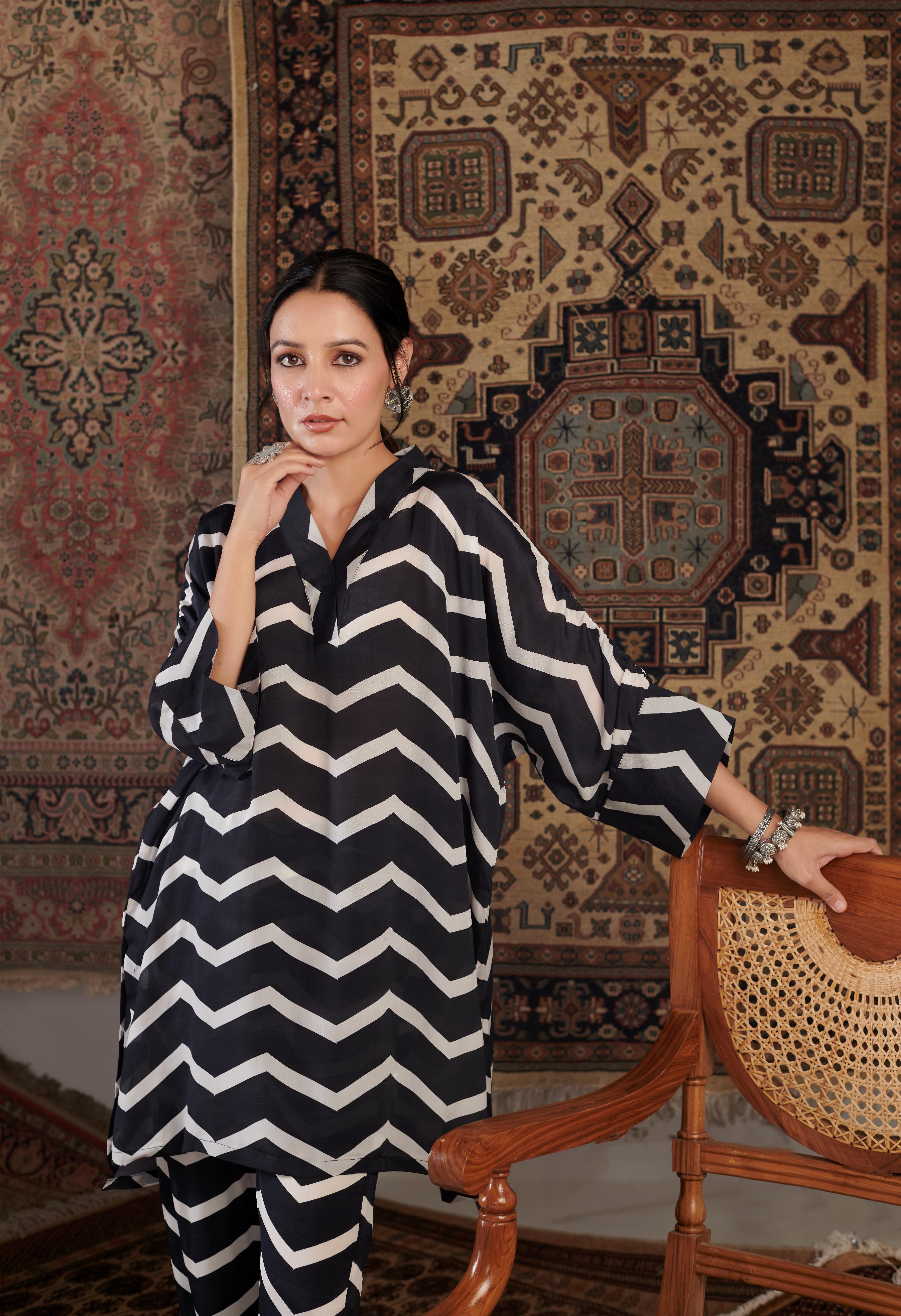 Digital Printed Co-ord set in crape fabric.paired with digital printed pants and has elasticated sleeves.