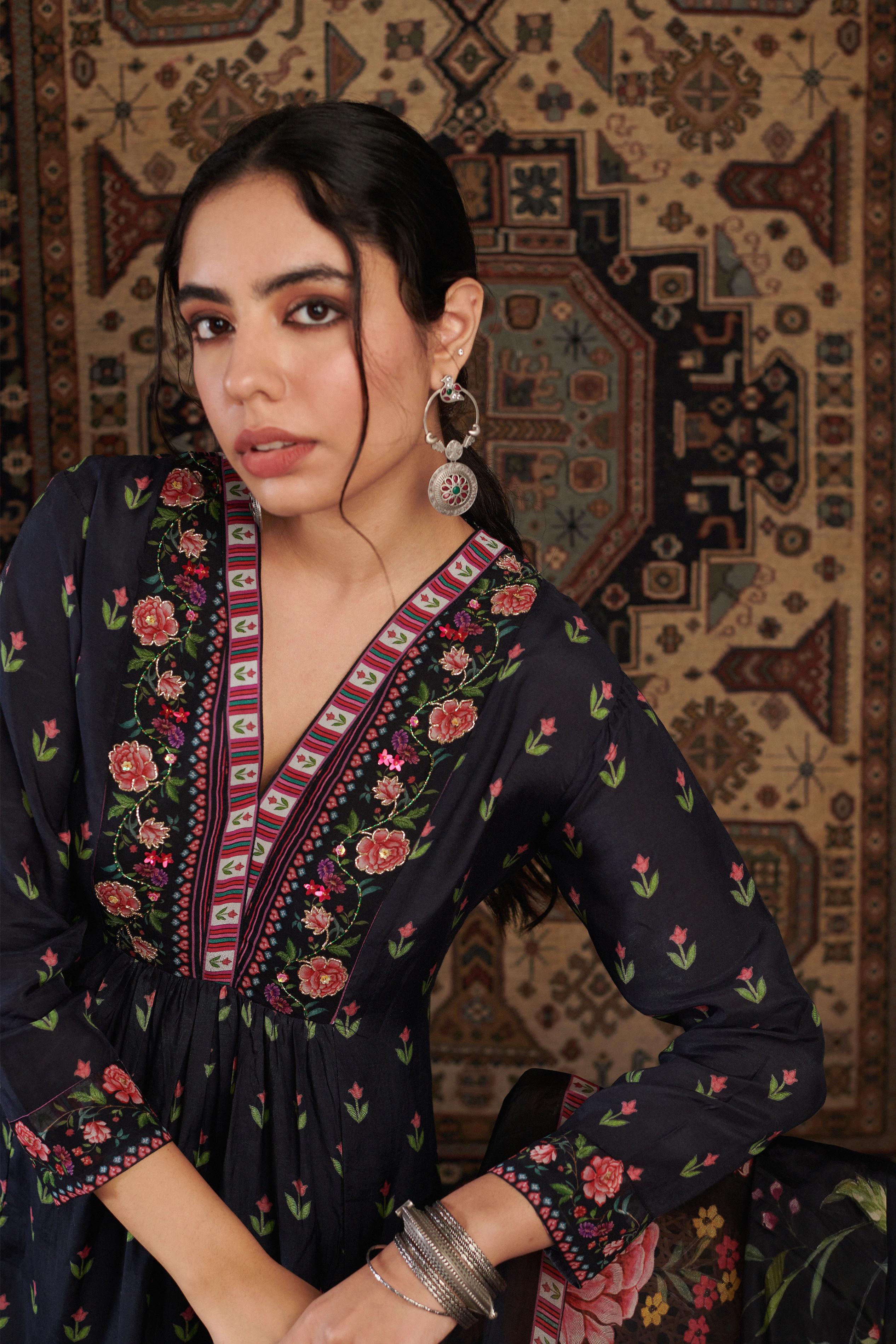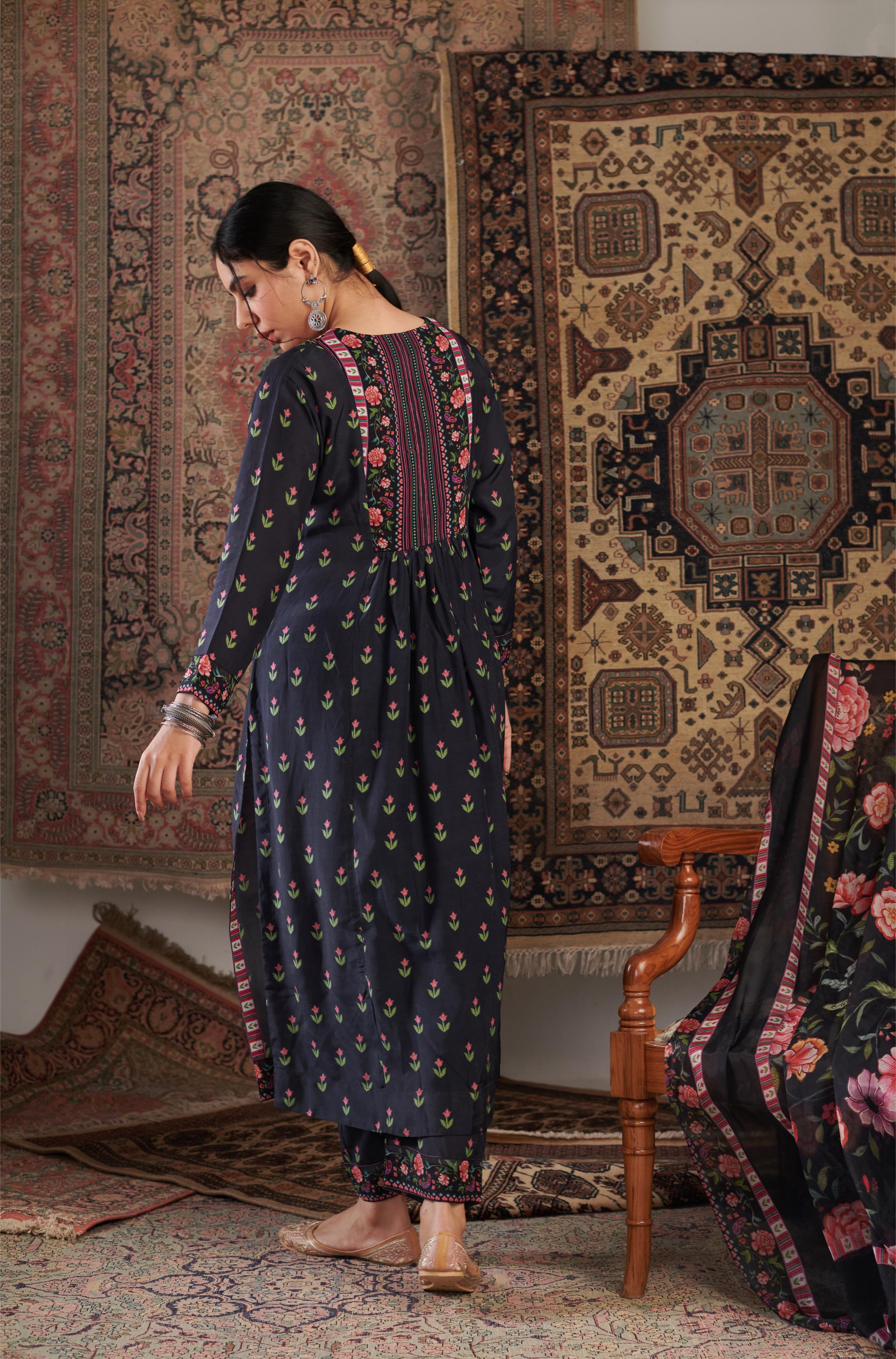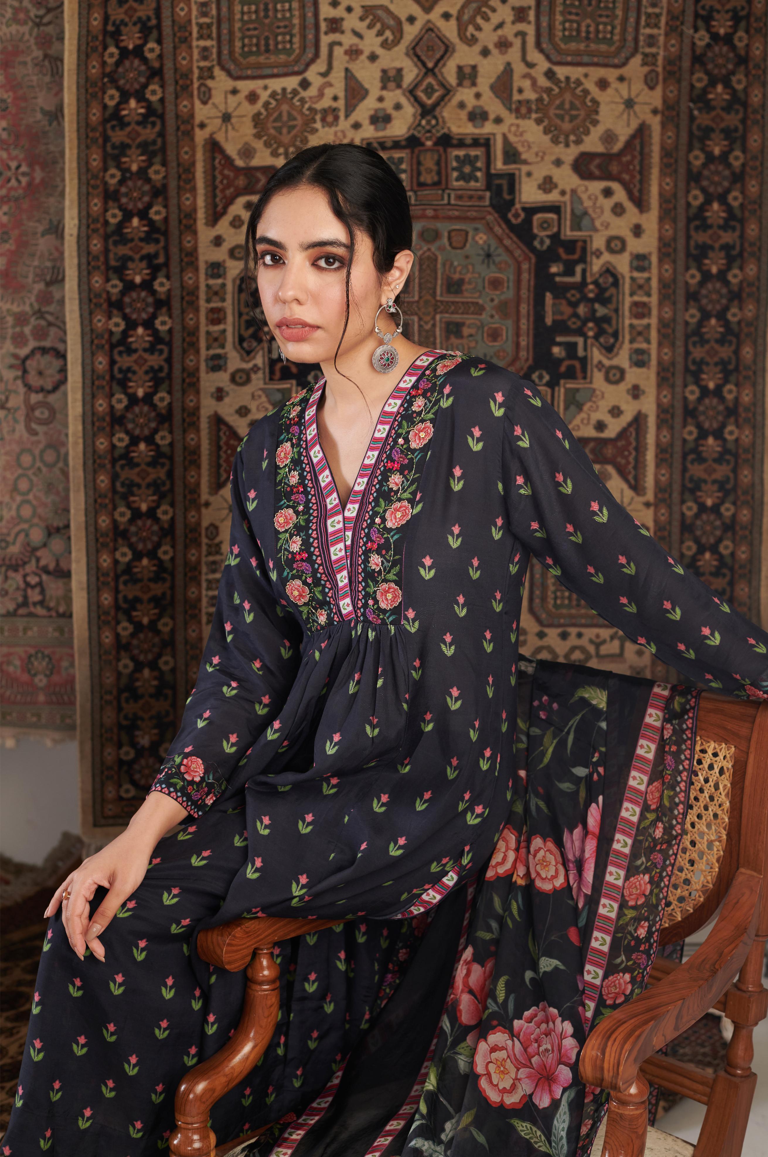 Expertly crafted from luxurious cotton silk, the GUL EMBROIDERED BLACK KURTA SET is adorned with intricate hand embroidery on York Paired with digital printed cotton silk pants and a digital printed silk dupatta, this set exudes elegance and sophistication. Elevate your wardrobe with this versatile and stylish ensemble.