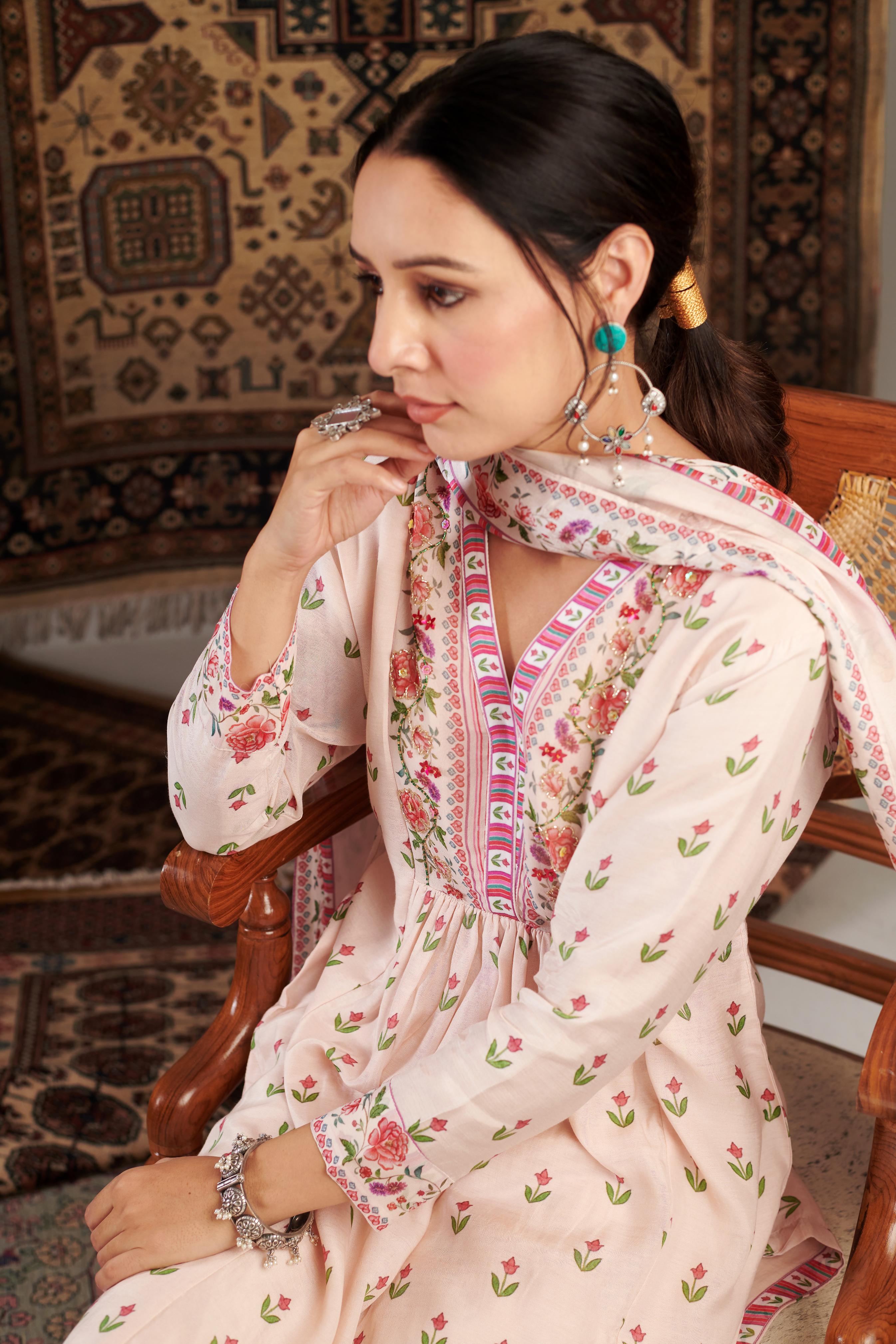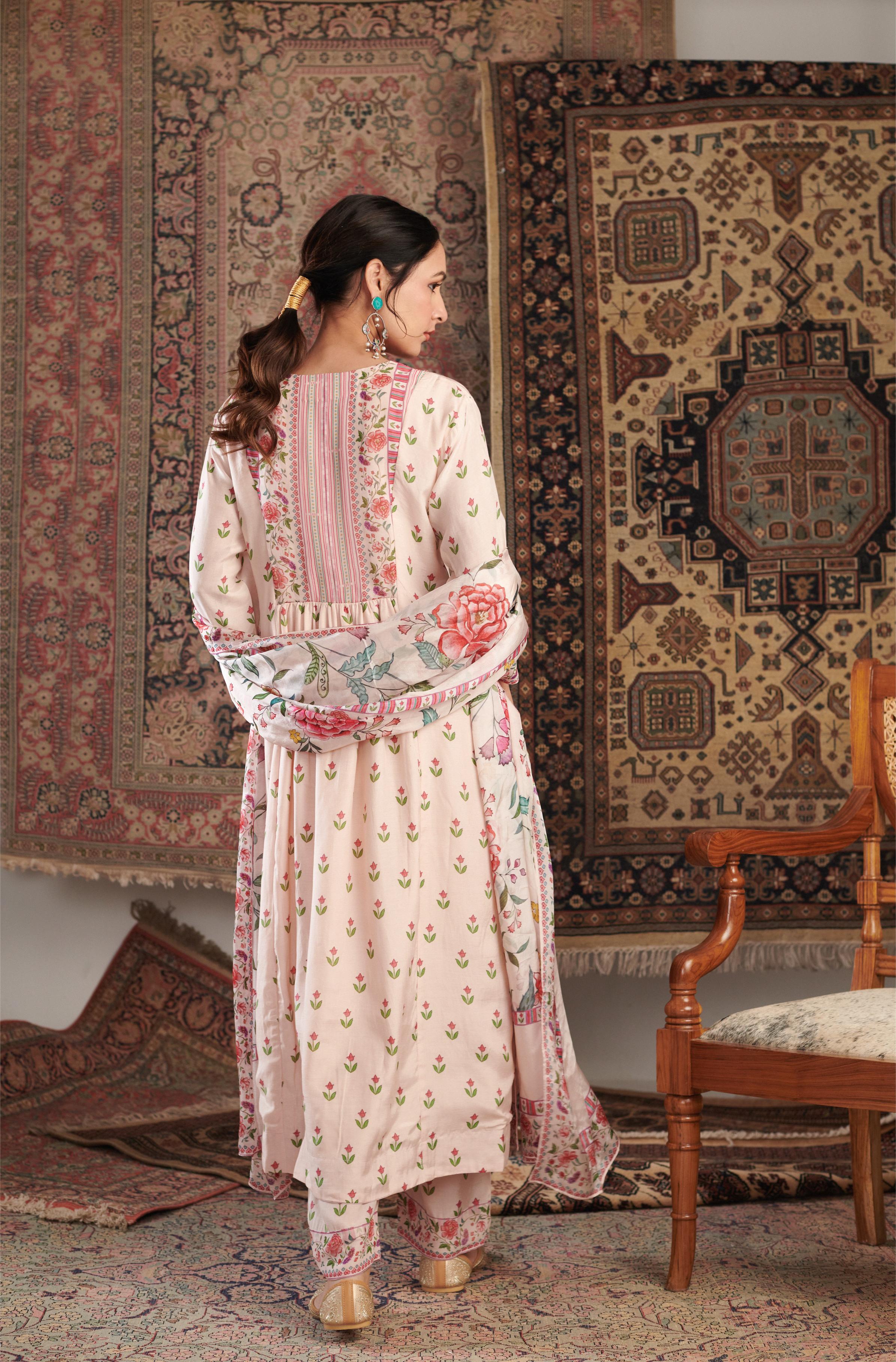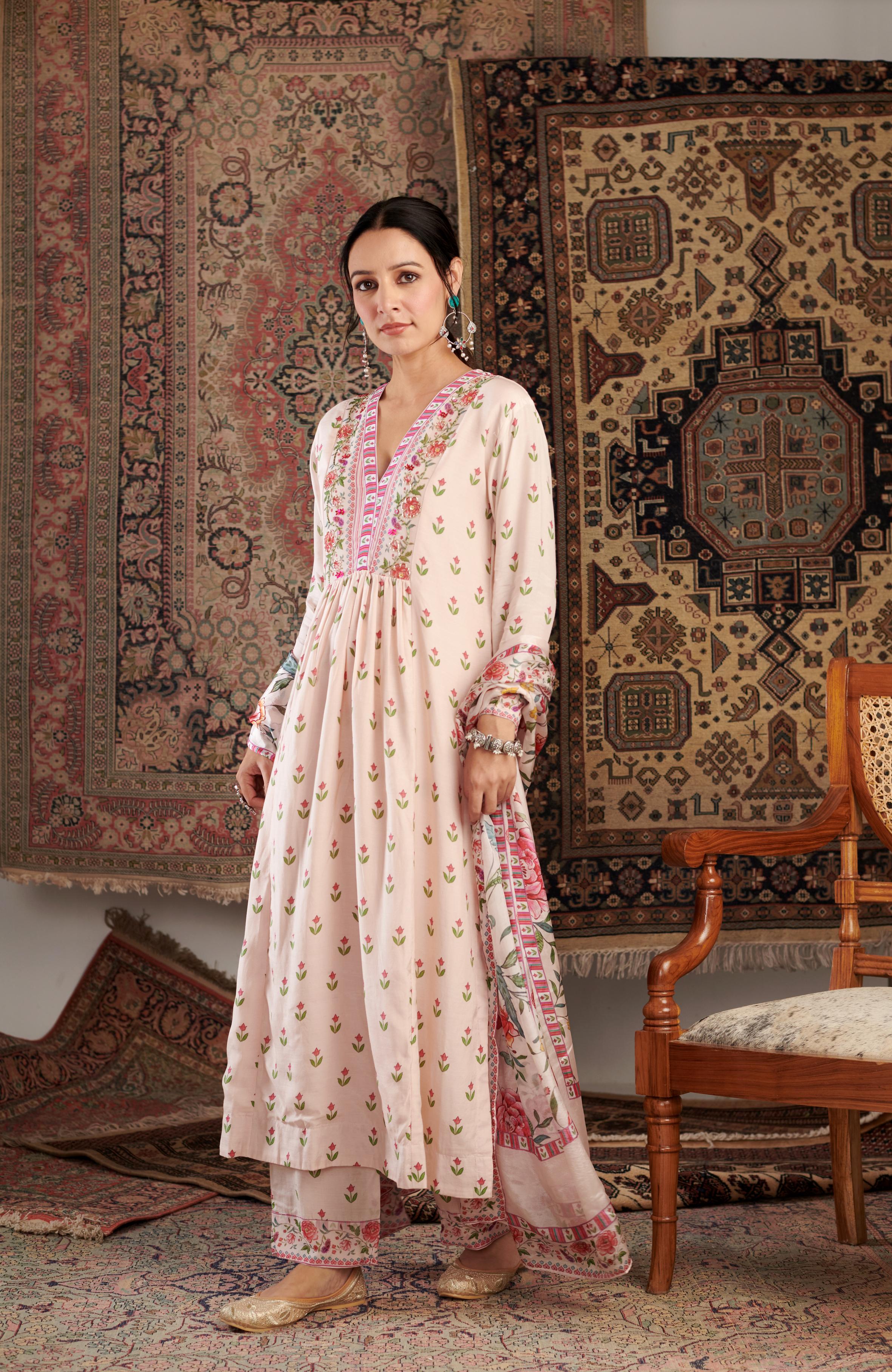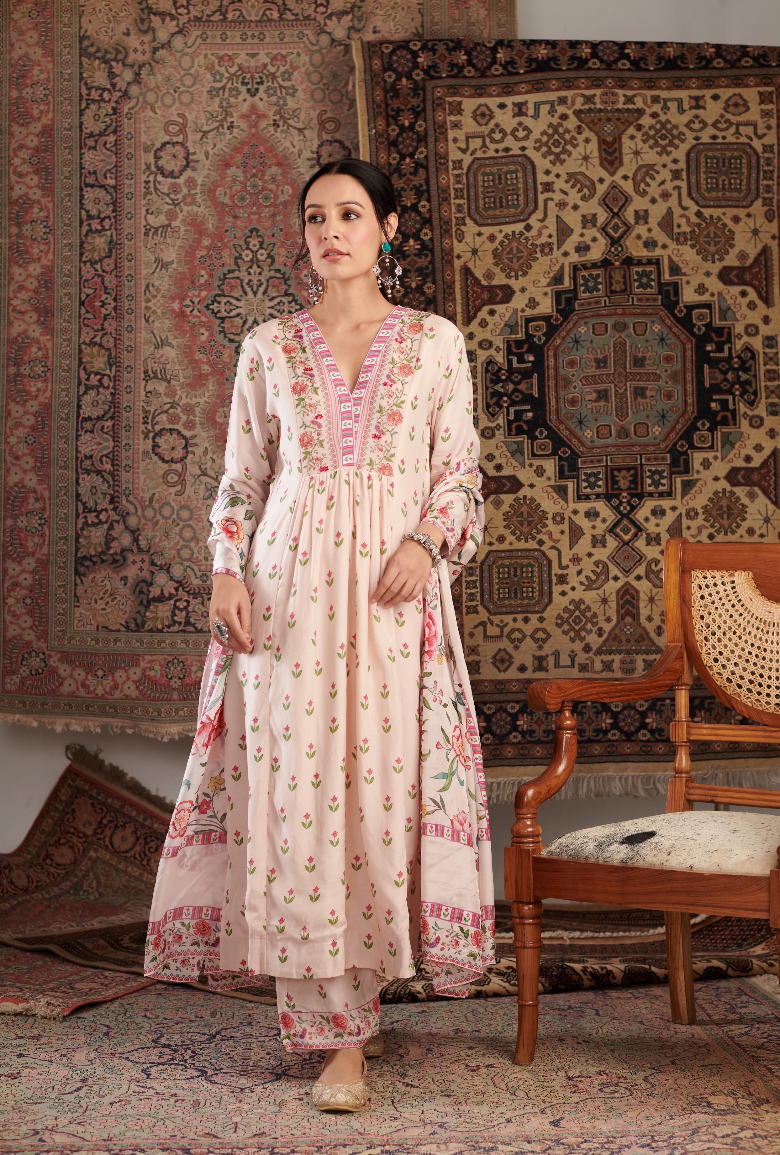 Expertly crafted from luxurious cotton silk, the GUL EMBROIDERED IVORY KURTA SET is adorned with intricate hand embroidery on York Paired with digital printed cotton silk pants and a digital printed silk dupatta, this set exudes elegance and sophistication. Elevate your wardrobe with this versatile and stylish ensemble.