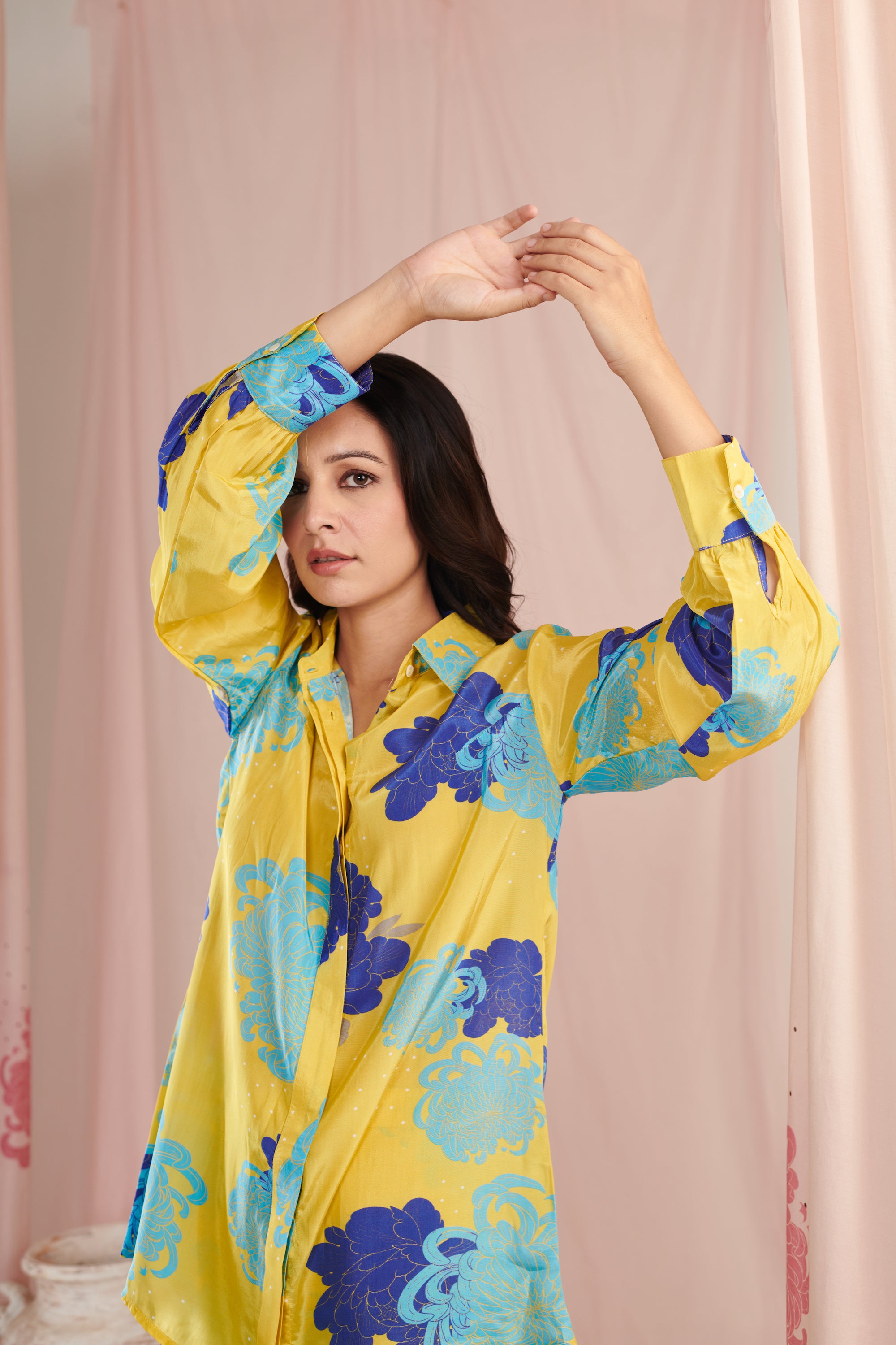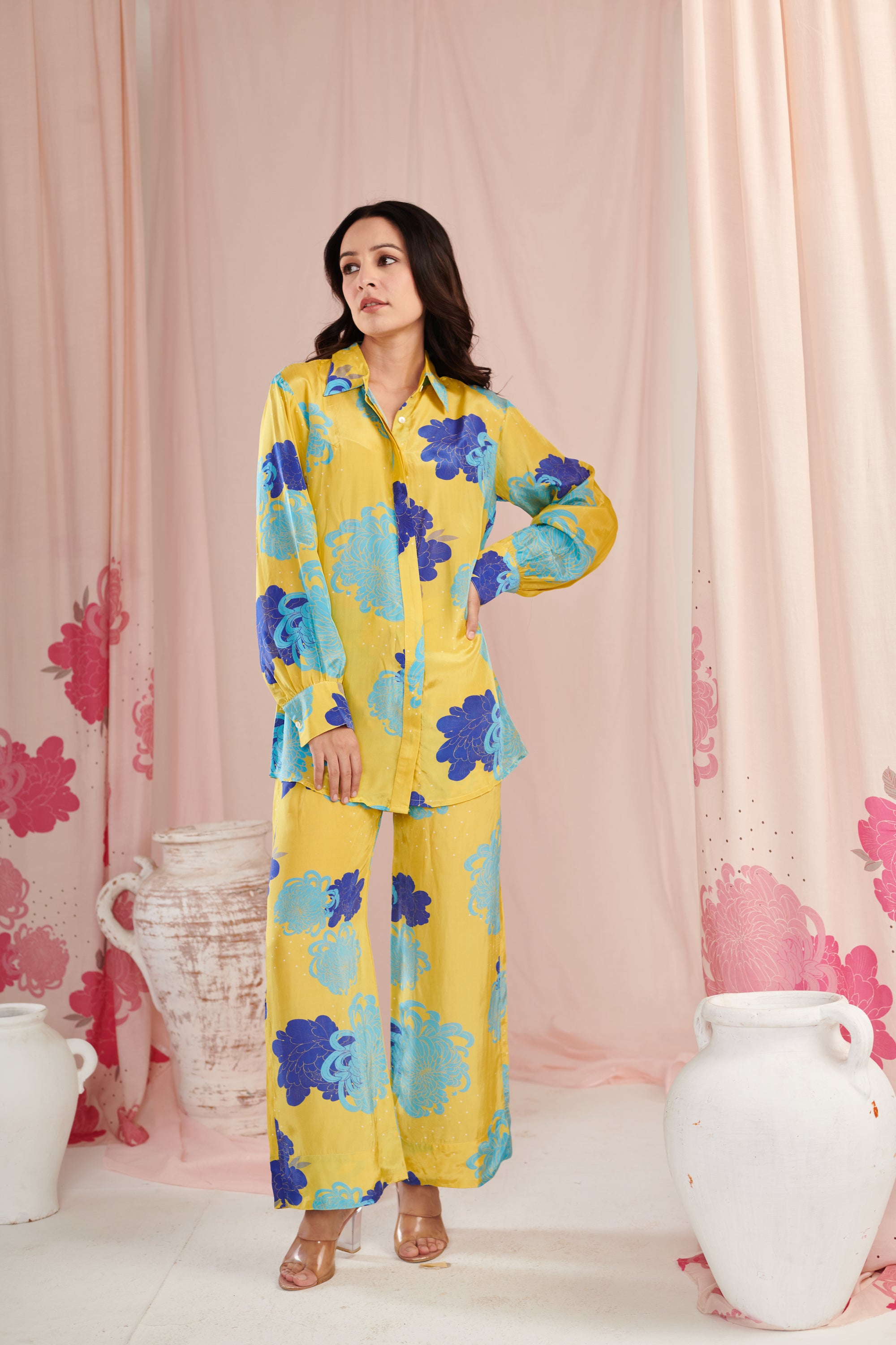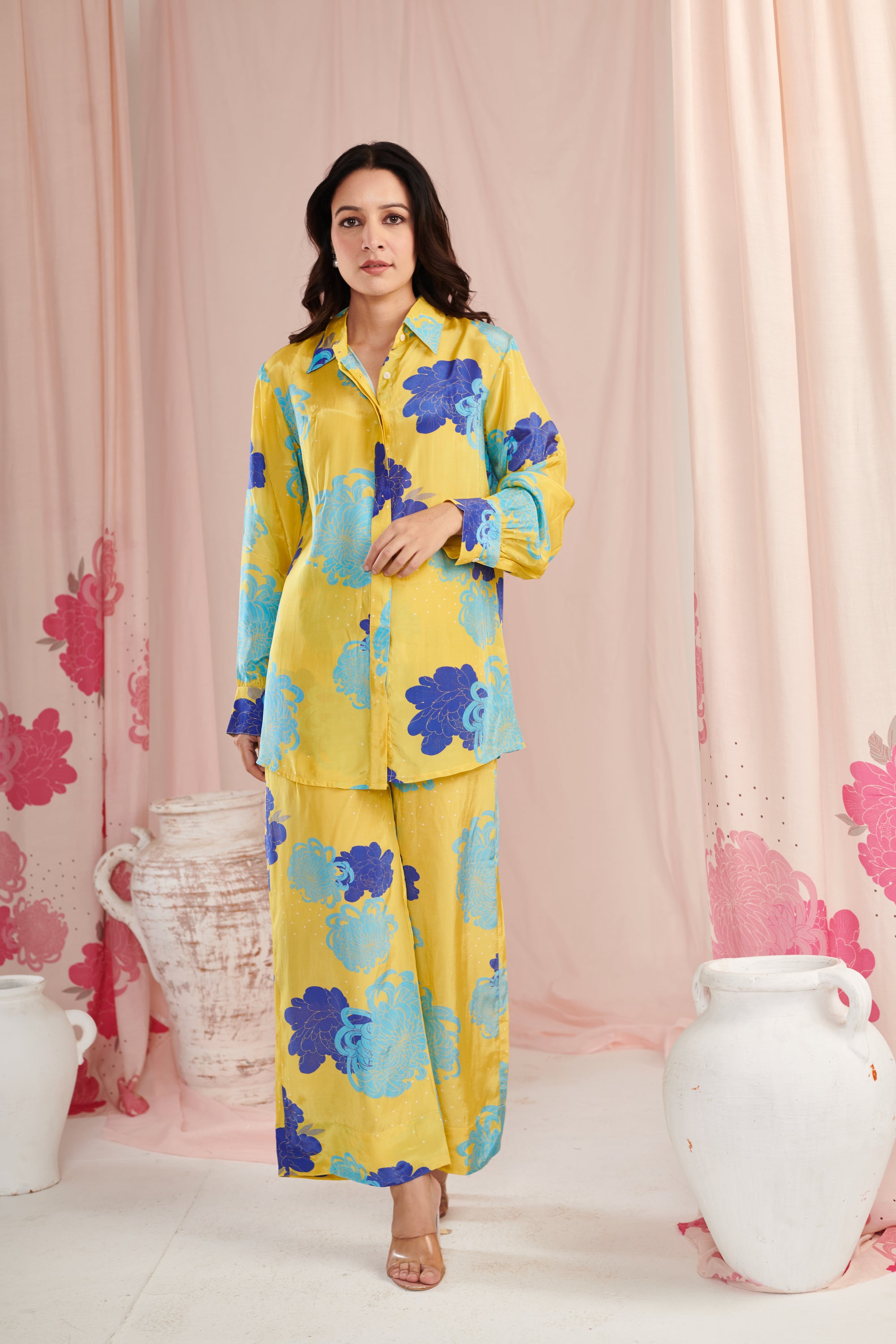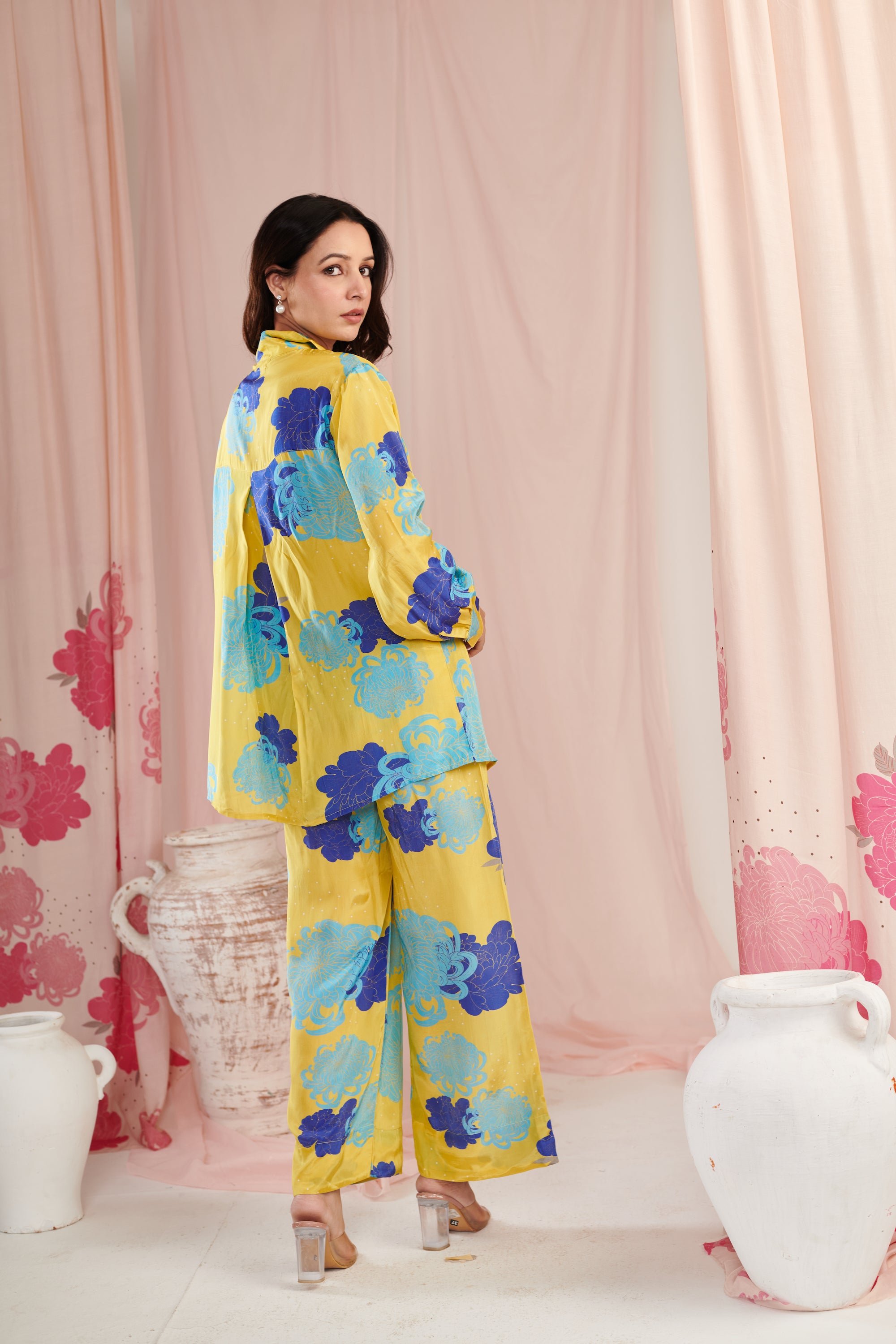 Digital Printed Co-ord set in crape fabric.paired with digital printed pants with pockets and has elasticated back.