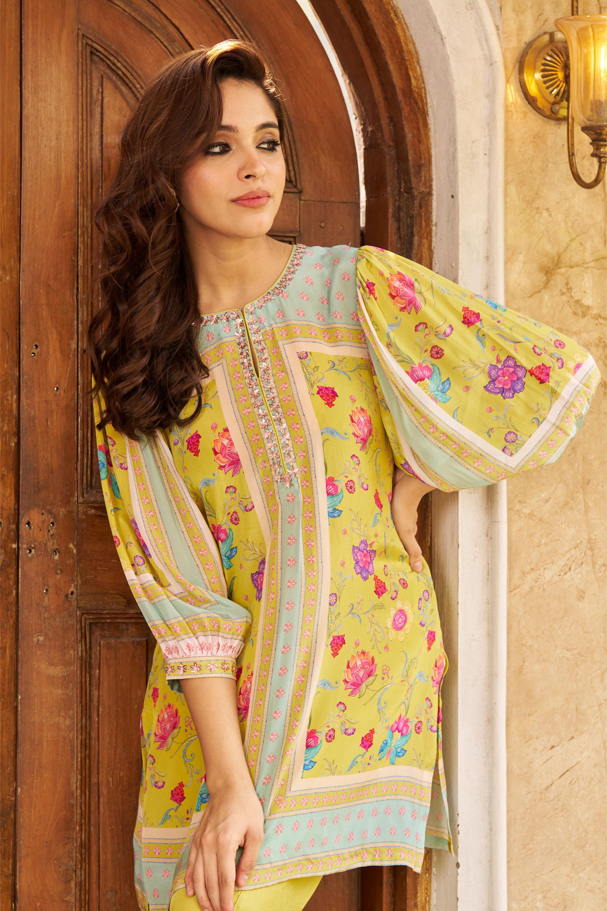 Digital Printed Floral Placement Top, Adored With Hand Embroidery On Neckline And Sleeves In Crepe.
