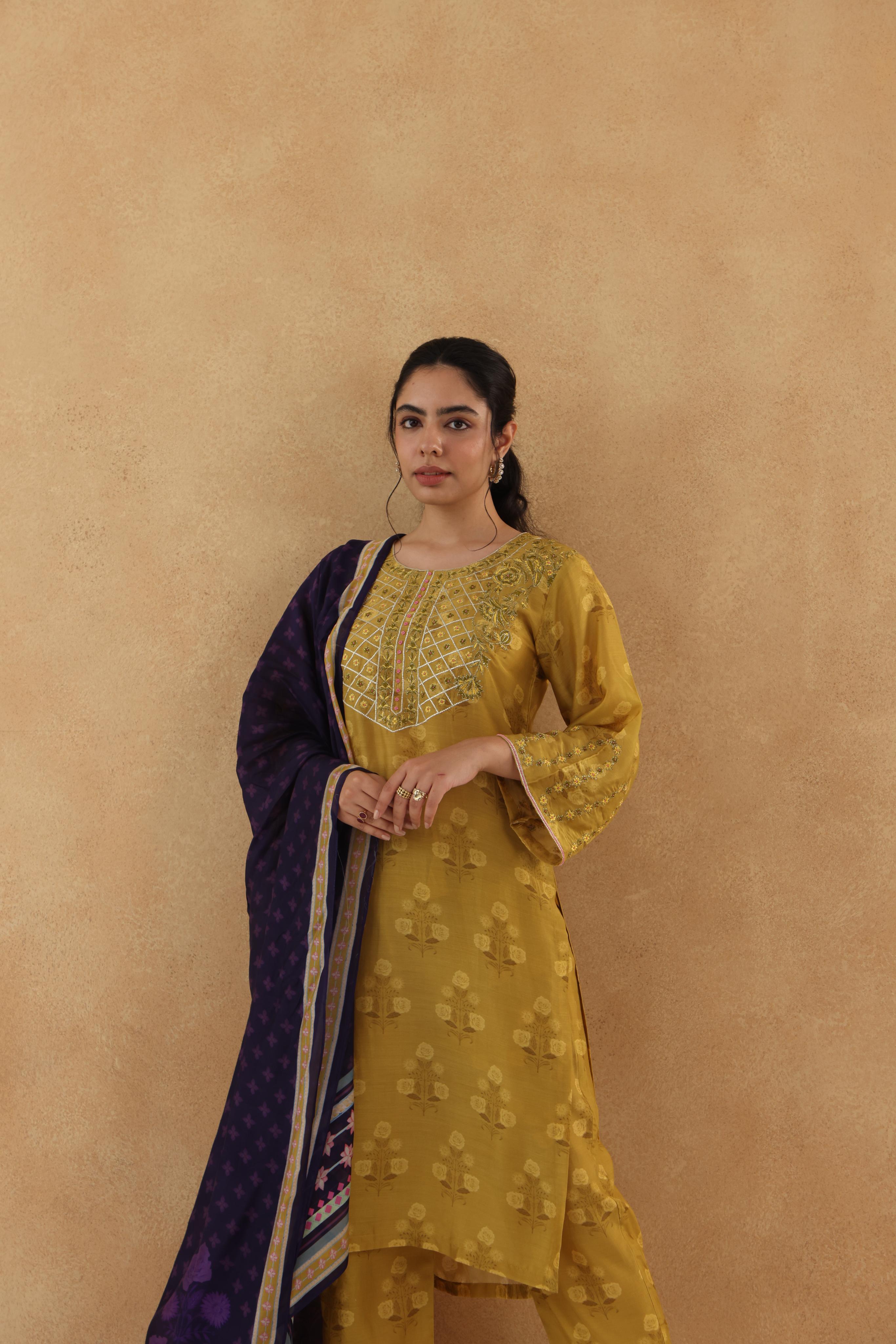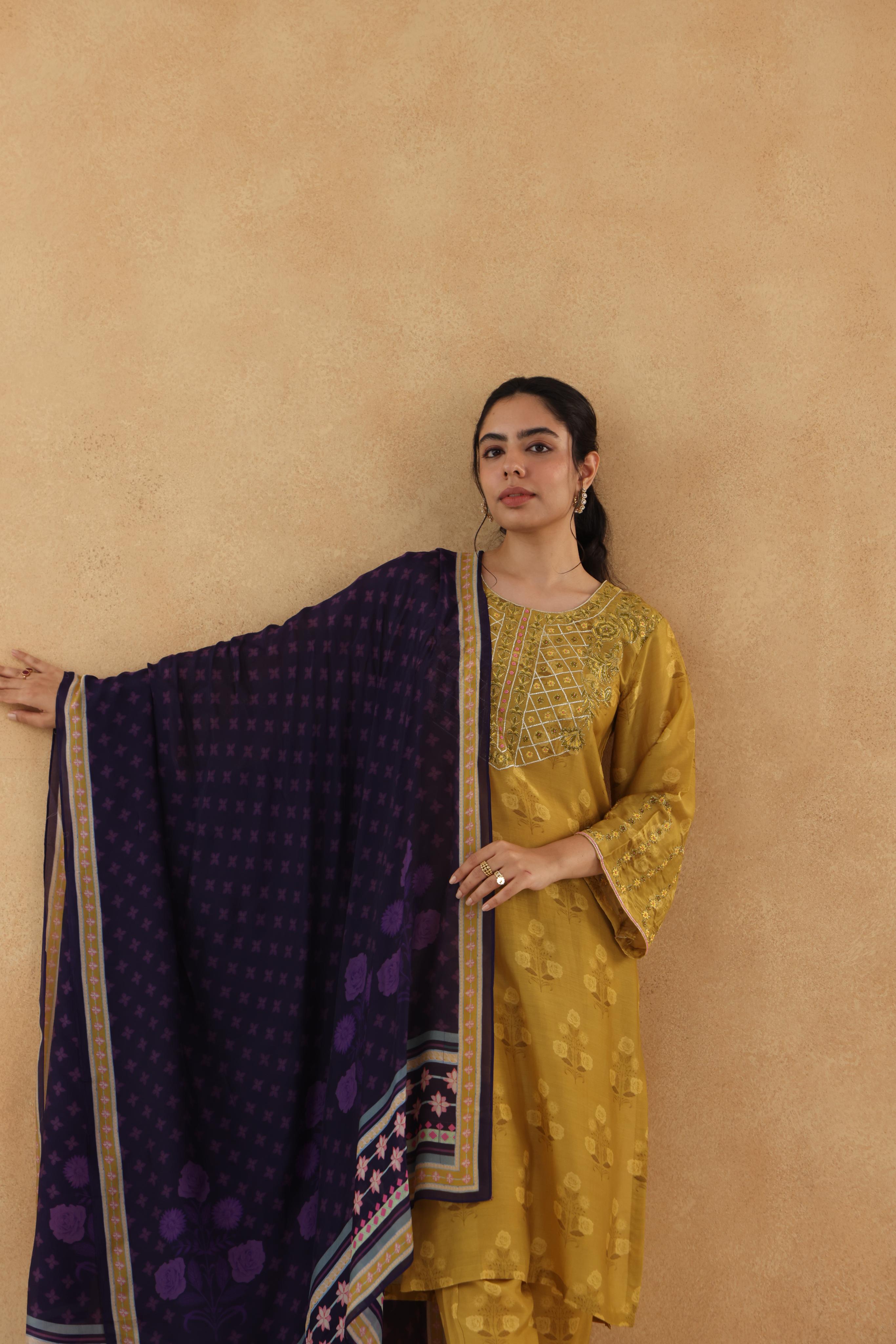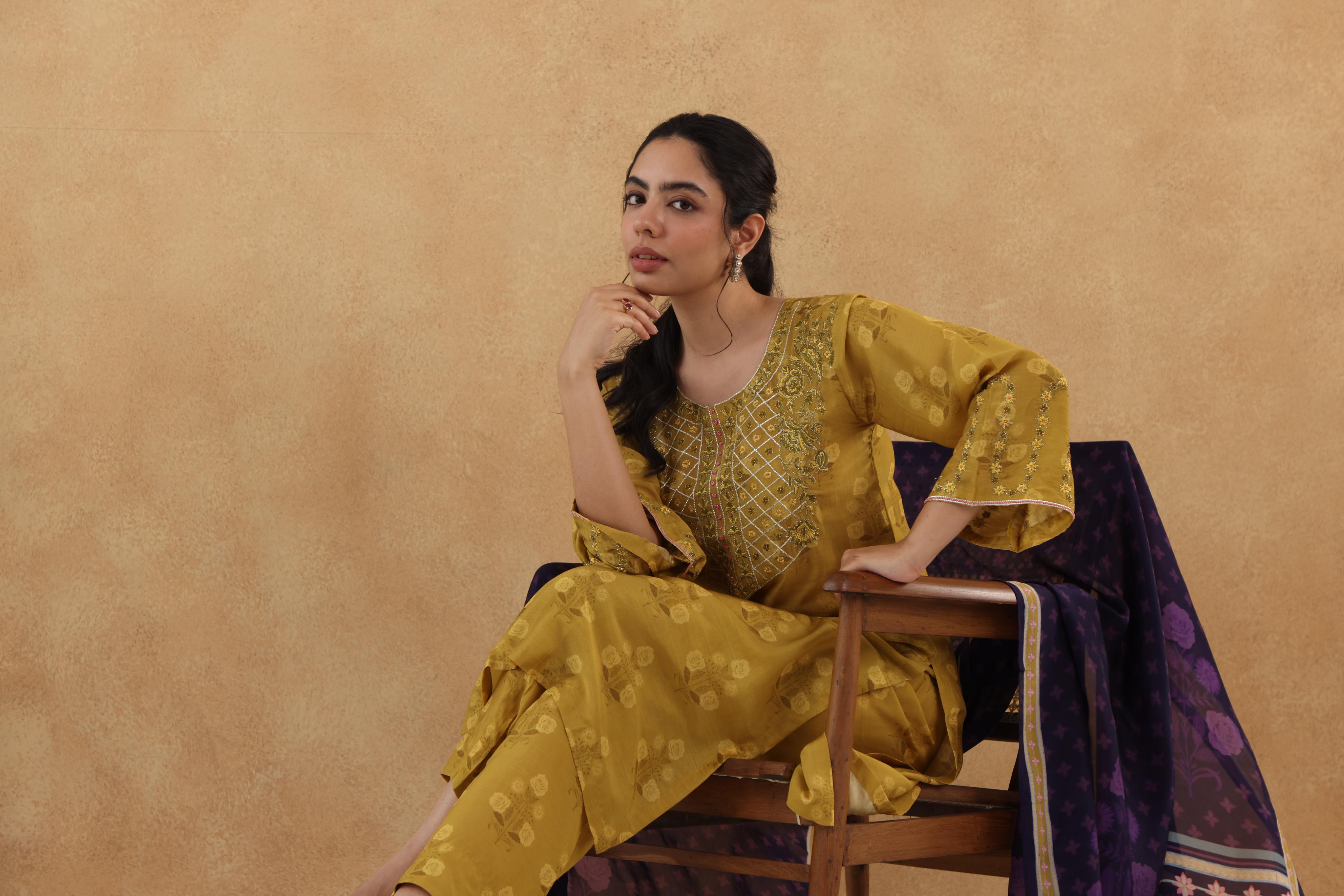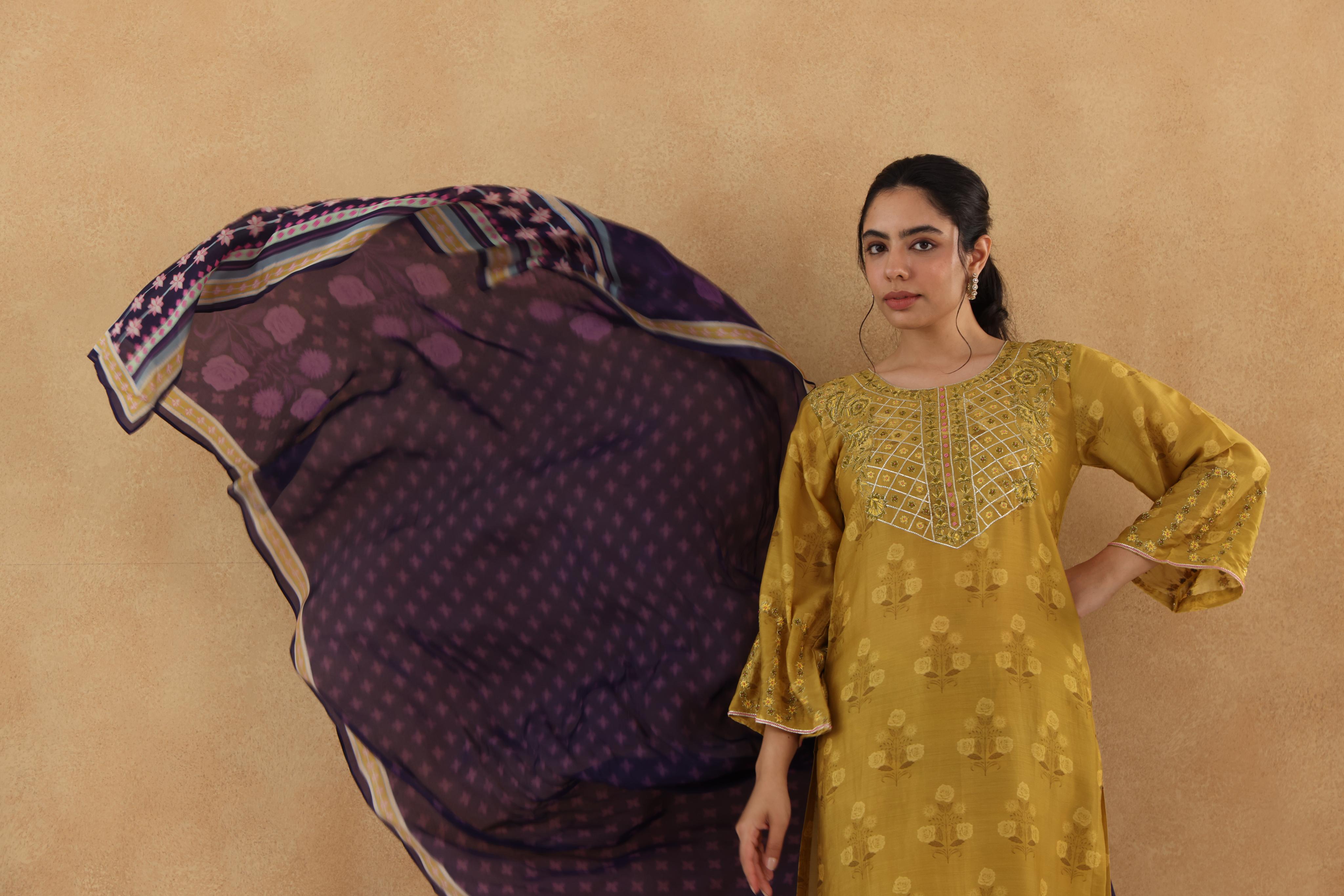 Timeless and graceful, the Gulnar Set from our Firdos Collection, This kurta set is crafted in digits printed cotton silk, featuring intricate thread and gold badla embroidery on the neckline, and sleeves, lending it a refined touch of craftsmanship. Paired with a silk dupatta highlighted with delicate woven floral patterns, the ensemble balances elegance with understated luxury.