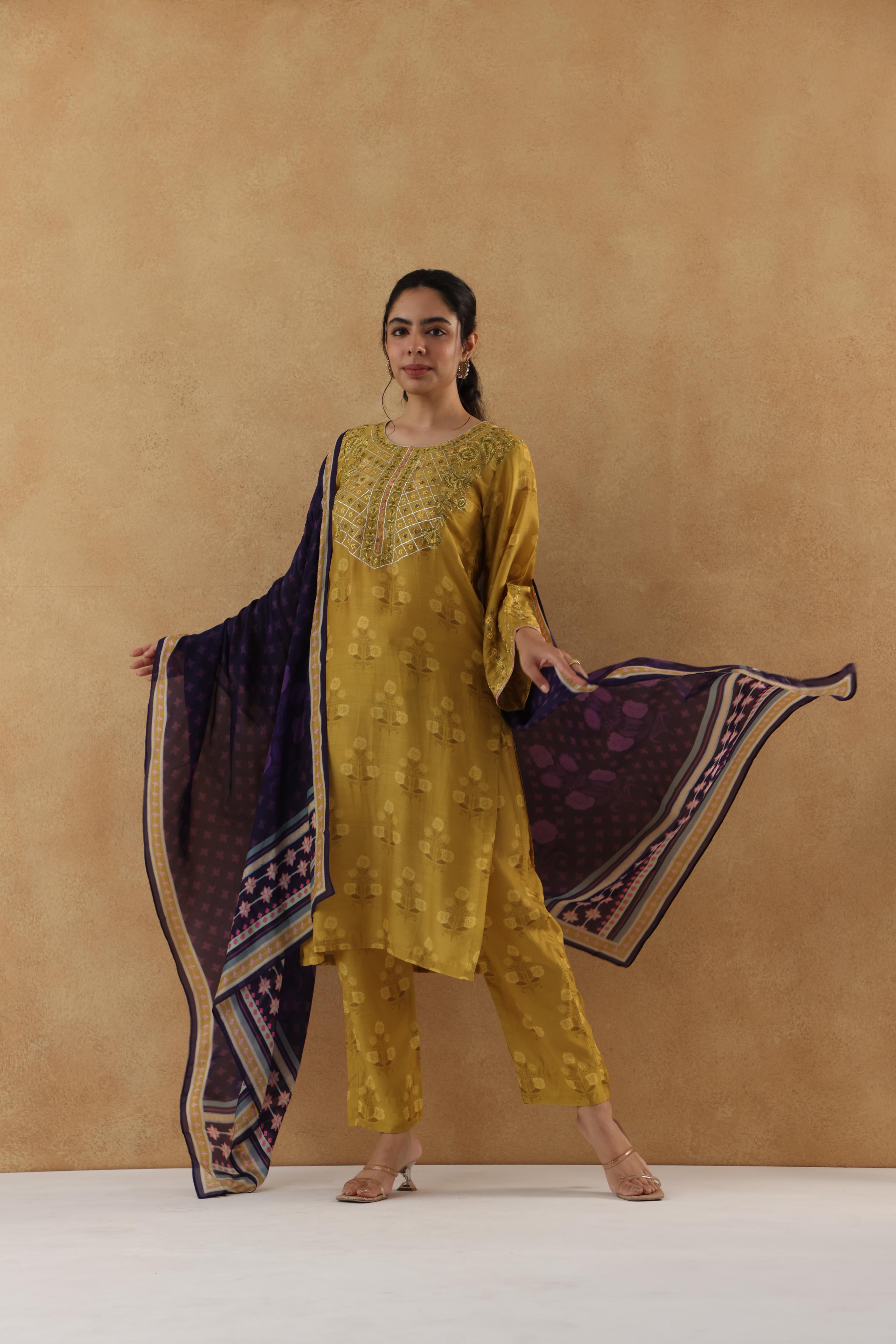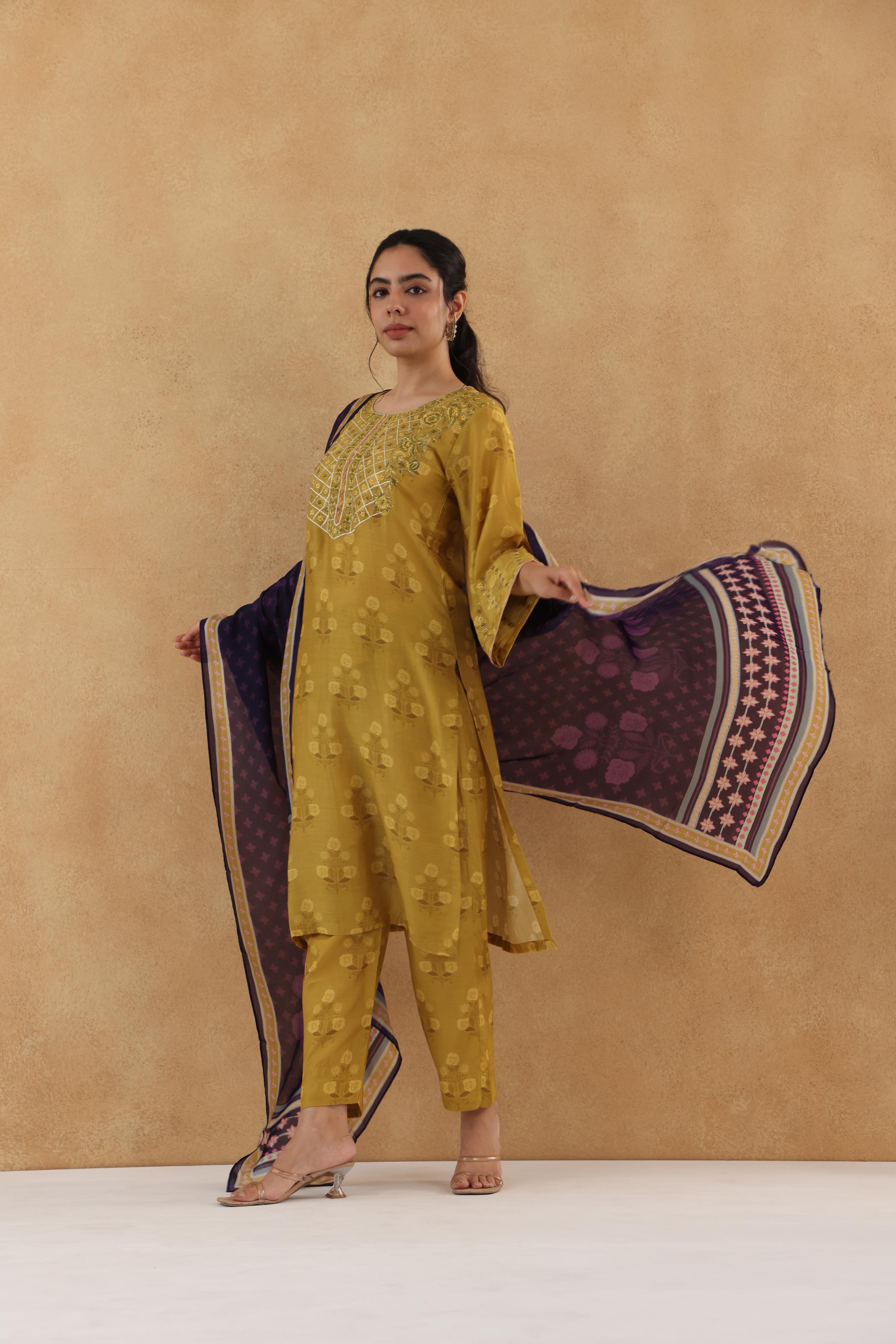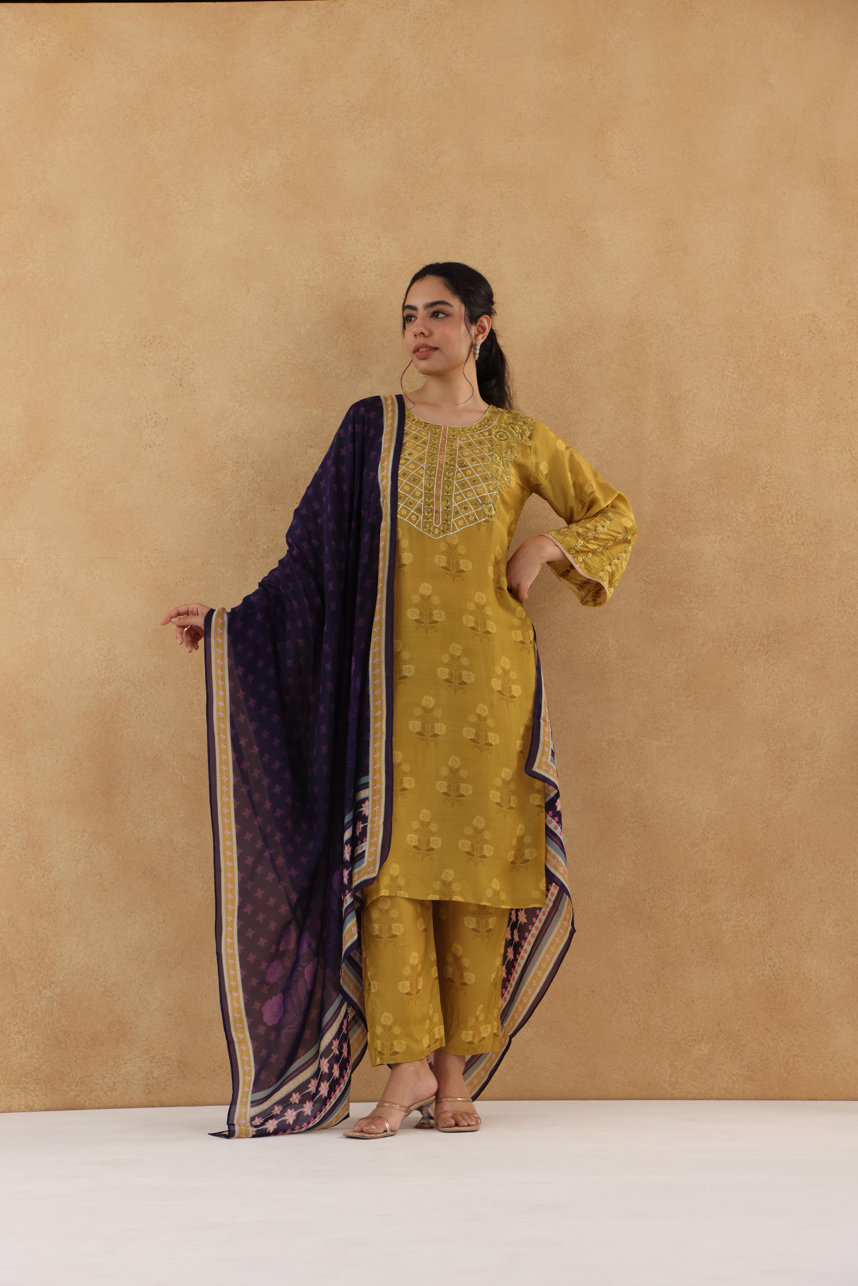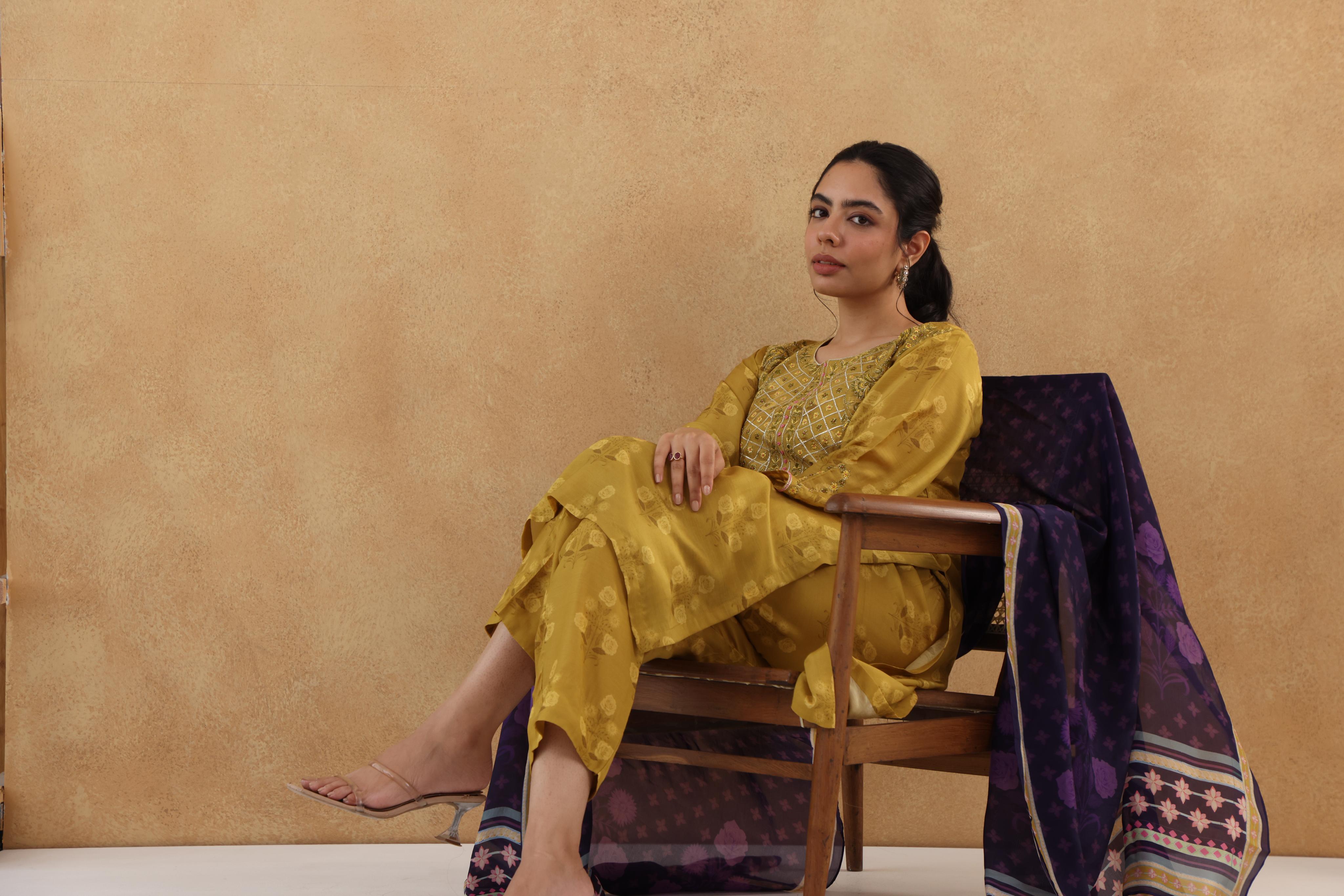 Timeless and graceful, the Gulnar Set from our Firdos Collection, This kurta set is crafted in digits printed cotton silk, featuring intricate thread and gold badla embroidery on the neckline, and sleeves, lending it a refined touch of craftsmanship. Paired with a silk dupatta highlighted with delicate woven floral patterns, the ensemble balances elegance with understated luxury.