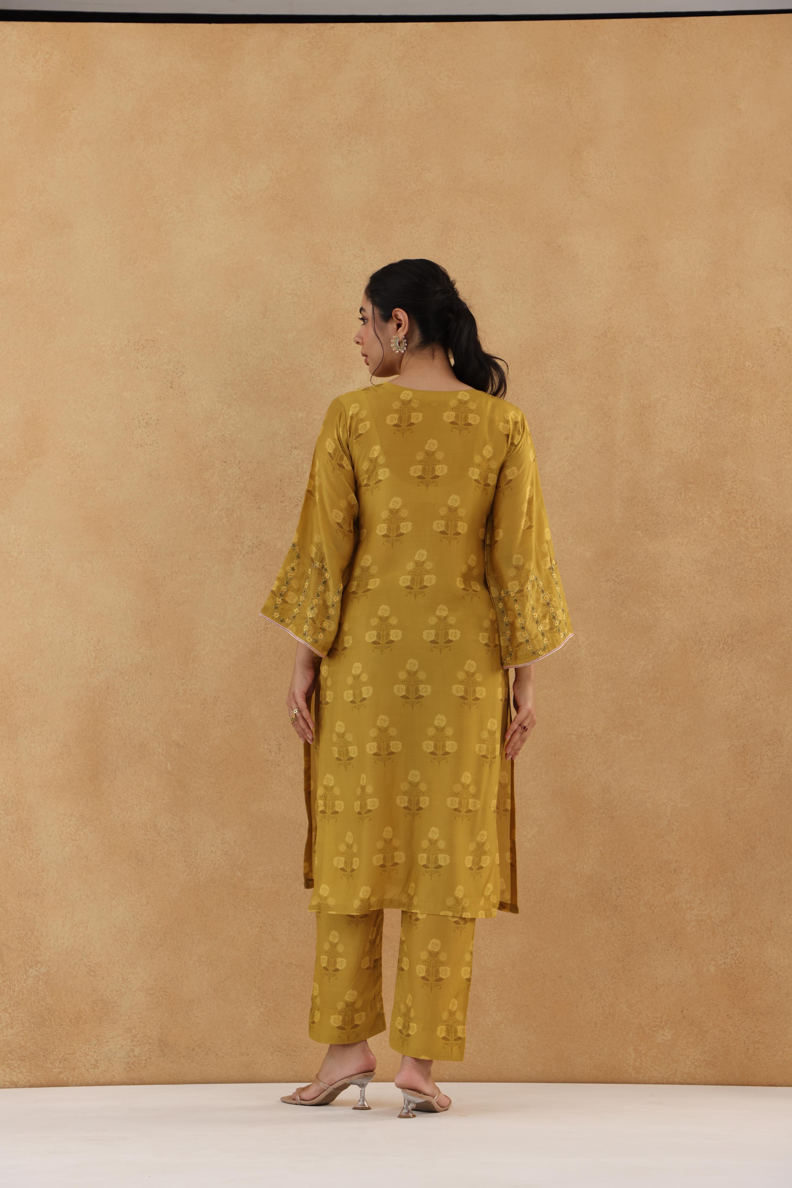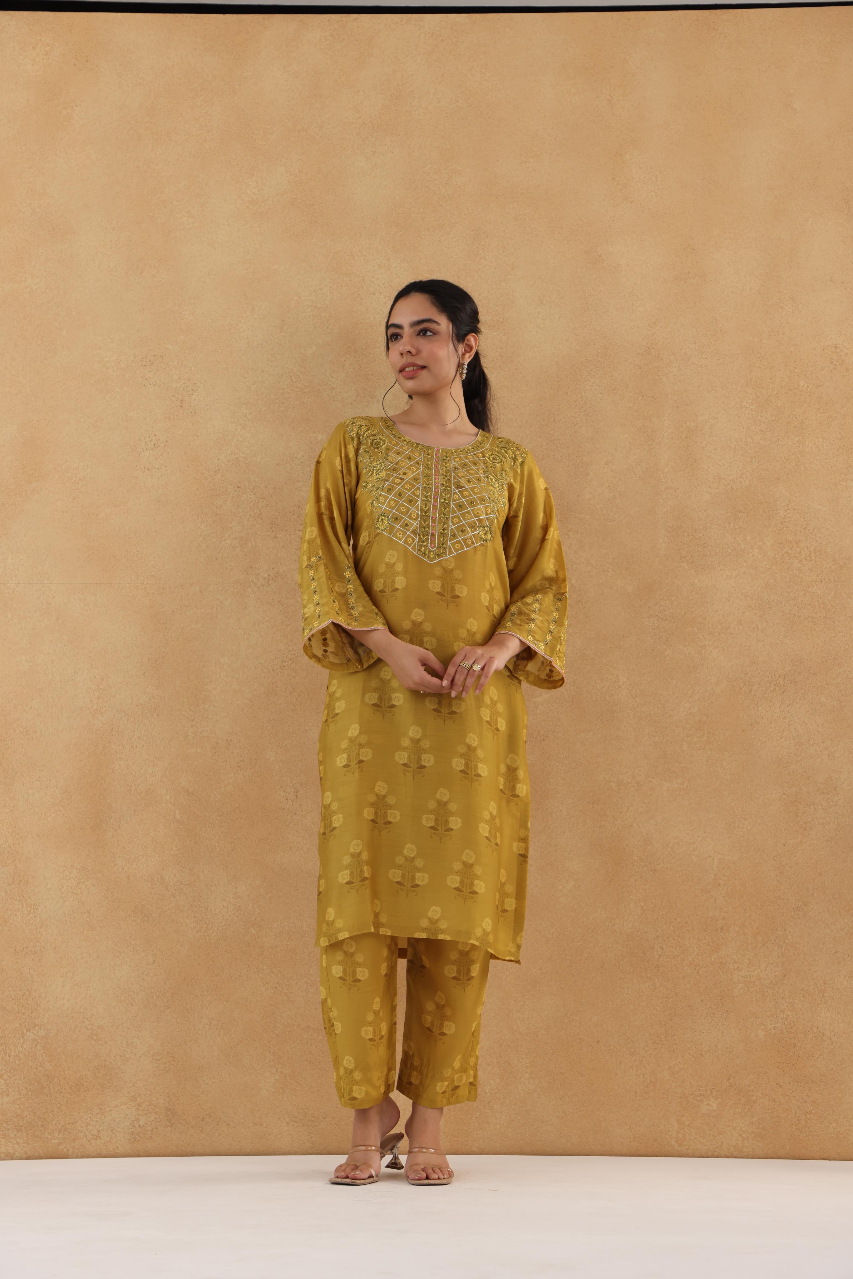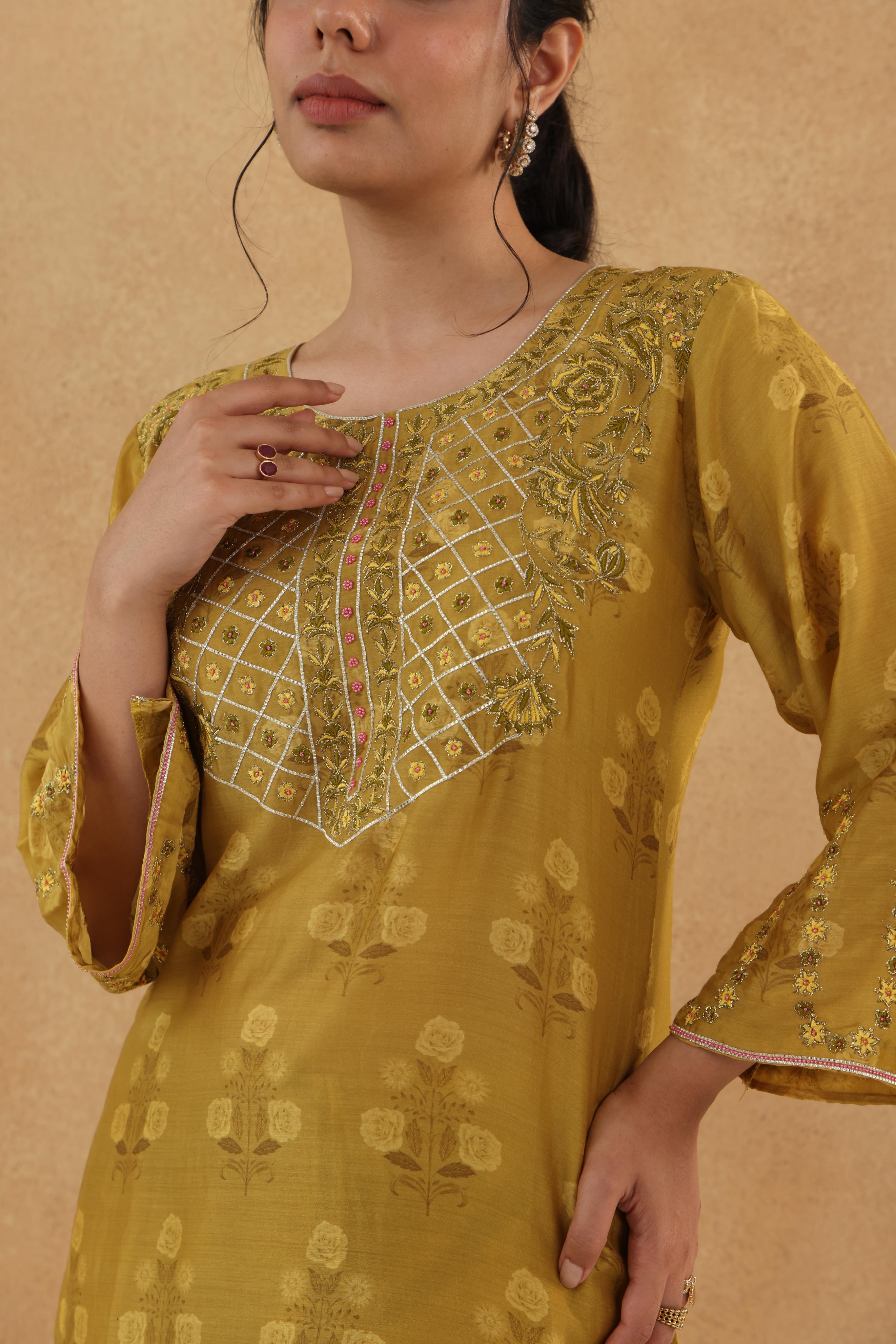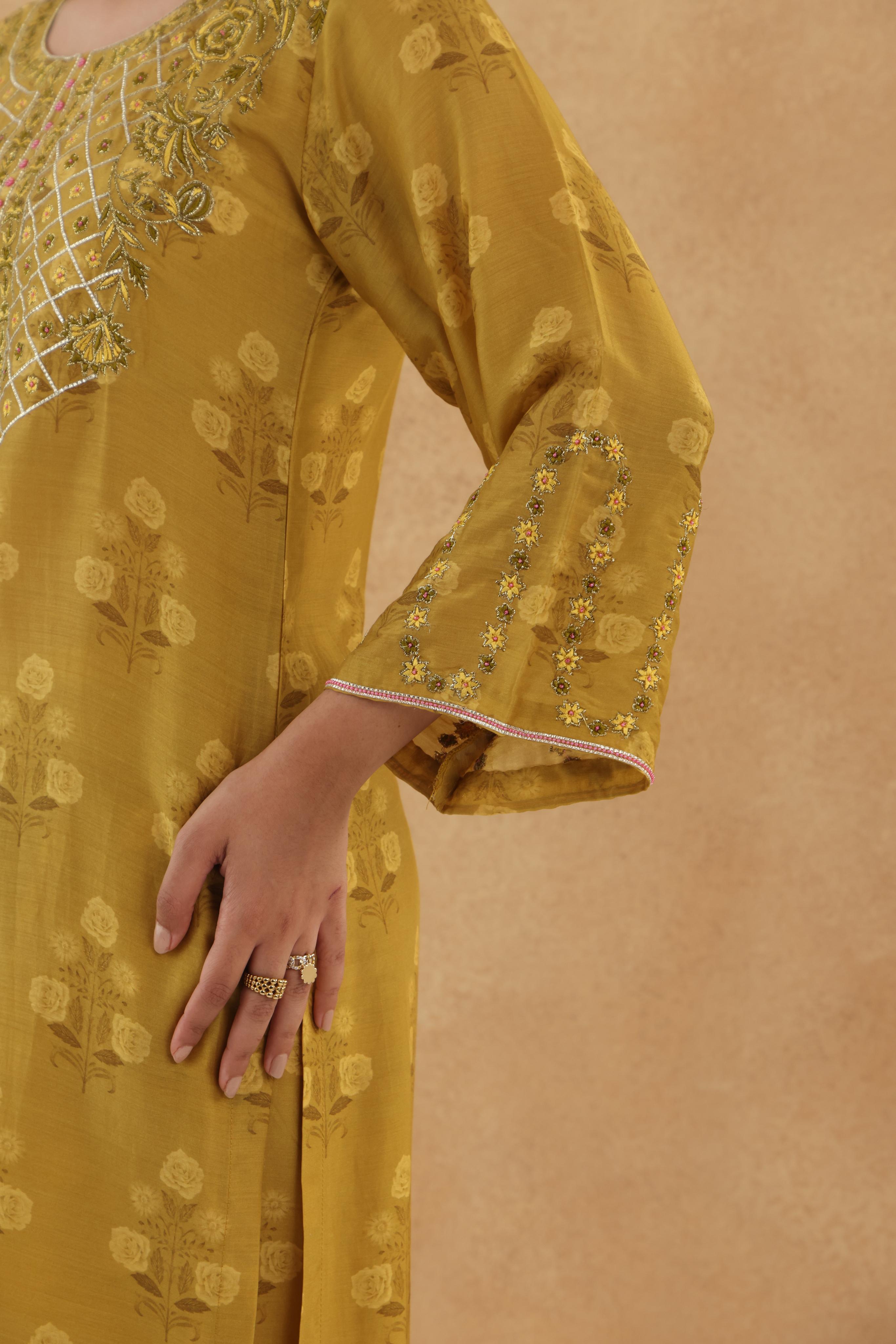 Timeless and graceful, the Gulnar Set from our Firdos Collection, This kurta set is crafted in digits printed cotton silk, featuring intricate thread and gold badla embroidery on the neckline, and sleeves, lending it a refined touch of craftsmanship. Paired with a silk dupatta highlighted with delicate woven floral patterns, the ensemble balances elegance with understated luxury.