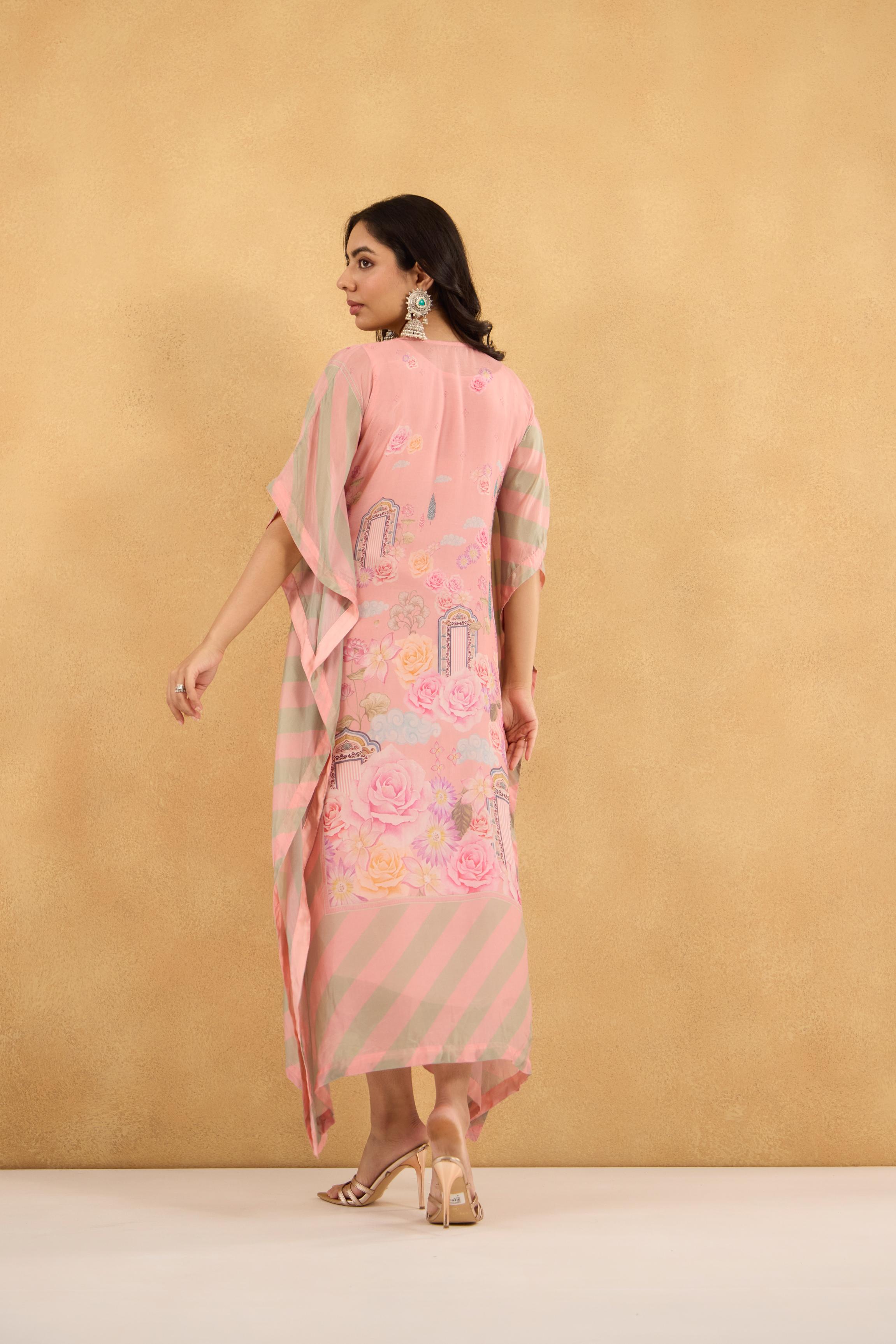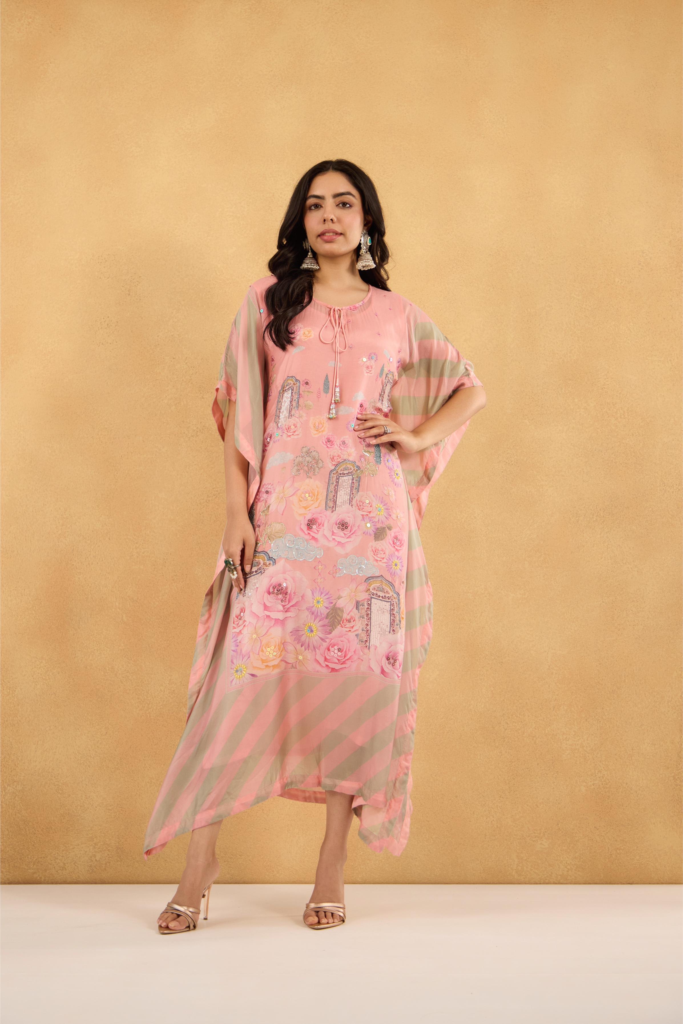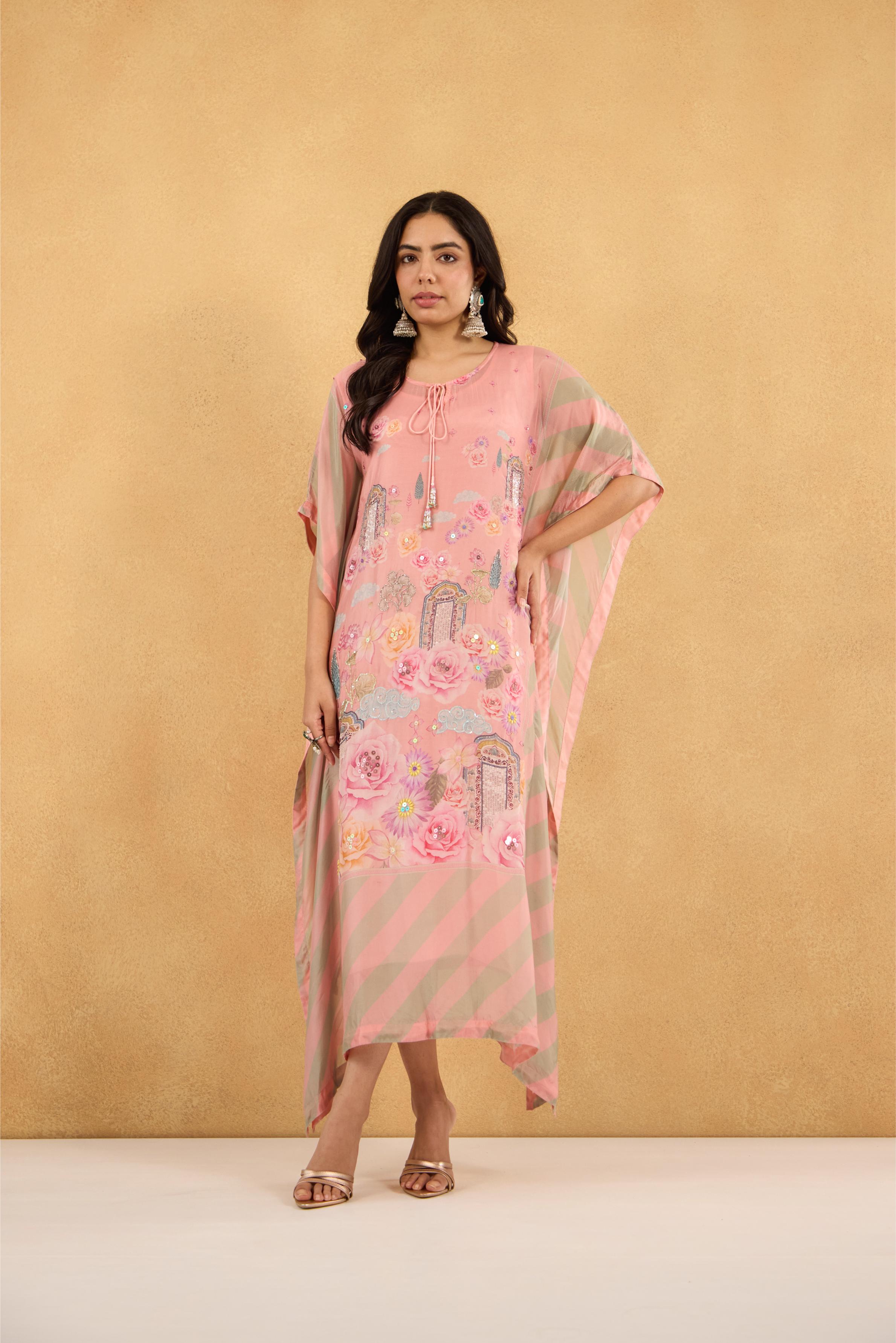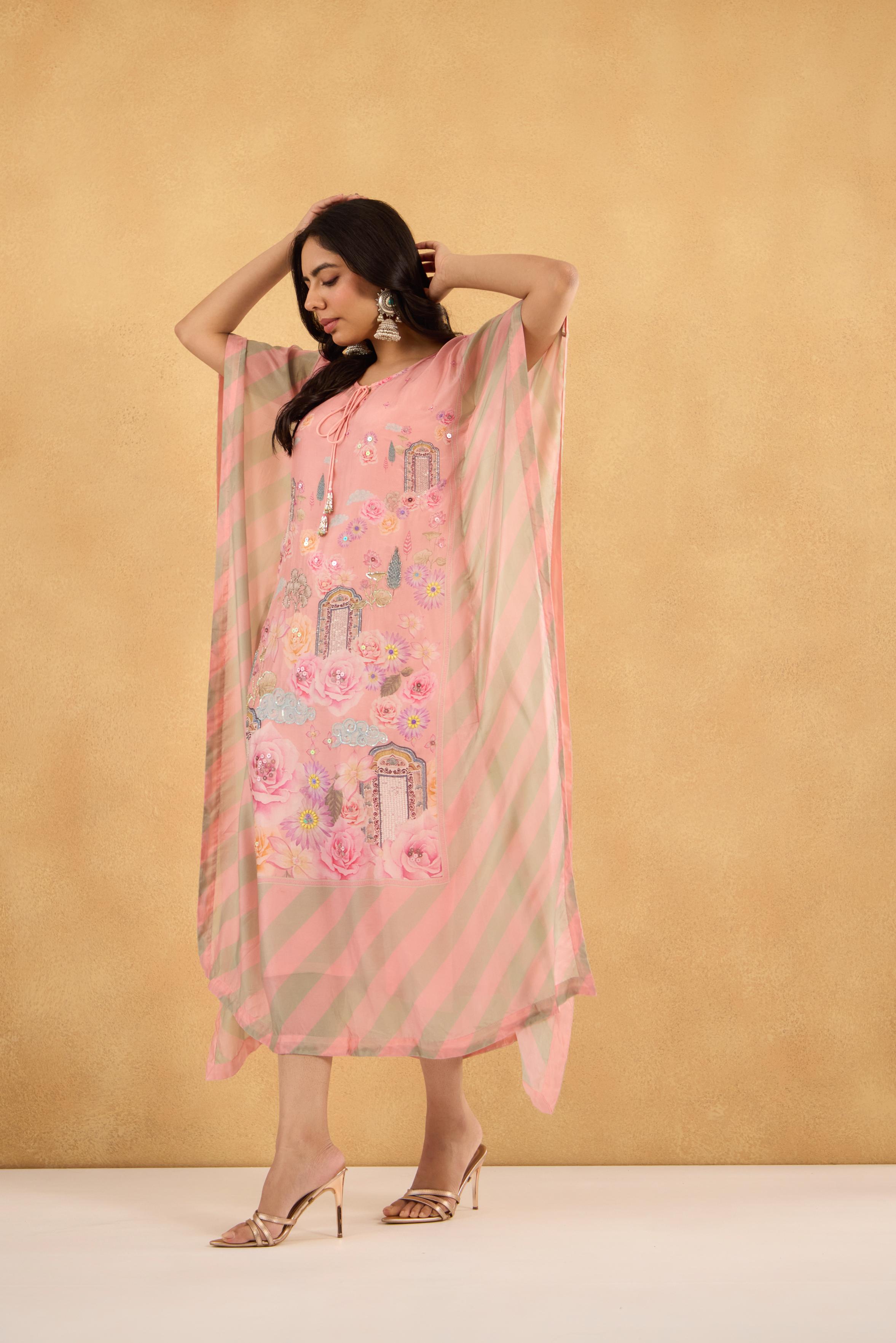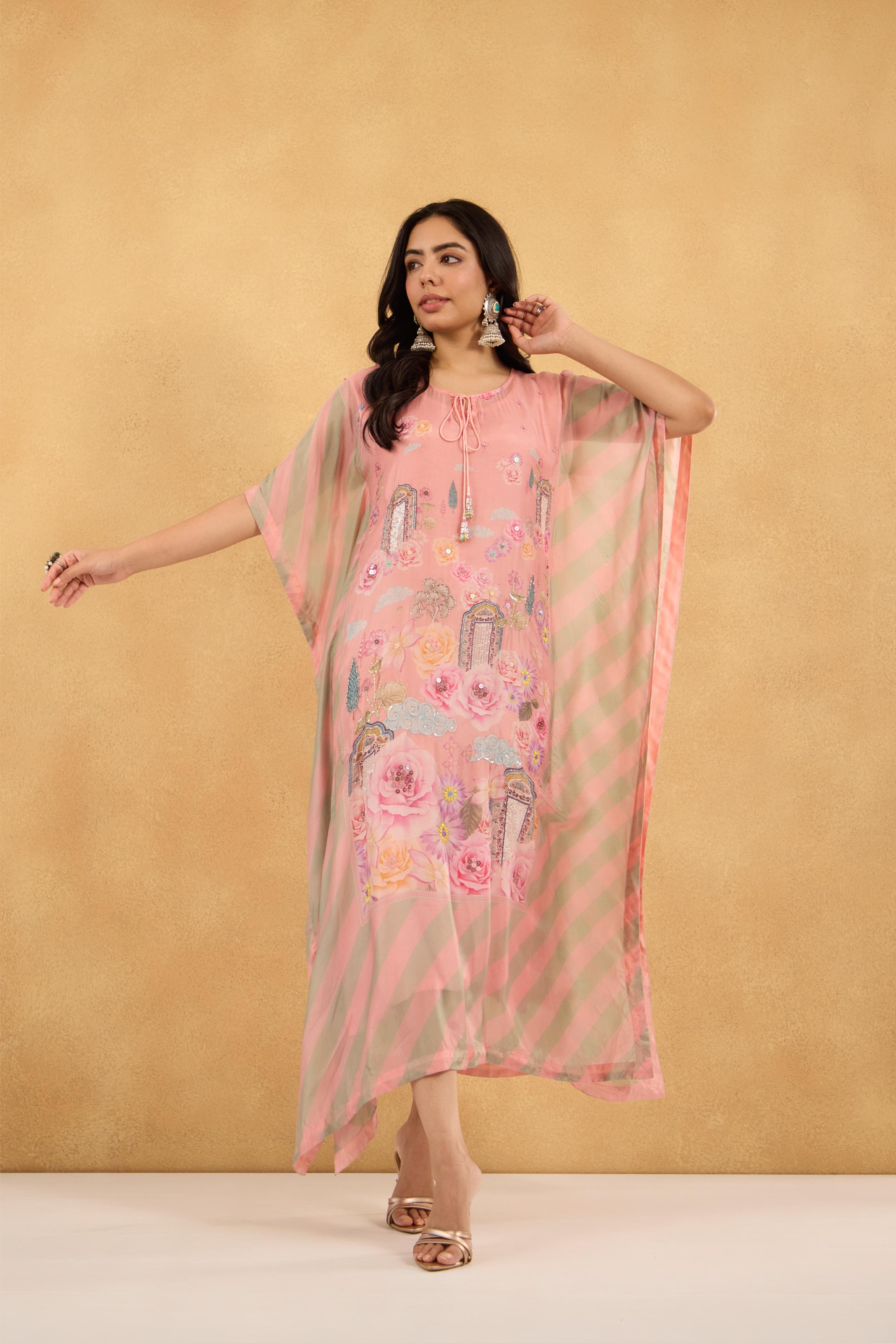 Soft and ethereal, the Noor Kaftan from our Firdos Collection is crafted on a soothing pastel striped canvas. The front is delicately hand-embroidered with floral motifs in pastel pinks, yellows, and lilacs, accented with hints of aqua blue, bringing together artisanal detail and effortless elegance.