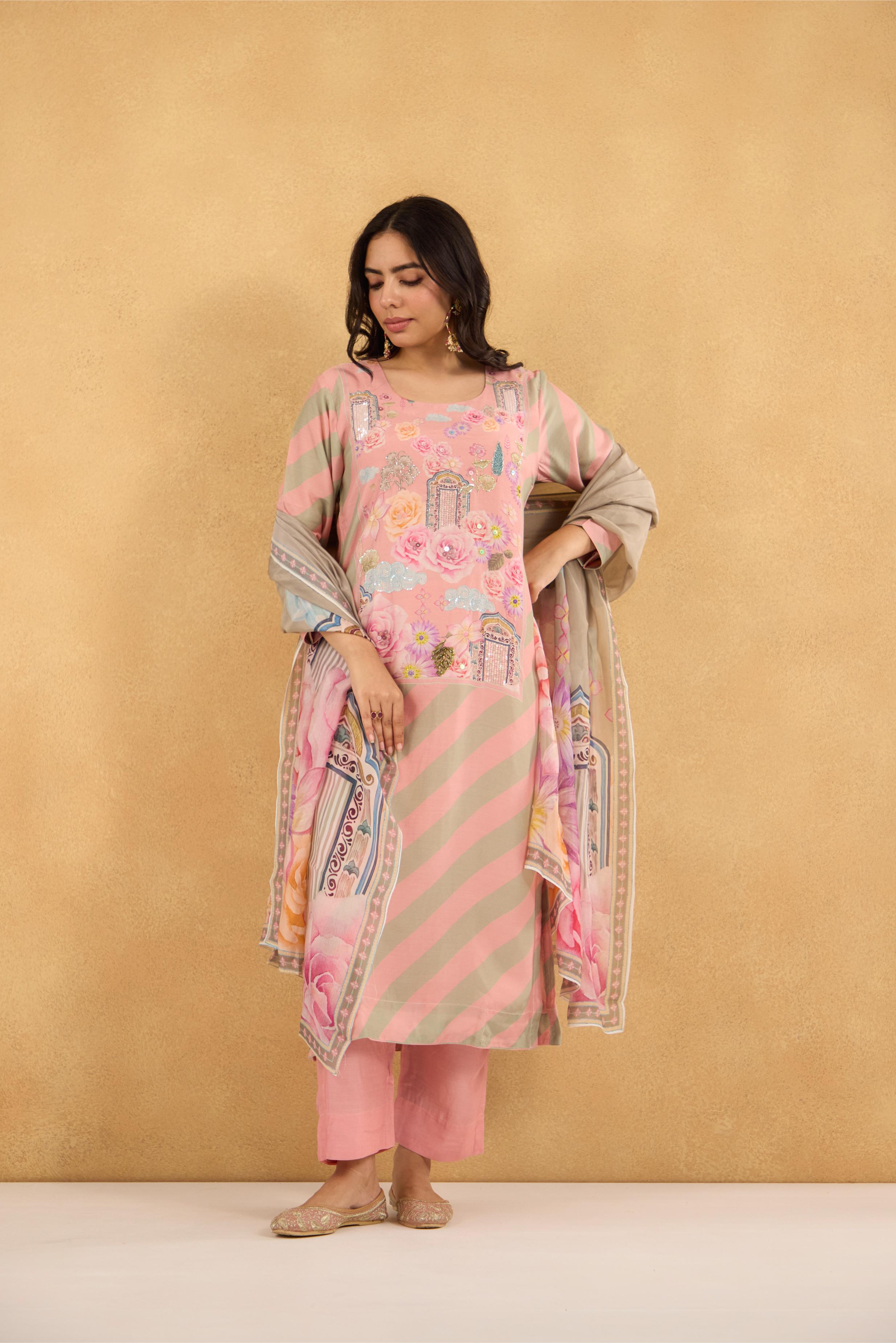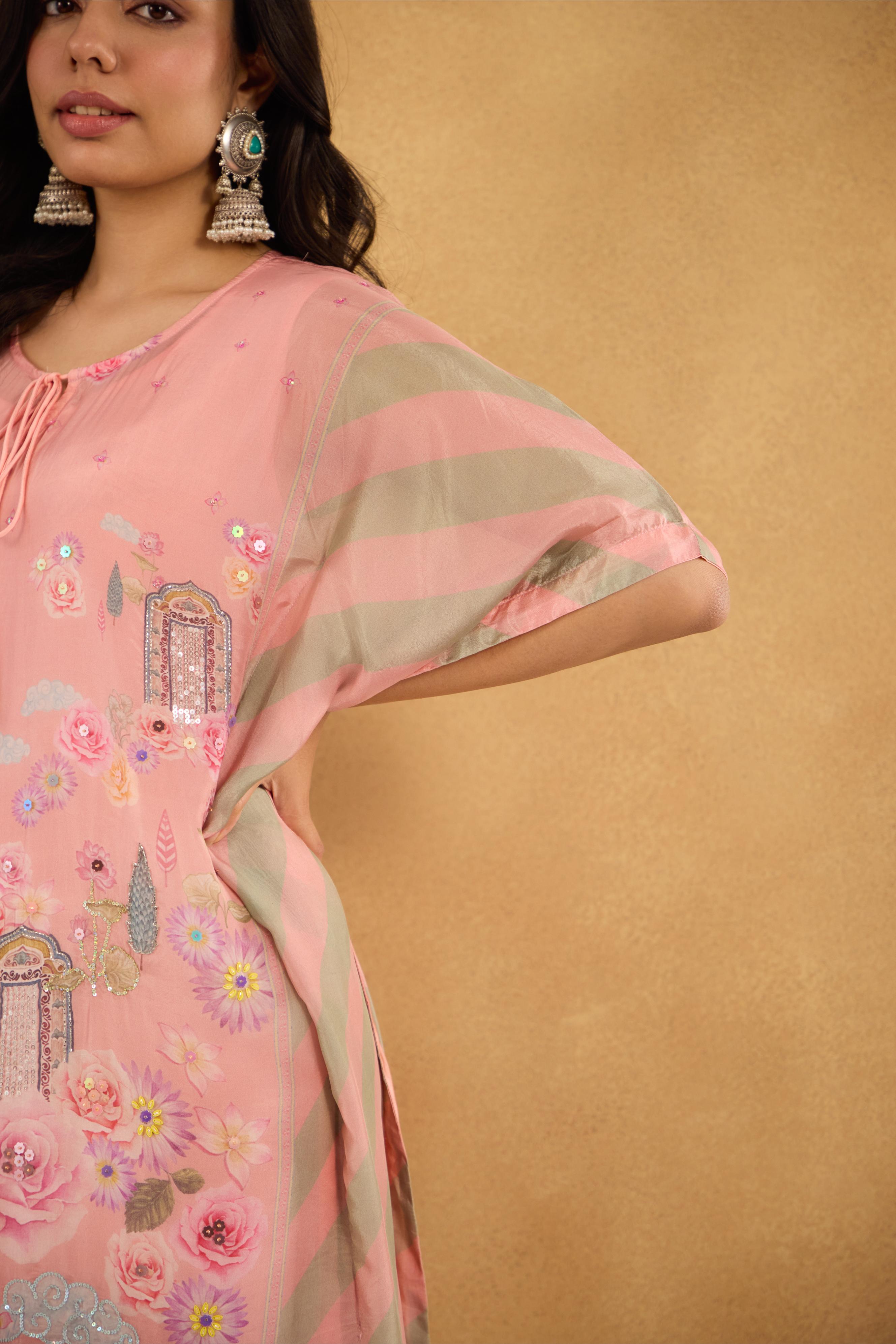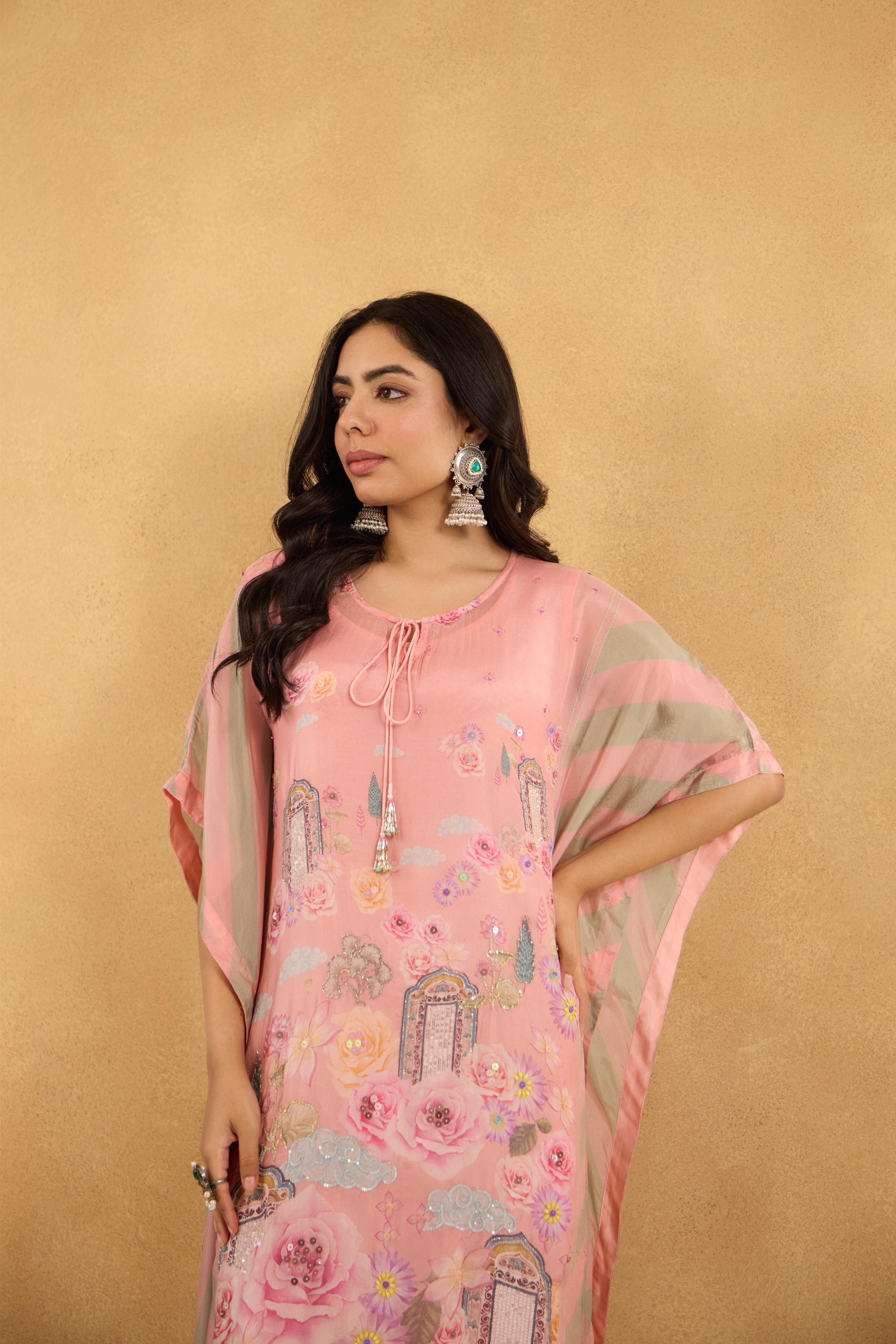 The relaxed silhouette drapes gracefully, while the breezy fabric makes it a versatile choice for both day gatherings and evening soirees. With its pastel palette and airy form, this ensemble reflects the serenity of Kashmiri gardens kissed by spring light.
