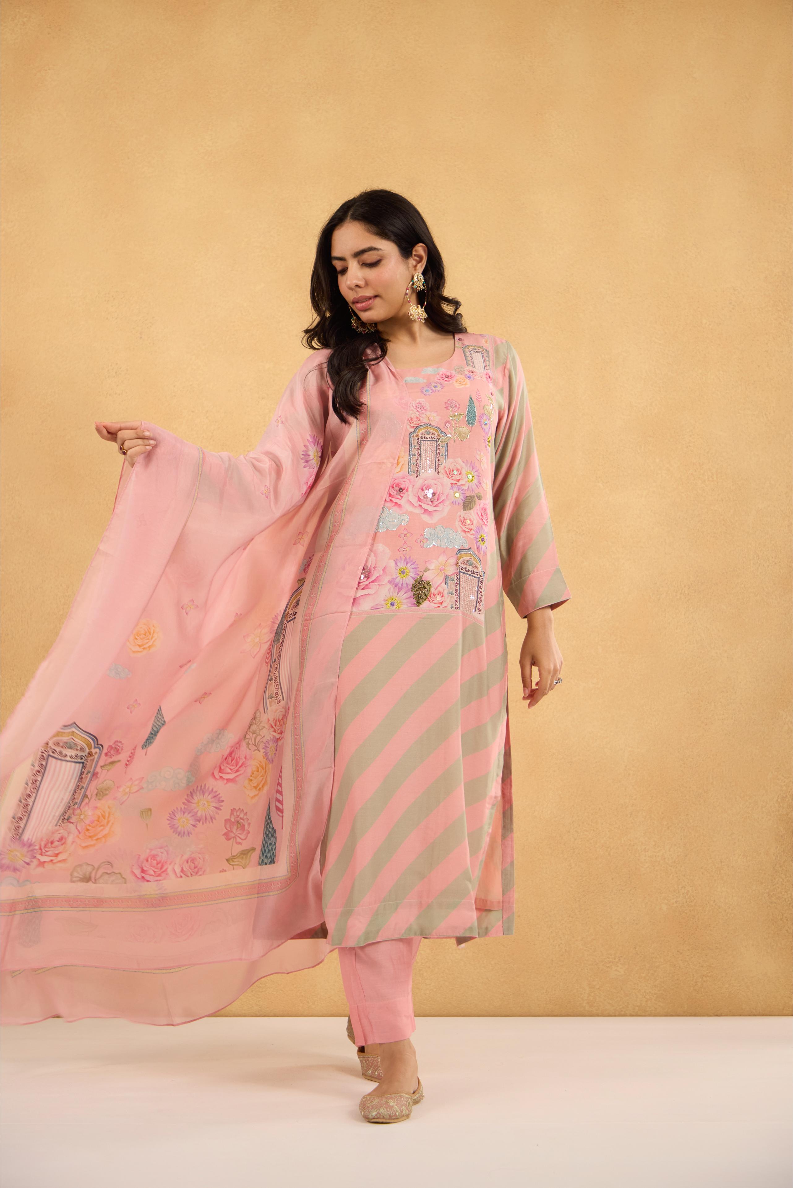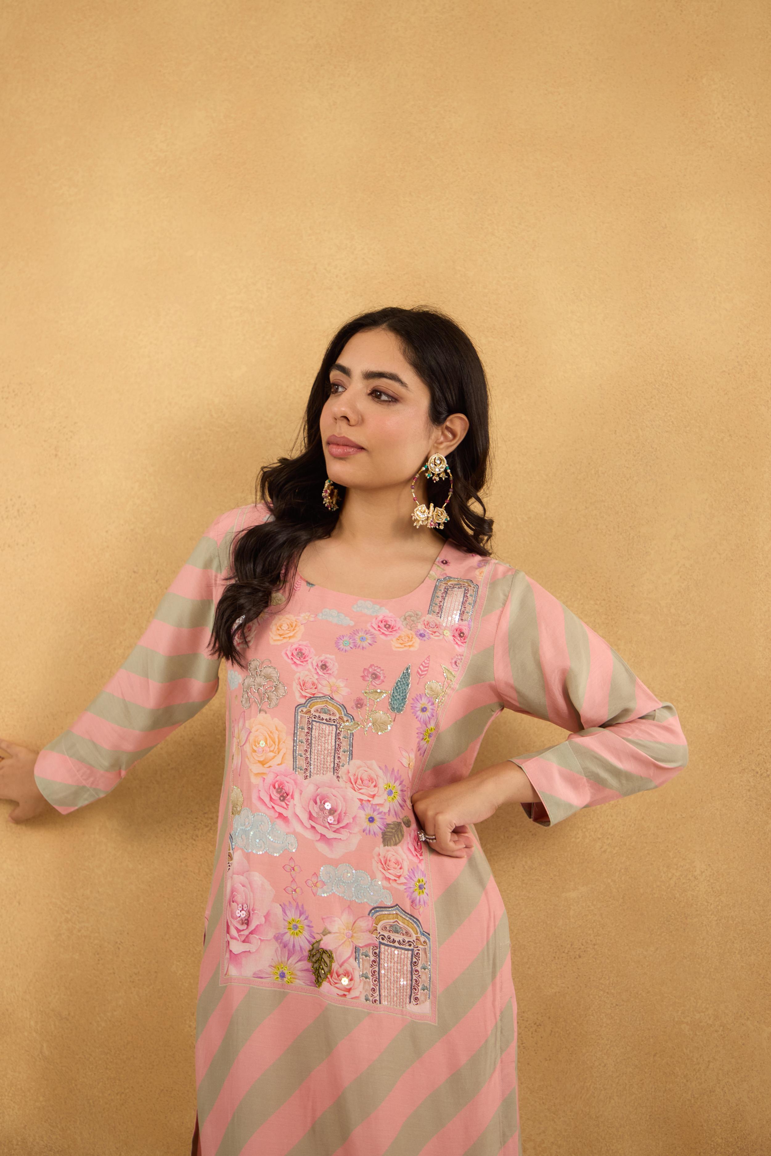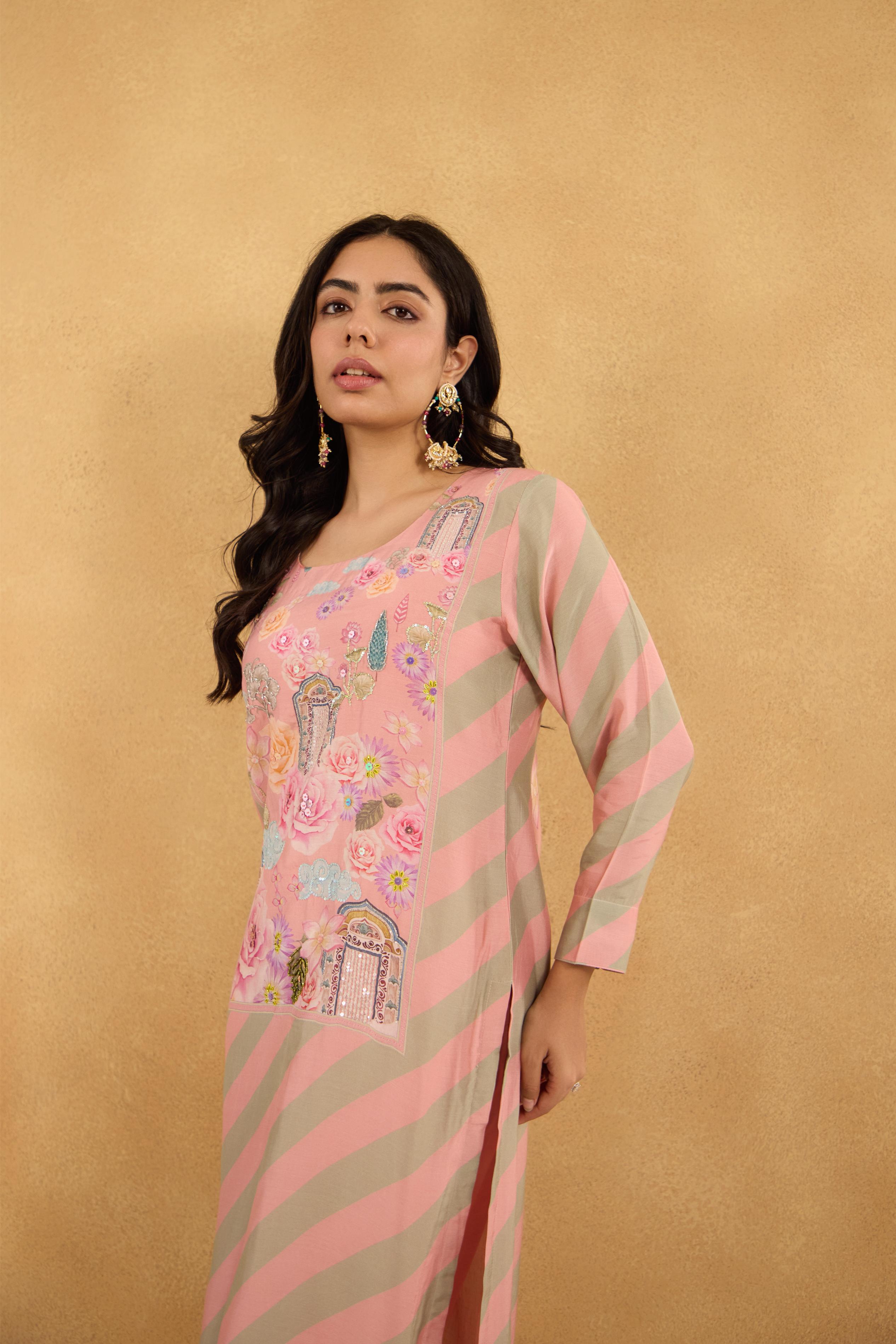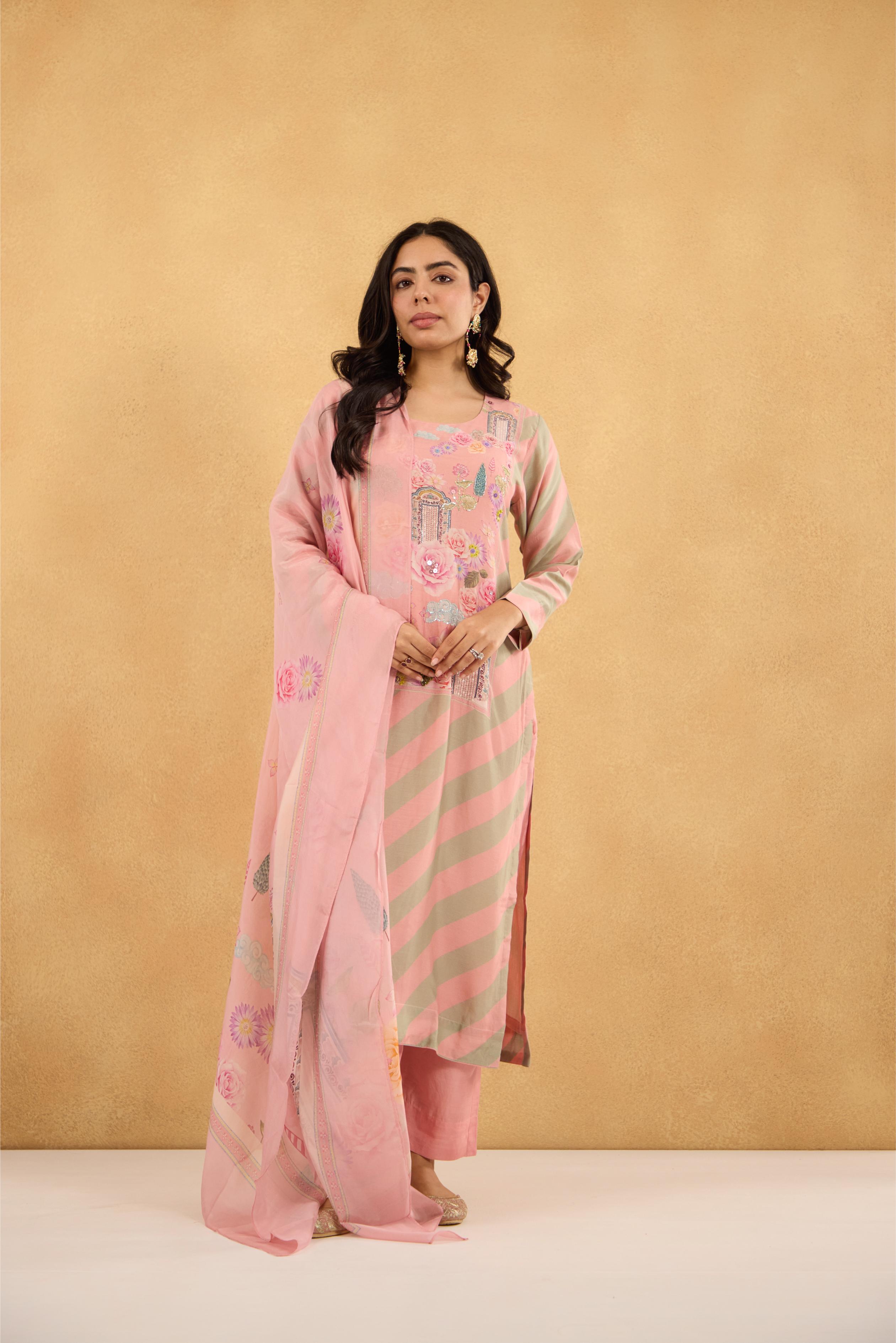 The relaxed silhouette drapes gracefully, while the breezy fabric makes it a versatile choice for both day gatherings and evening soirees. With its pastel palette and airy form, this ensemble reflects the serenity of Kashmiri gardens kissed by spring light.