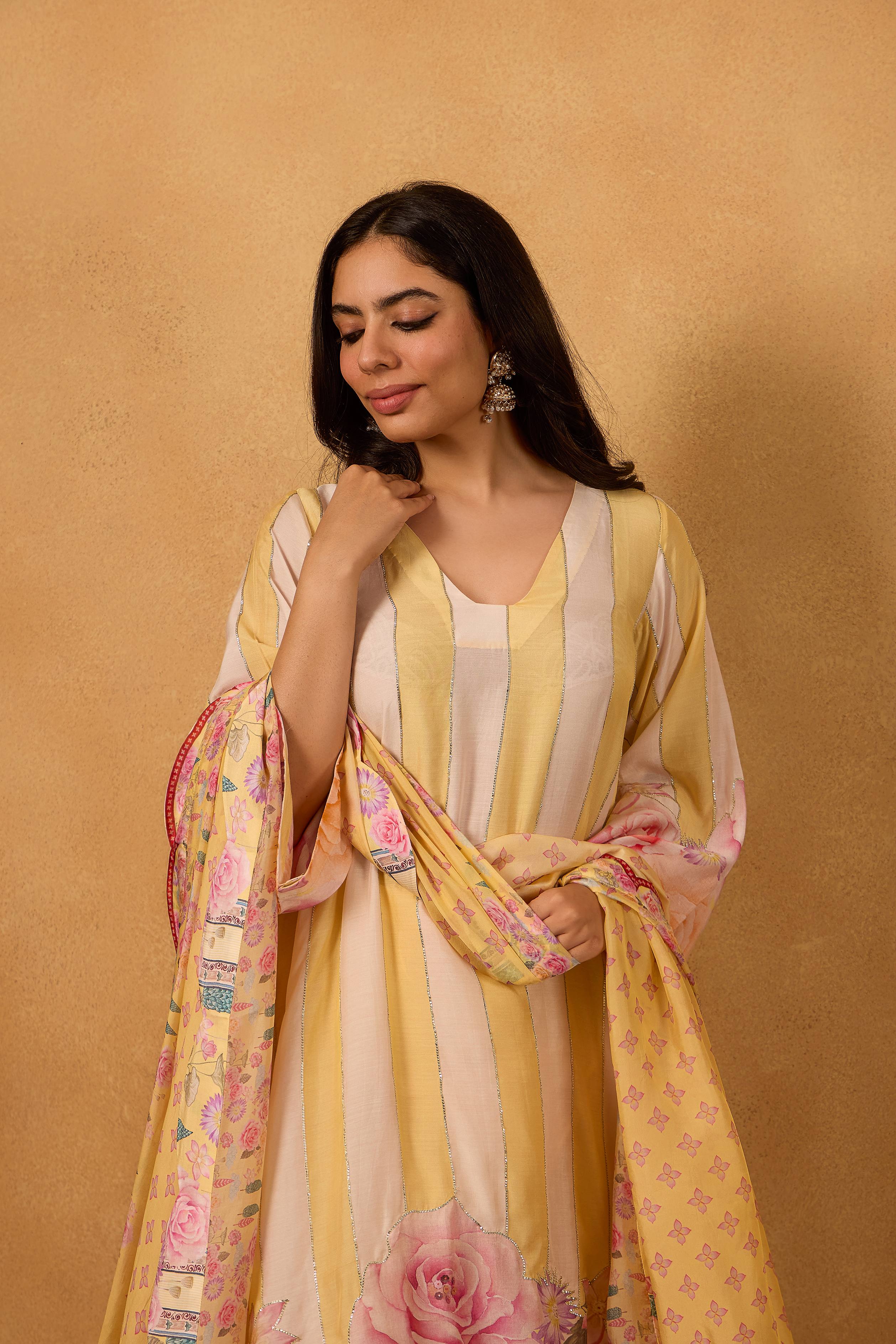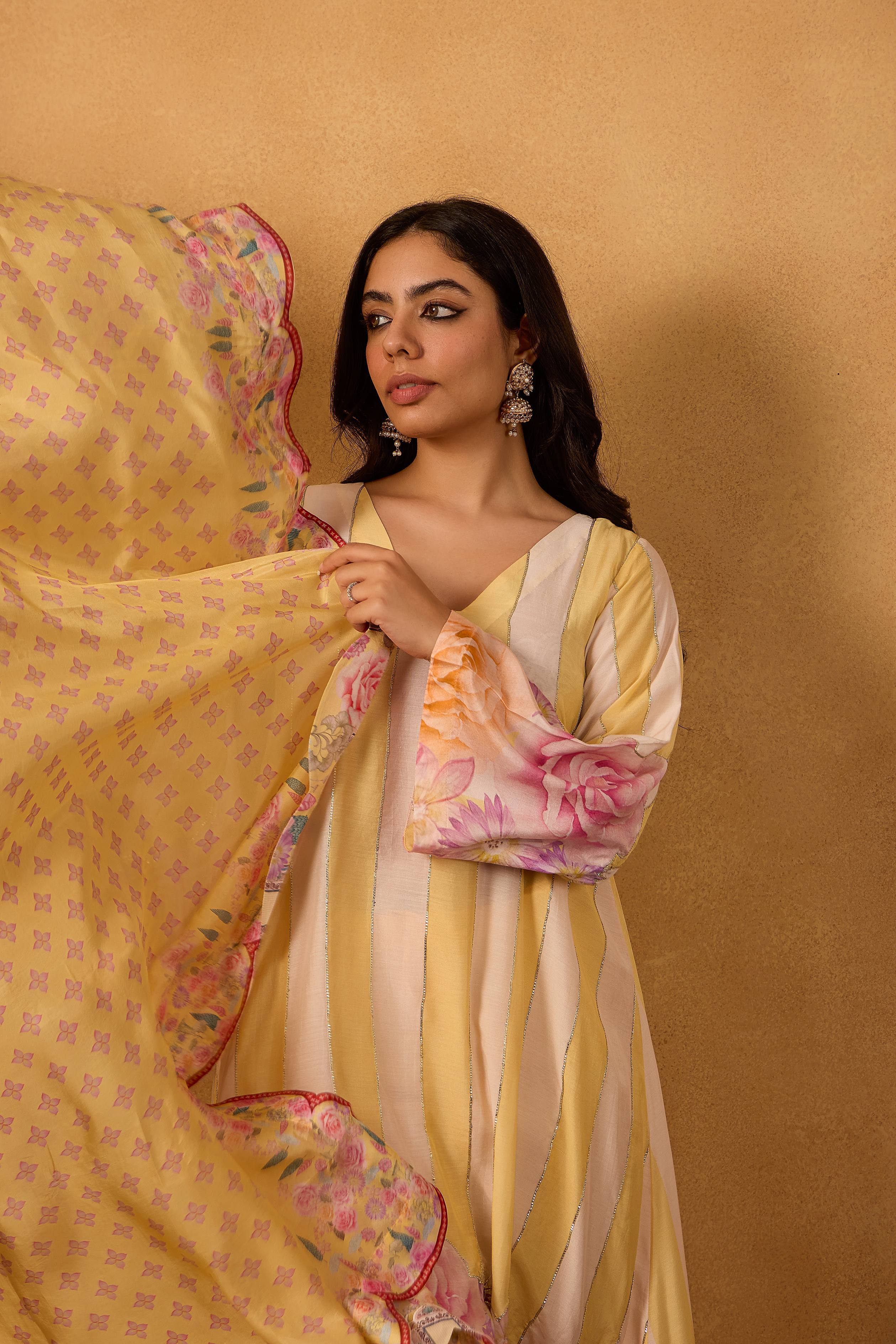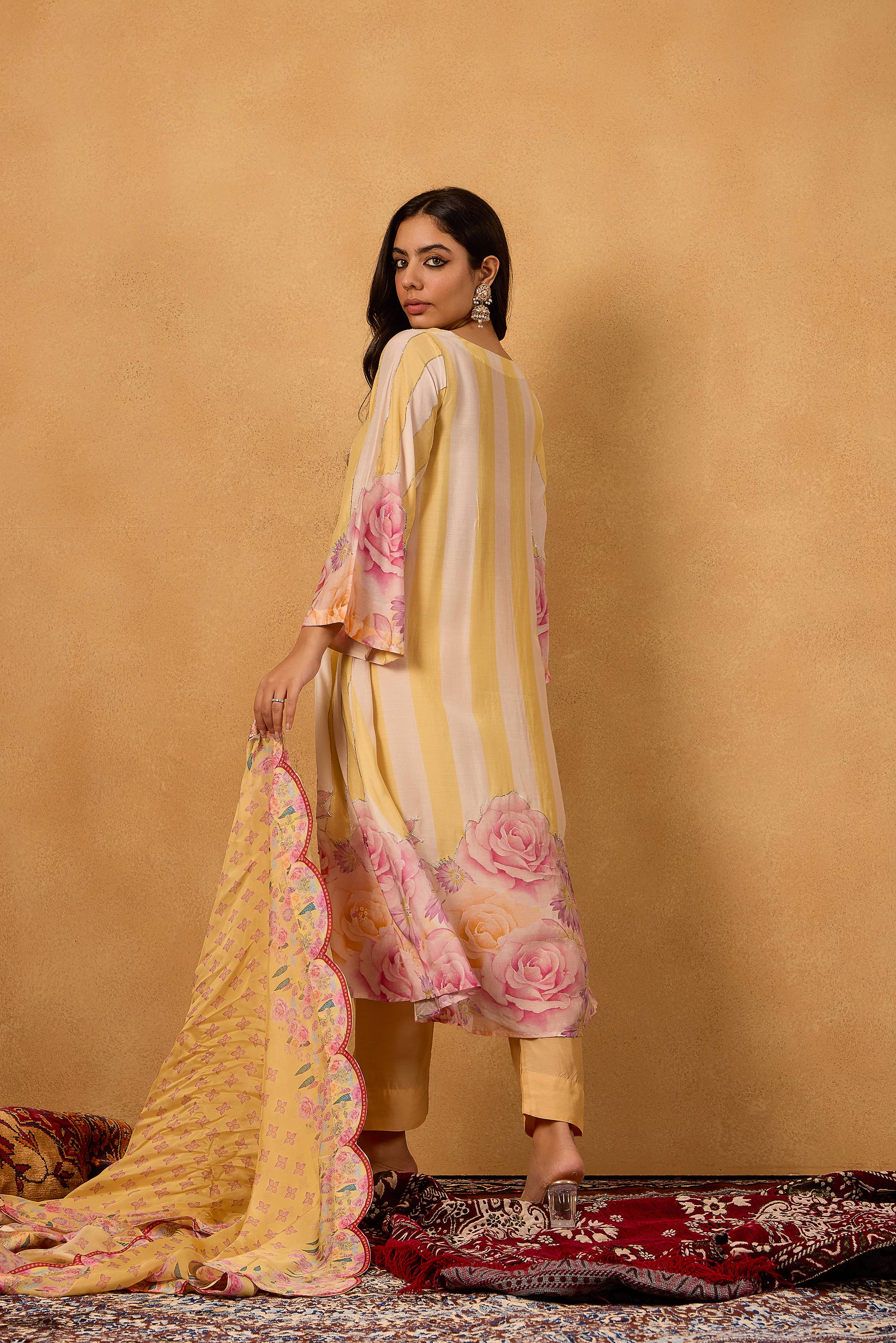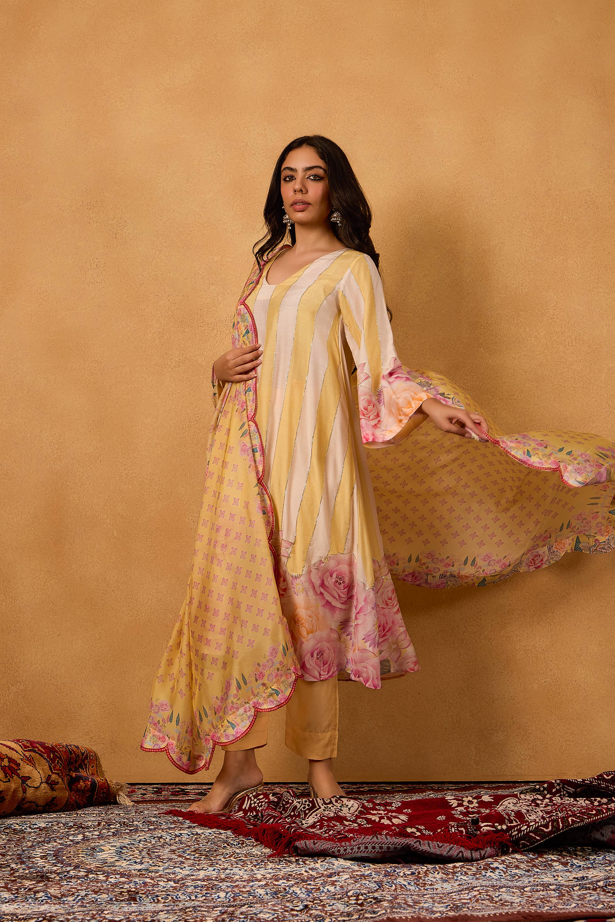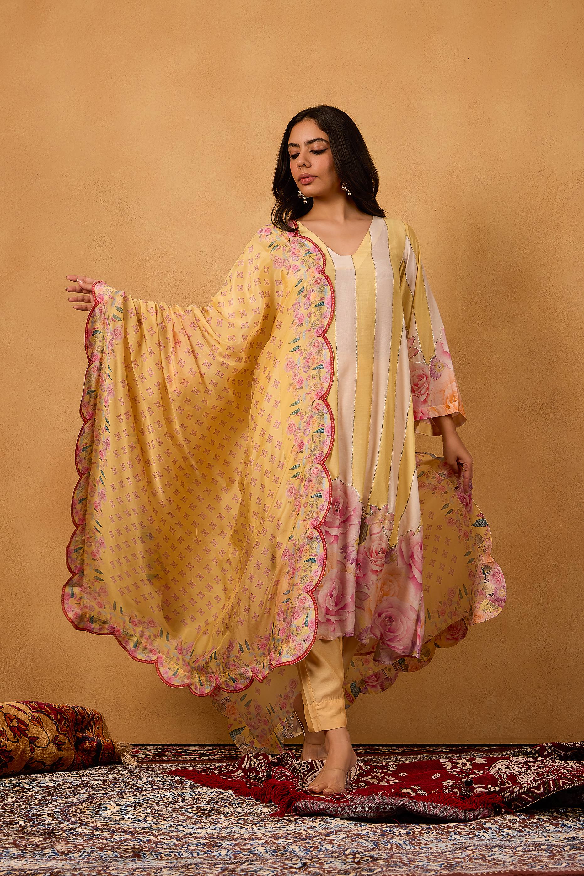 Paired with a soft floral silk dupatta adorned with oversized pastel blooms, this set captures the essence of Kashmiri gardens in full bloom. A statement piece that transitions effortlessly from festive mornings to elegant evening soirees.