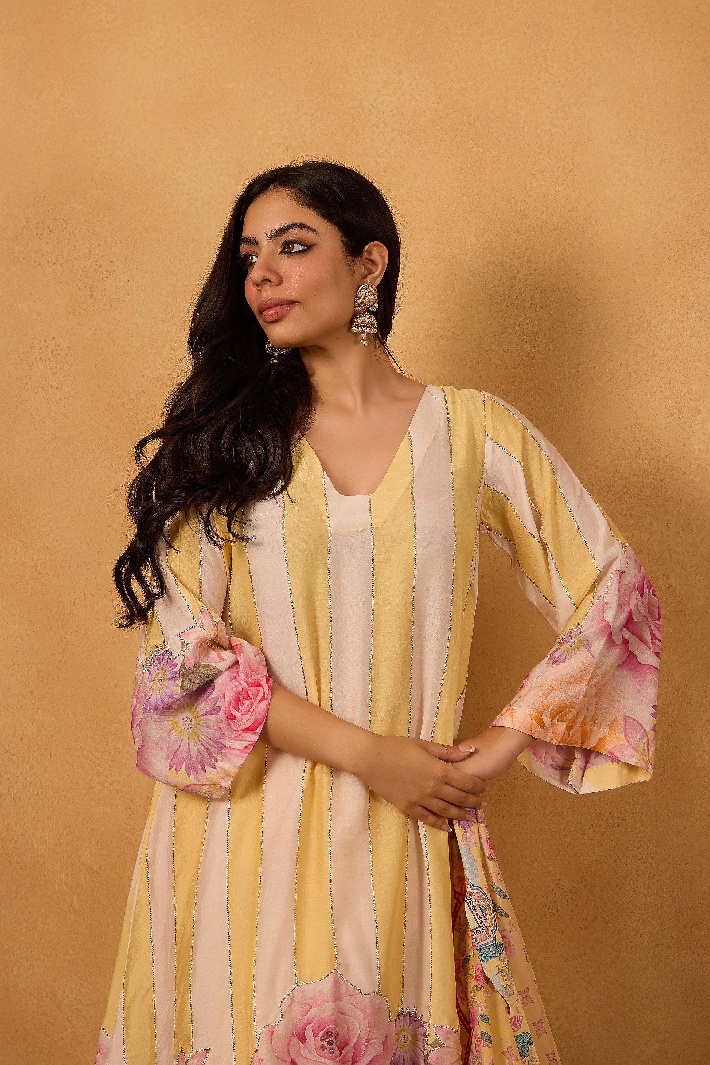 A graceful blend of tradition and modern charm, Rozana Kurta Set from our Firdos Collection features bold stripes that exude timeless elegance. The kurta is beautifully enhanced with intricate gota work on the front and sleeves, while the handmade tassels at the neckline add a playful artisanal touch.