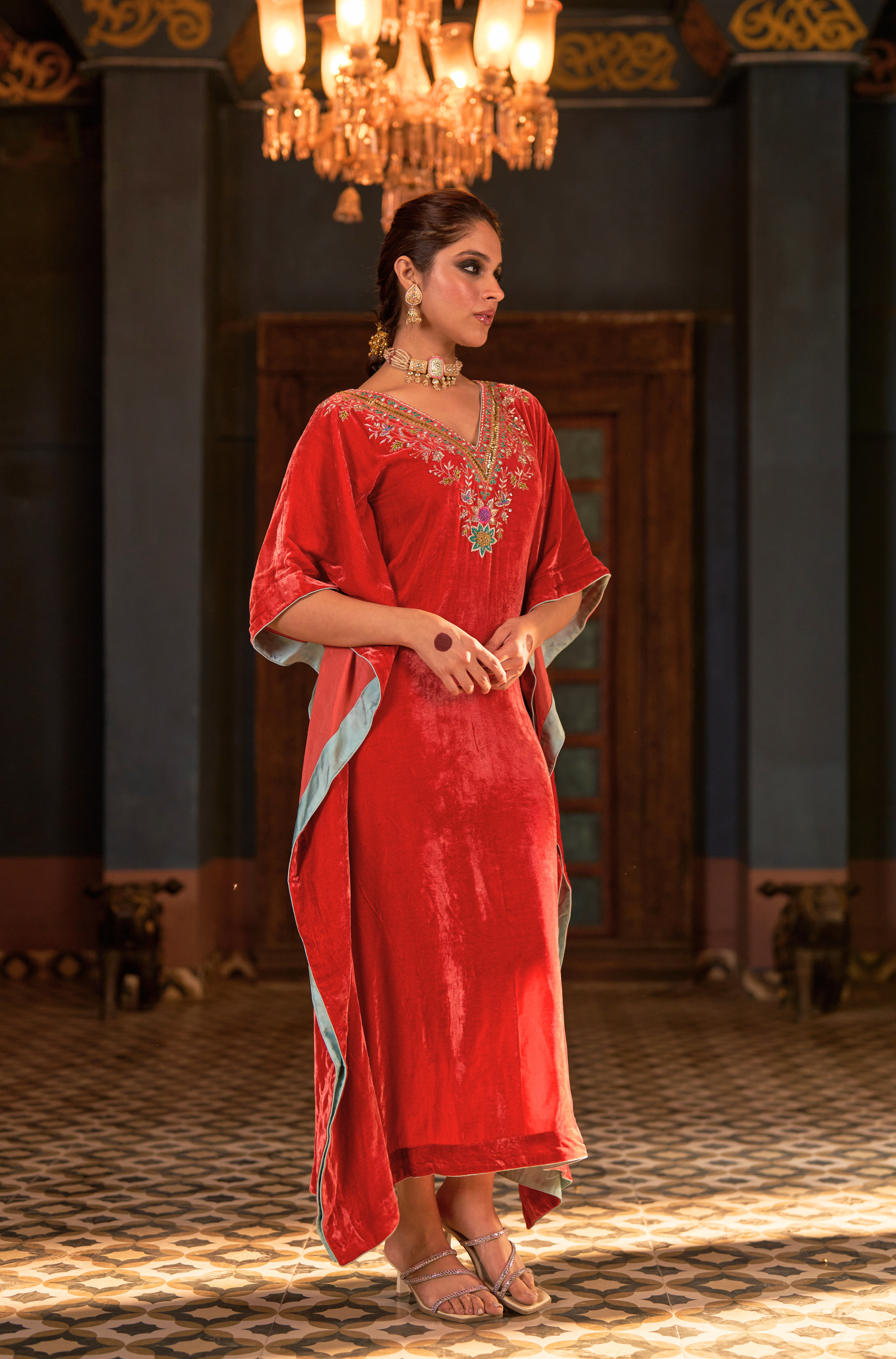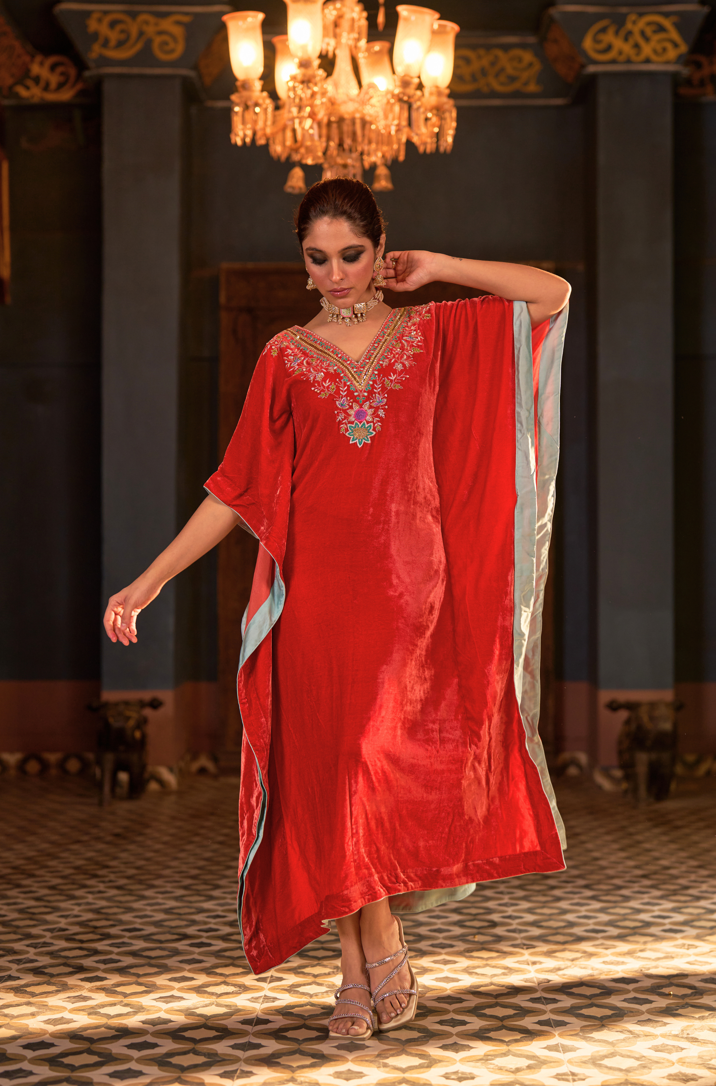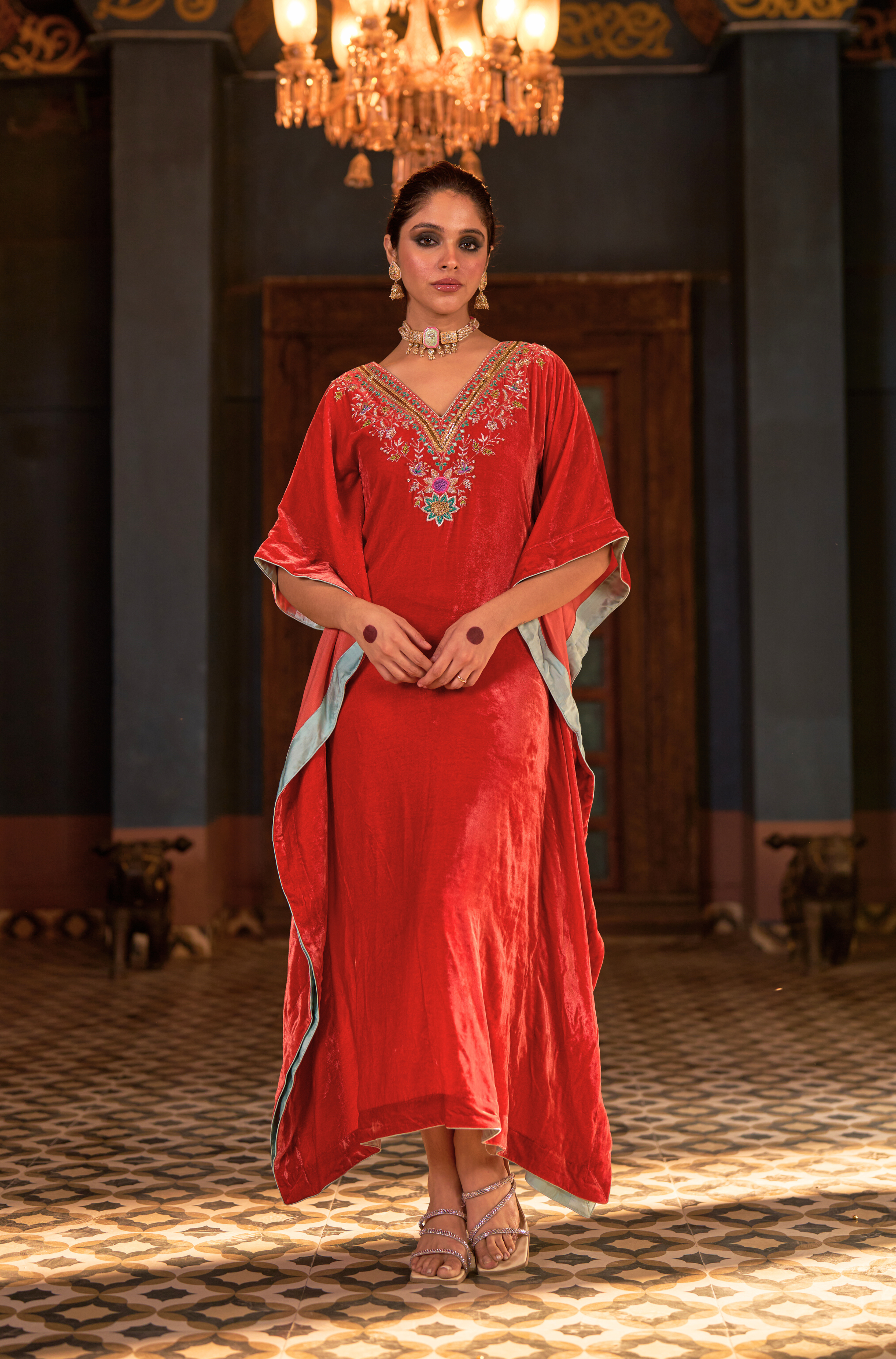 This color-blocked kaftan is adorned with intricate hand-embroidered zardozi, silk thread, and gota work, beautifully highlighting the neckline with an eye-catching floral pattern.