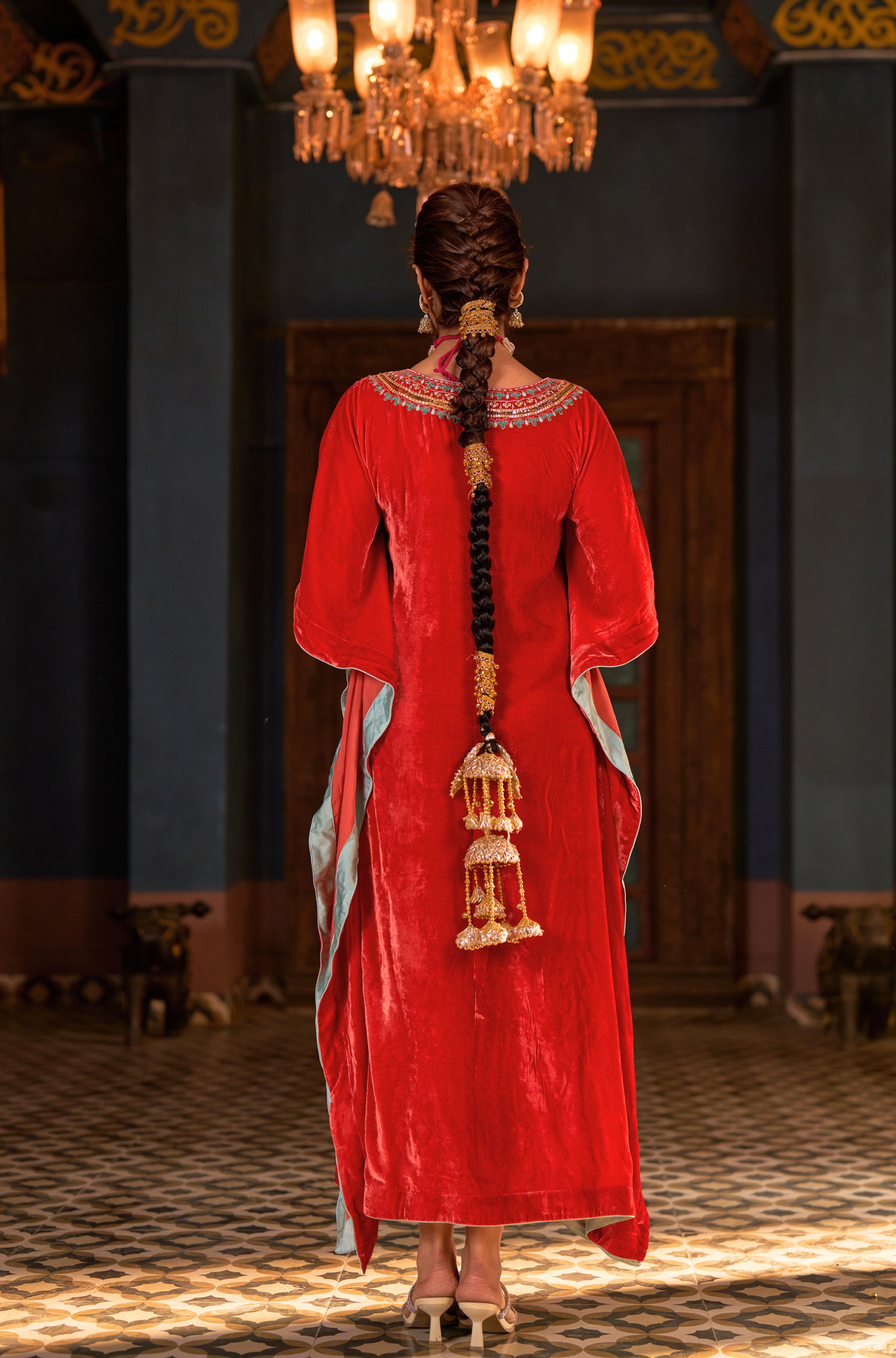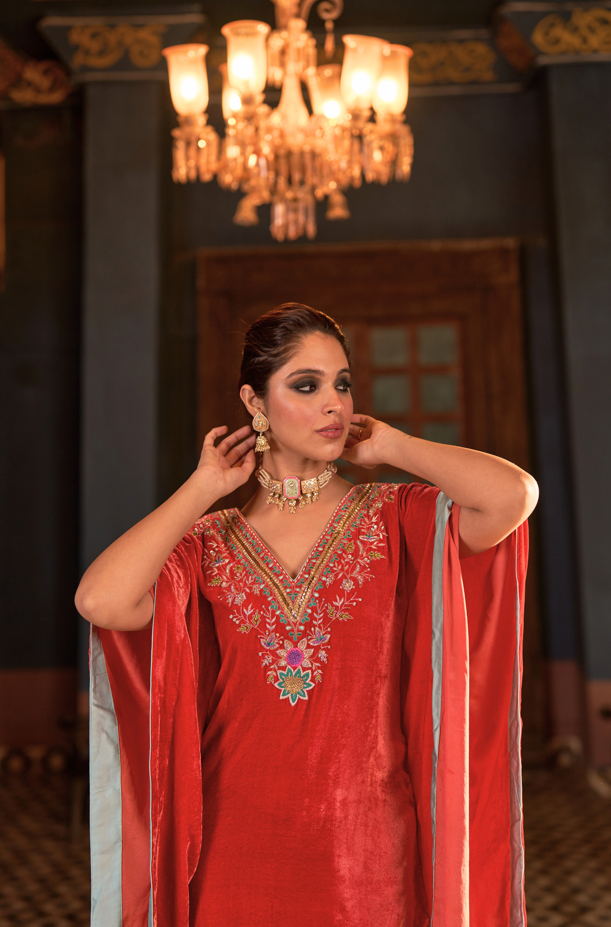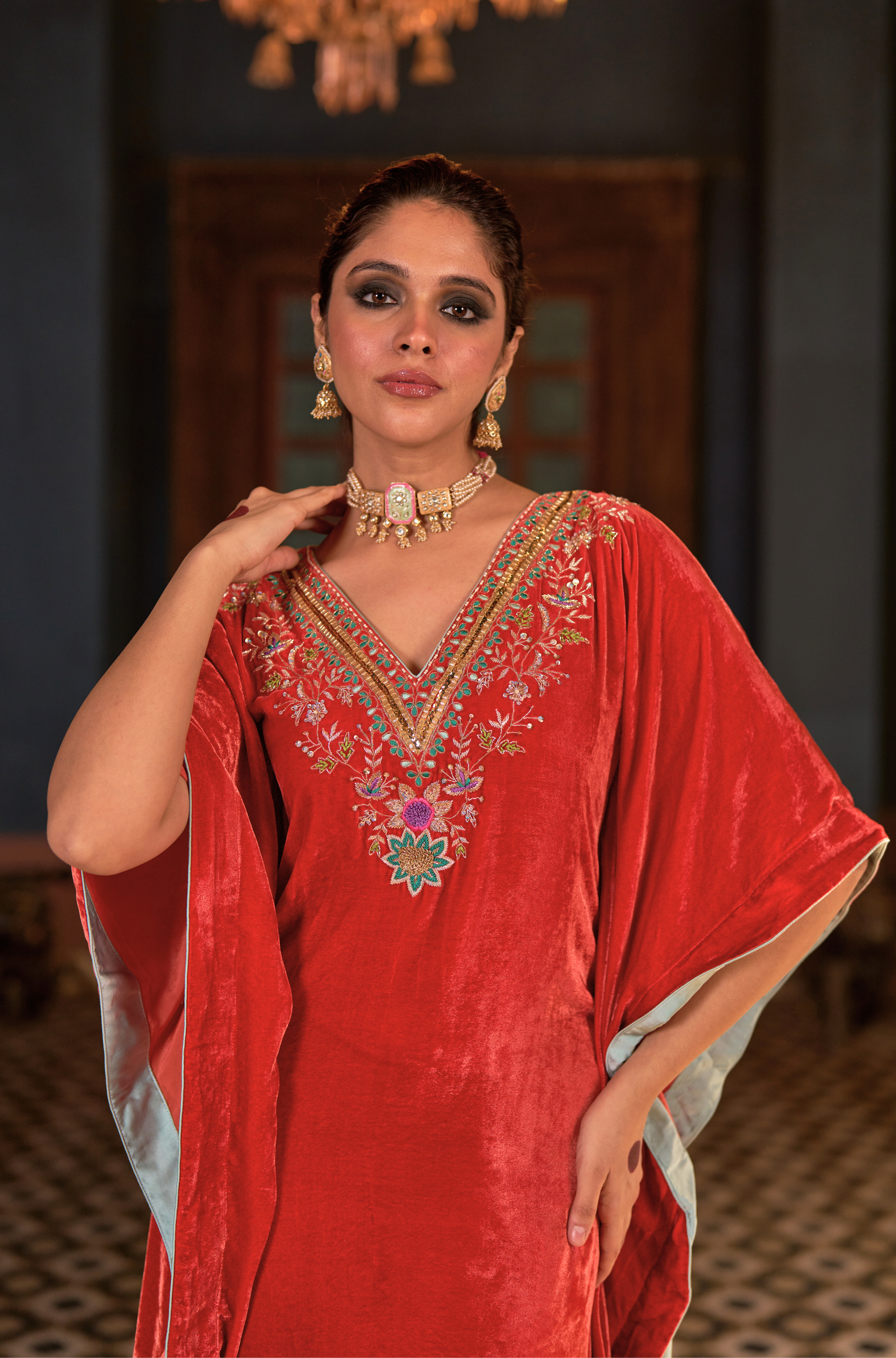 This color-blocked kaftan is adorned with intricate hand-embroidered zardozi, silk thread, and gota work, beautifully highlighting the neckline with an eye-catching floral pattern.