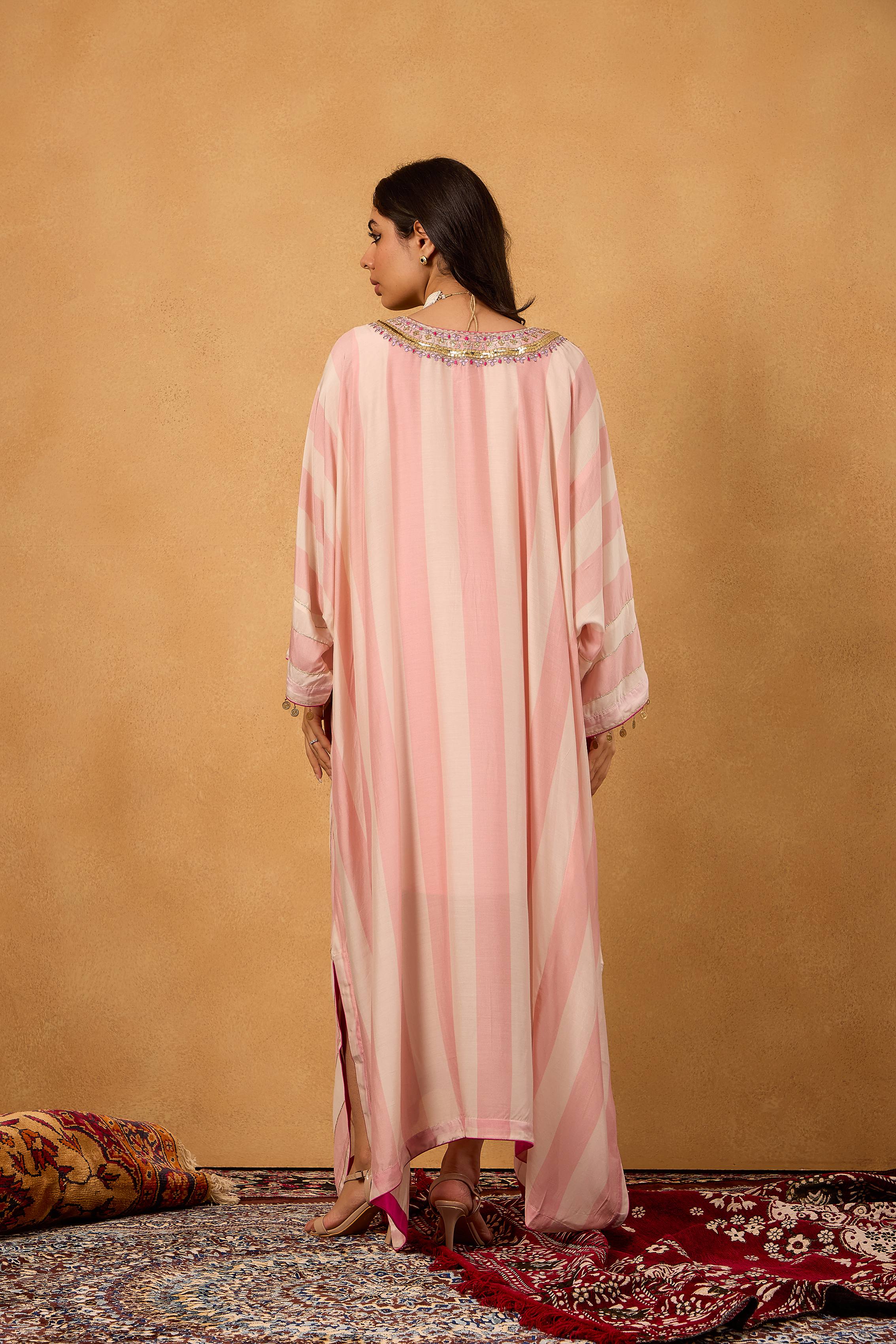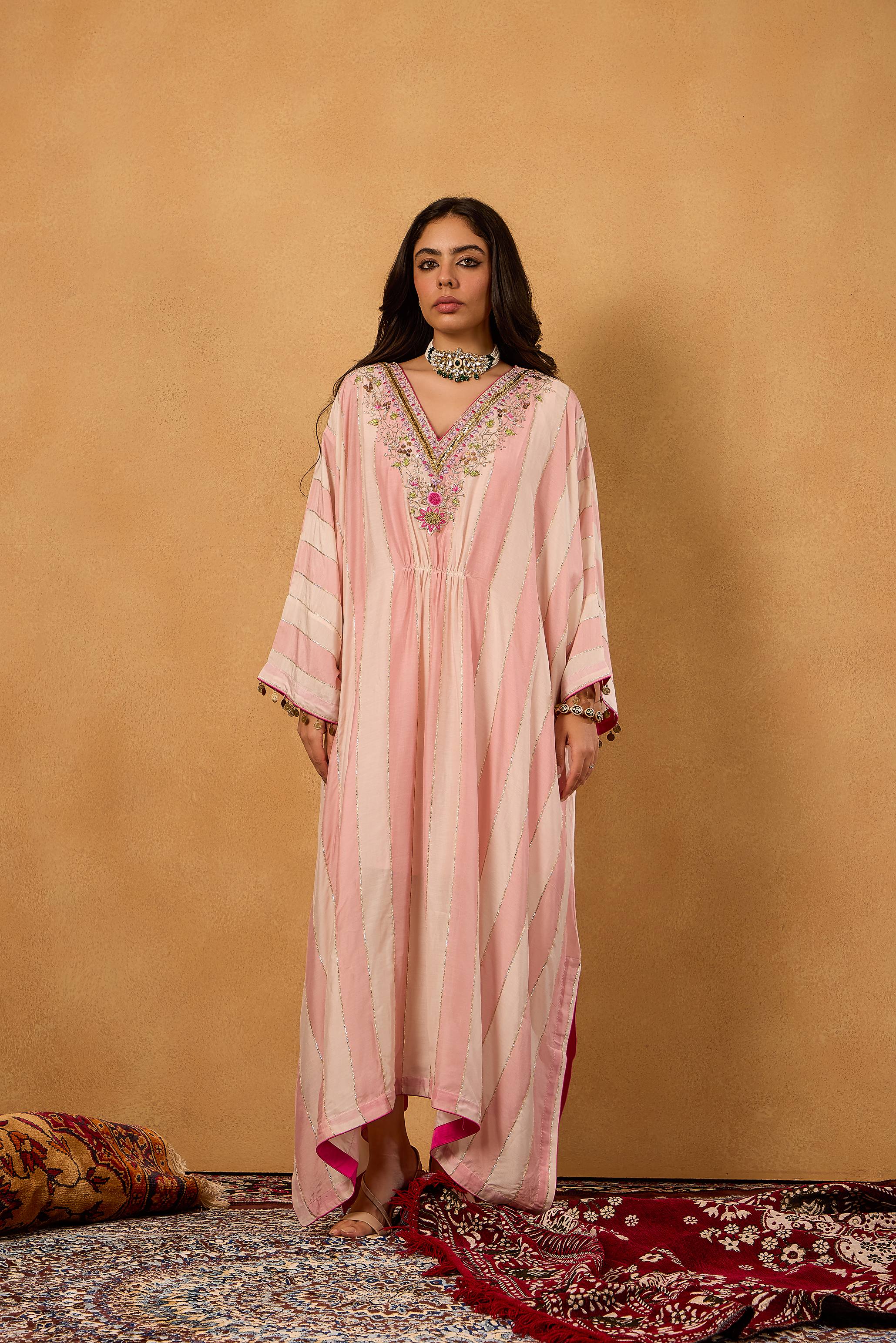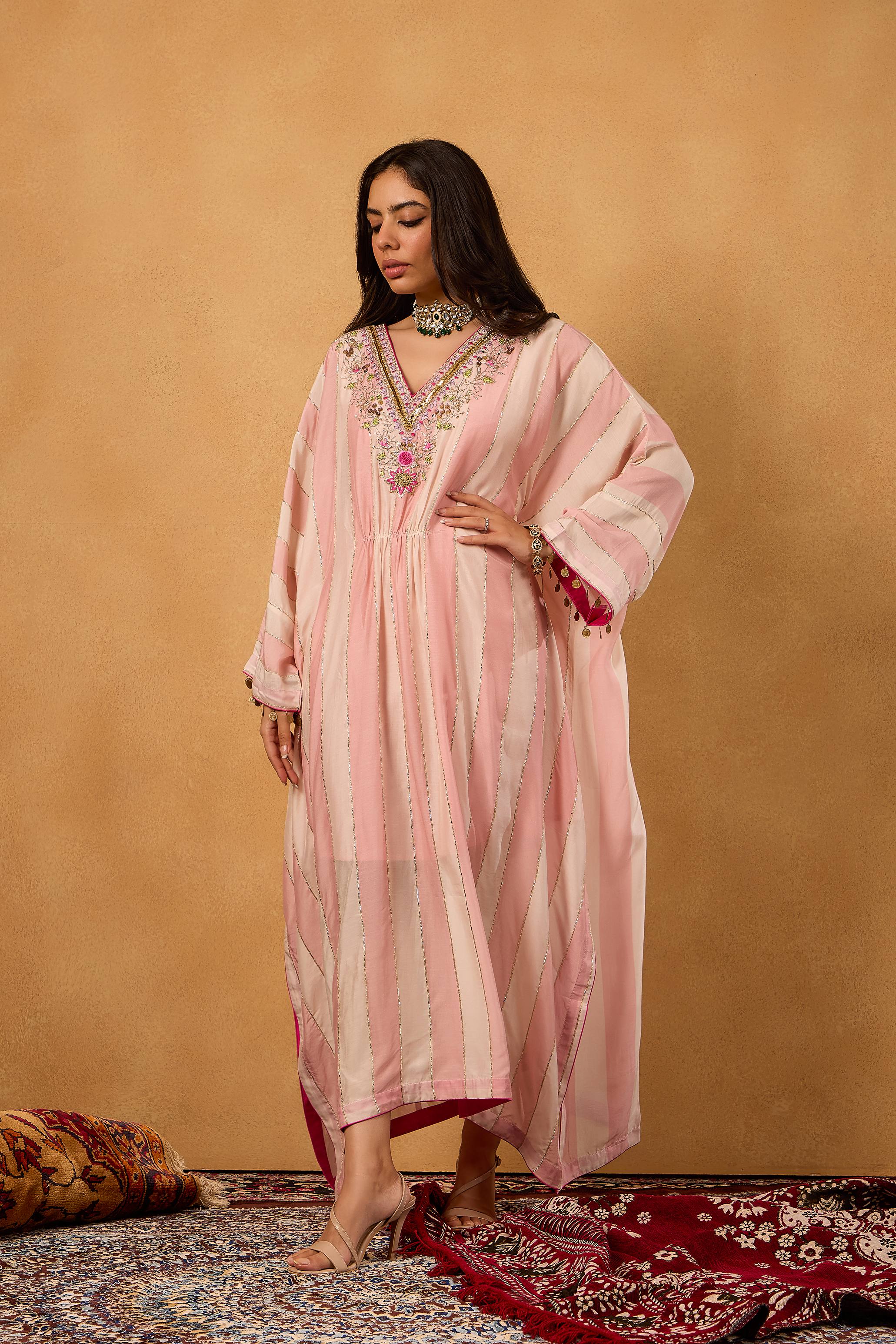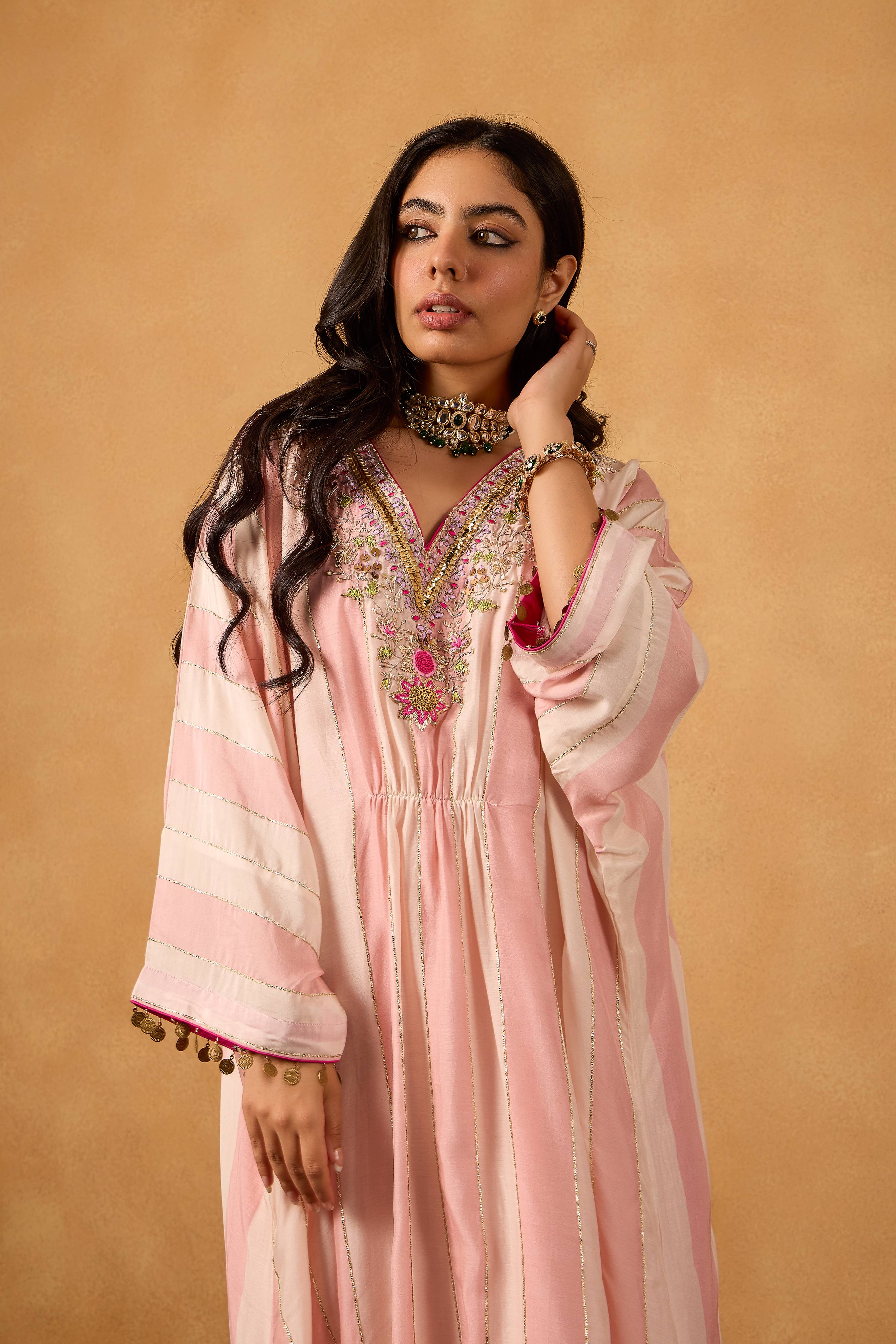 Soft and ethereal, the Dastan Kaftan from our Firdos Collection is crafted on a soothing peach striped The front neckline and cuffs is delicately hand-embroidered.
