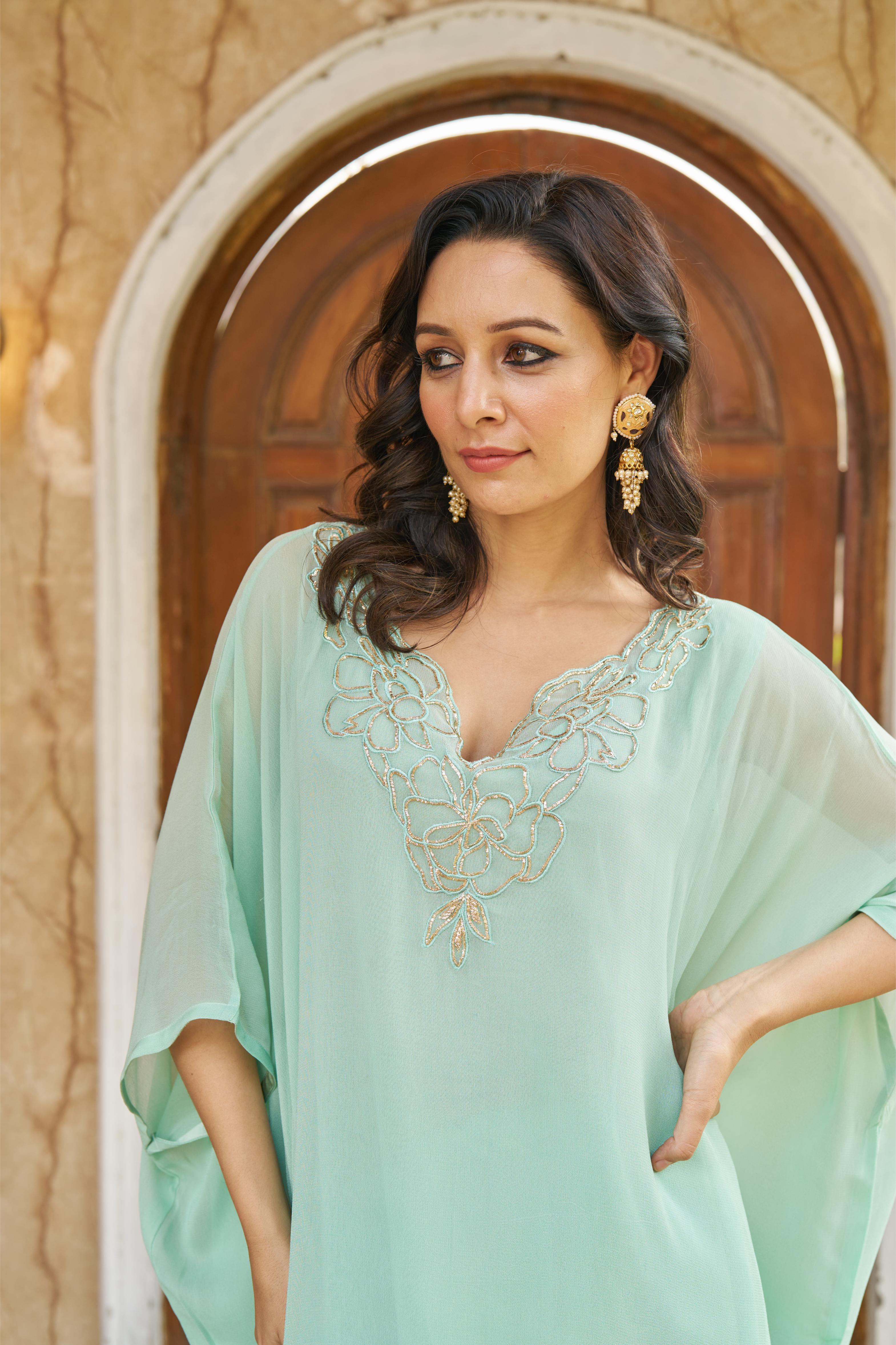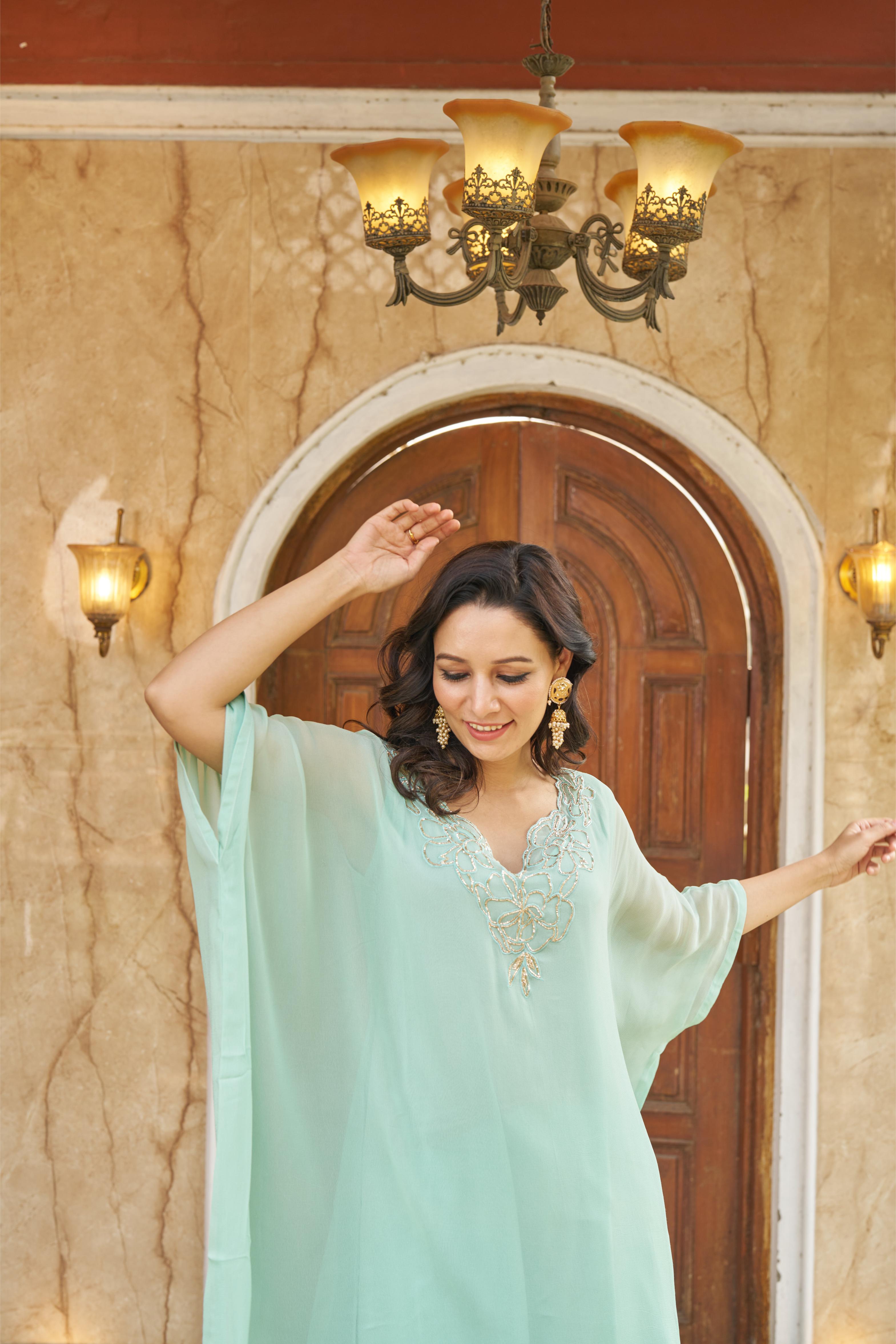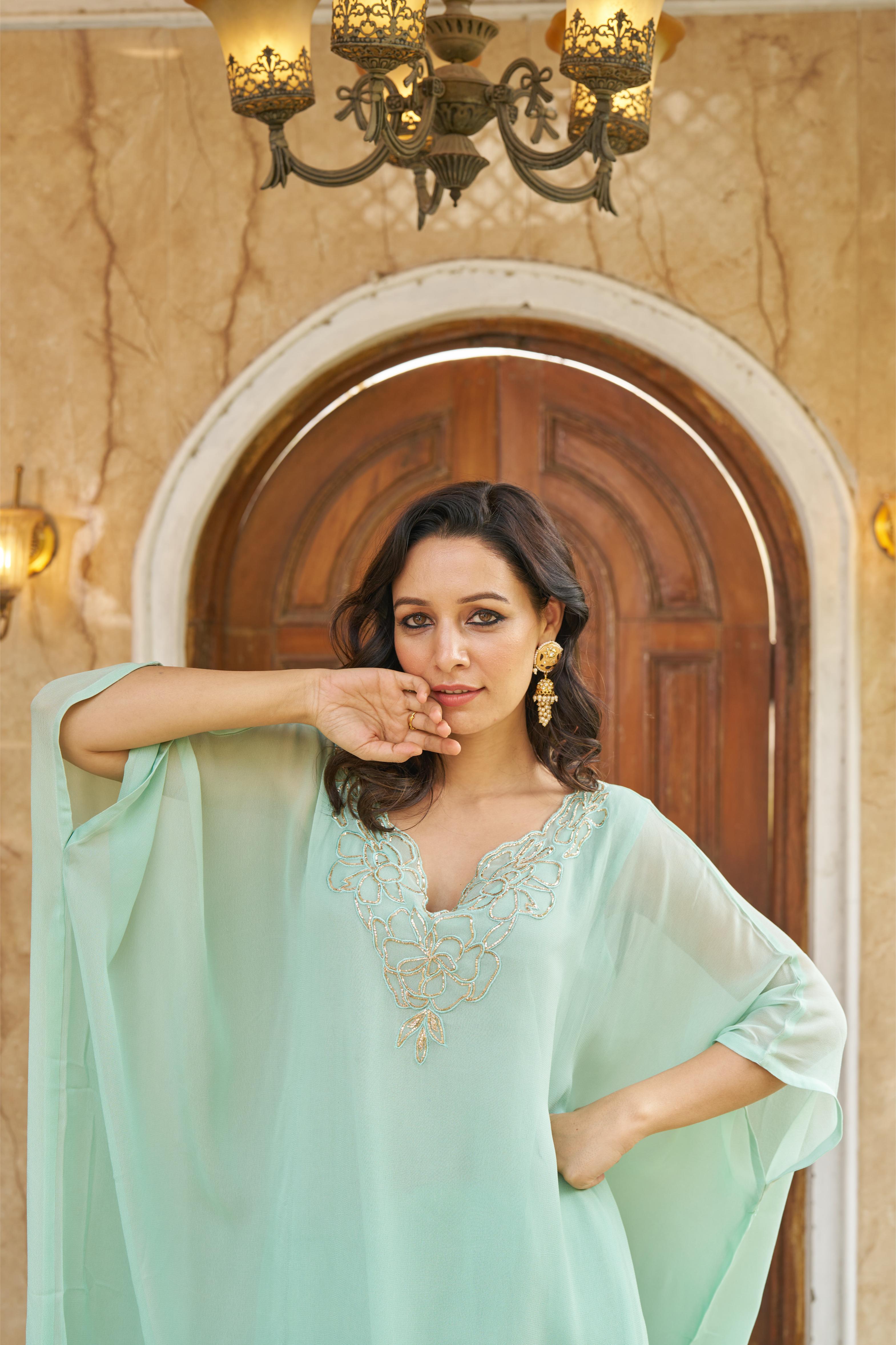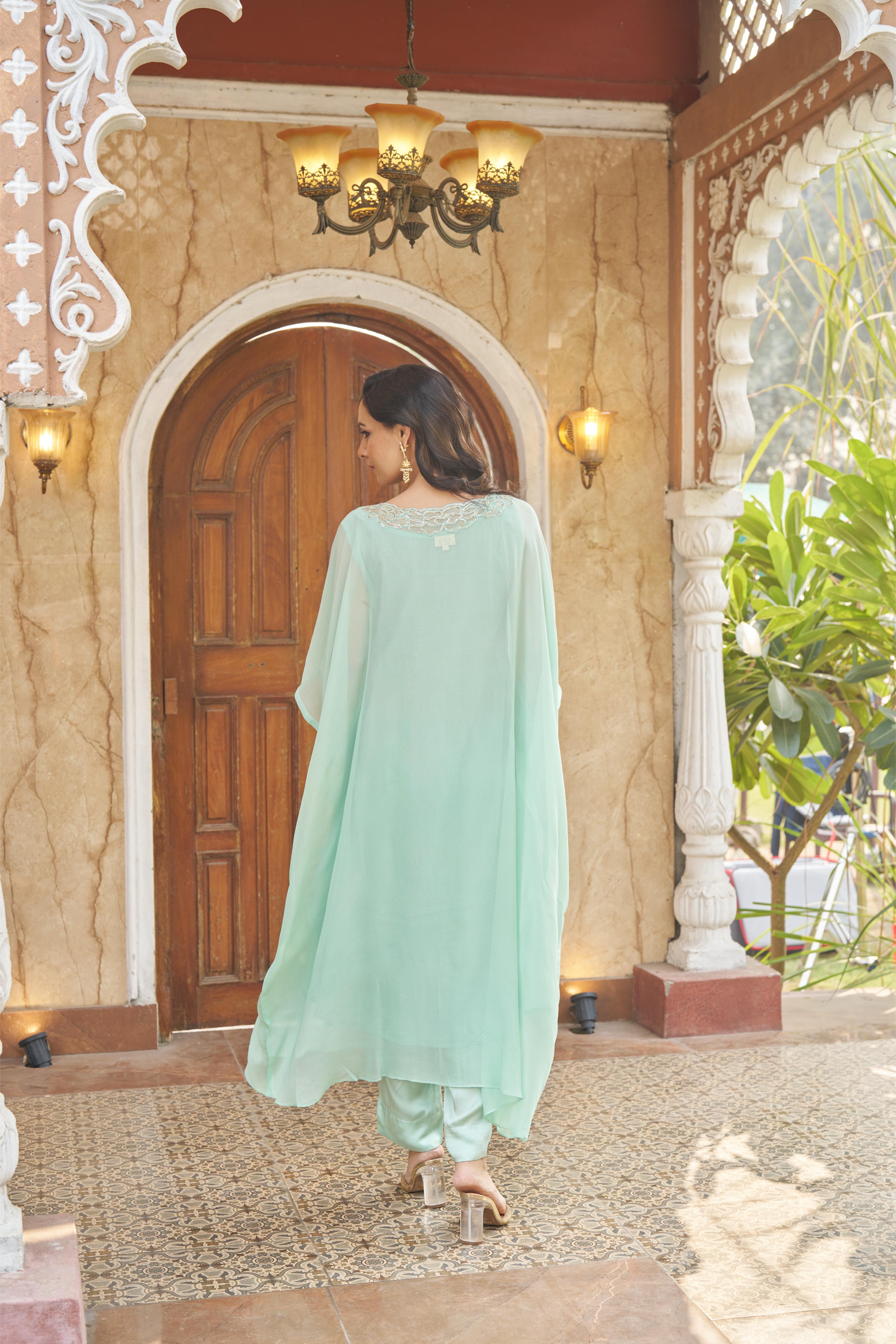 Aqua Kaftaan In Geogette With Zardozi Hand Embroidery Work On The Neckline, Paired With Modal Silk Pants.