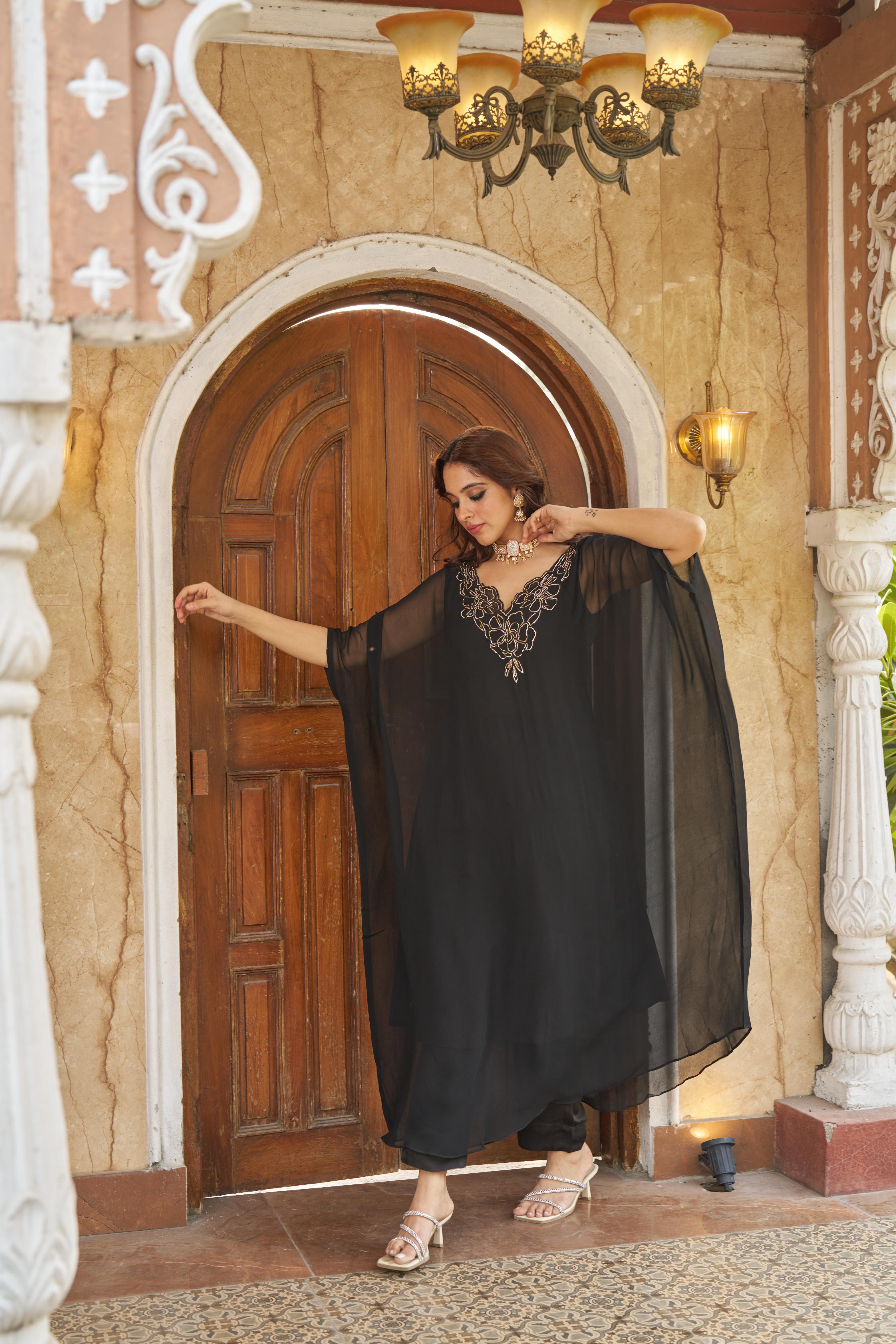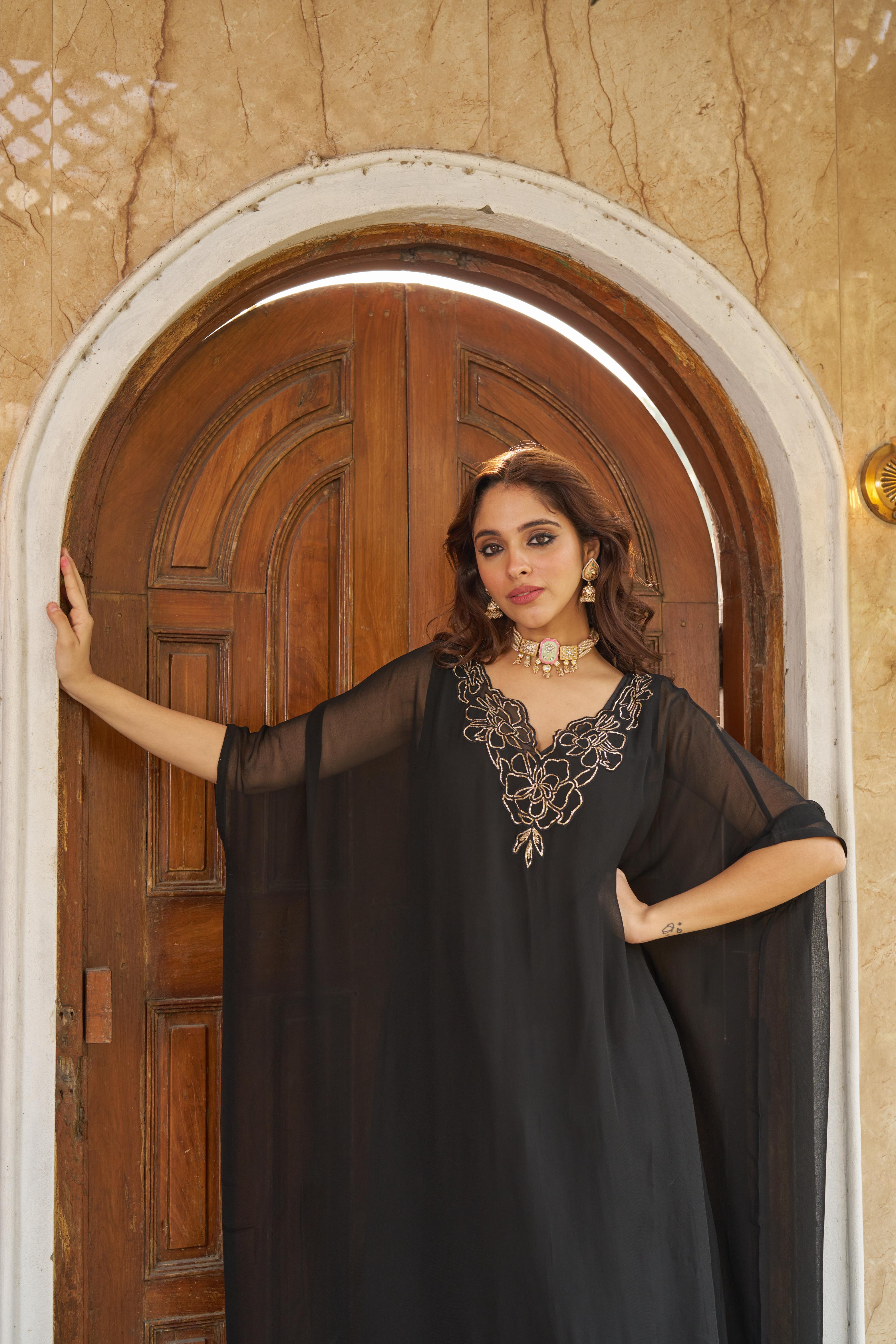 Black Kaftaan In Geogette With Zardozi Hand Embroidery Work On The Neckline, Paired With Modal Silk Pants.