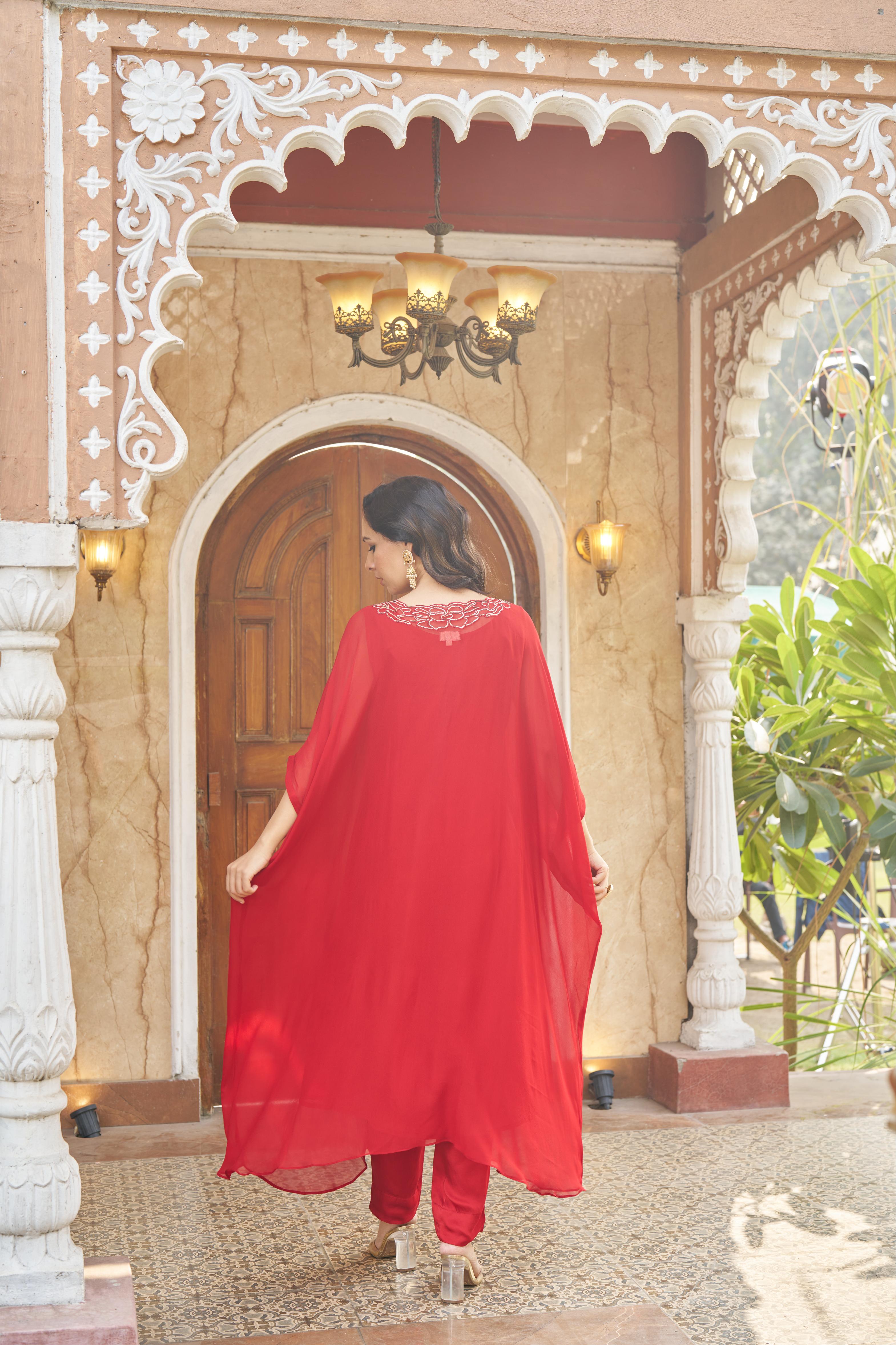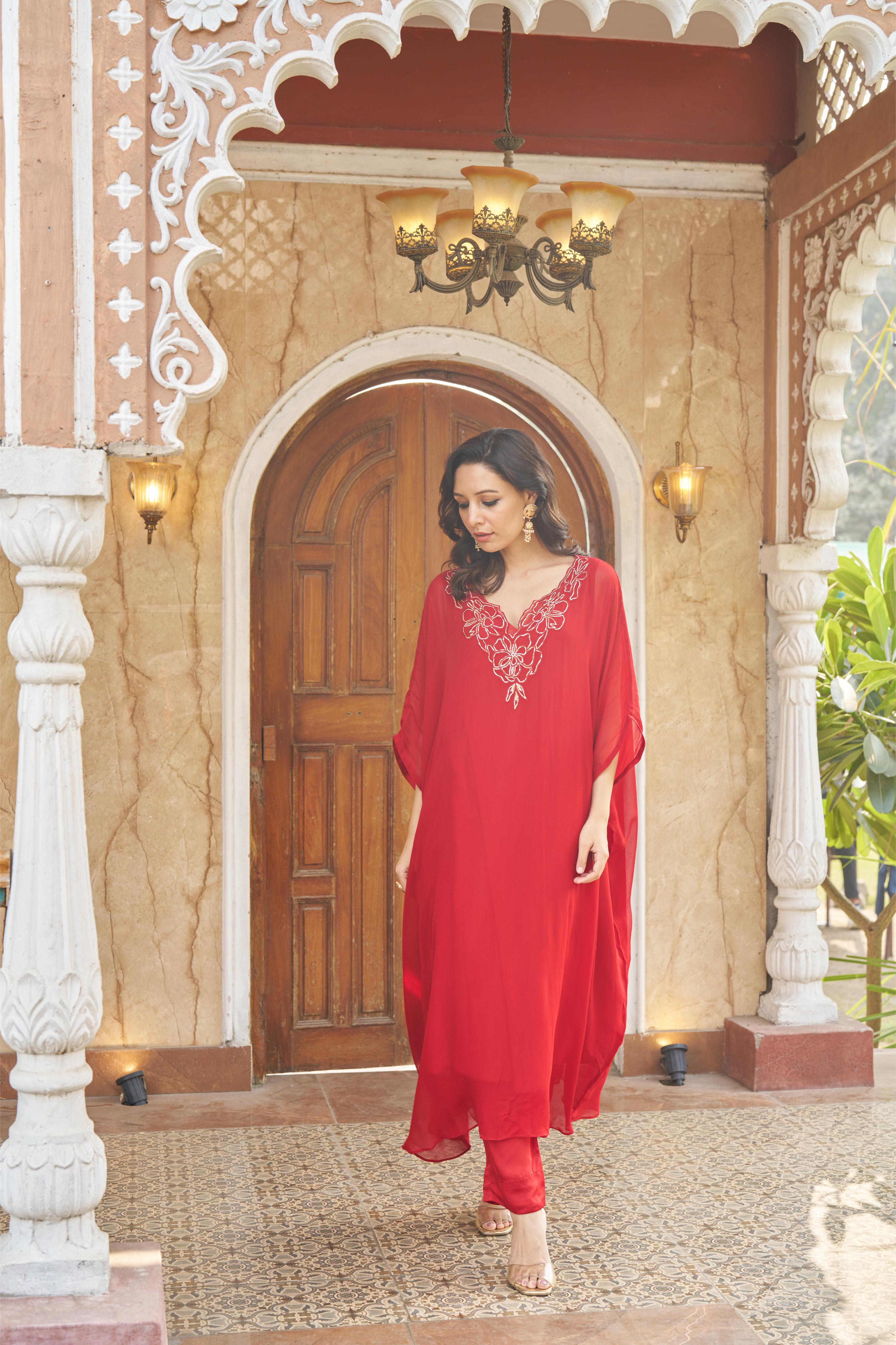 Red Kaftaan In Geogette With Zardozi Hand Embroidery Work On The Neckline, Paired With Modal Silk Pants.