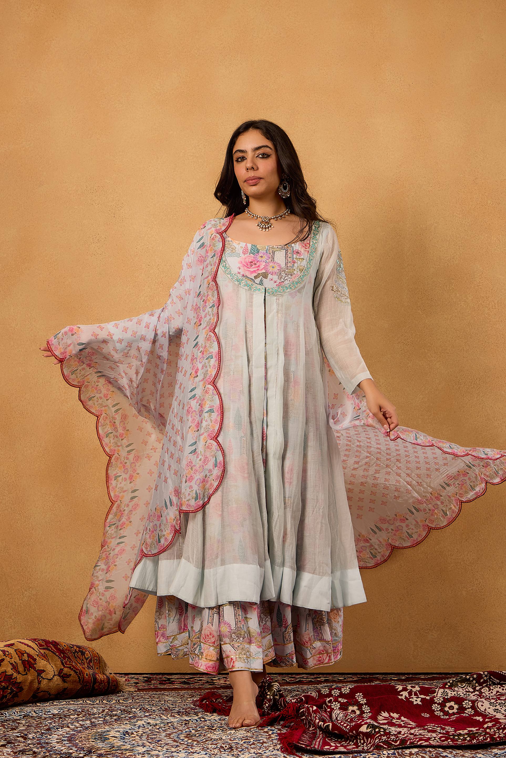 The set includes a printed long kurta in cotton silk, paired with a silk chanderi jacket and a silk dupatta, creating a seamless harmony of texture and elegance. Perfect for festive gatherings or sophisticated daytime occasions, the Dastan Kurta Set is a true ode to effortless grace and enduring style.