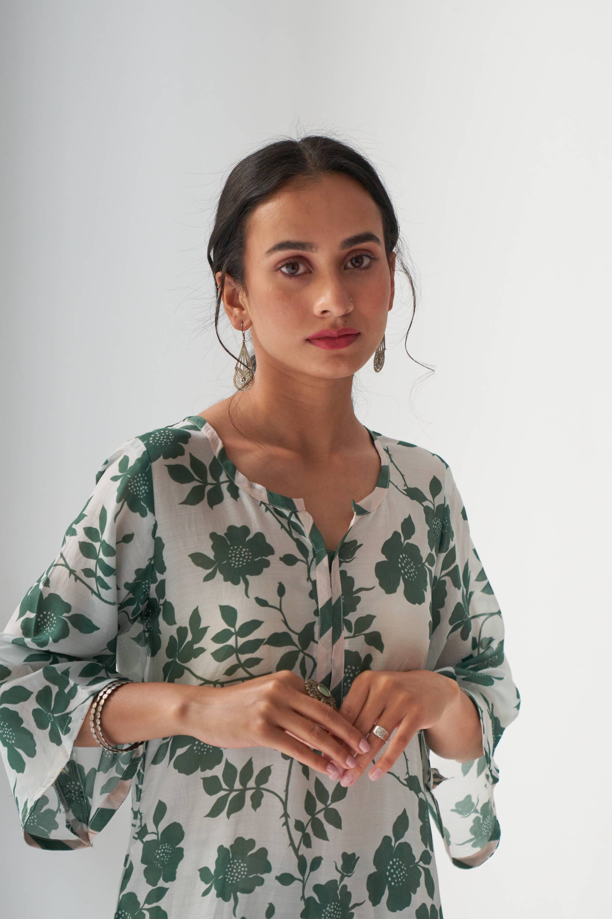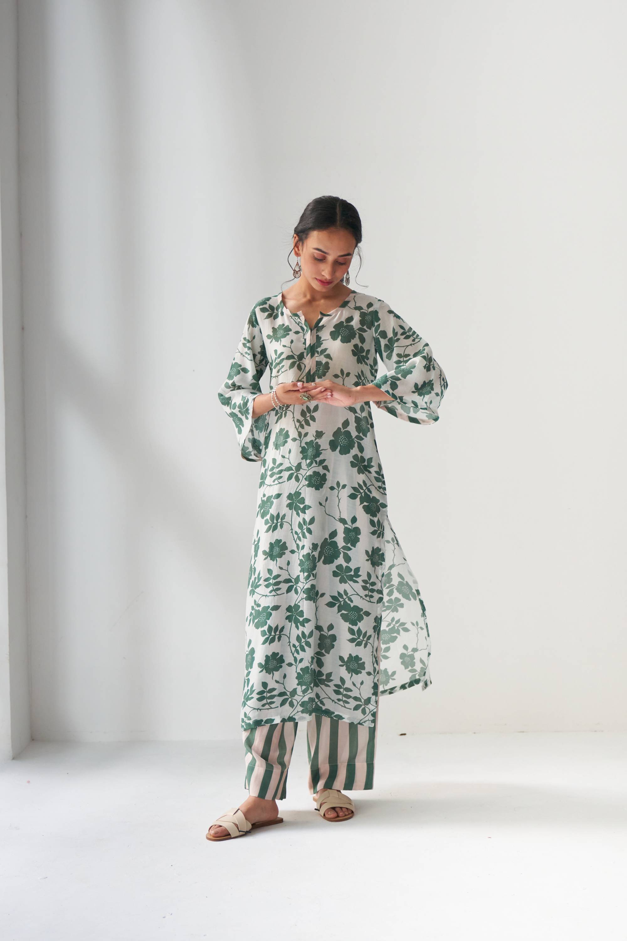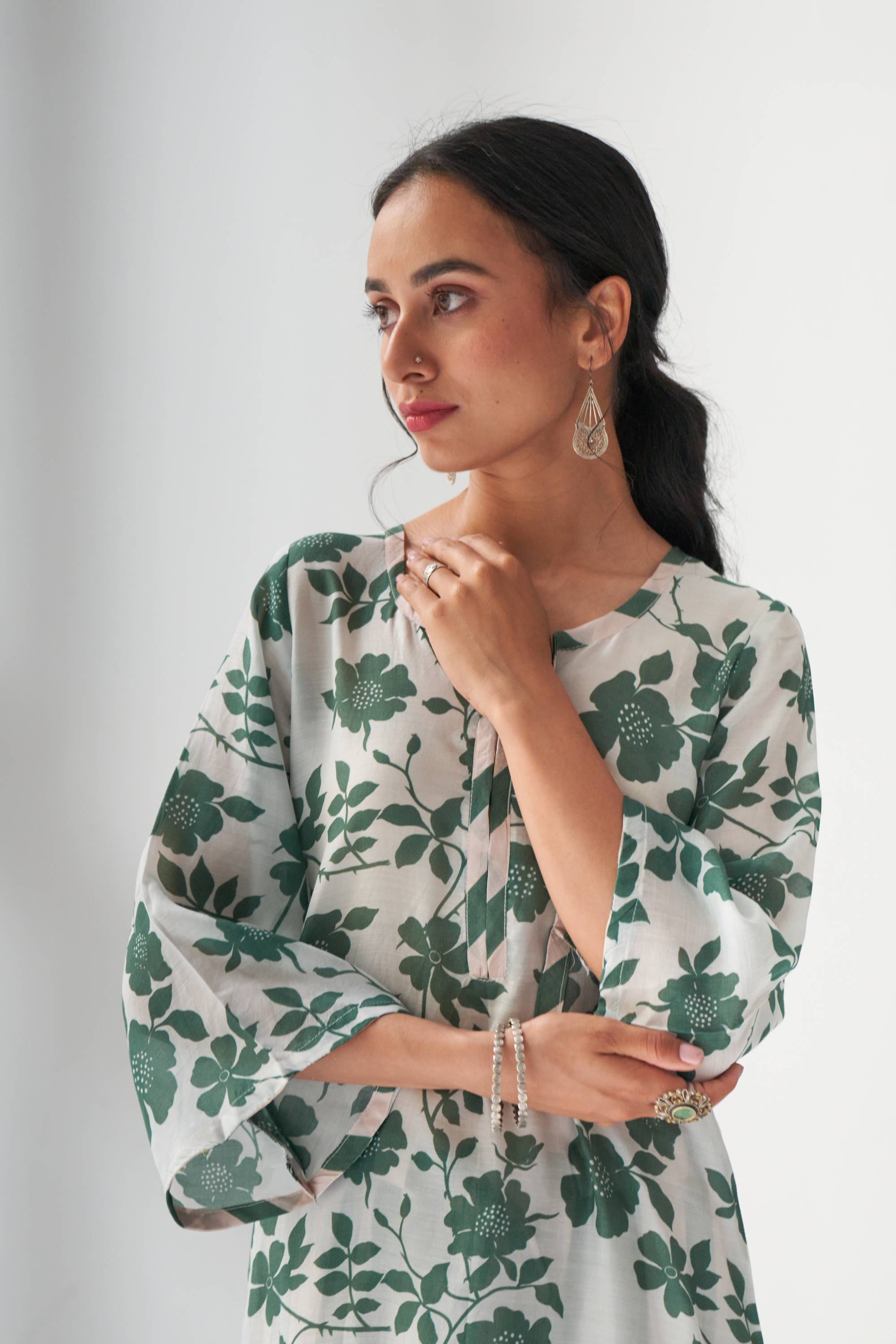 Faded rose kurta pant set in cotton silk fabric with beautiful floral digital print. The kurta with bell sleeves and pants with a wide bottom opening.