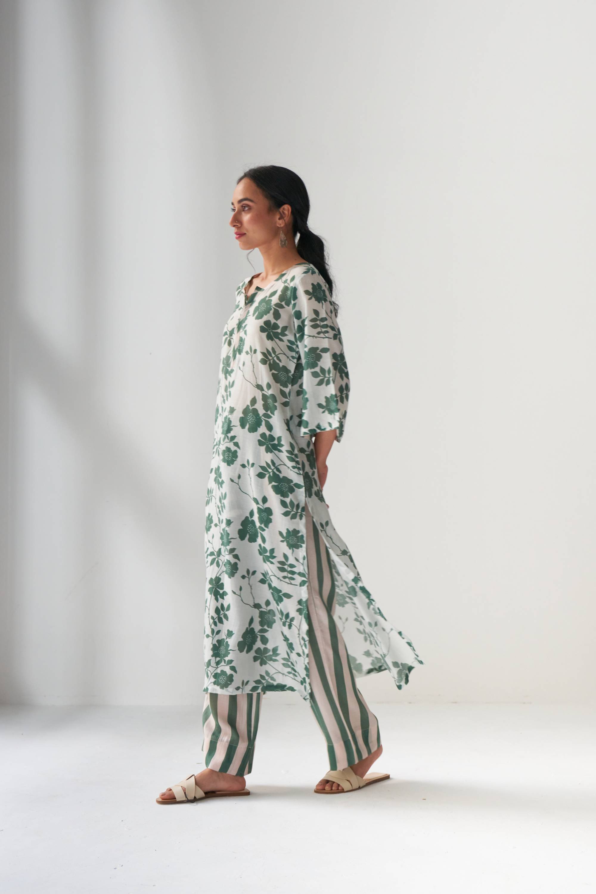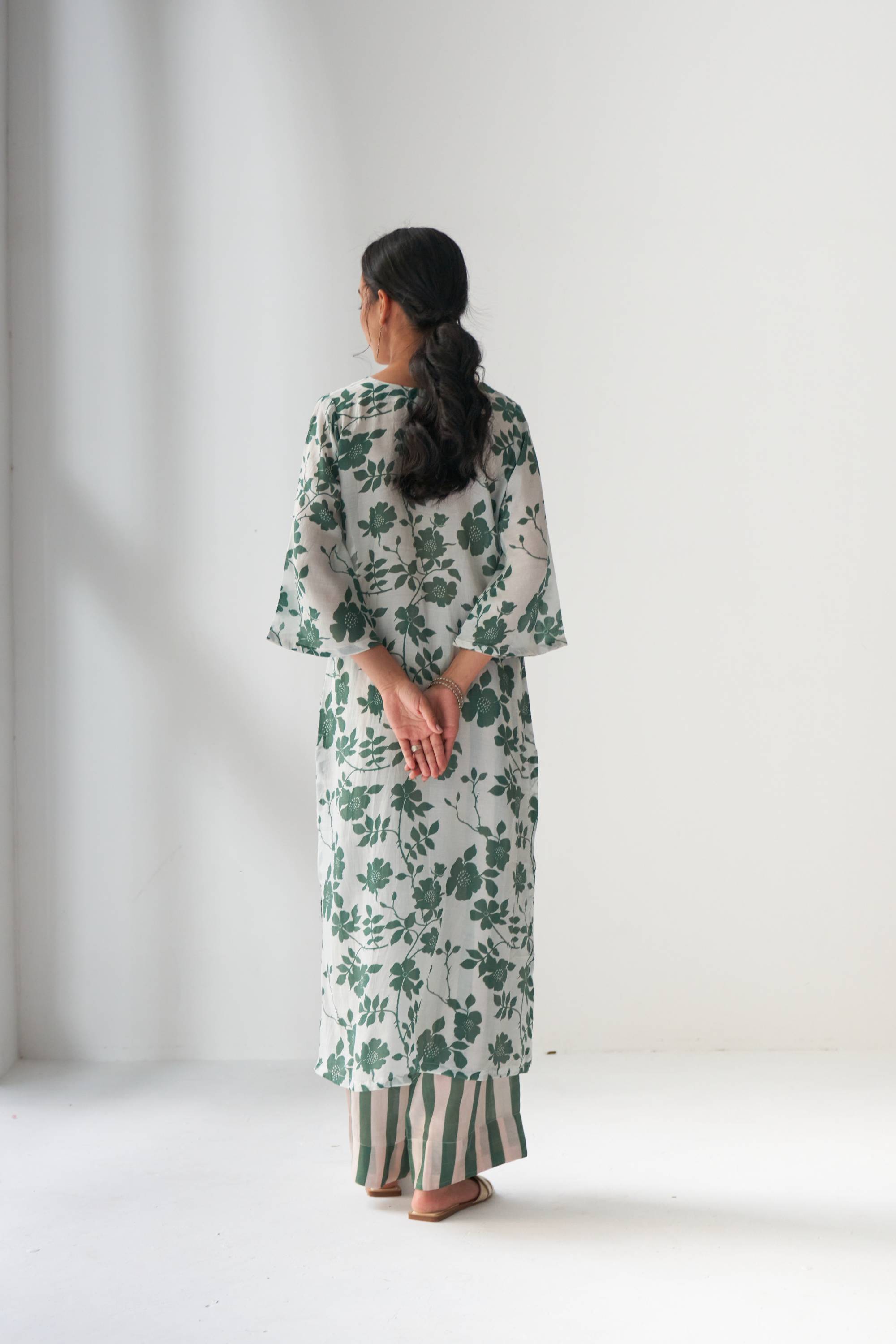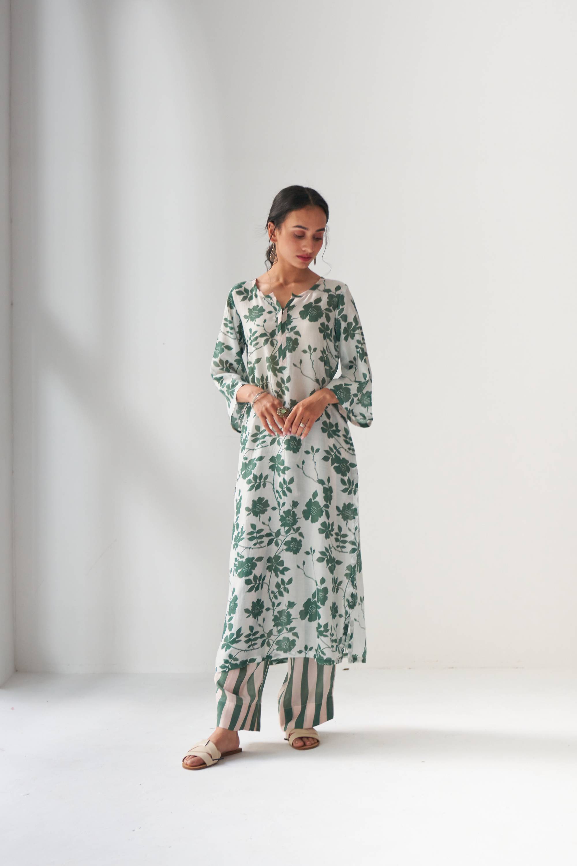 Faded rose kurta pant set in cotton silk fabric with beautiful floral digital print. The kurta with bell sleeves and pants with a wide bottom opening.