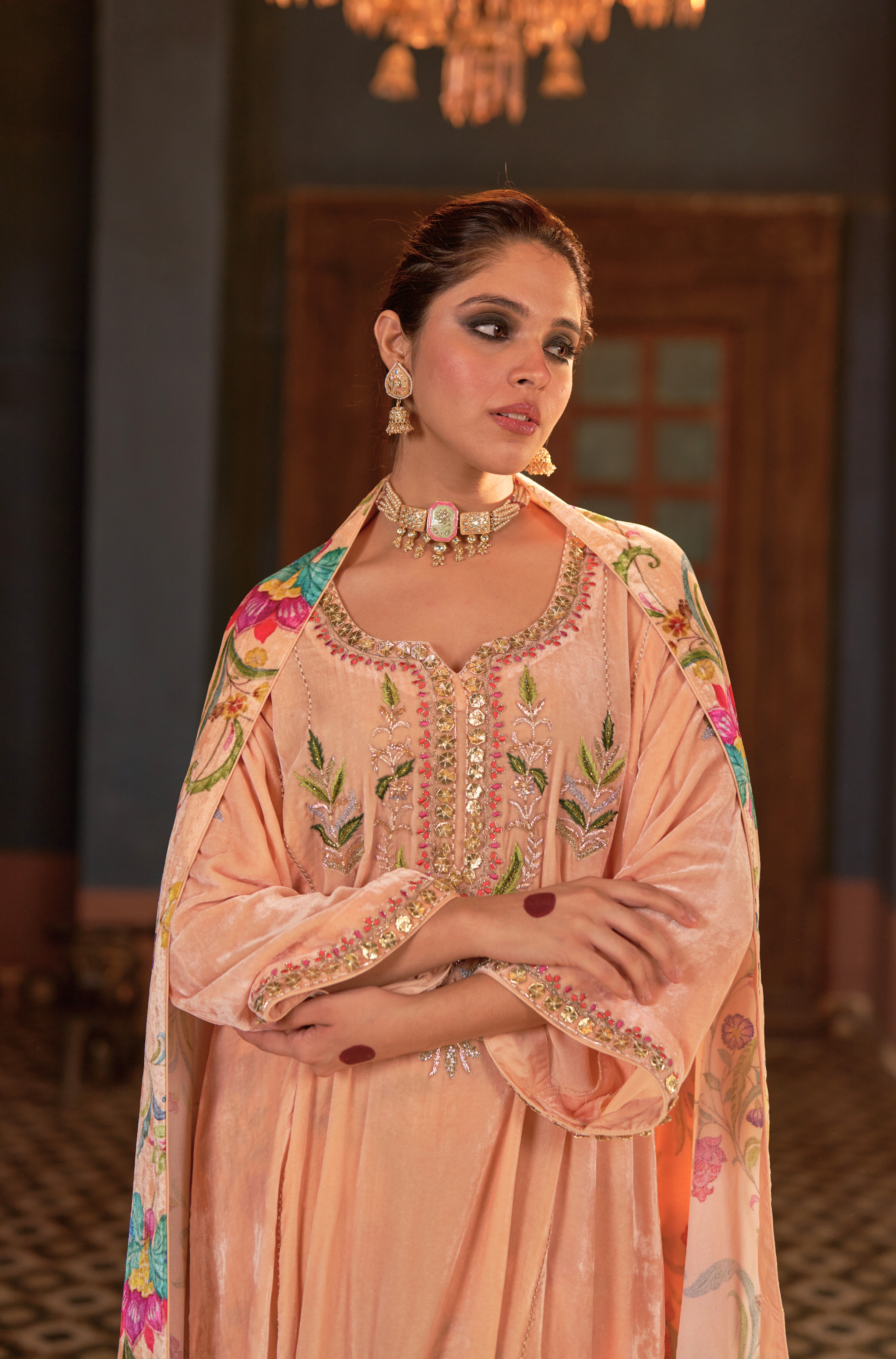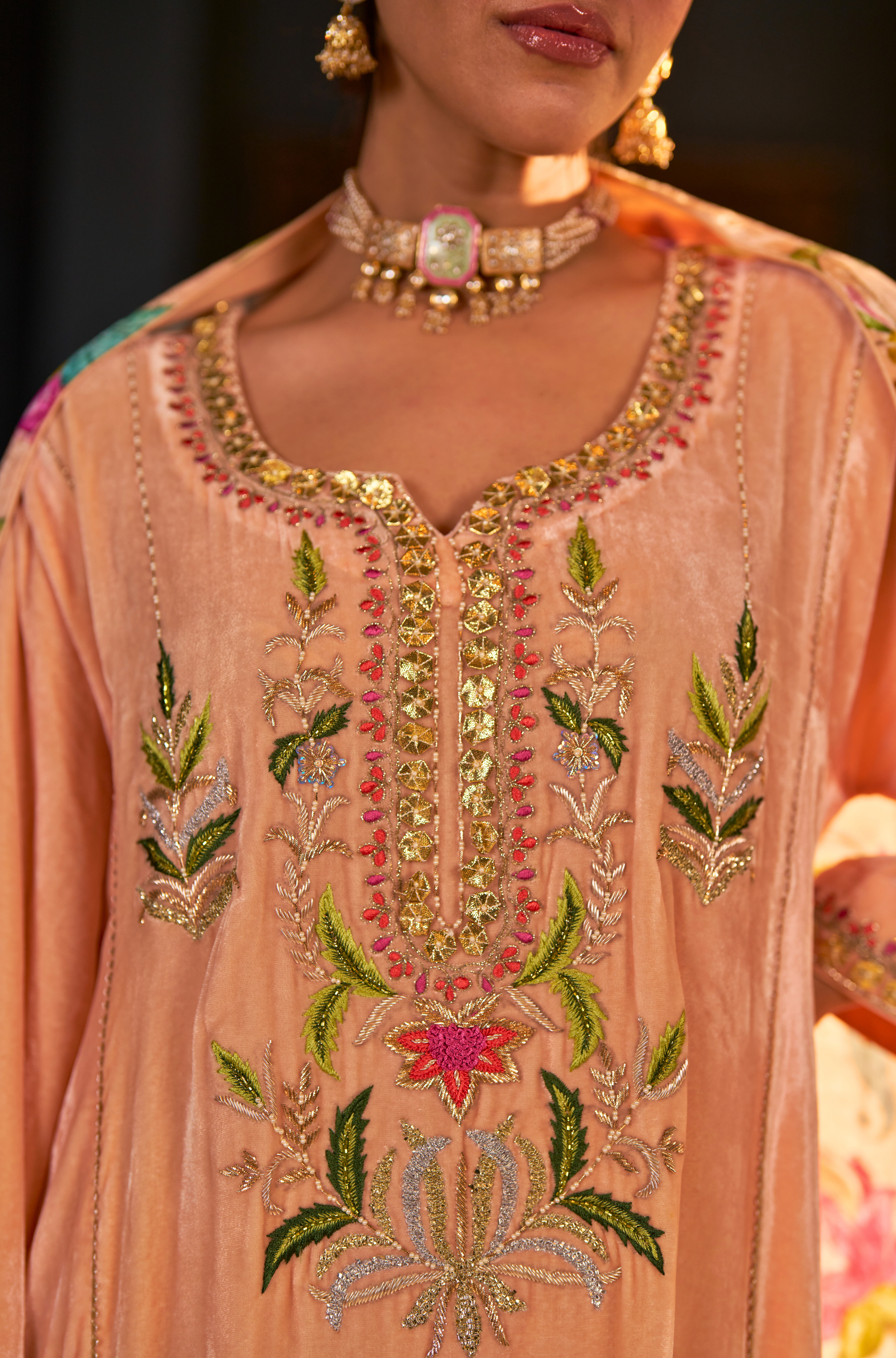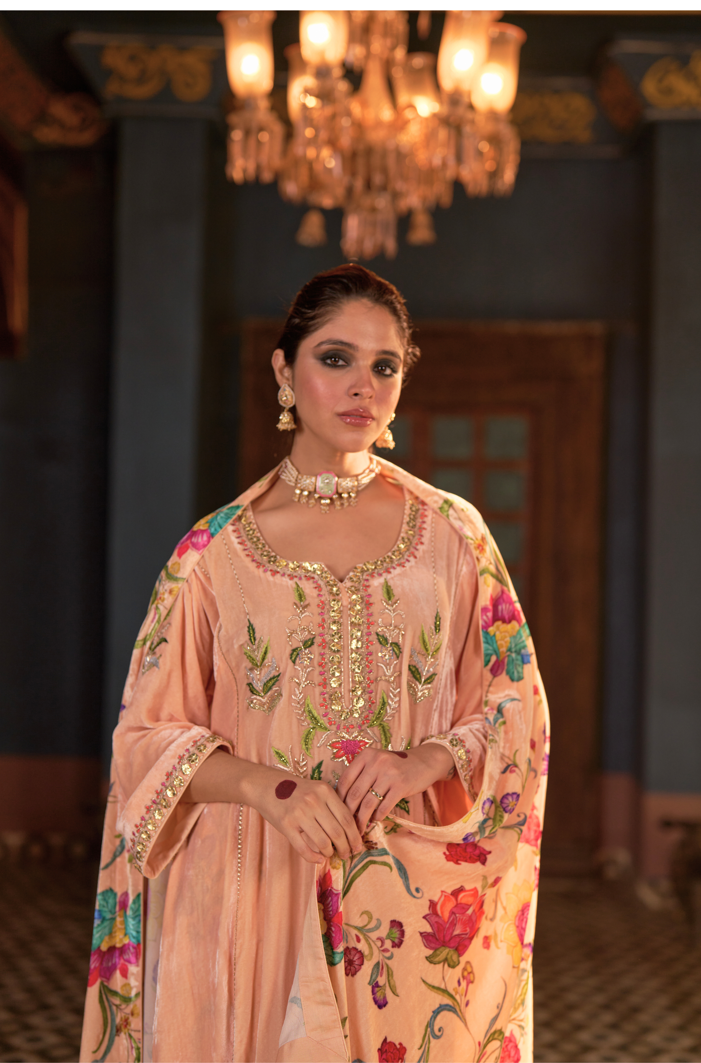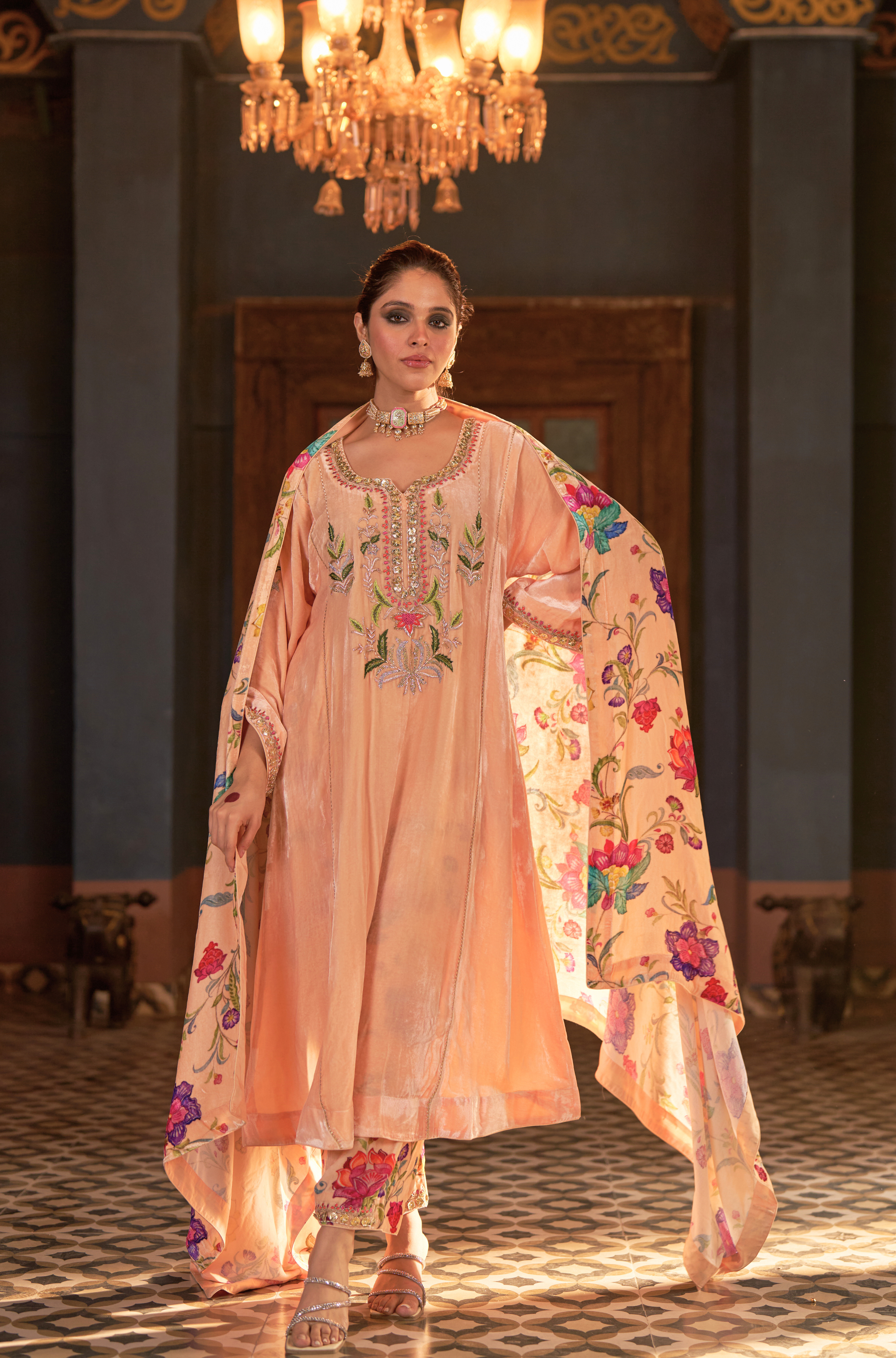 Naaz Kali Kurta Set, features silk velvet kali kurta with digital printed pants and odhini. adorned with zardozi, intricate silk thread work & gota reflecting timeless artistry of Indian craftsmanship.