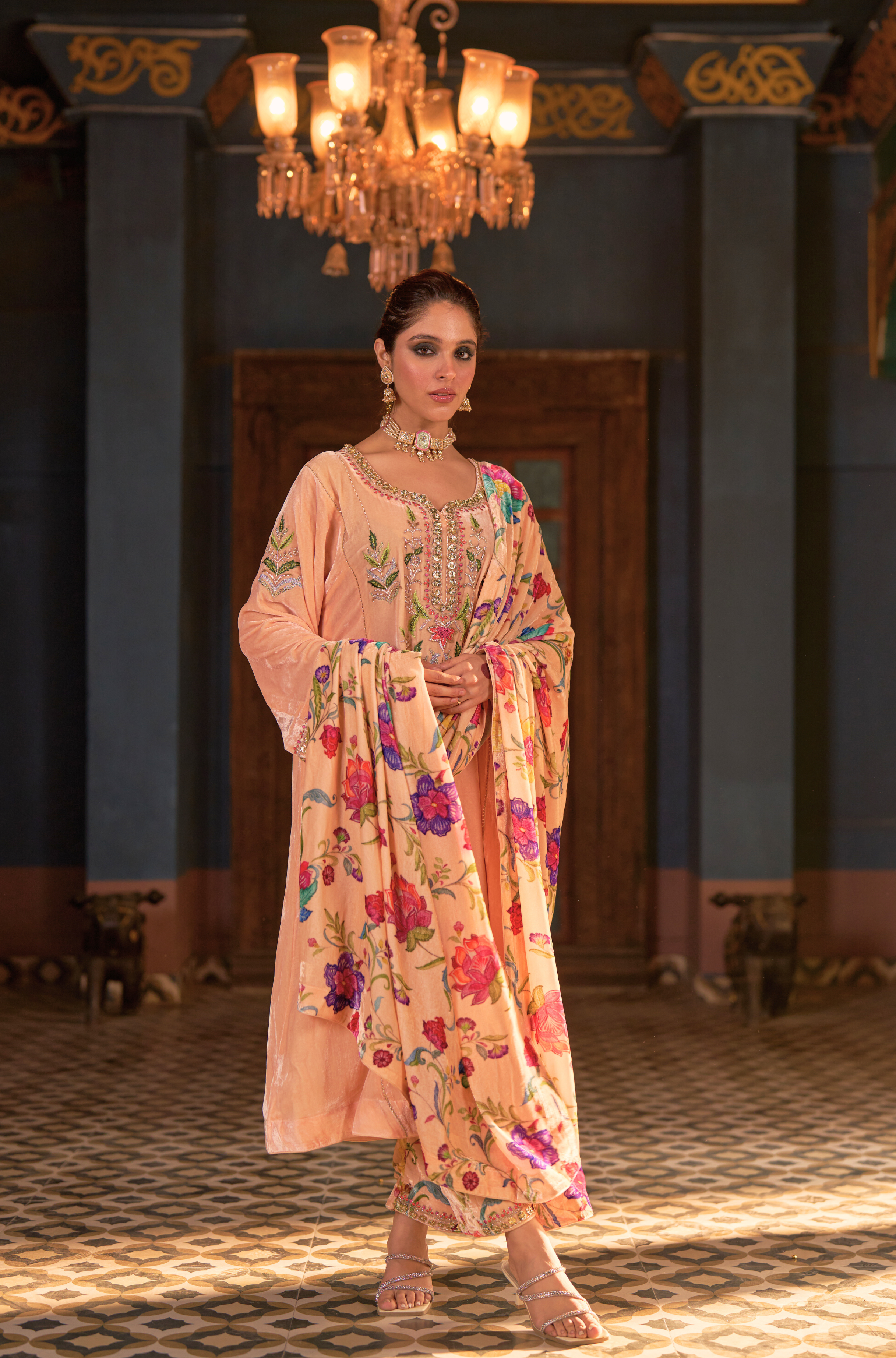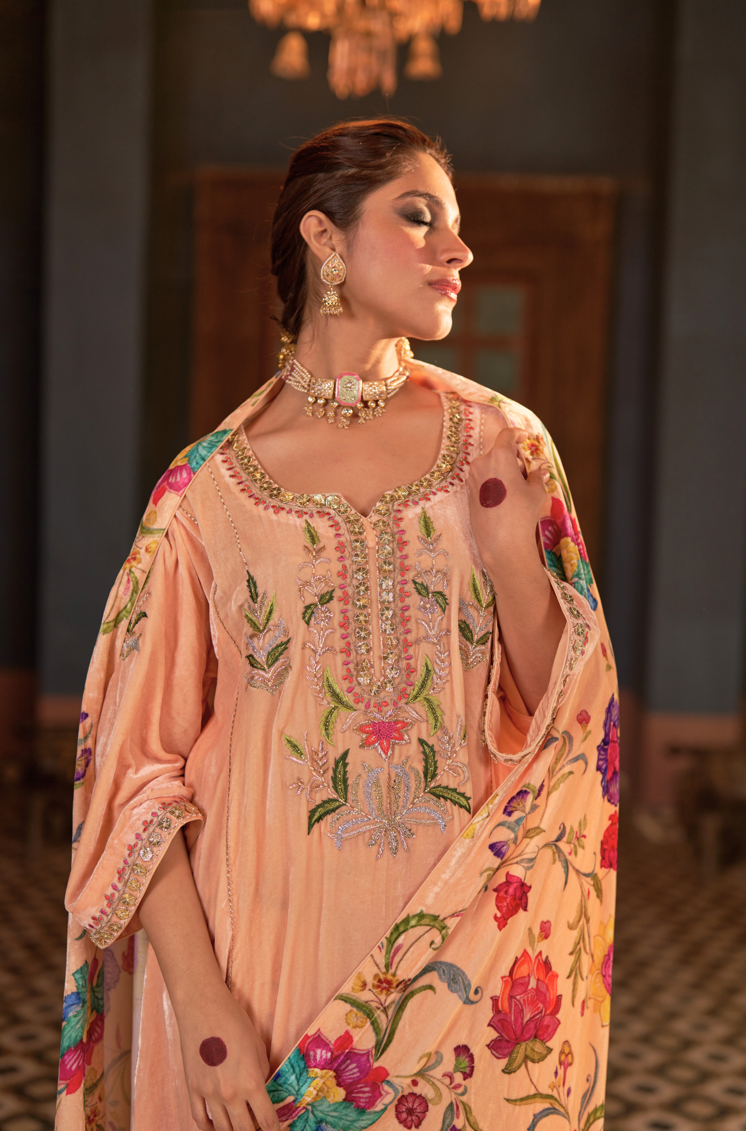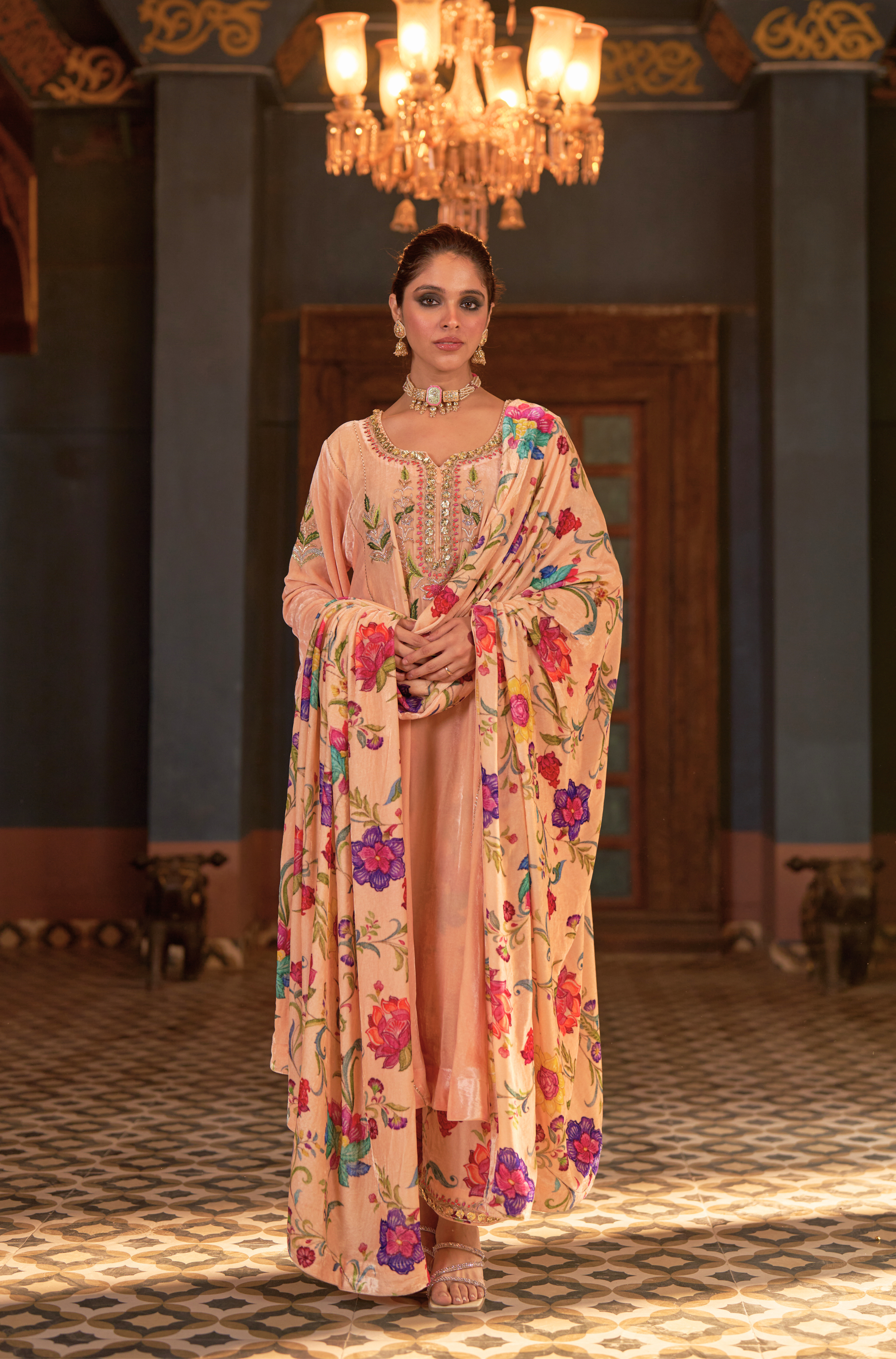 Naaz Kali Kurta Set, features silk velvet kali kurta with digital printed pants and odhini. adorned with zardozi, intricate silk thread work & gota reflecting timeless artistry of Indian craftsmanship.