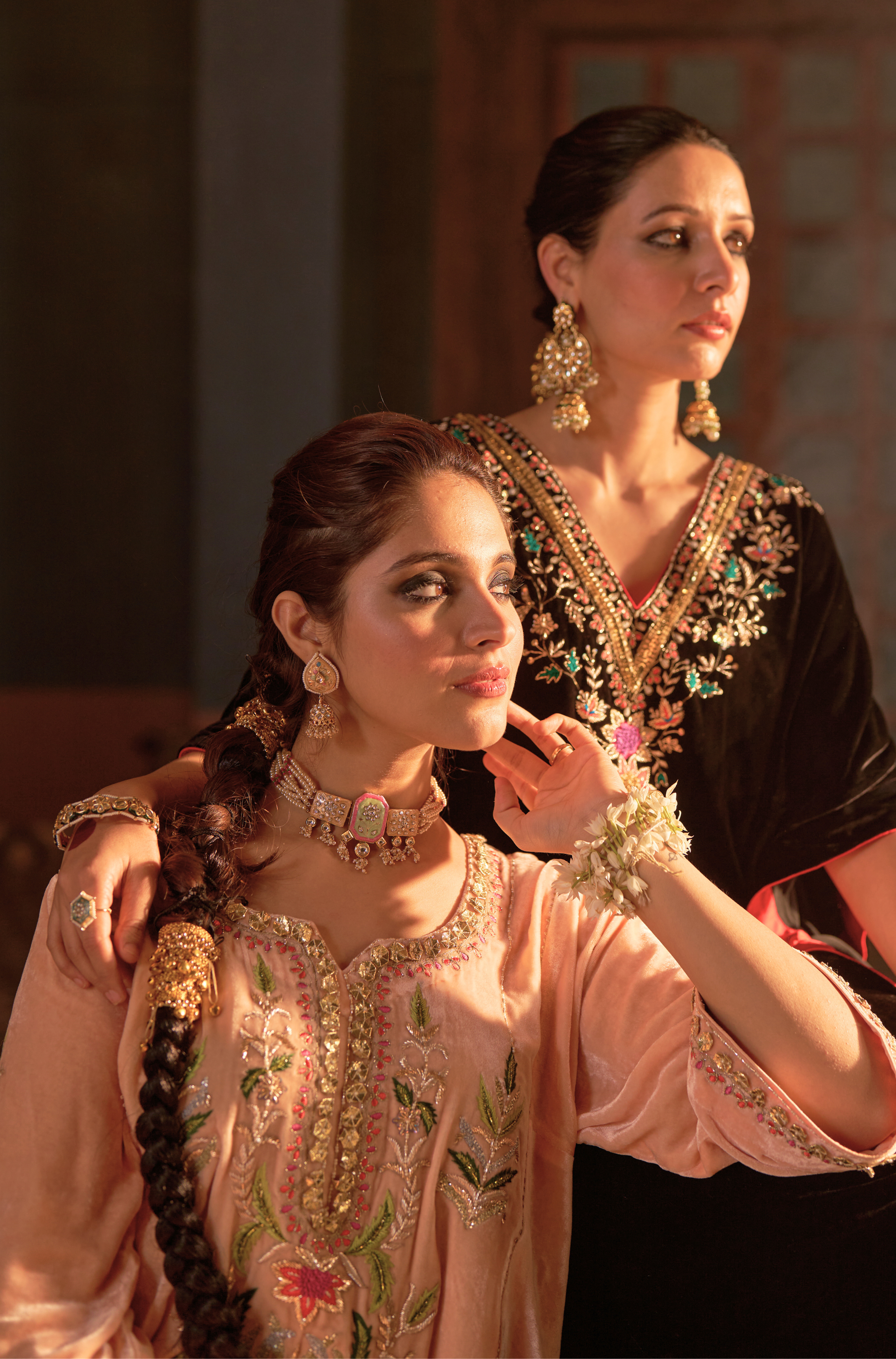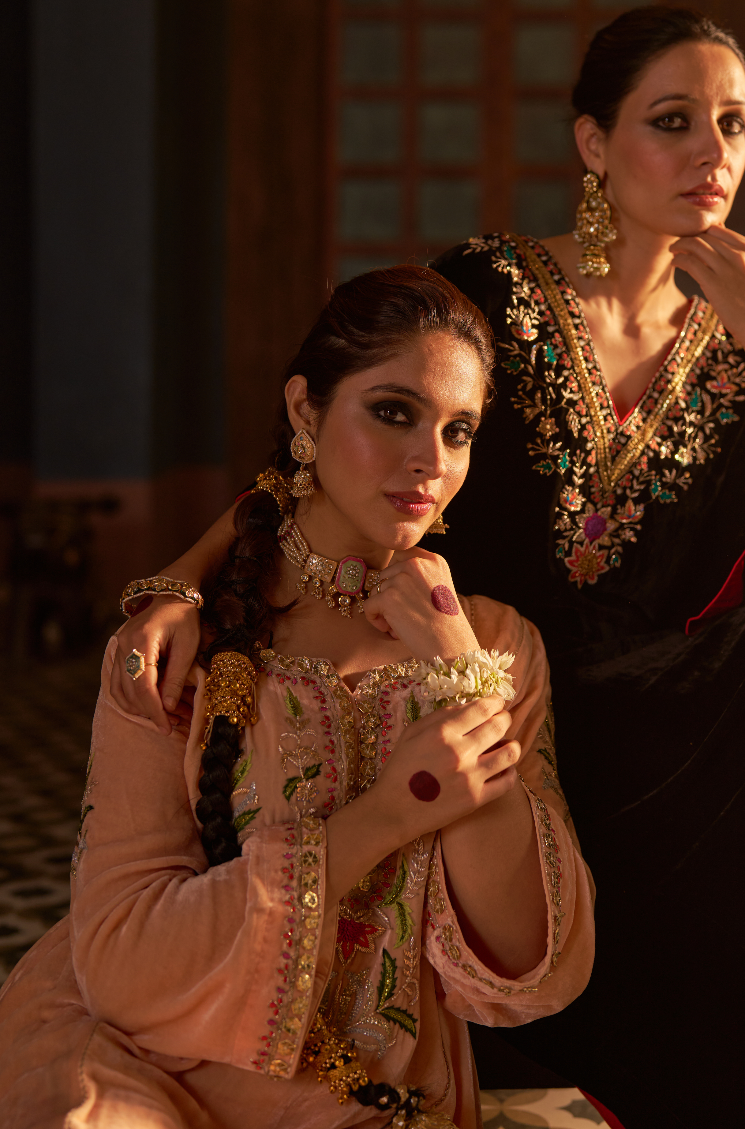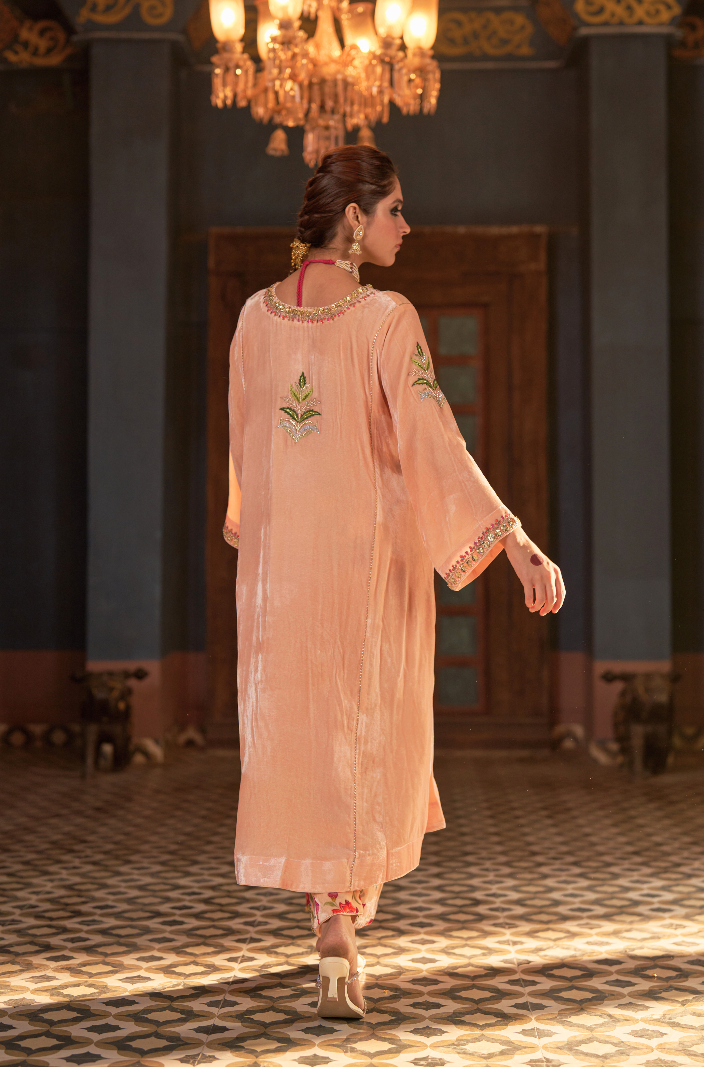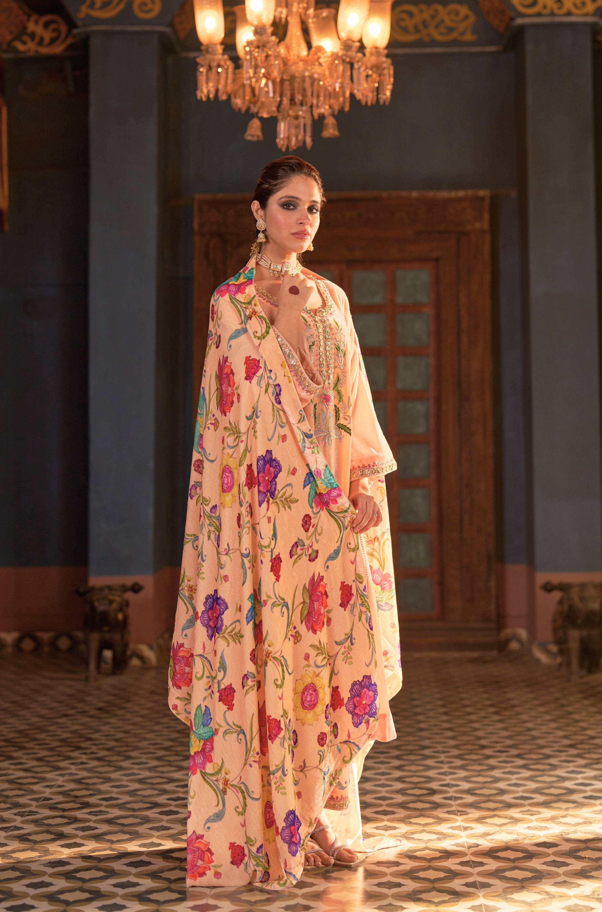 Naaz Kali Kurta Set, features silk velvet kali kurta with digital printed pants and odhini. adorned with zardozi, intricate silk thread work & gota reflecting timeless artistry of Indian craftsmanship.
