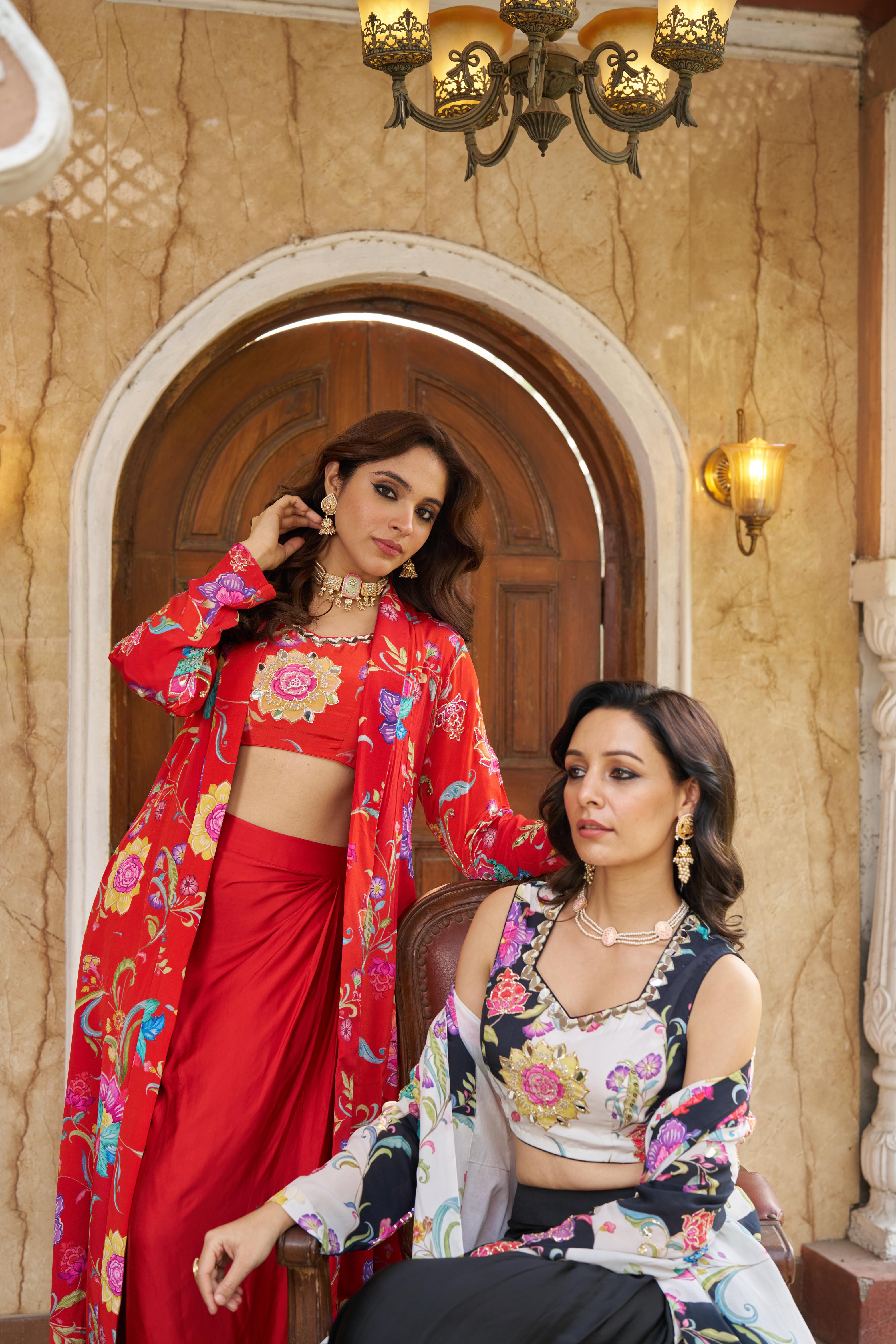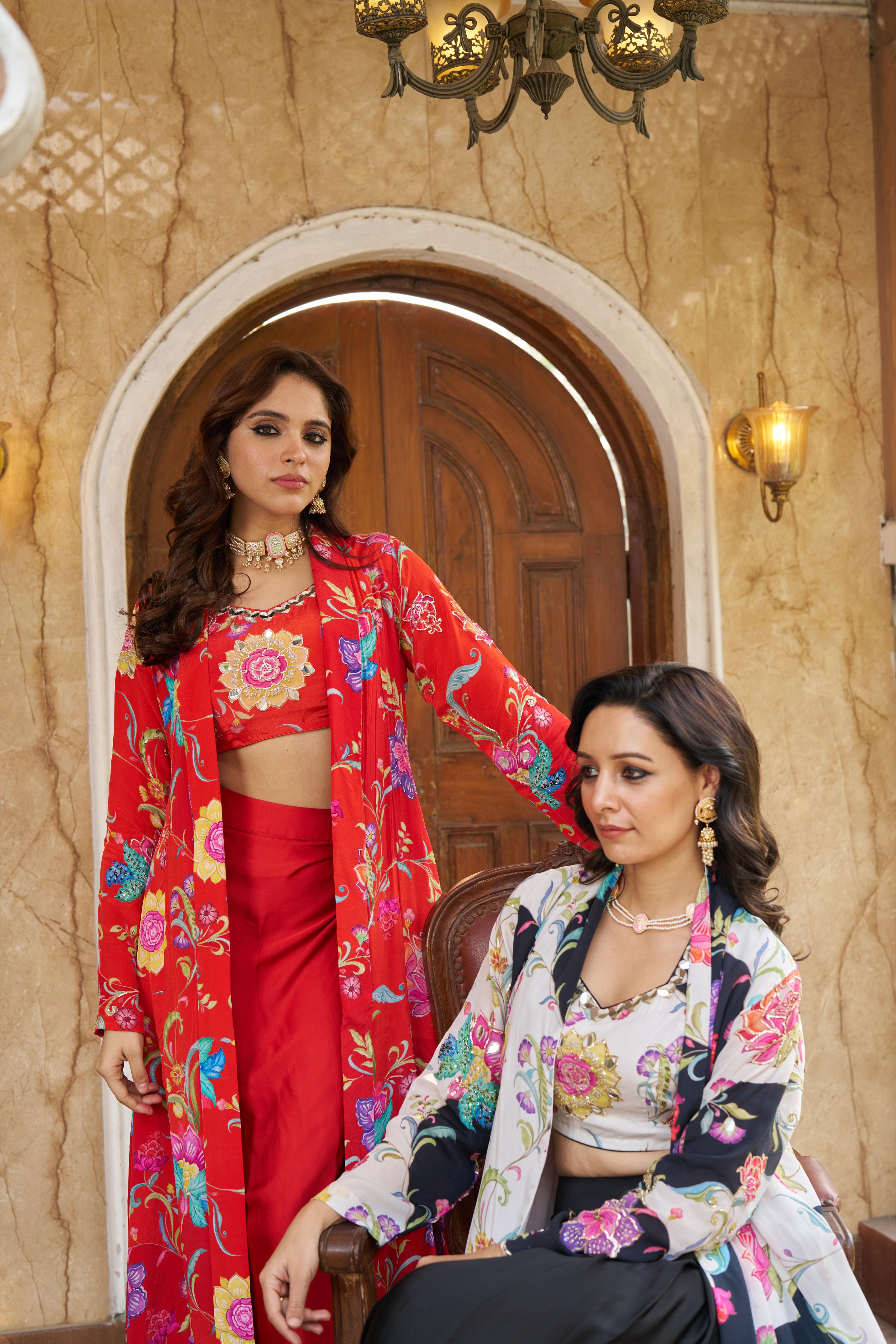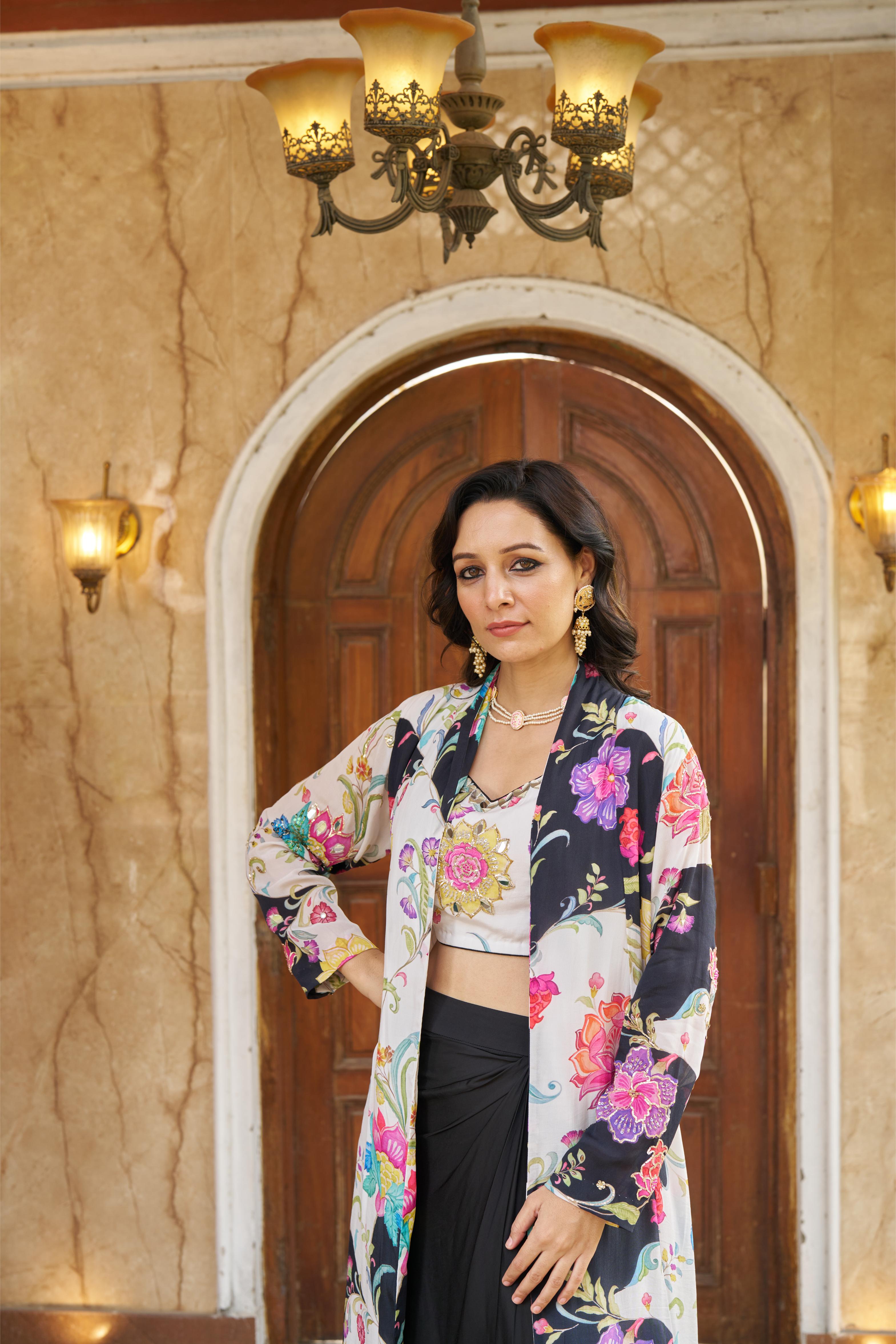 Floral Printed Jacket With Blouse In Natural Crepe Paired With Solid Modal Silk Skirt.