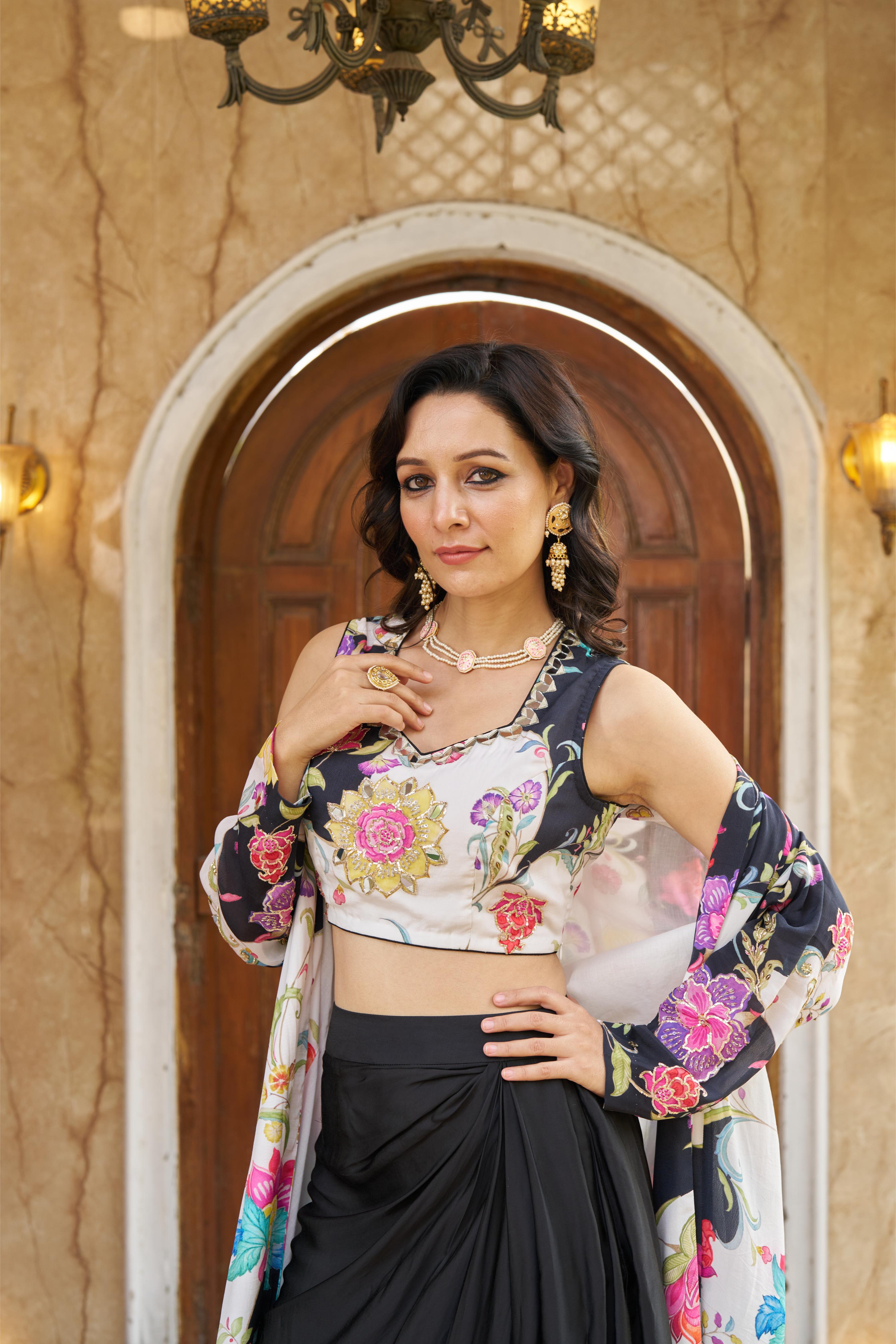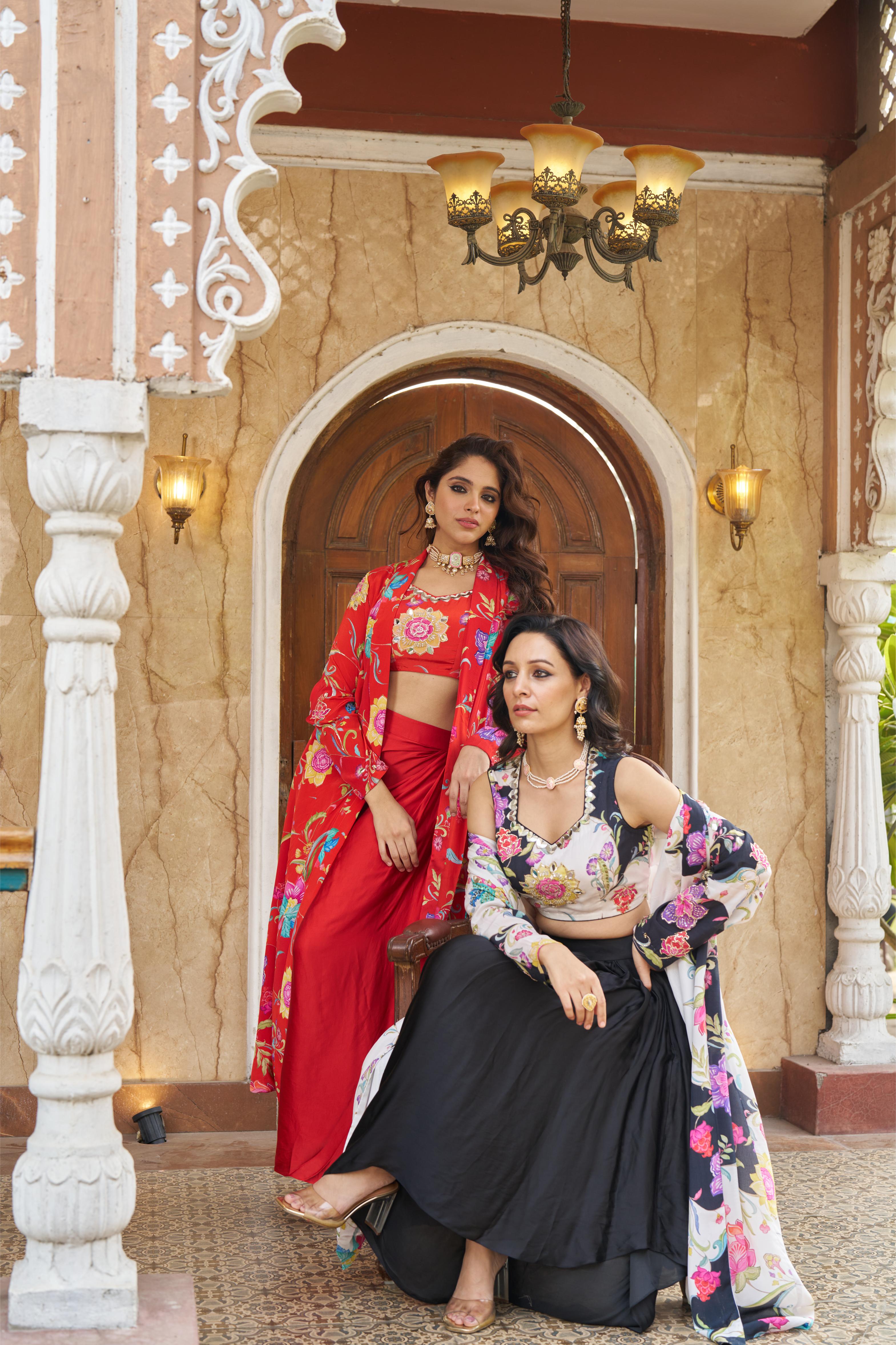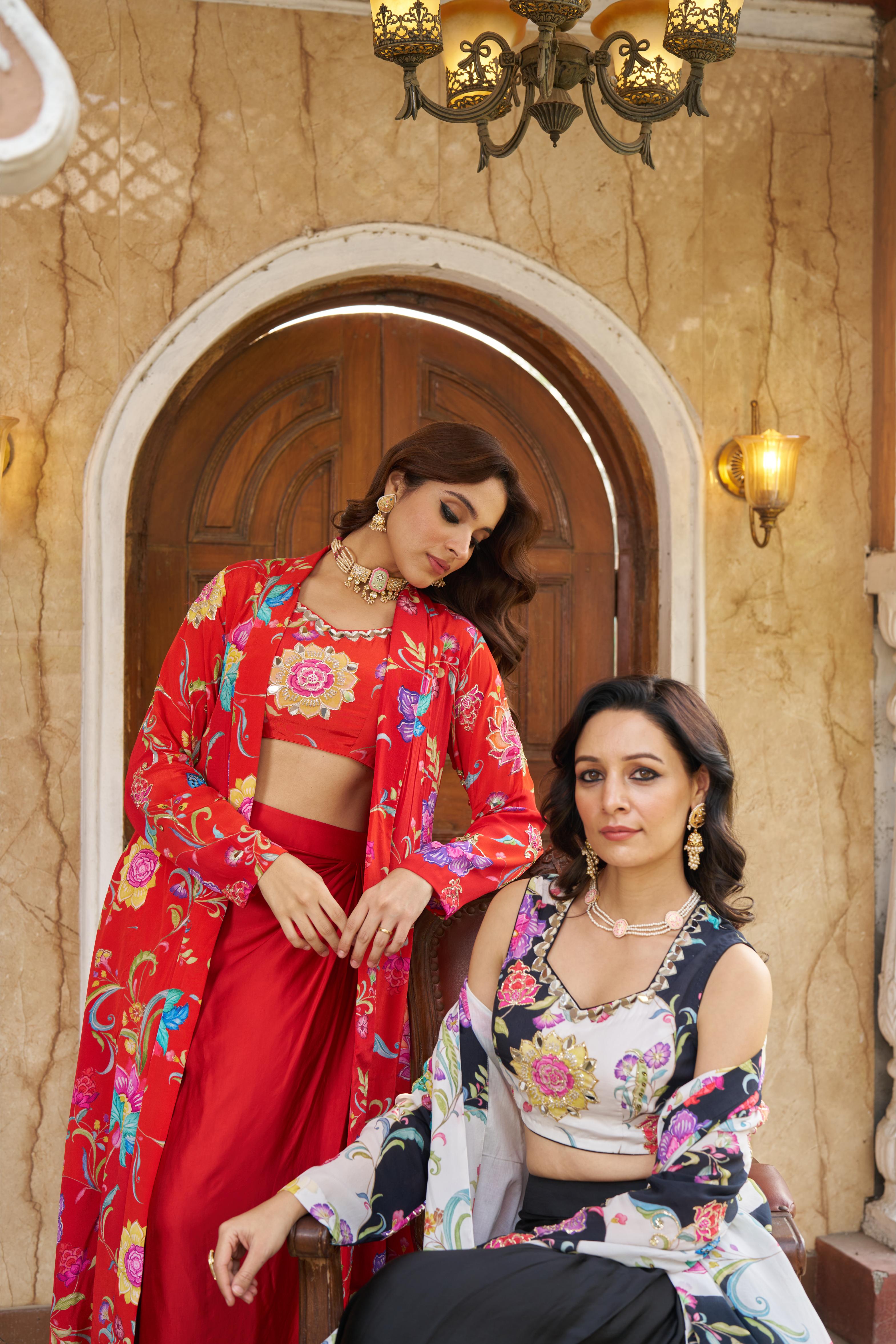 Floral Printed Jacket With Blouse In Natural Crepe Paired With Solid Modal Silk Skirt.
