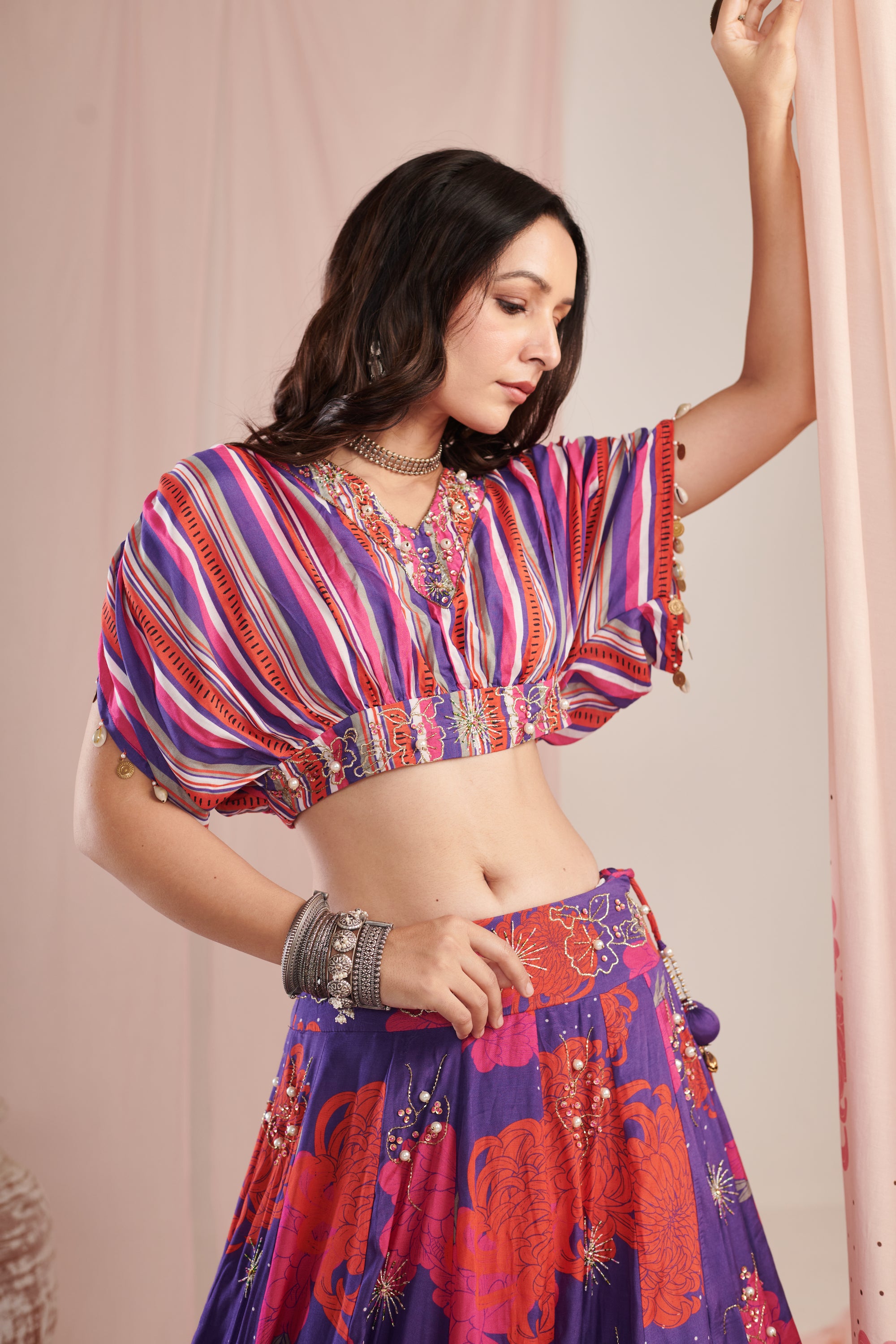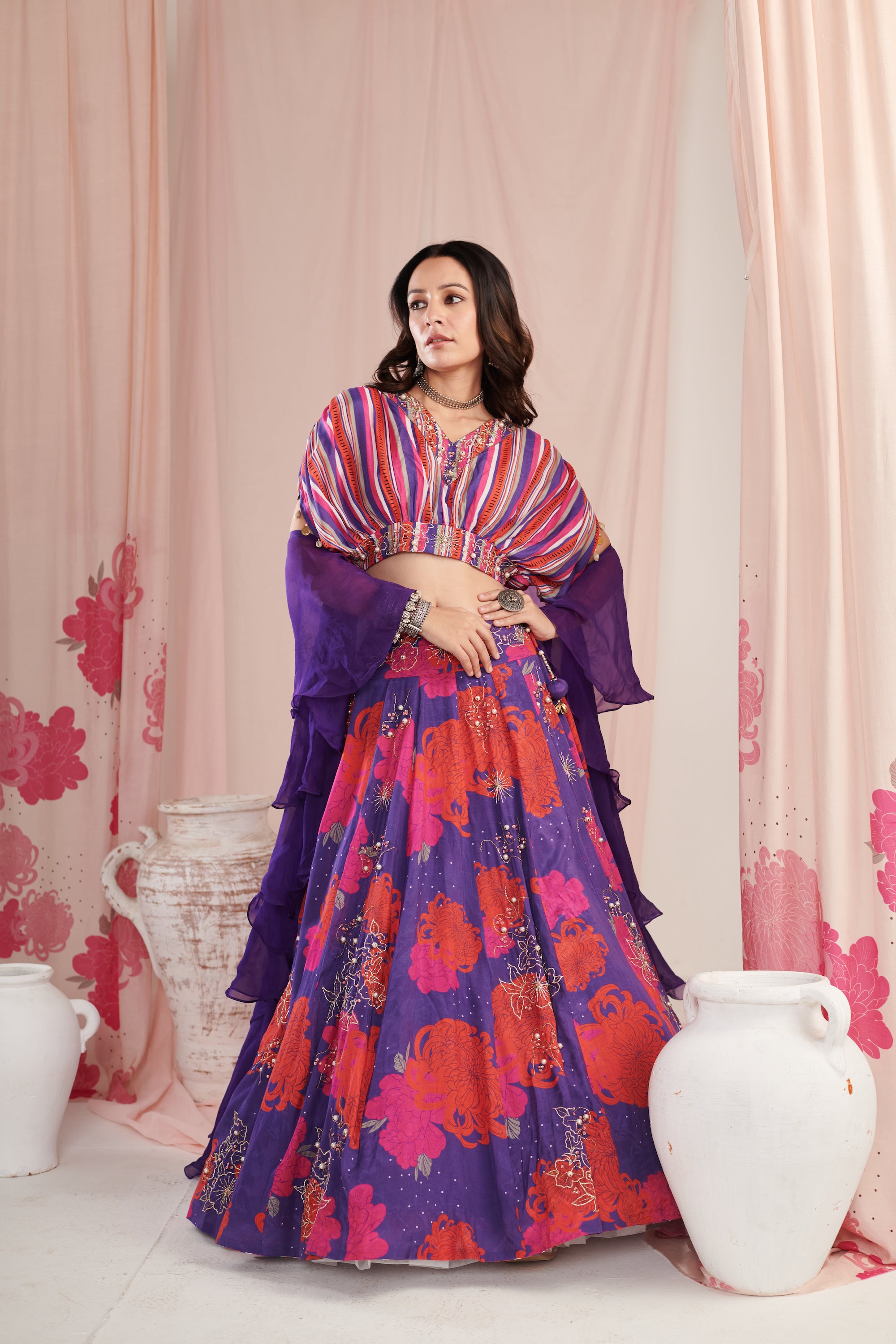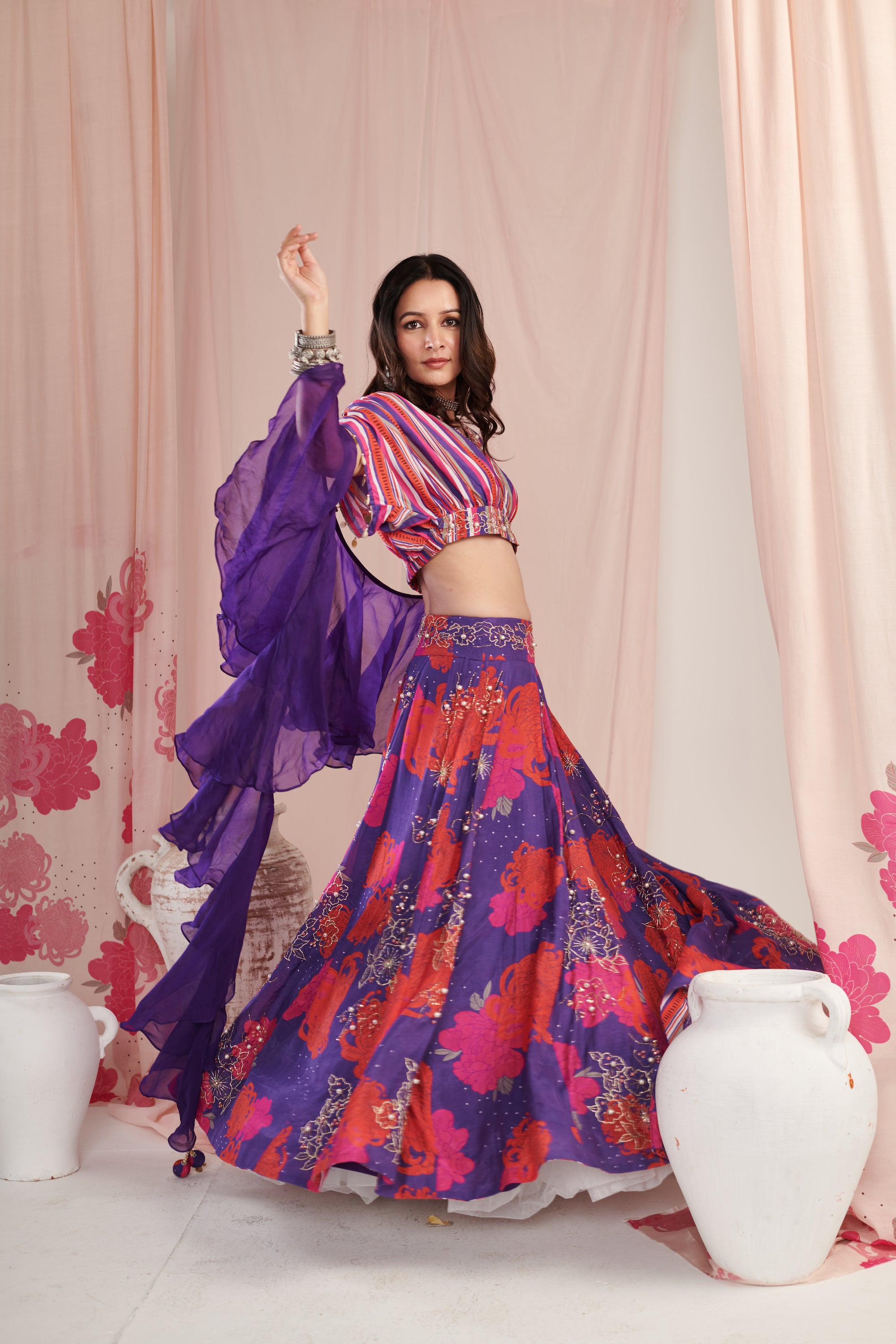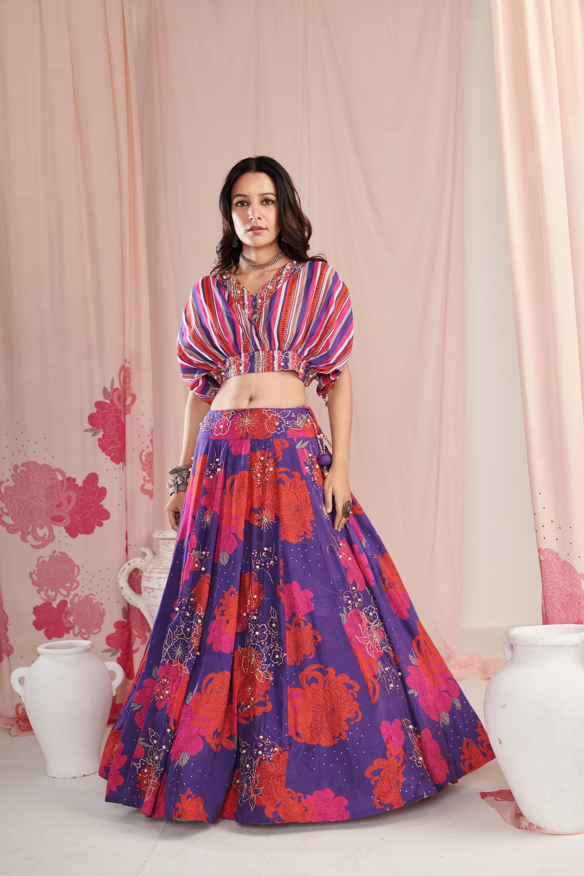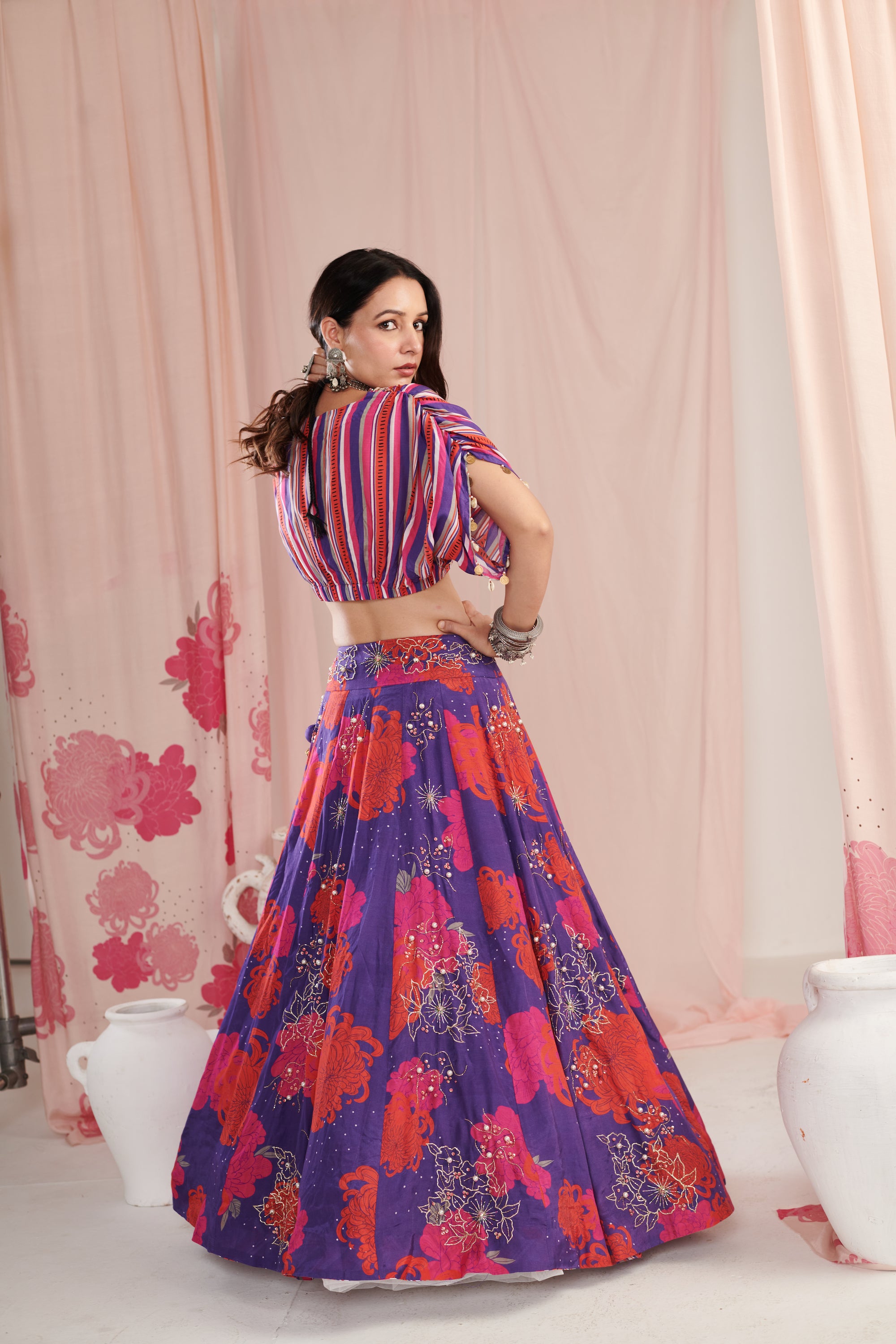 Purple Lehenga with beautiful pearl embroidery and digitally printed floral designs made of cotton silk.