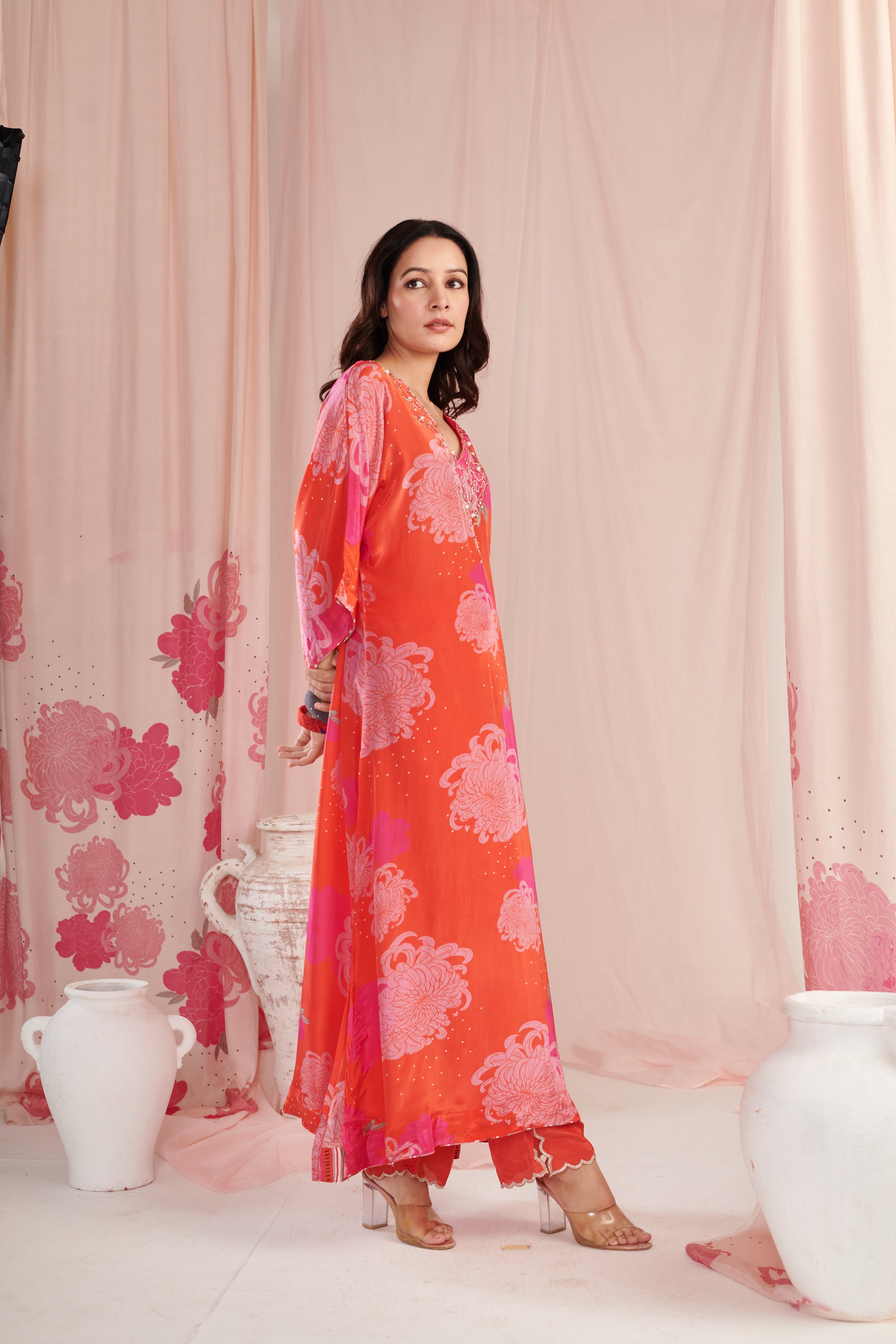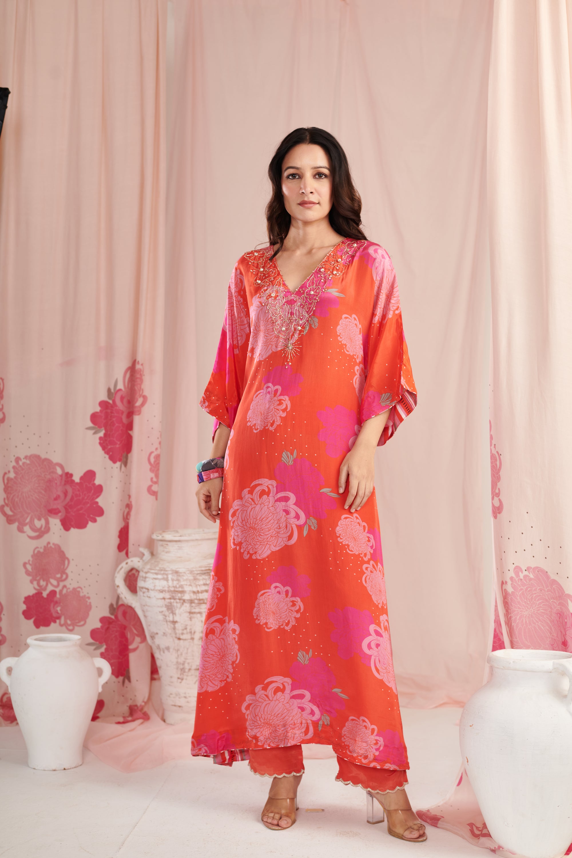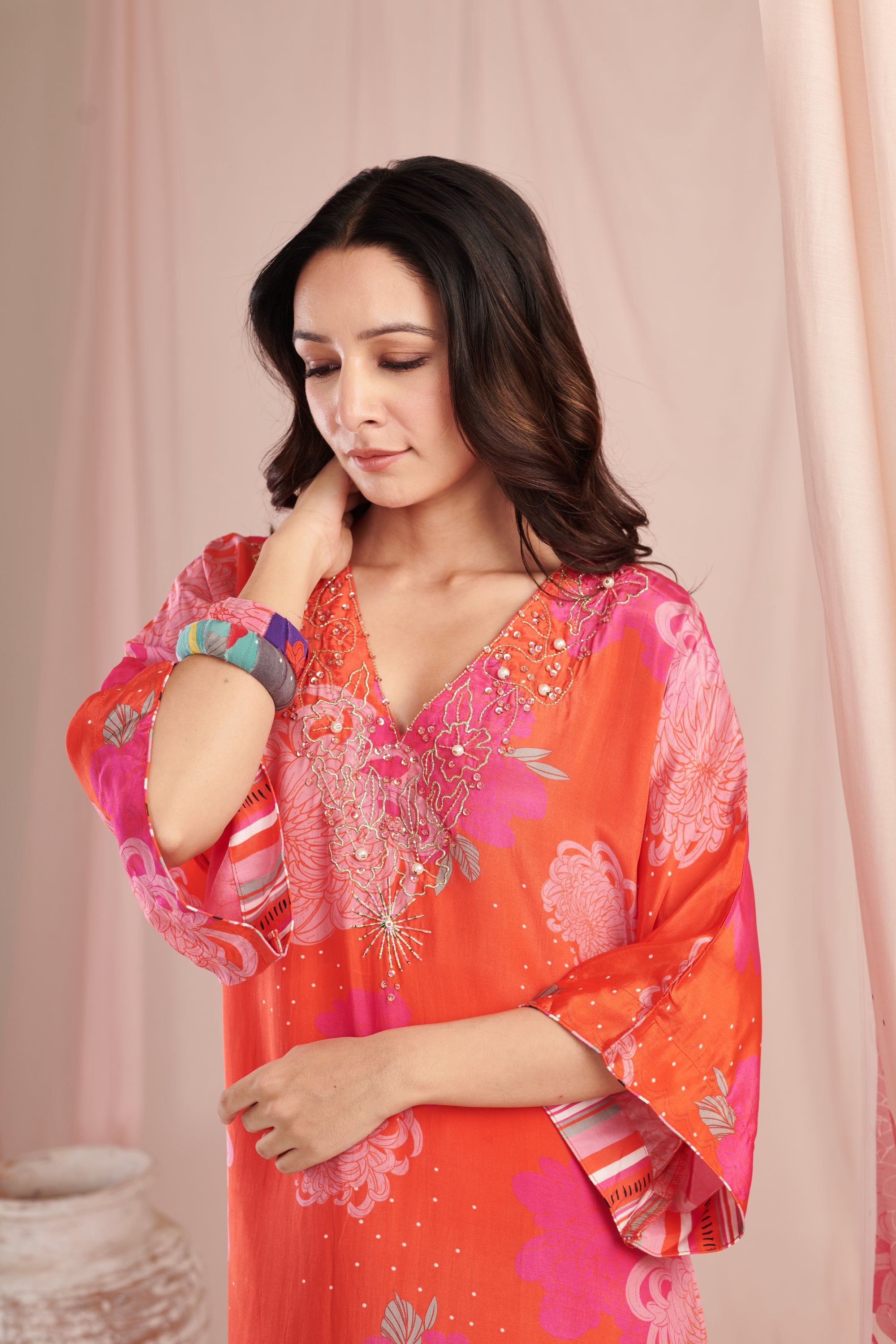 Crepe kaftan kurta with pearl work on neckline paired with crape pants with applique gota embroidery.