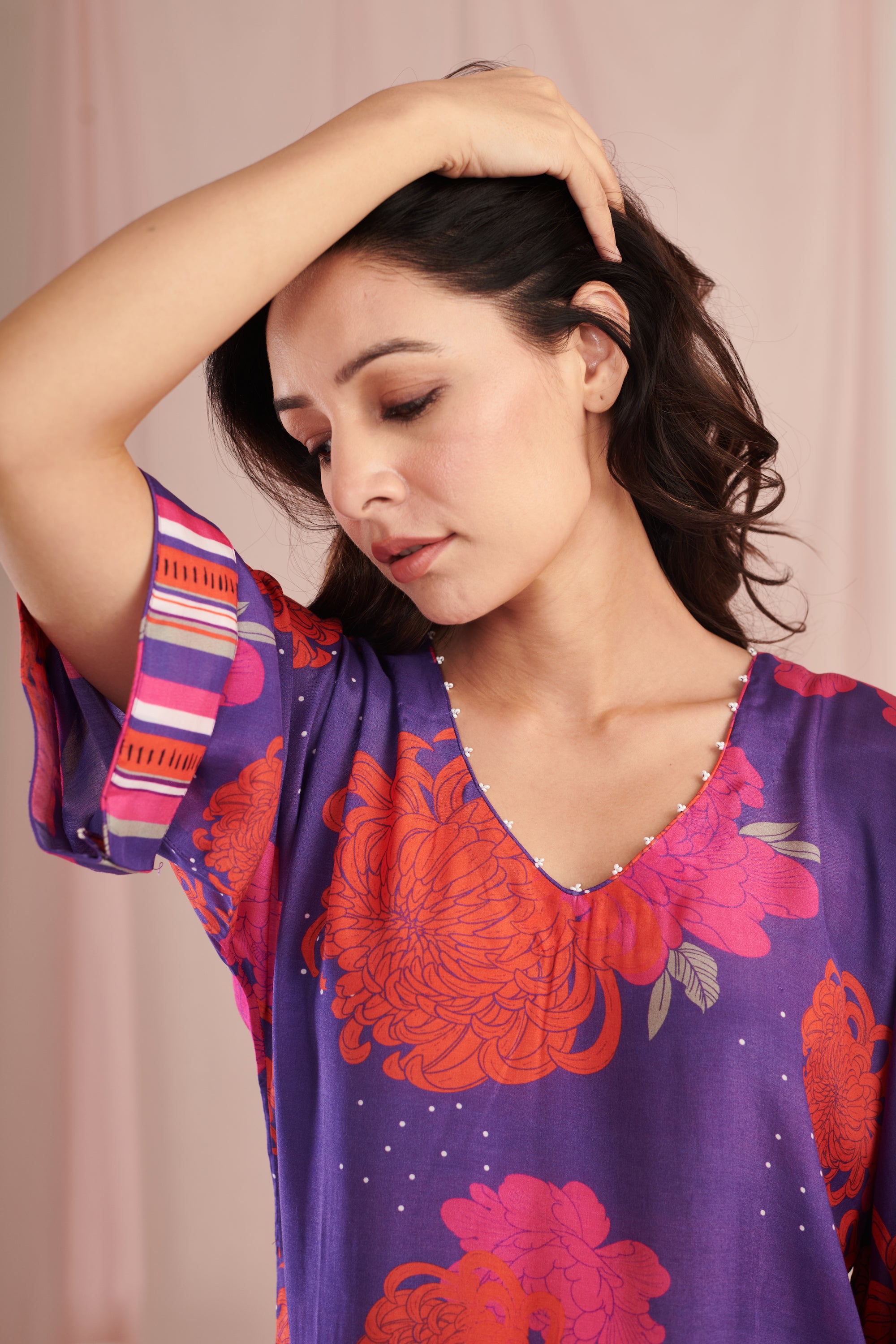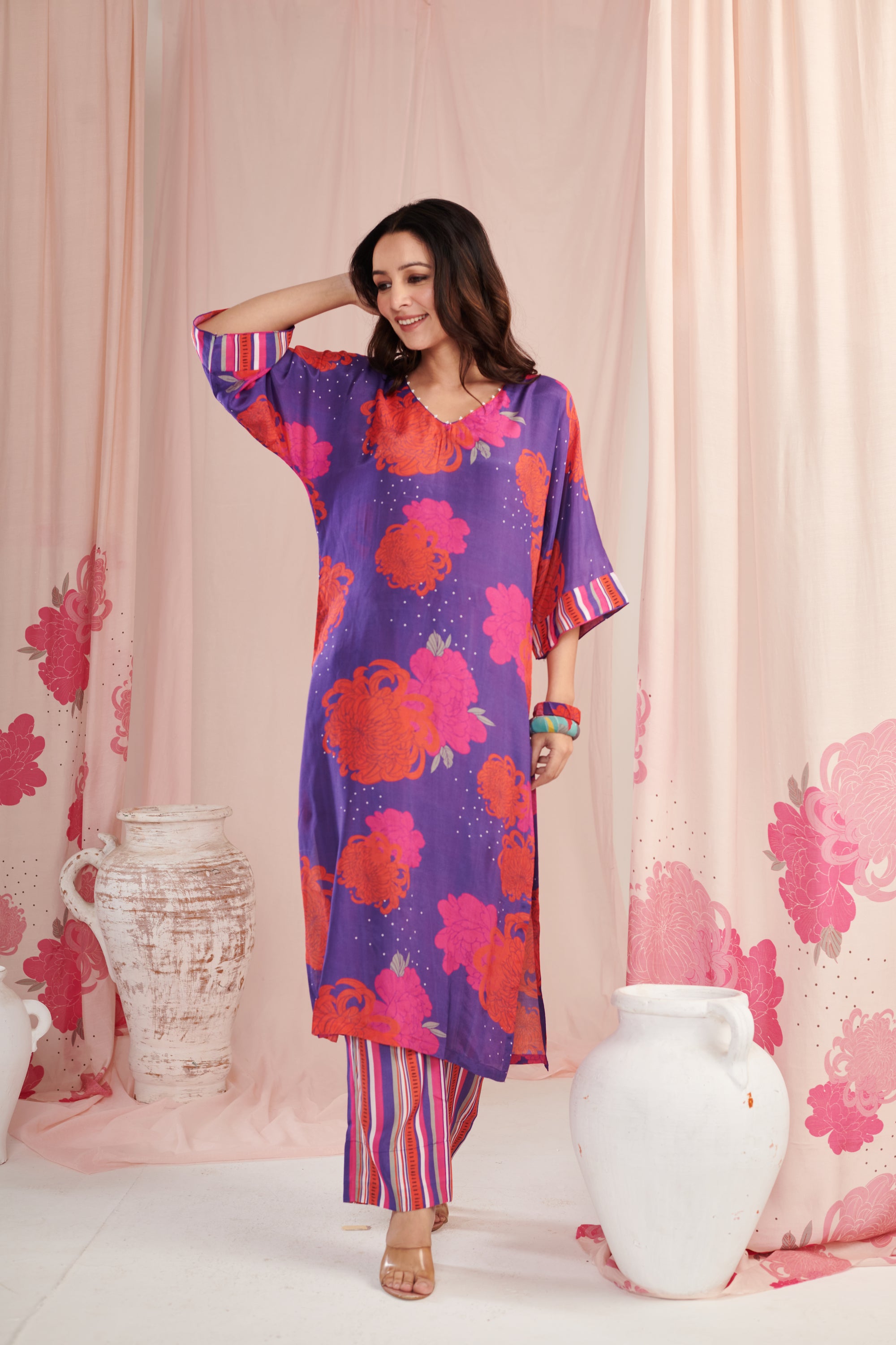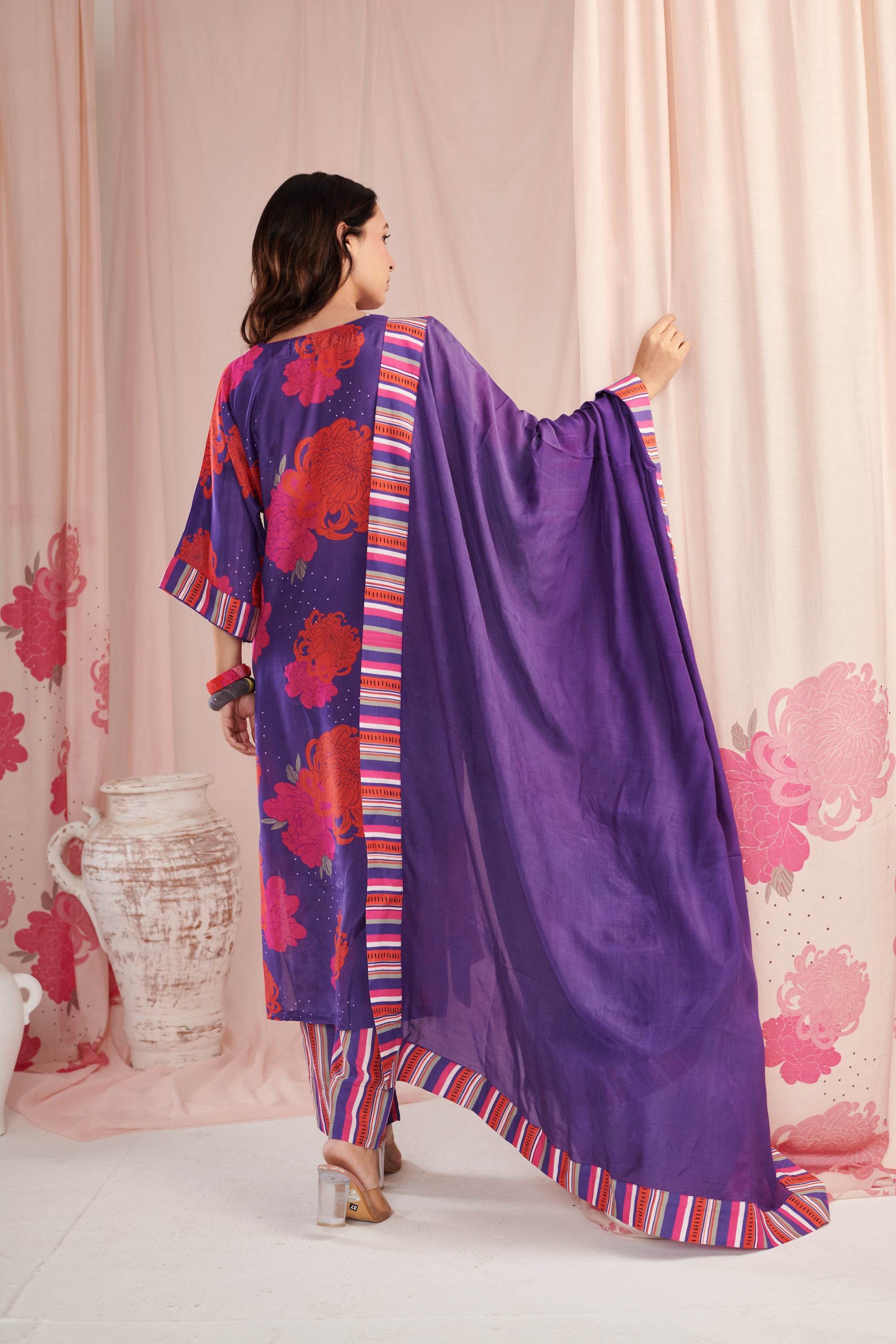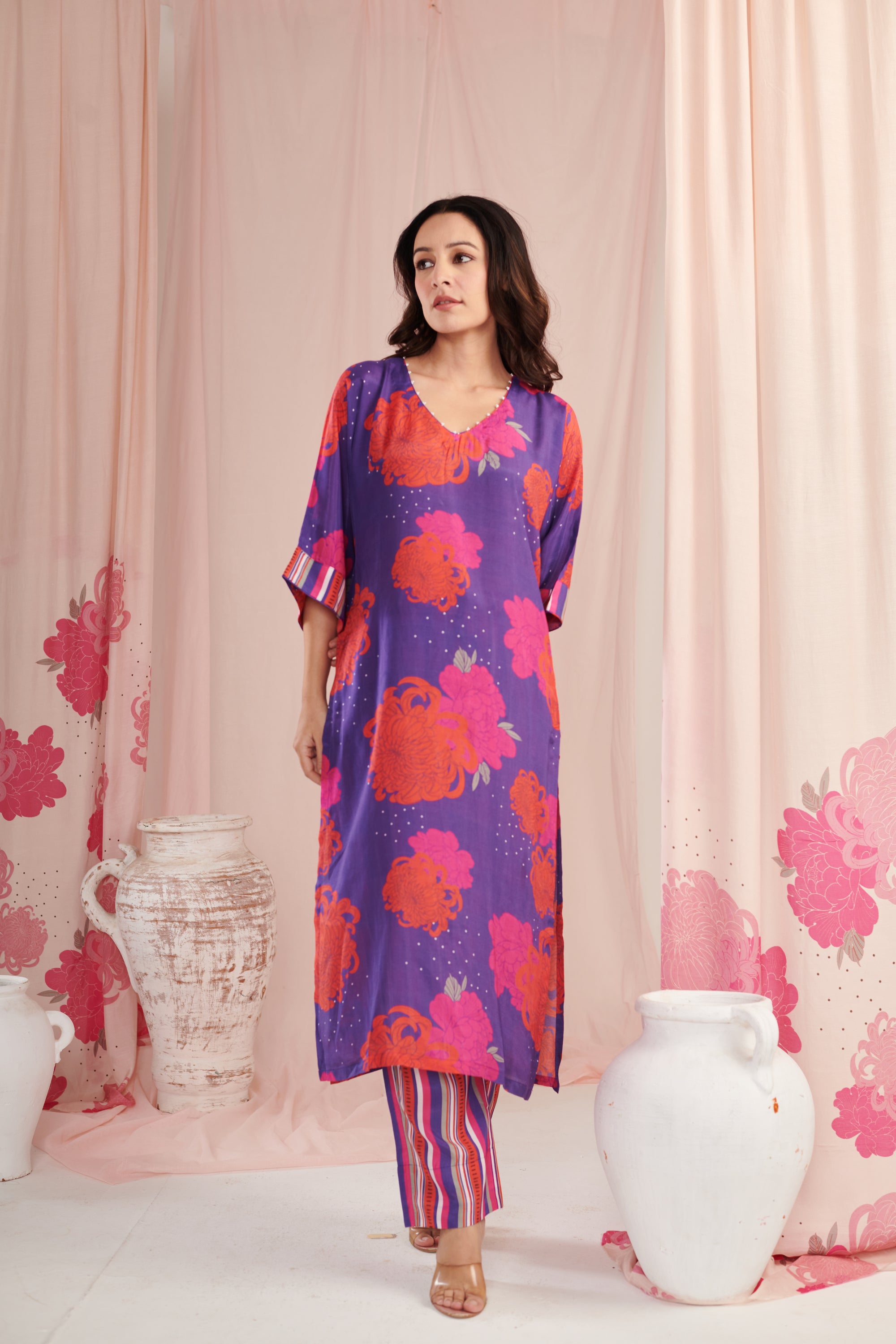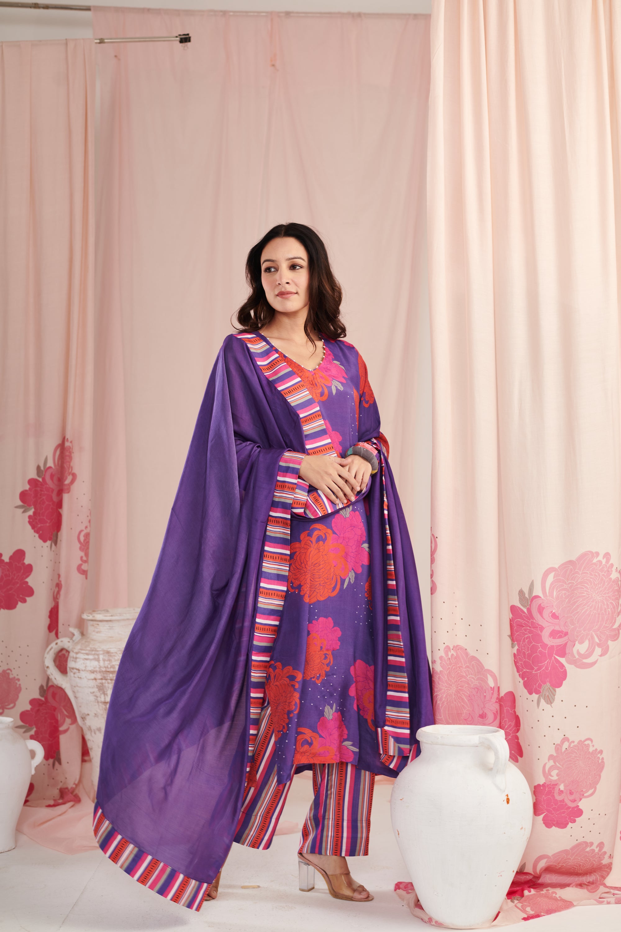 Cotton silk printed kurta with pearl emblished neckline paired with print pants. Teamed with cotton silk dupatta with striped facing.