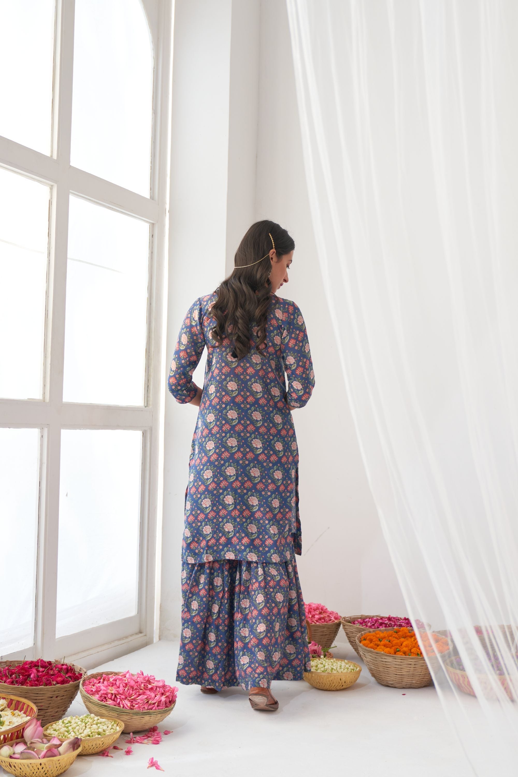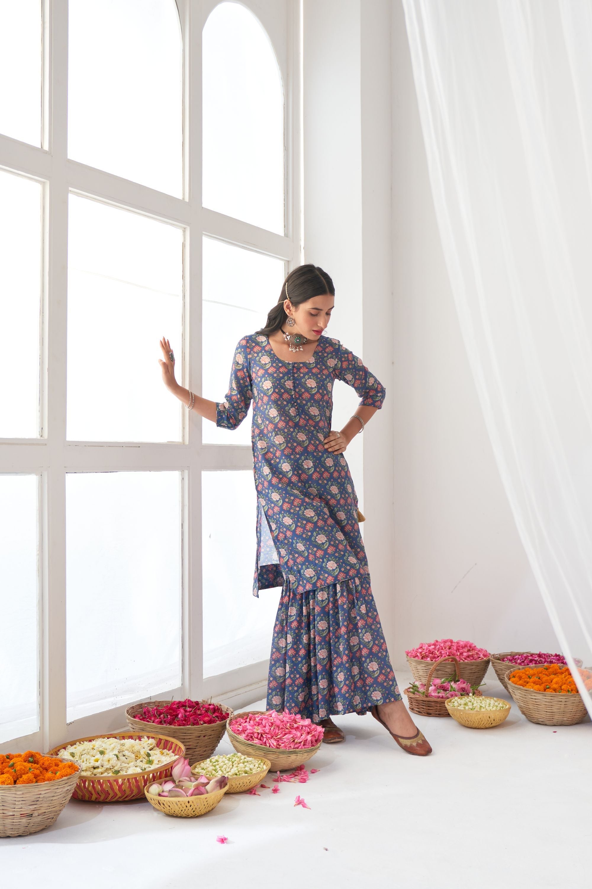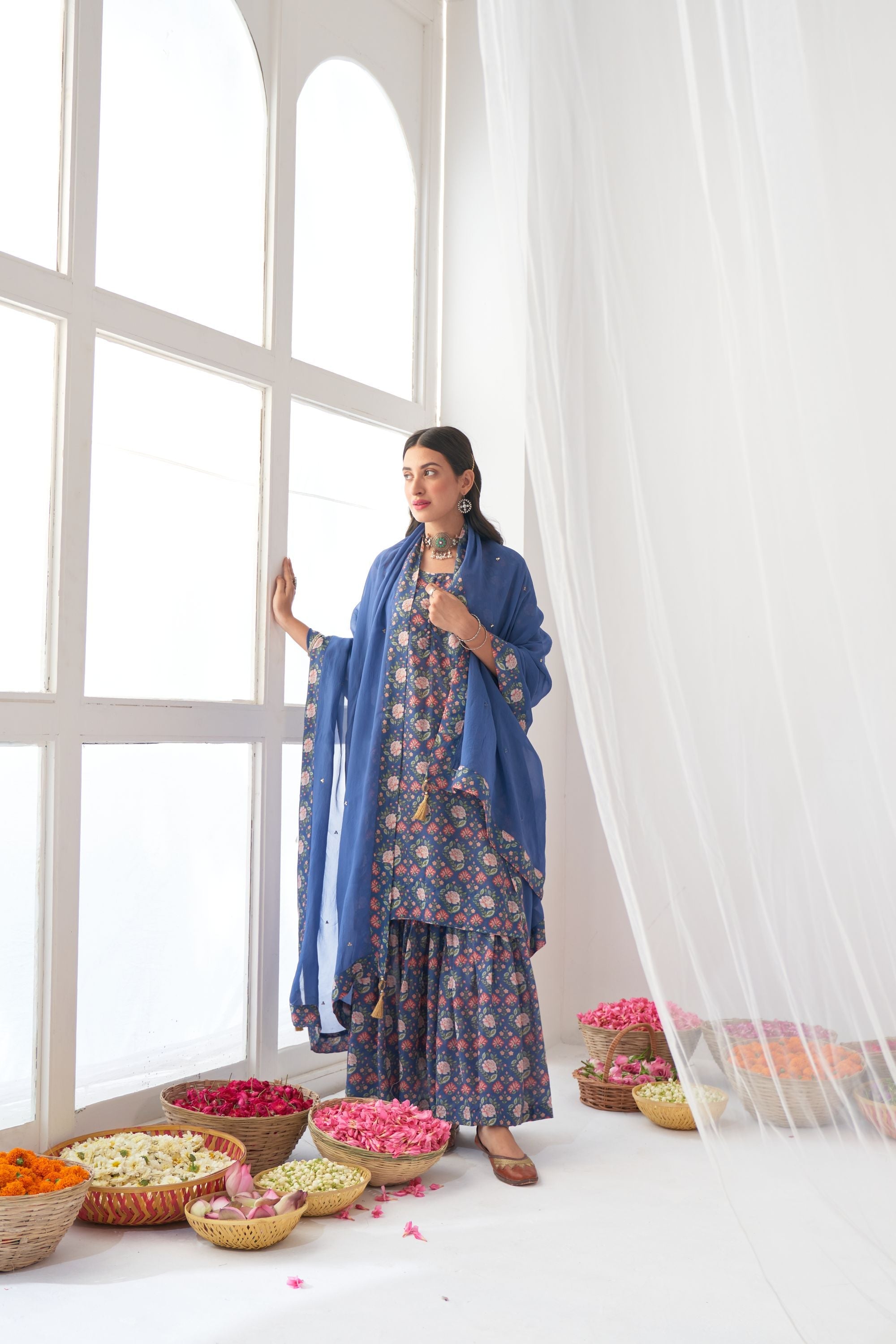 •Featuring A three piece set that includes short kurta, sharara and dupatta.
