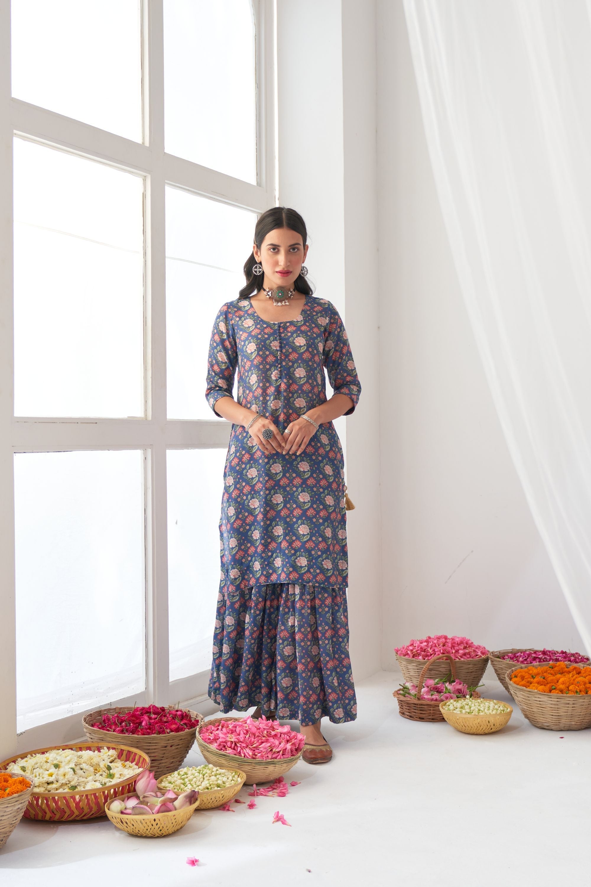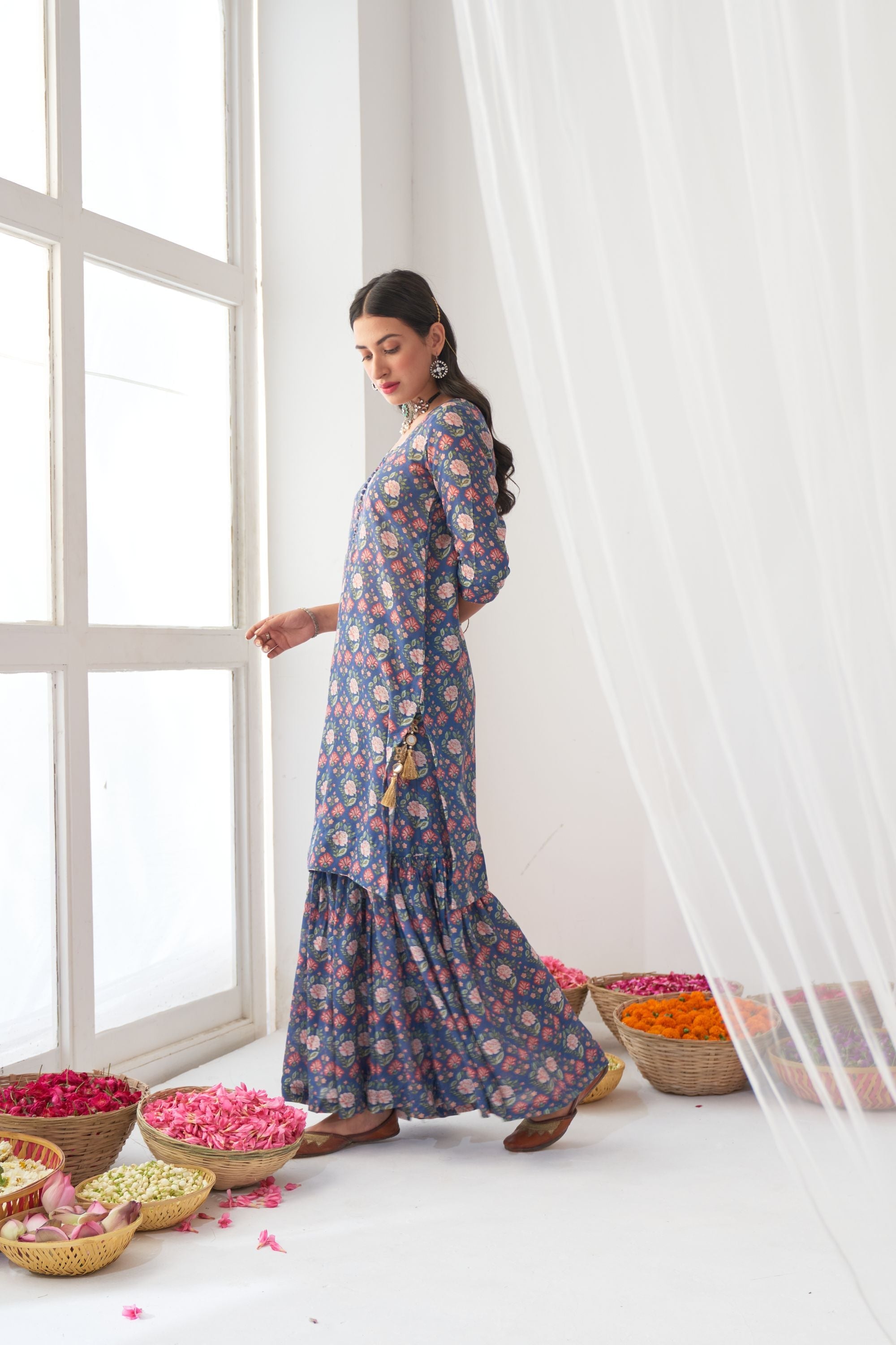 •Peony flower digital printed short kurta in cotton silk with potli botton detailing on the yoke.