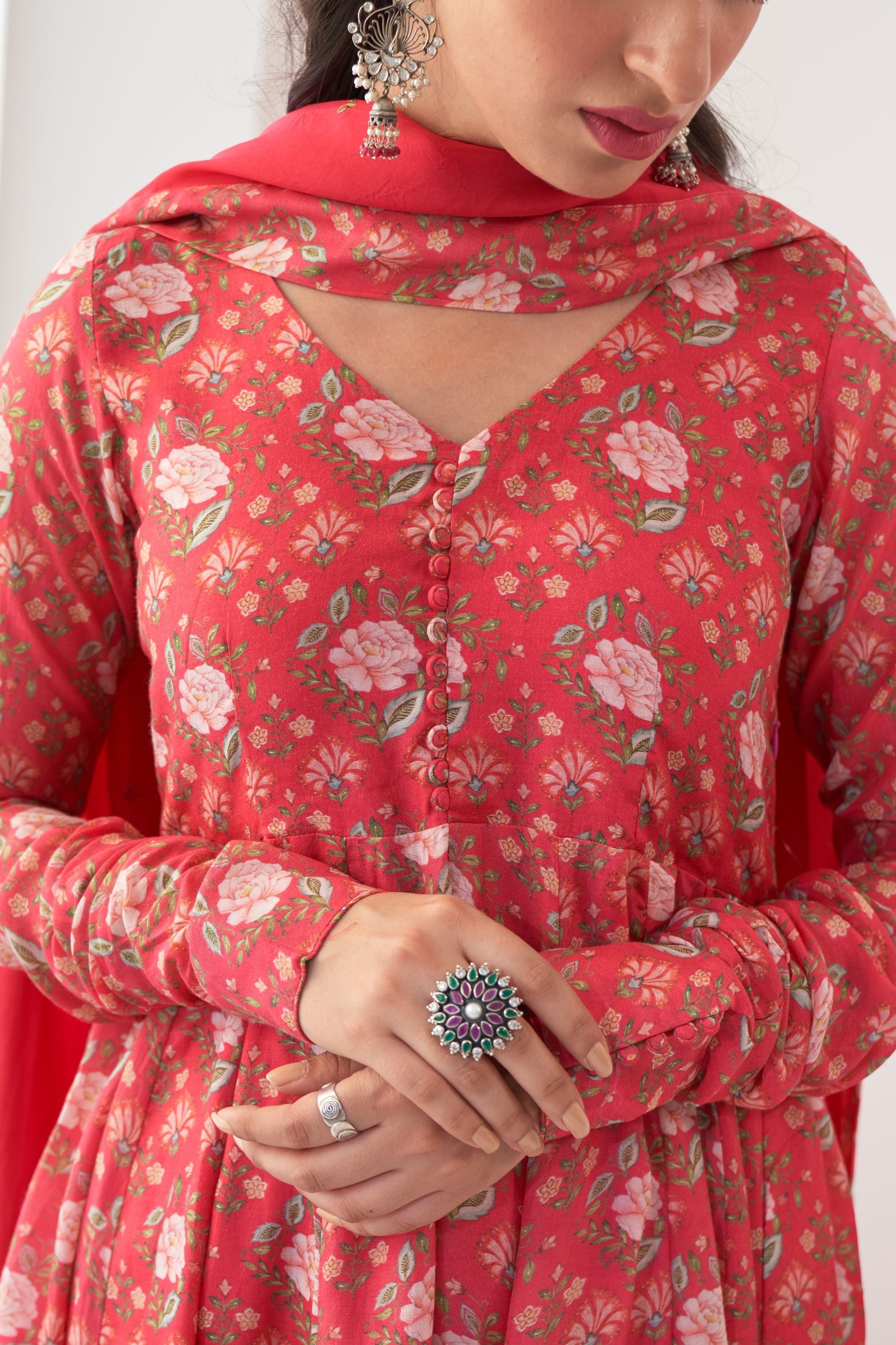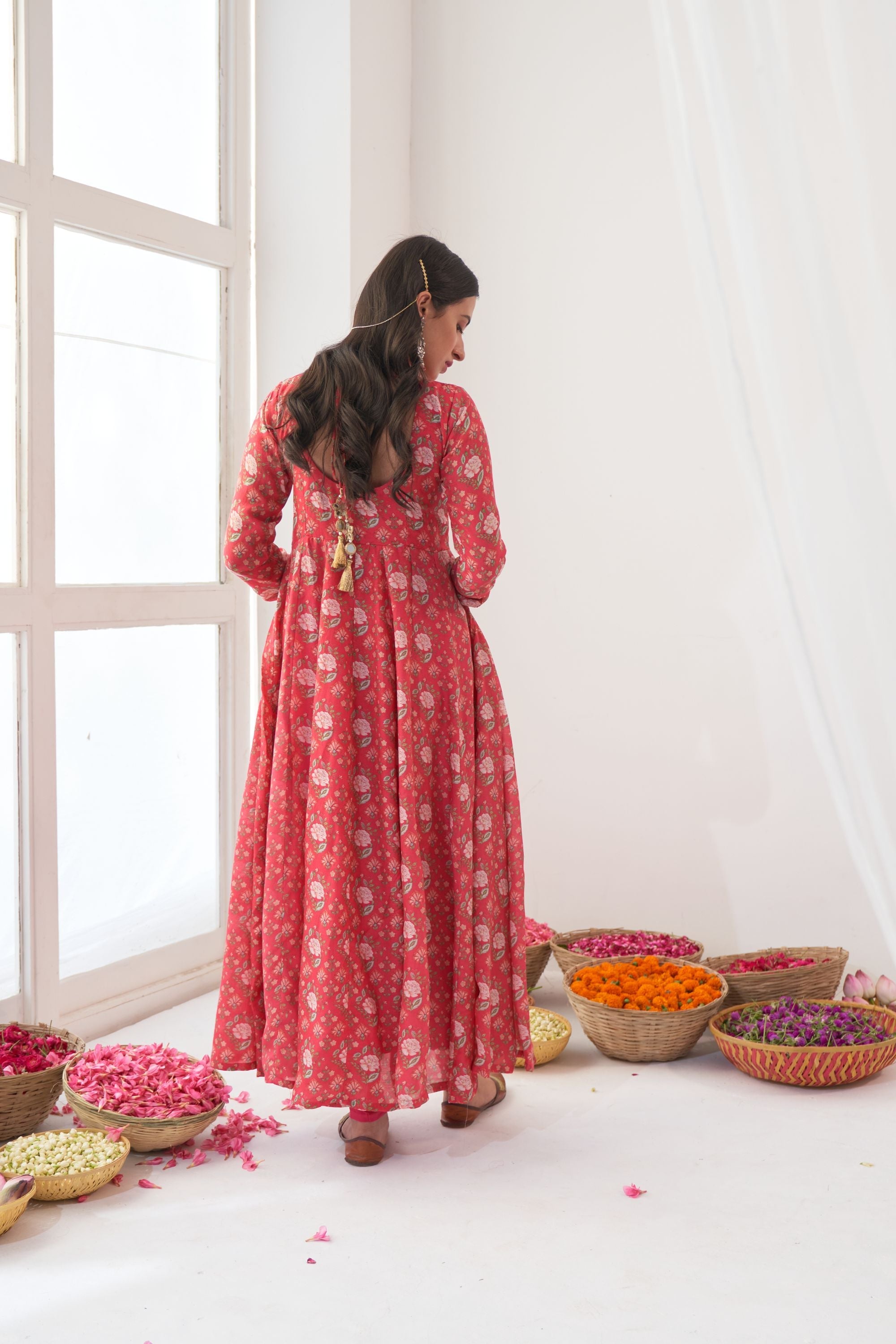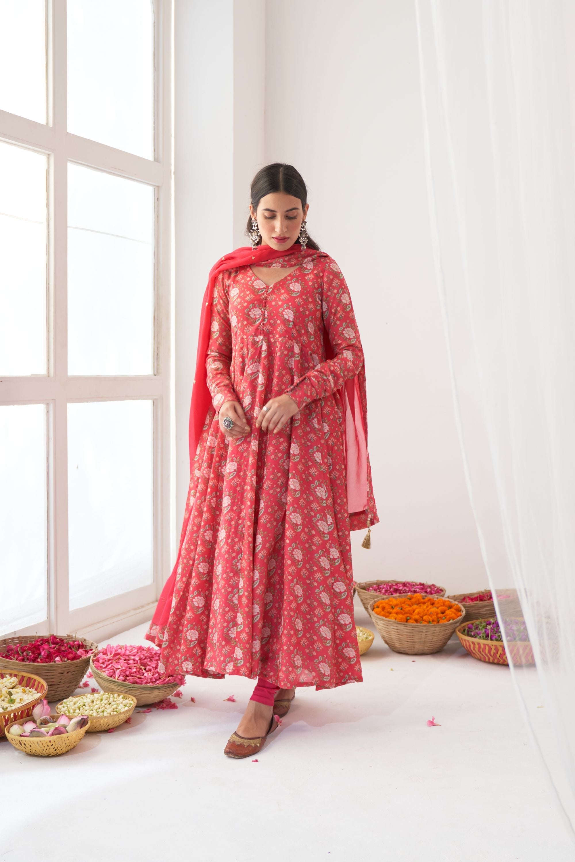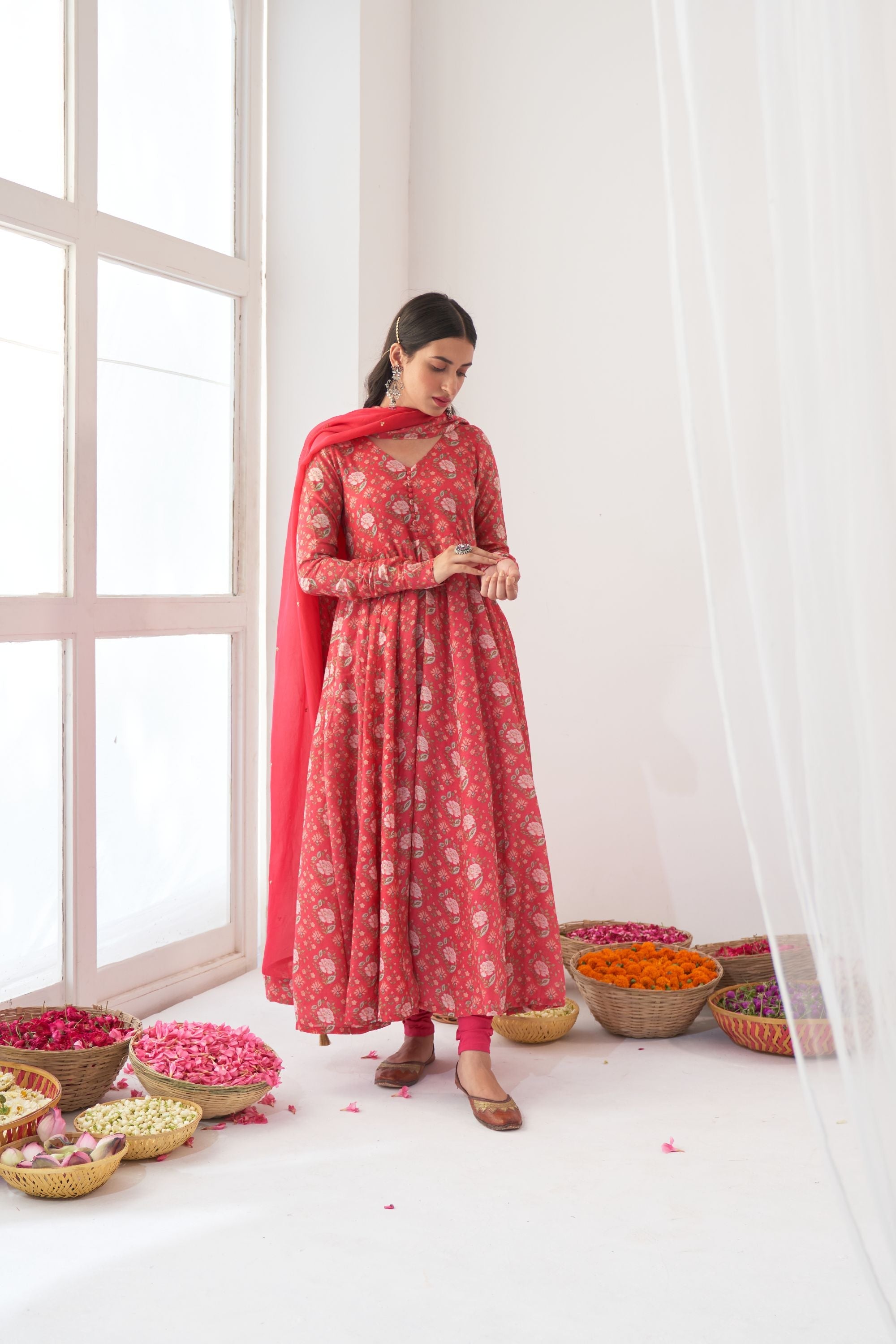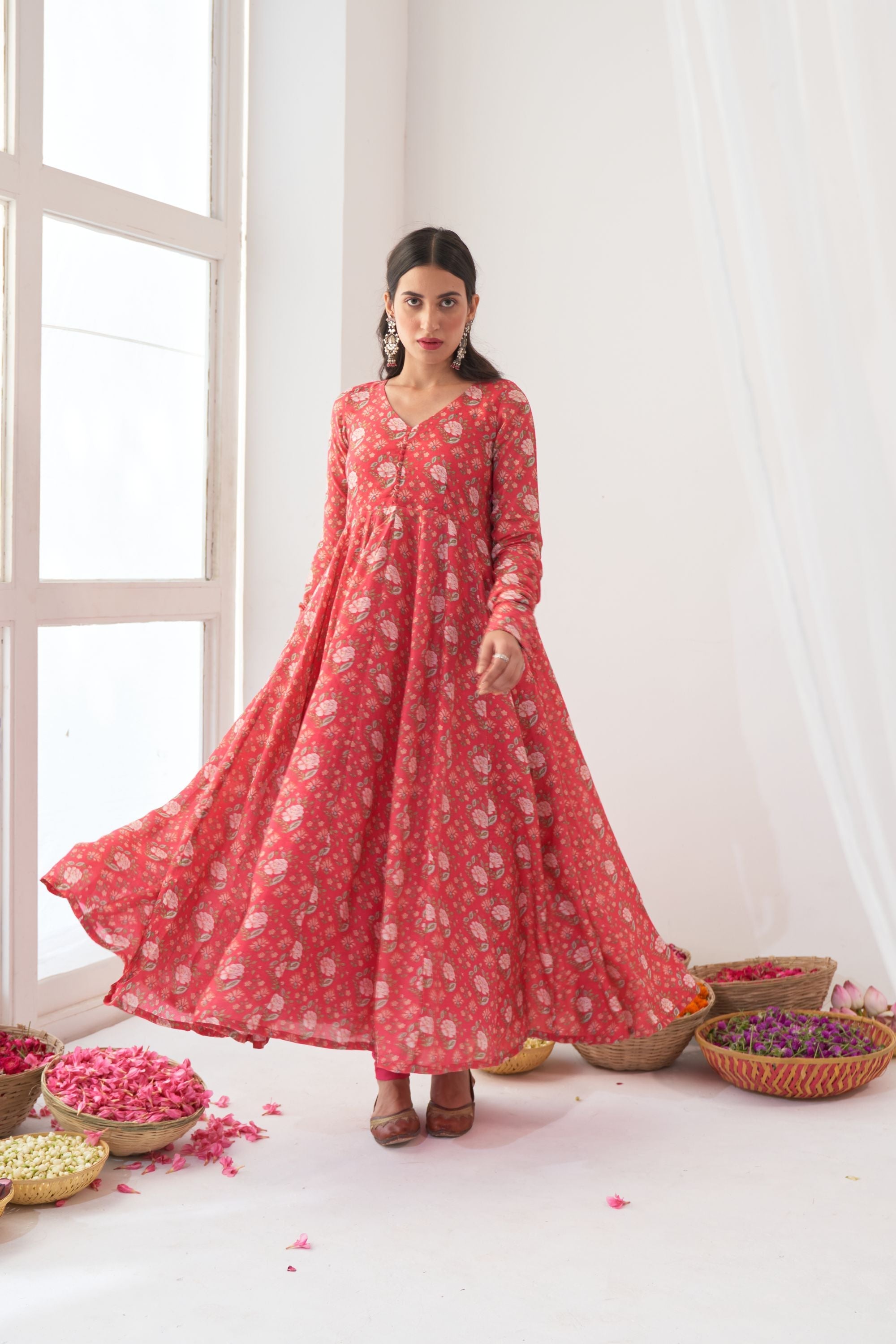 Peony flower digital printed cotton silk Anarkali with potli botton detailing on yoke, side zip closure and kalidar ghera , mul mul lining attached.