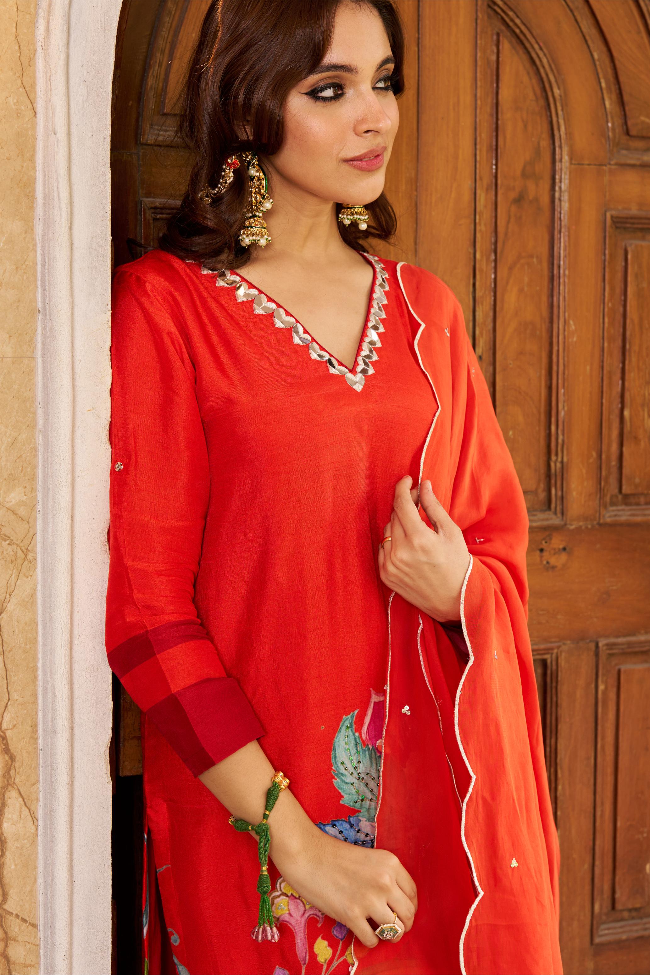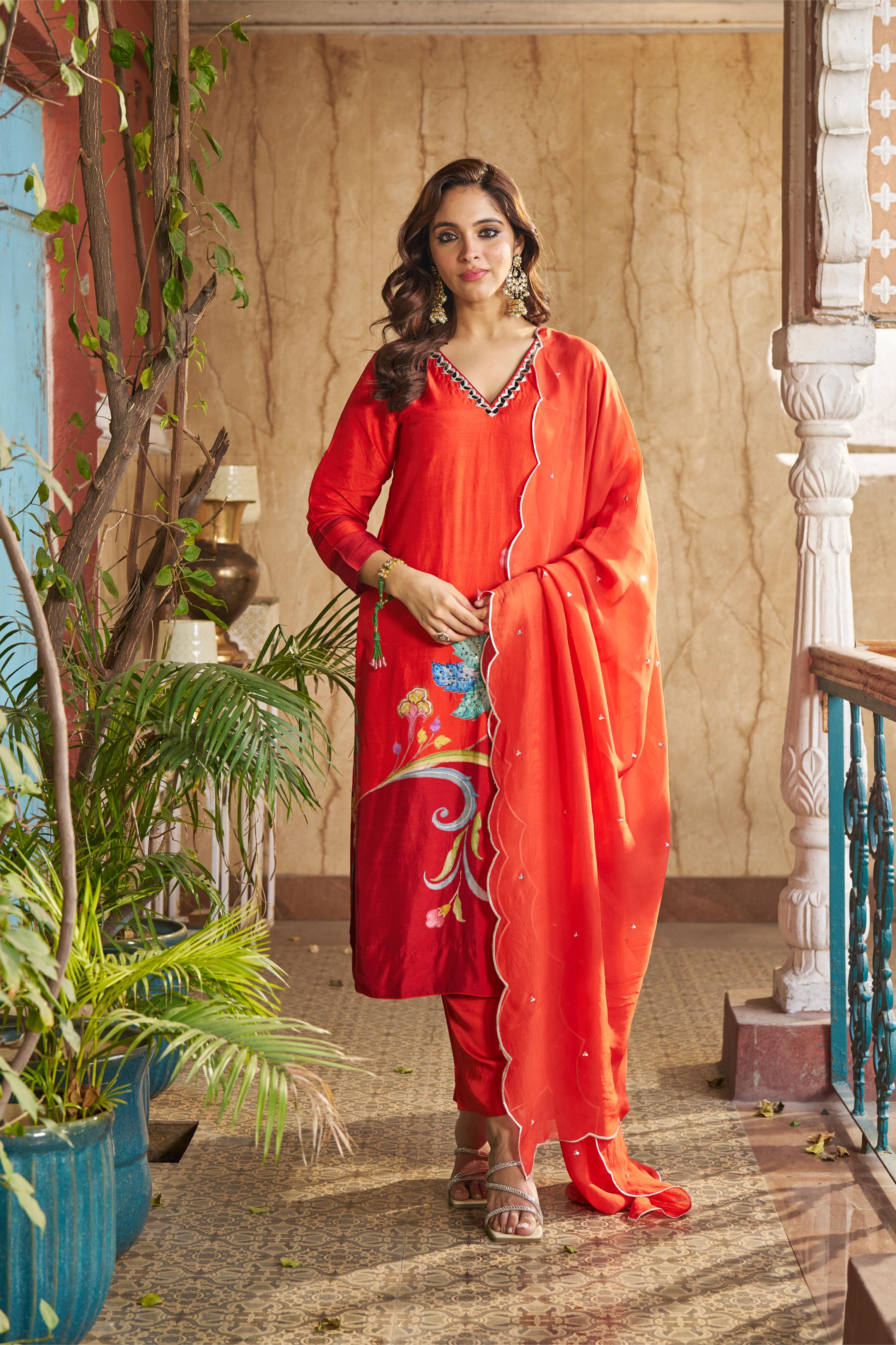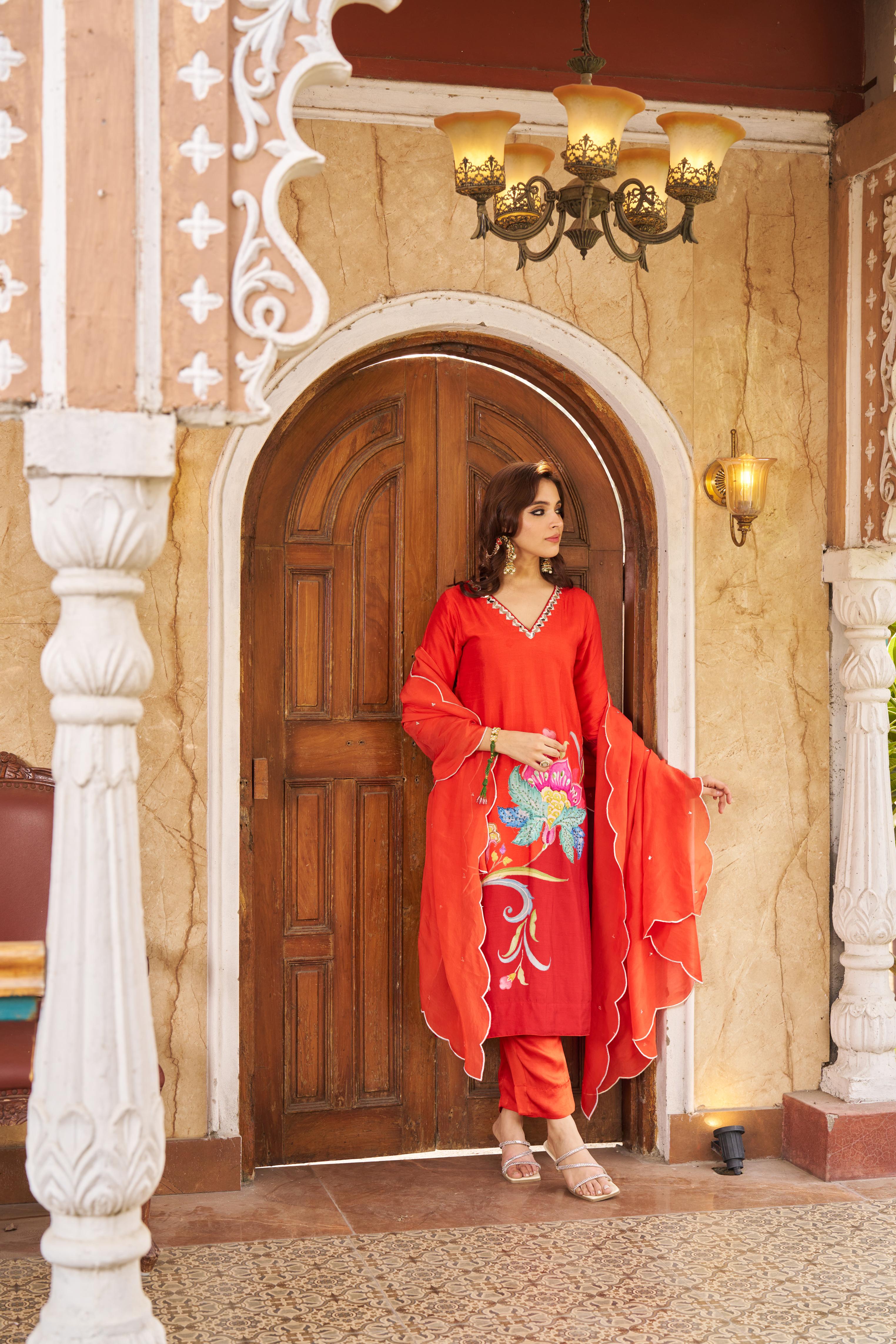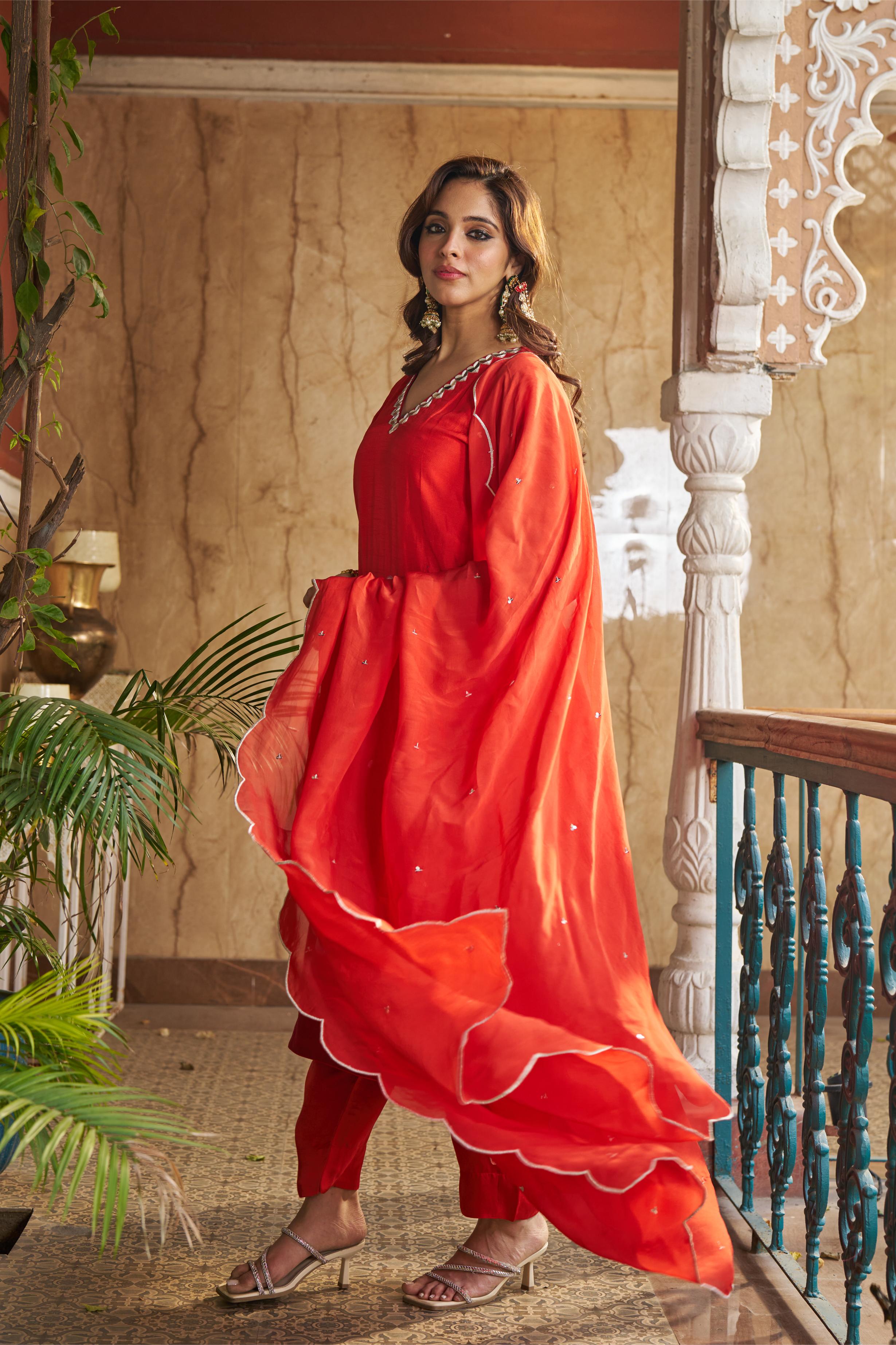 Featuring Shirt Of Muslin Silk With Mirror And Cut Dana Work On Neckline And Front Of Shirt Paired With Modal Pants, Comes With Organza Dupatta With Sequince Work And Scalloped Edges.