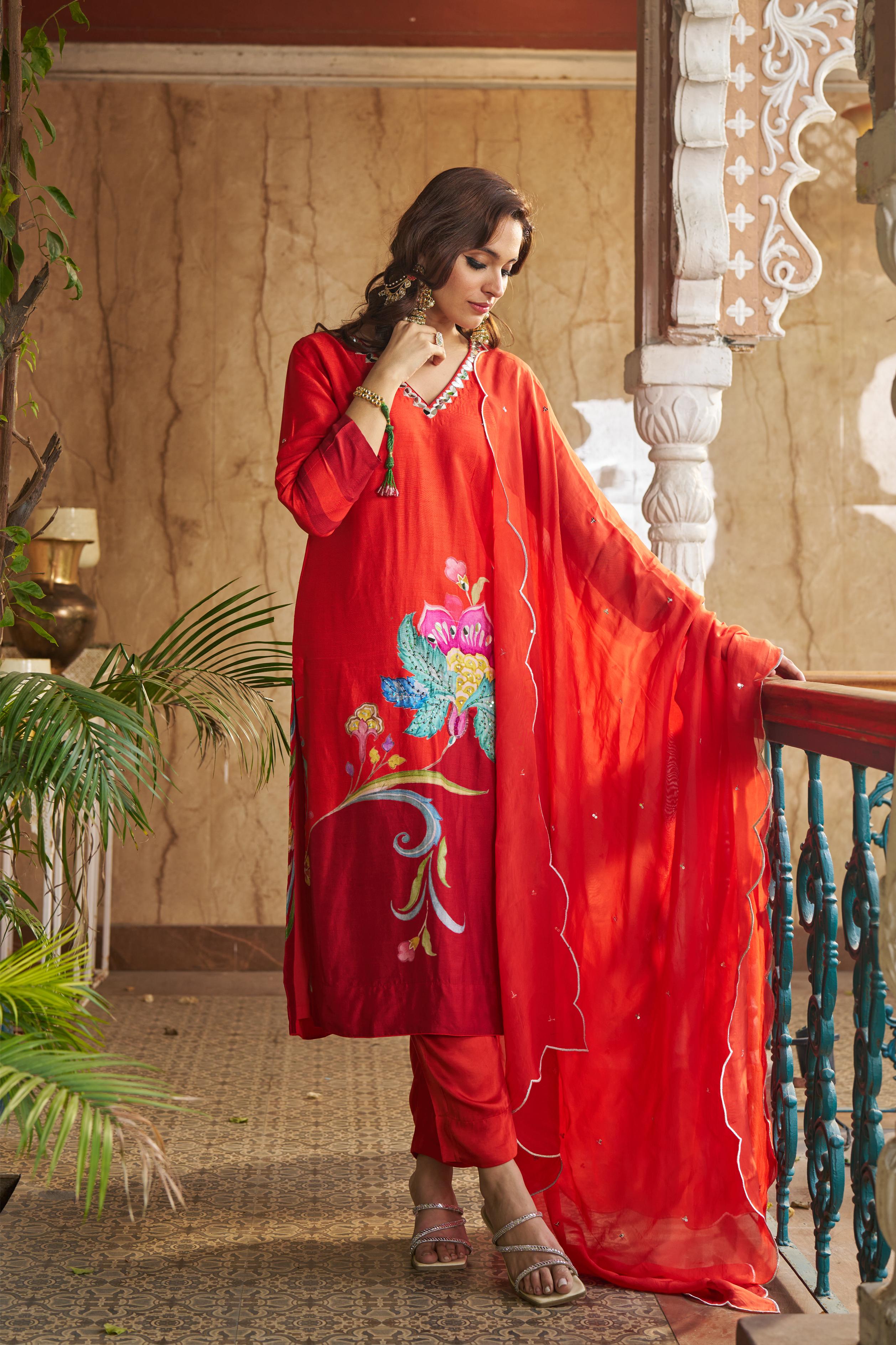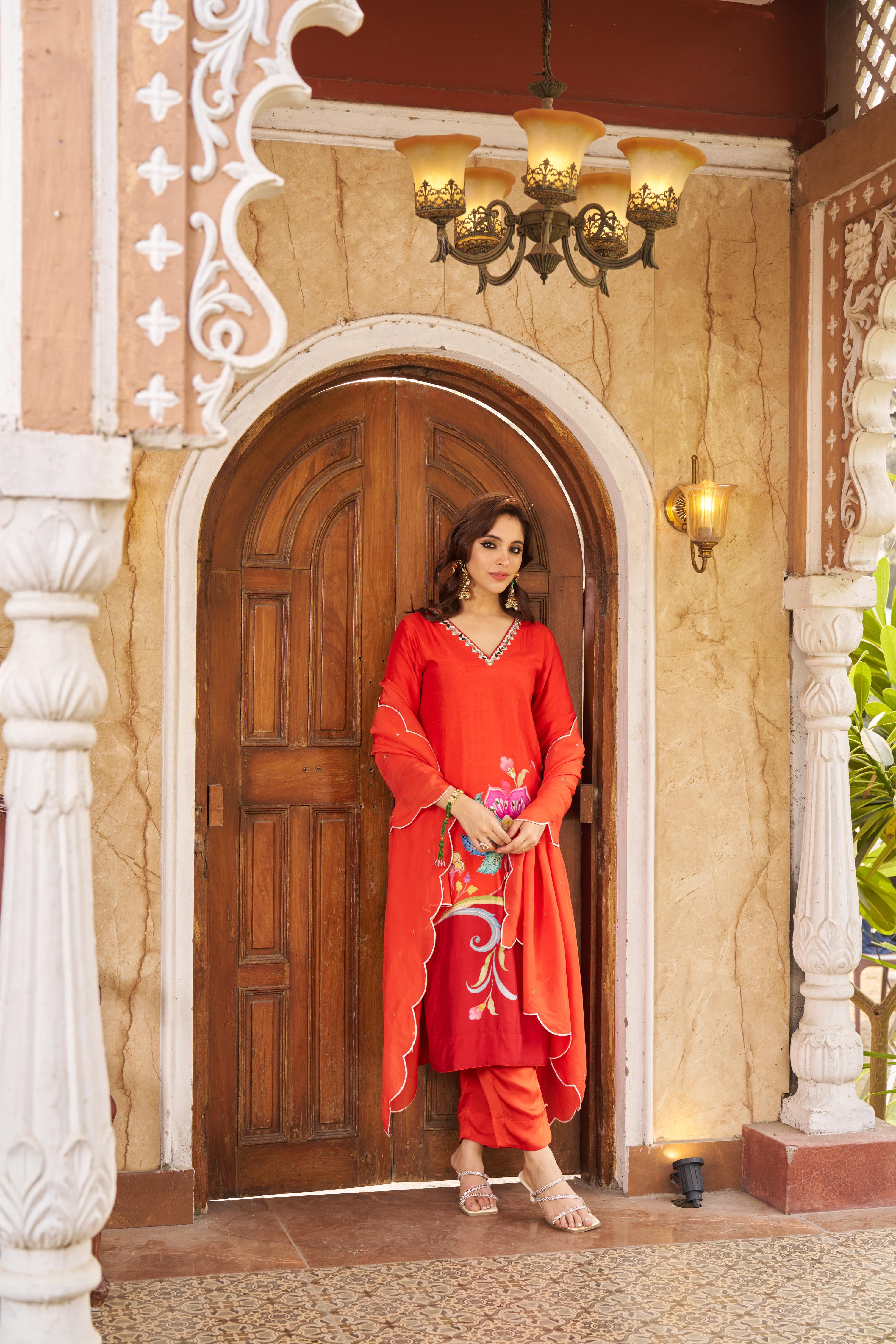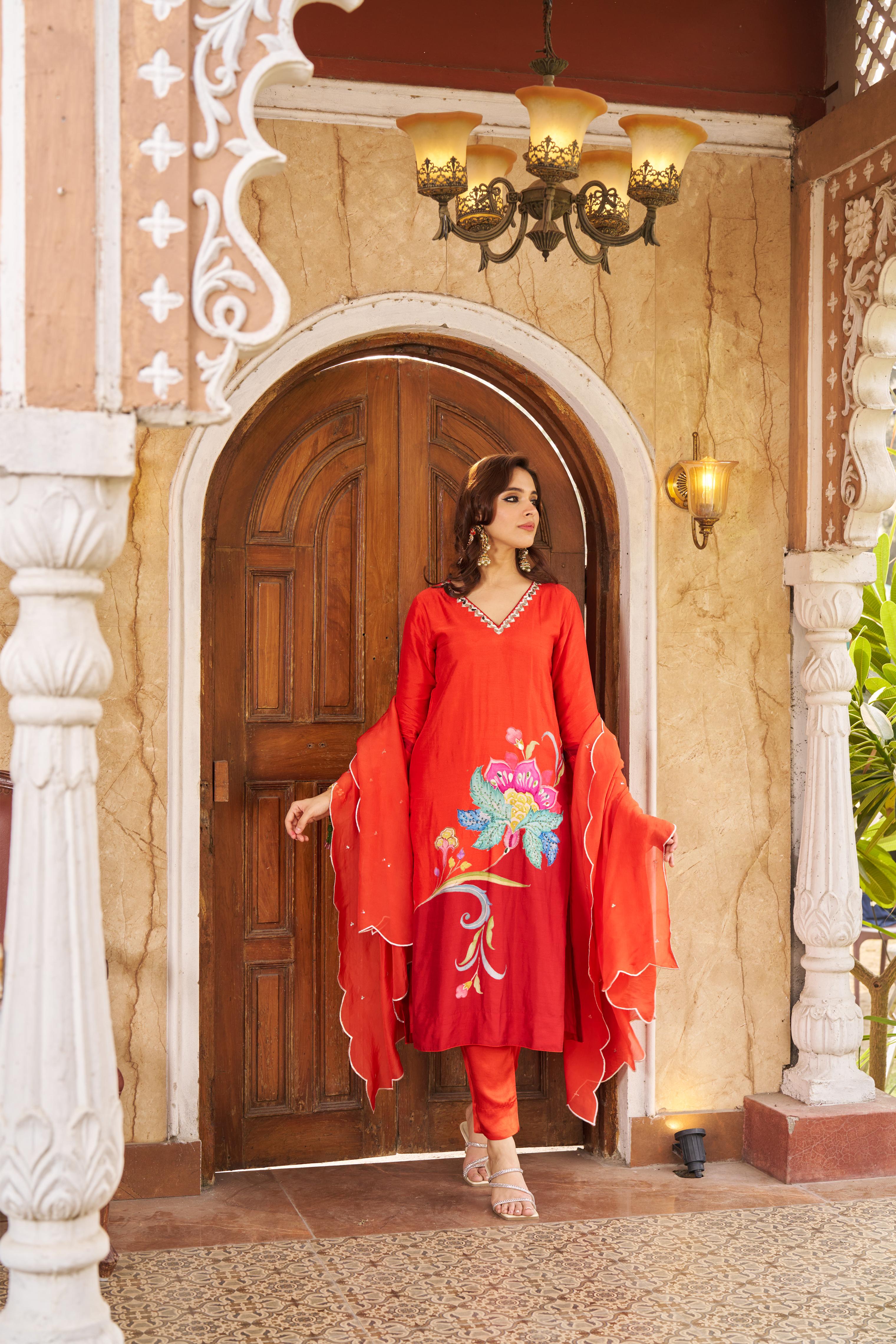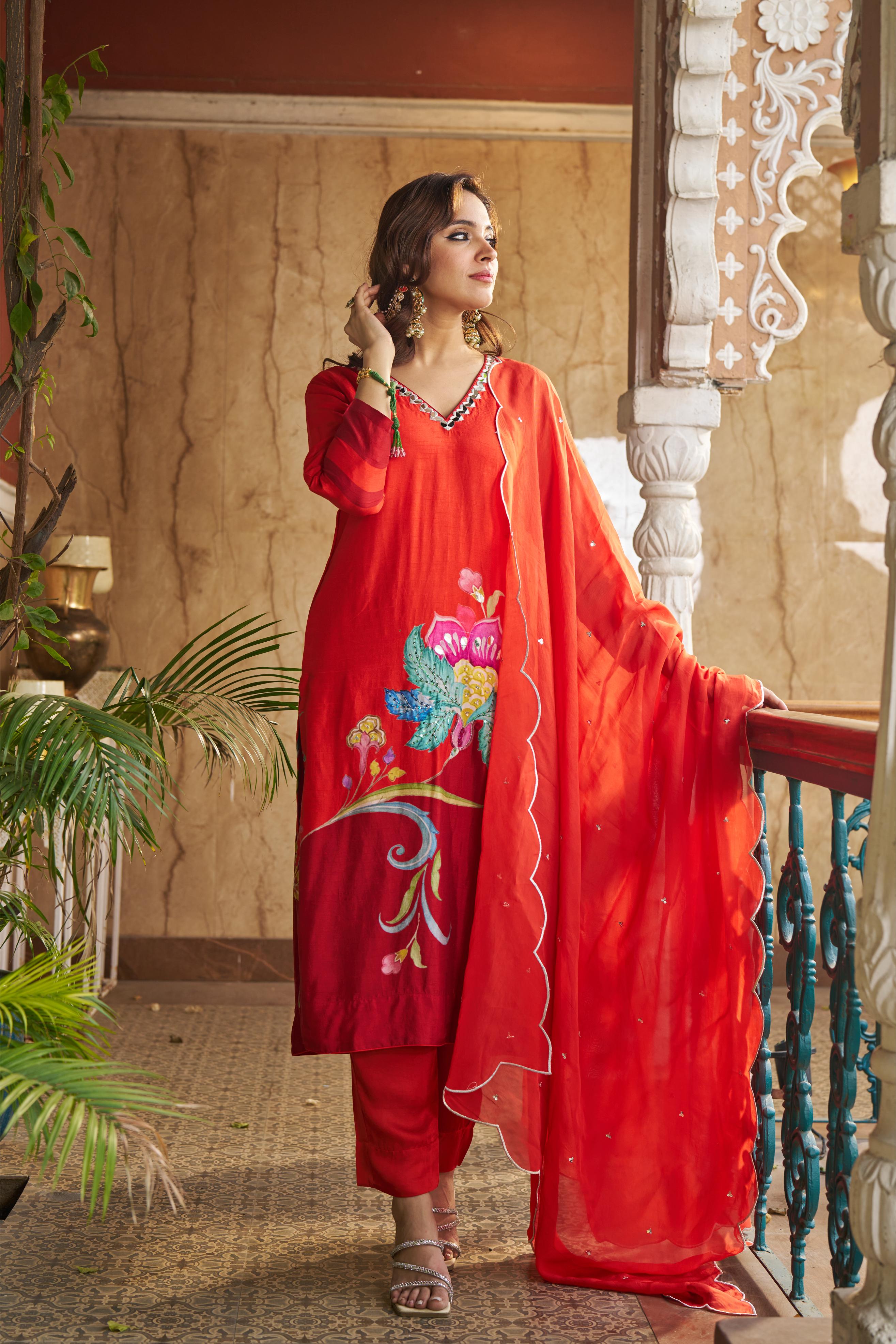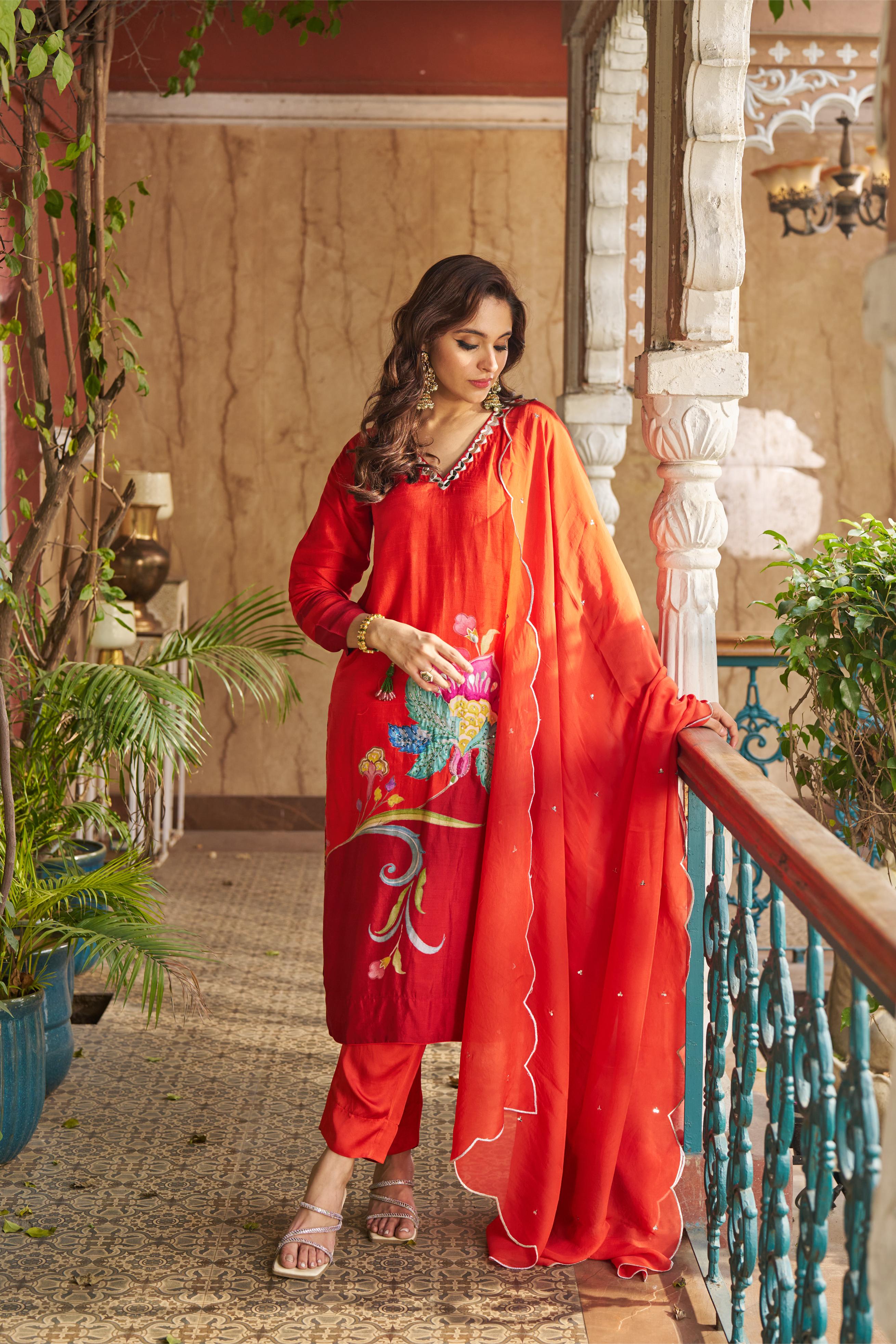Featuring Shirt Of Muslin Silk With Mirror And Cut Dana Work On Neckline And Front Of Shirt Paired With Modal Pants, Comes With Organza Dupatta With Sequince Work And Scalloped Edges.