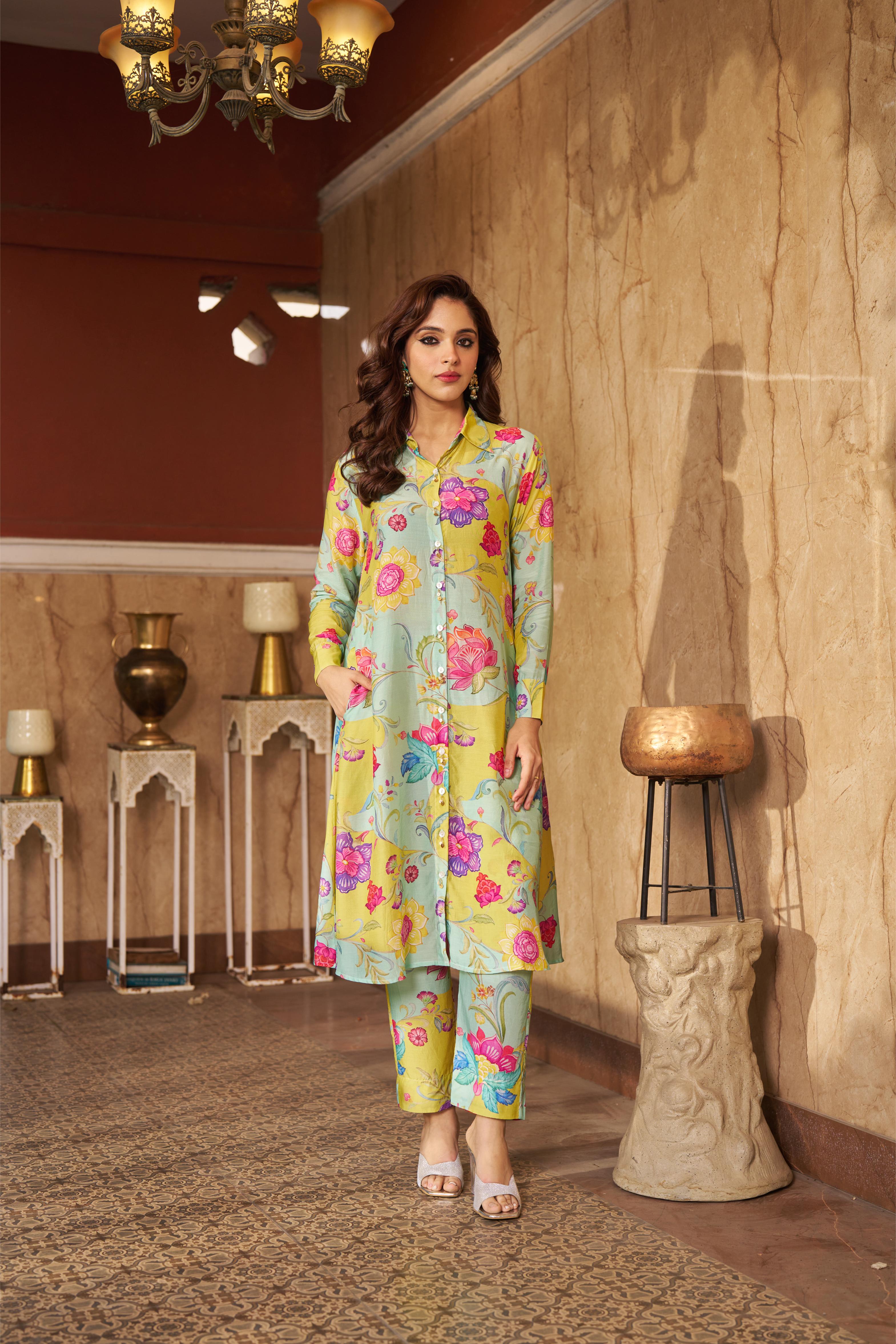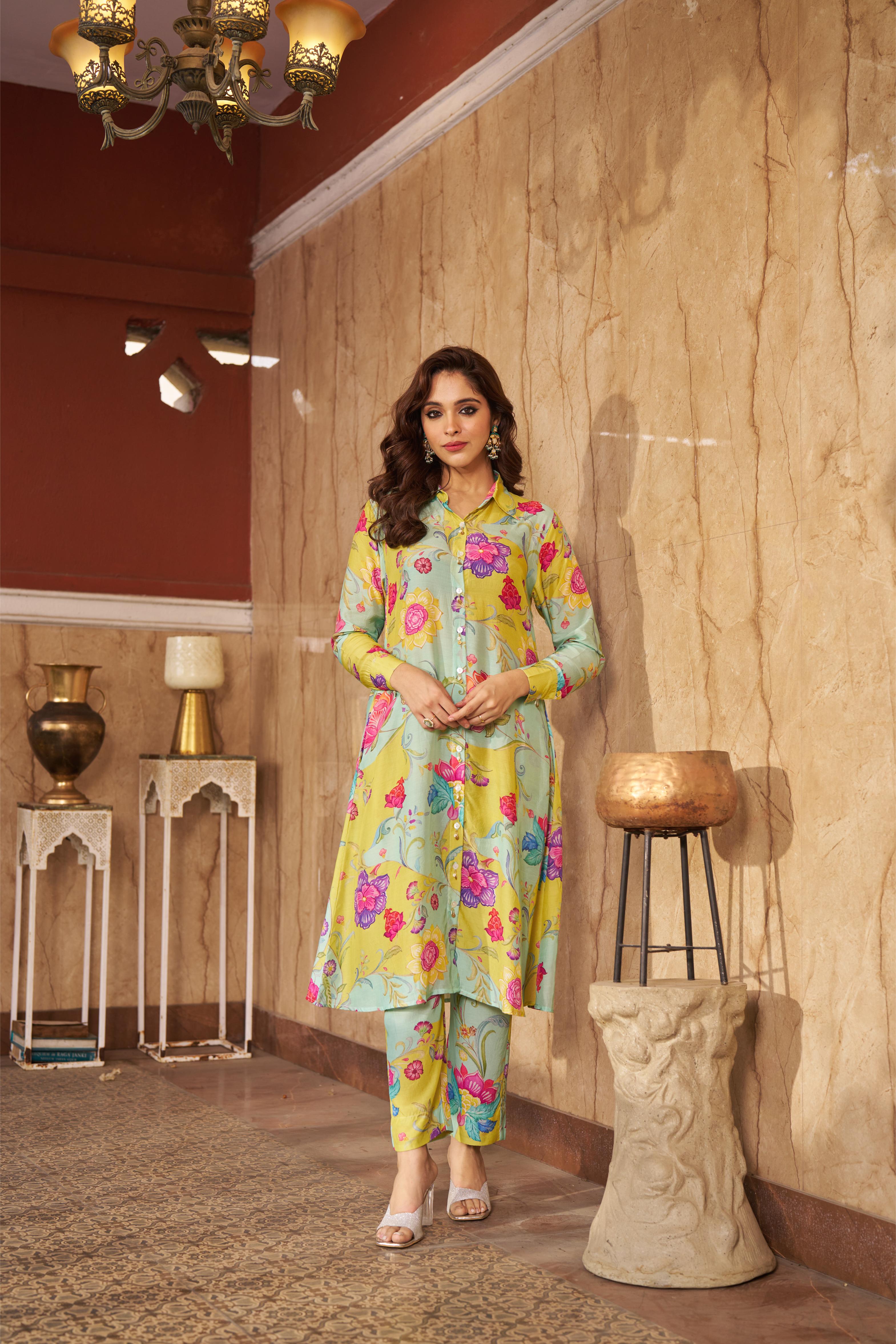 Featuring Digital Printed Floral Collar Style Front Button Style Kurta, Finished With Handmade Tassels, Paired With Straight Pants In Cotton Silk.