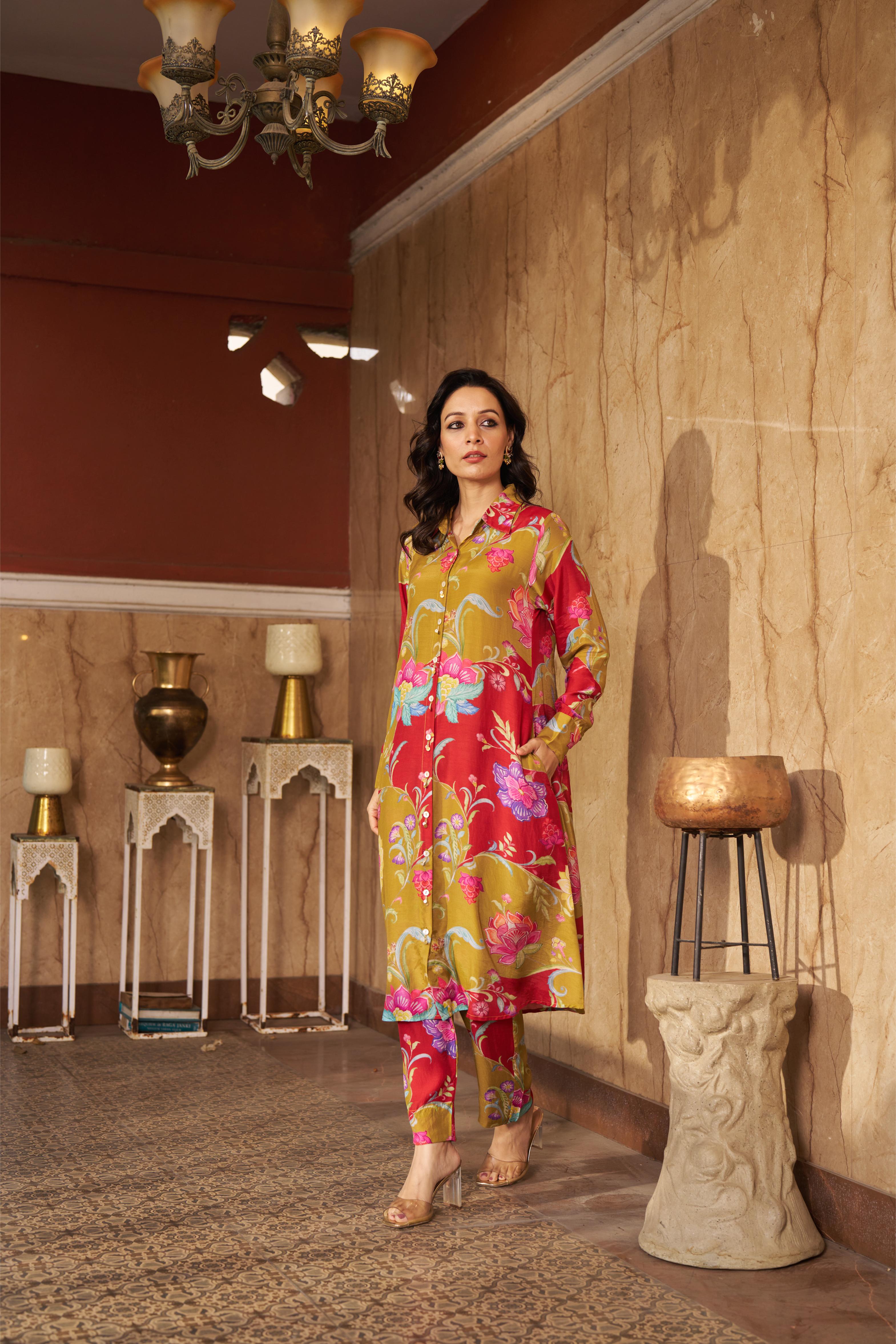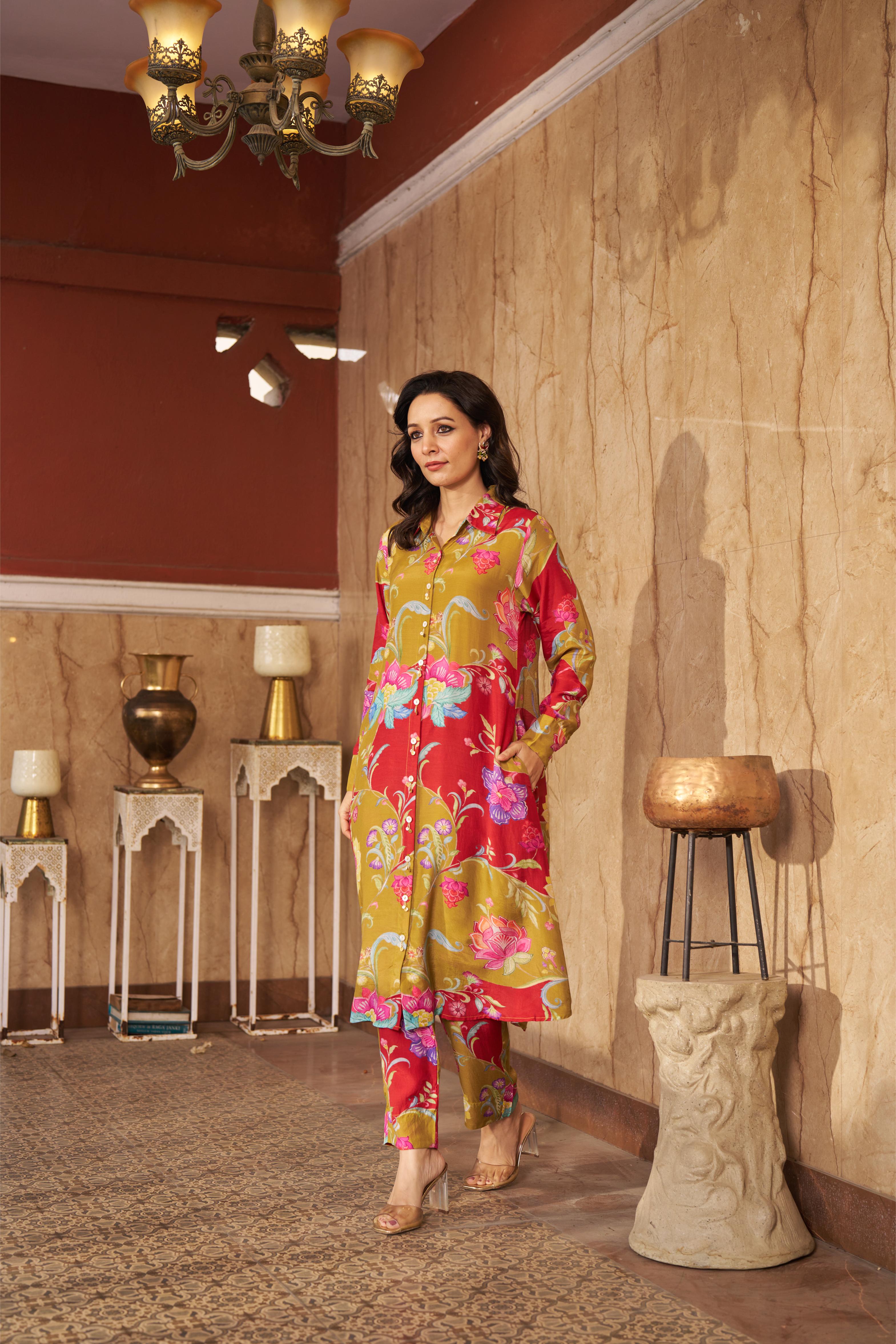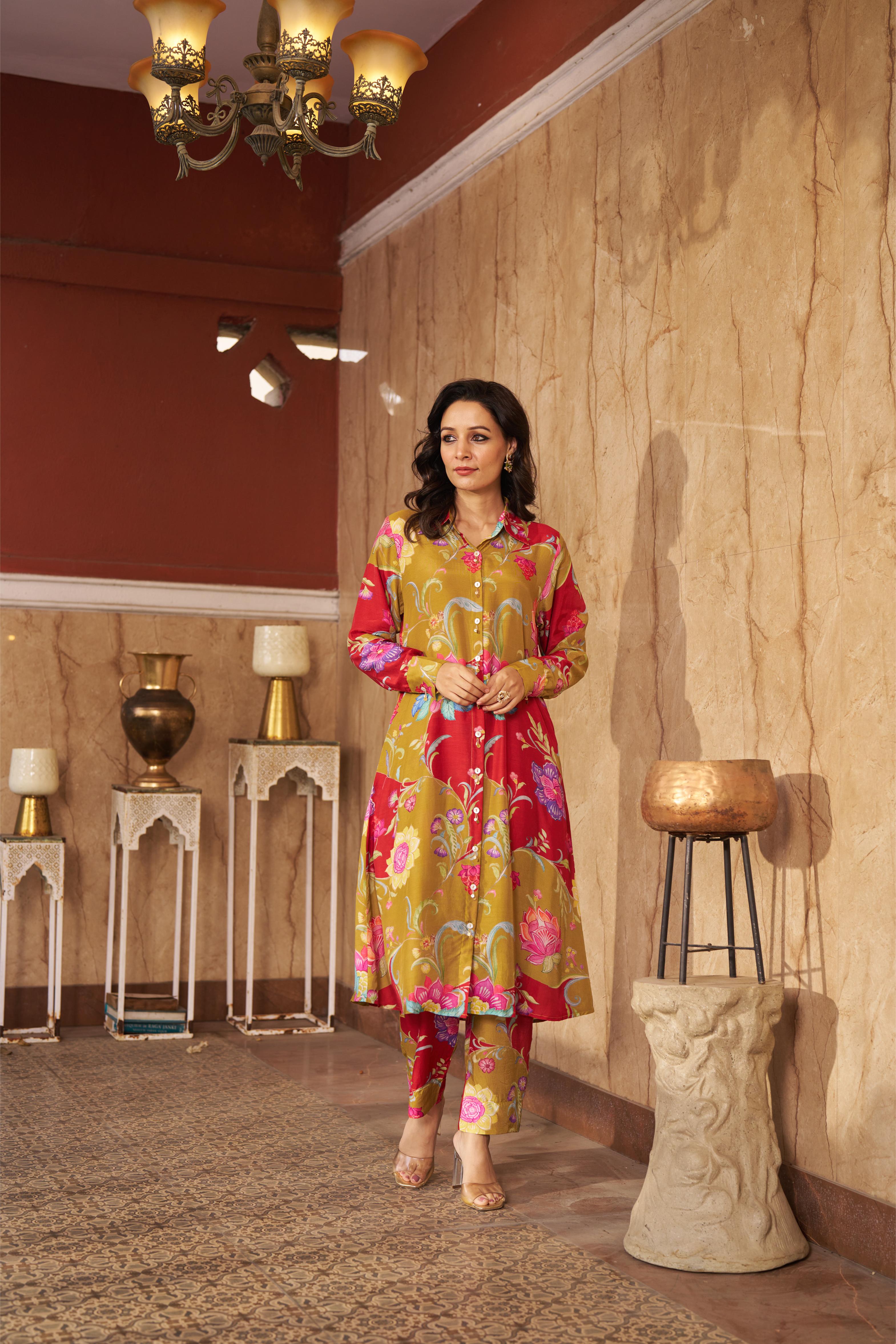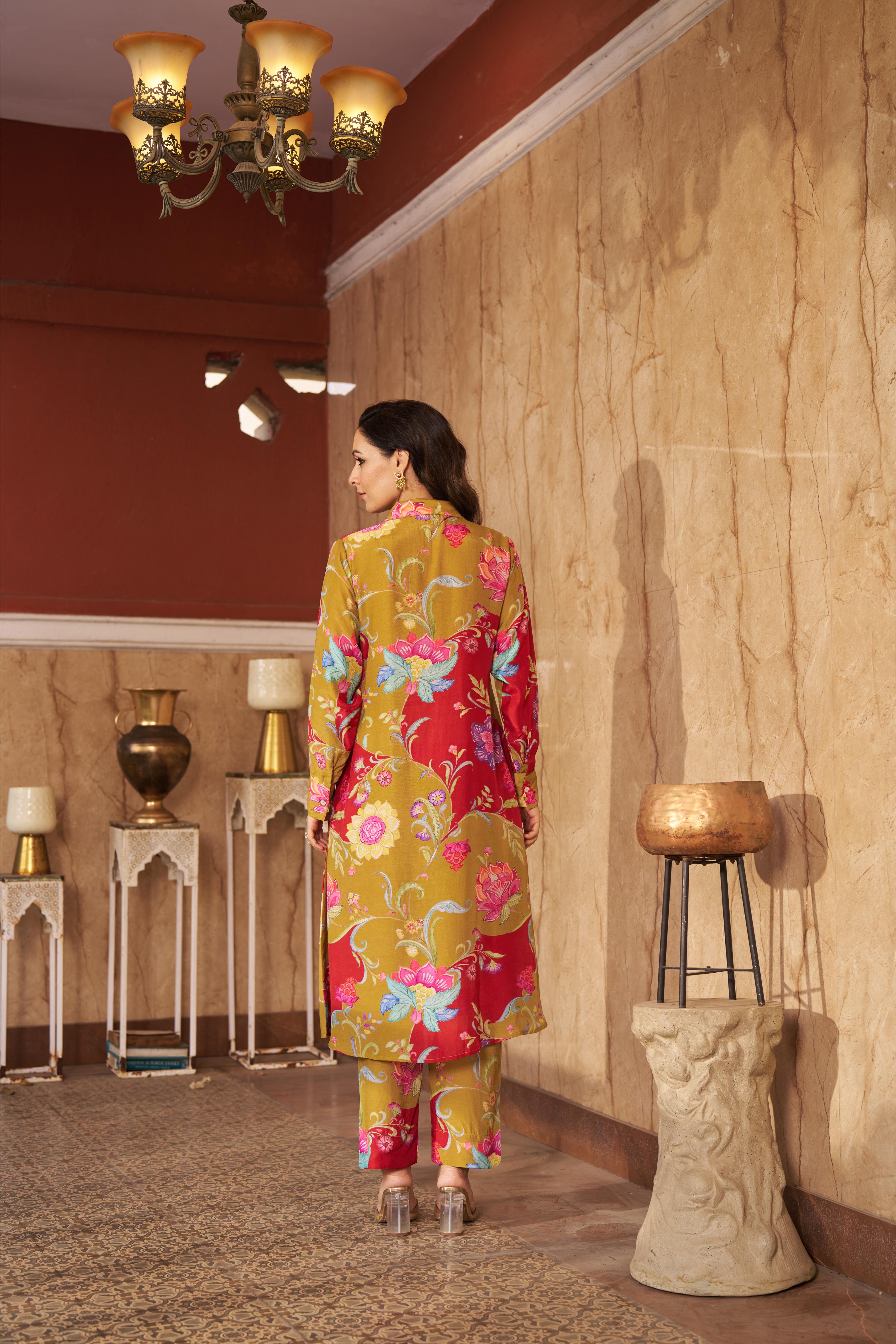 Featuring Digital Printed Floral Collar Style Front Button Style Kurta, Finished With Handmade Tassels, Paired With Straight Pants In Cotton Silk.
