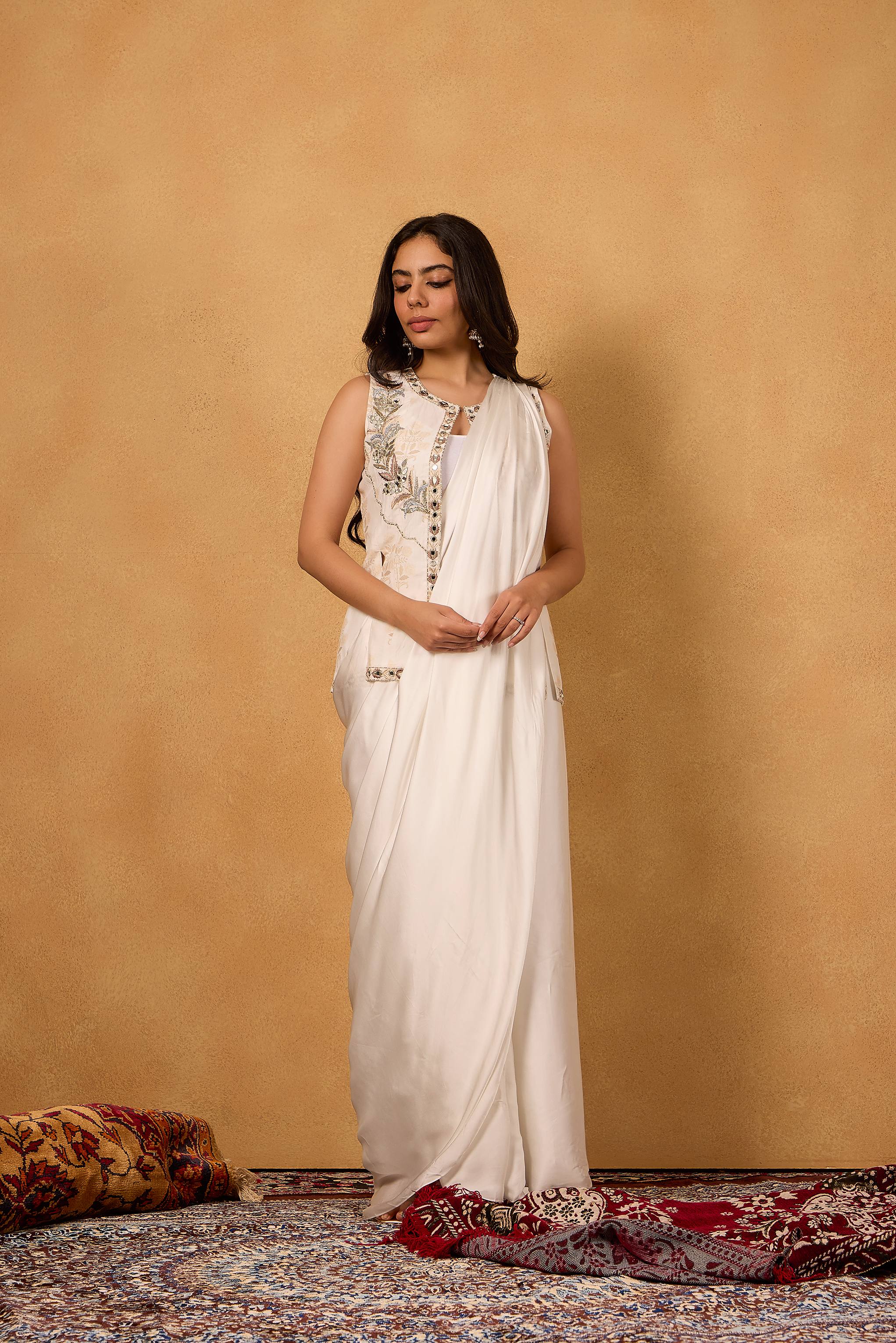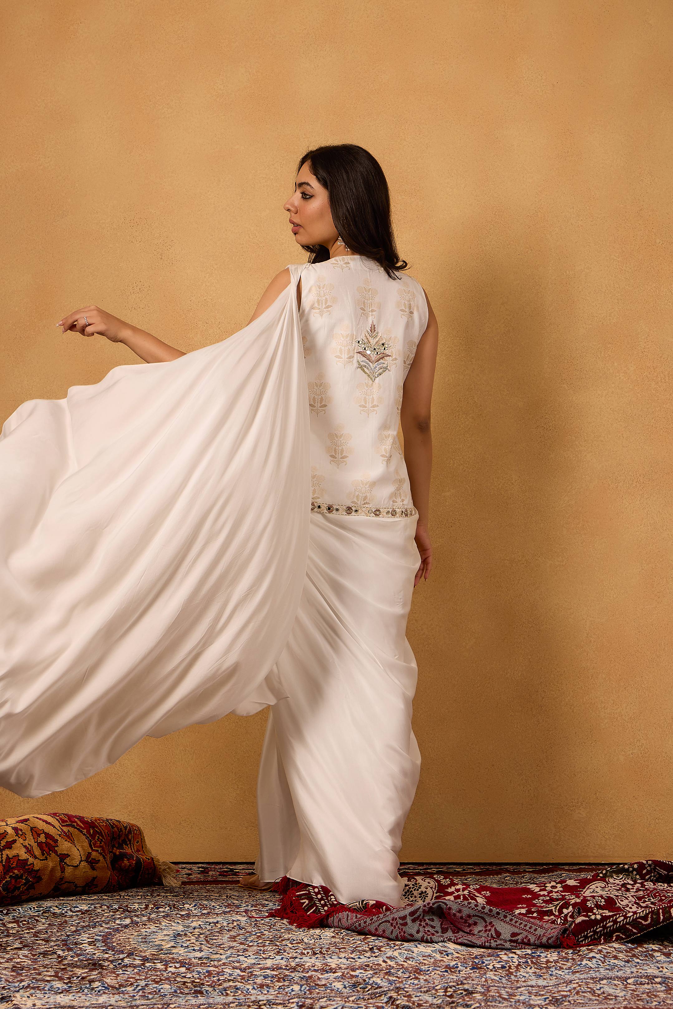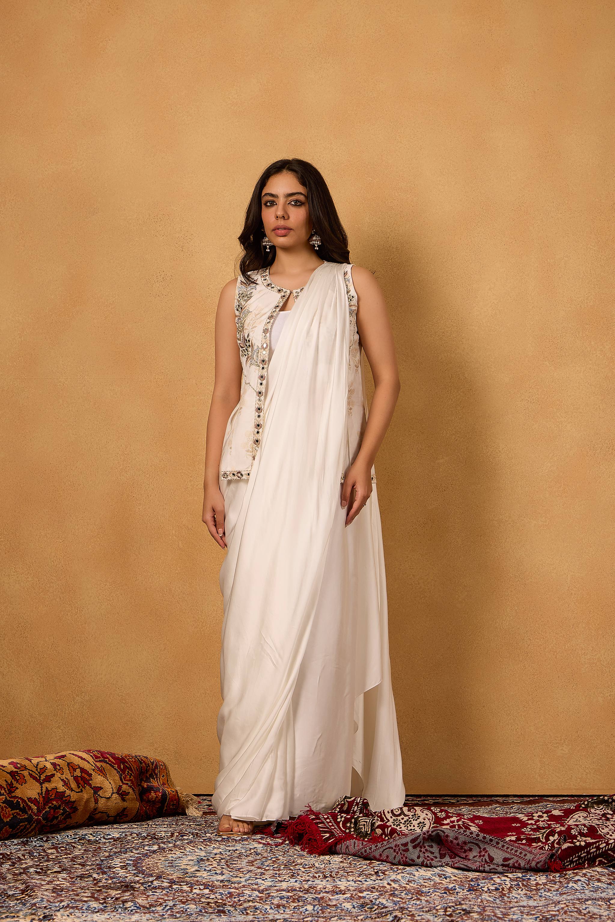 Crafted in a soothing white print and adorned with delicate hand embroidery on the jacket, the Dastan Drape Saree with Bustier and Jacket from our Firdos Collection embodies timeless refinement.