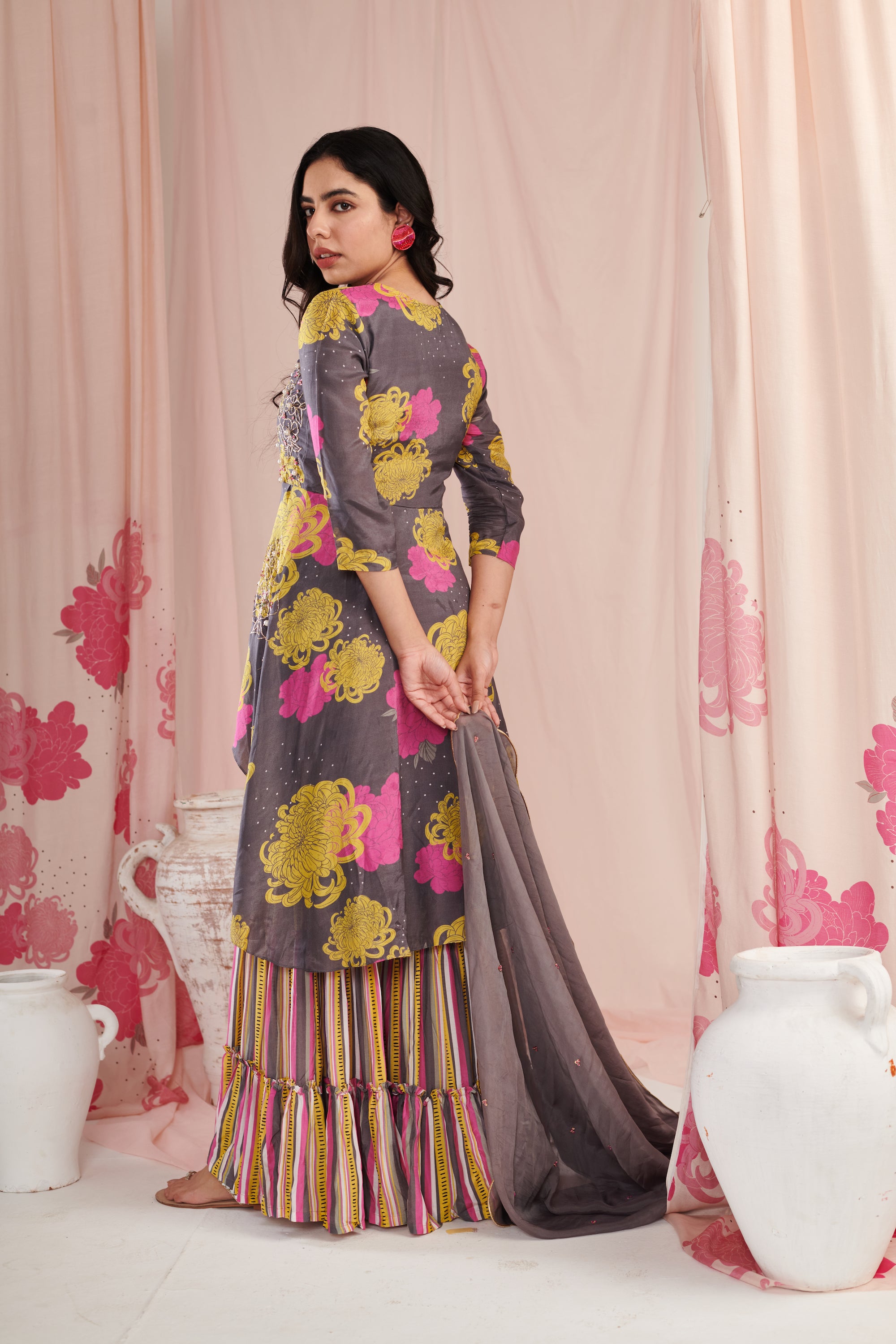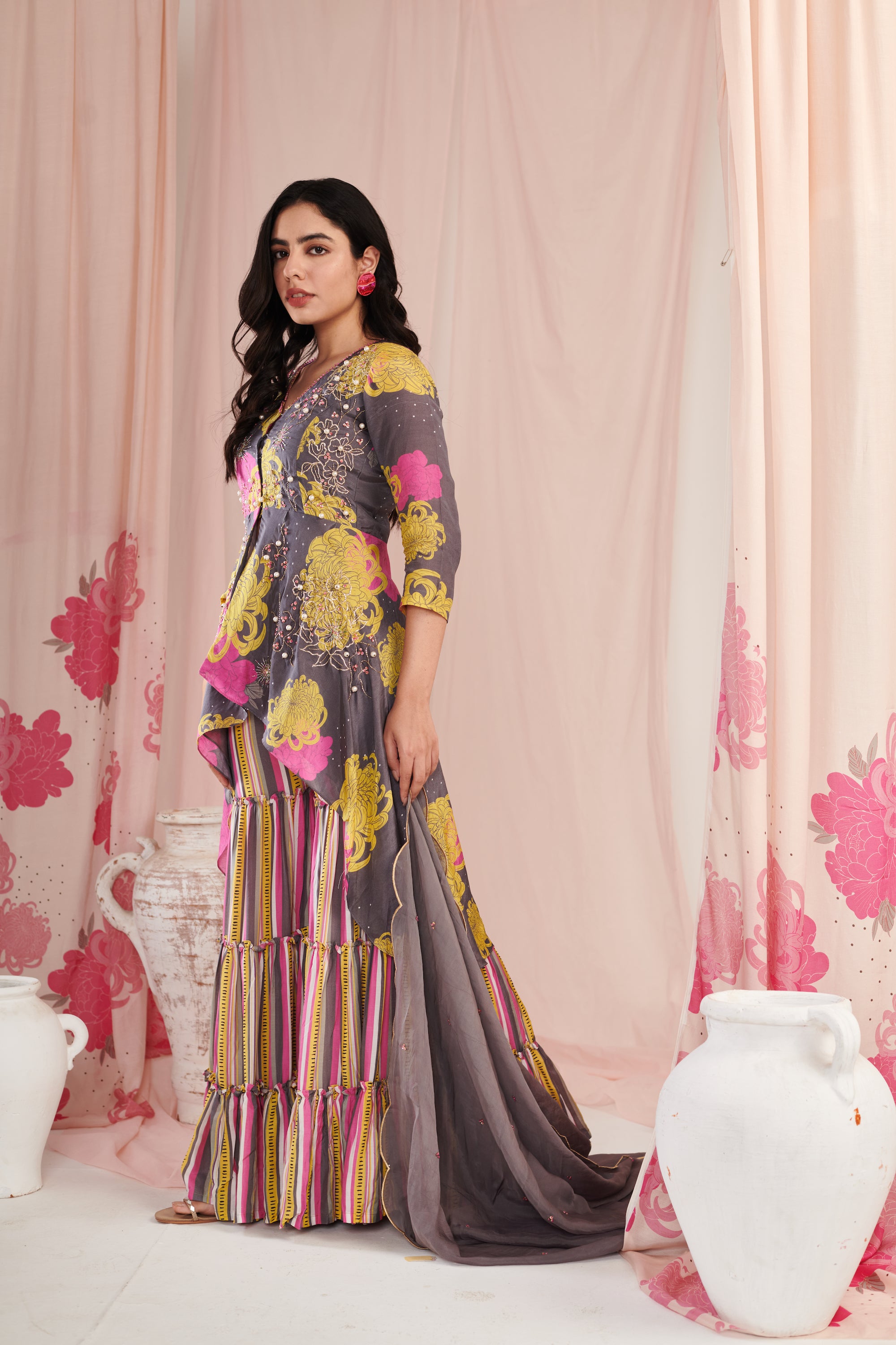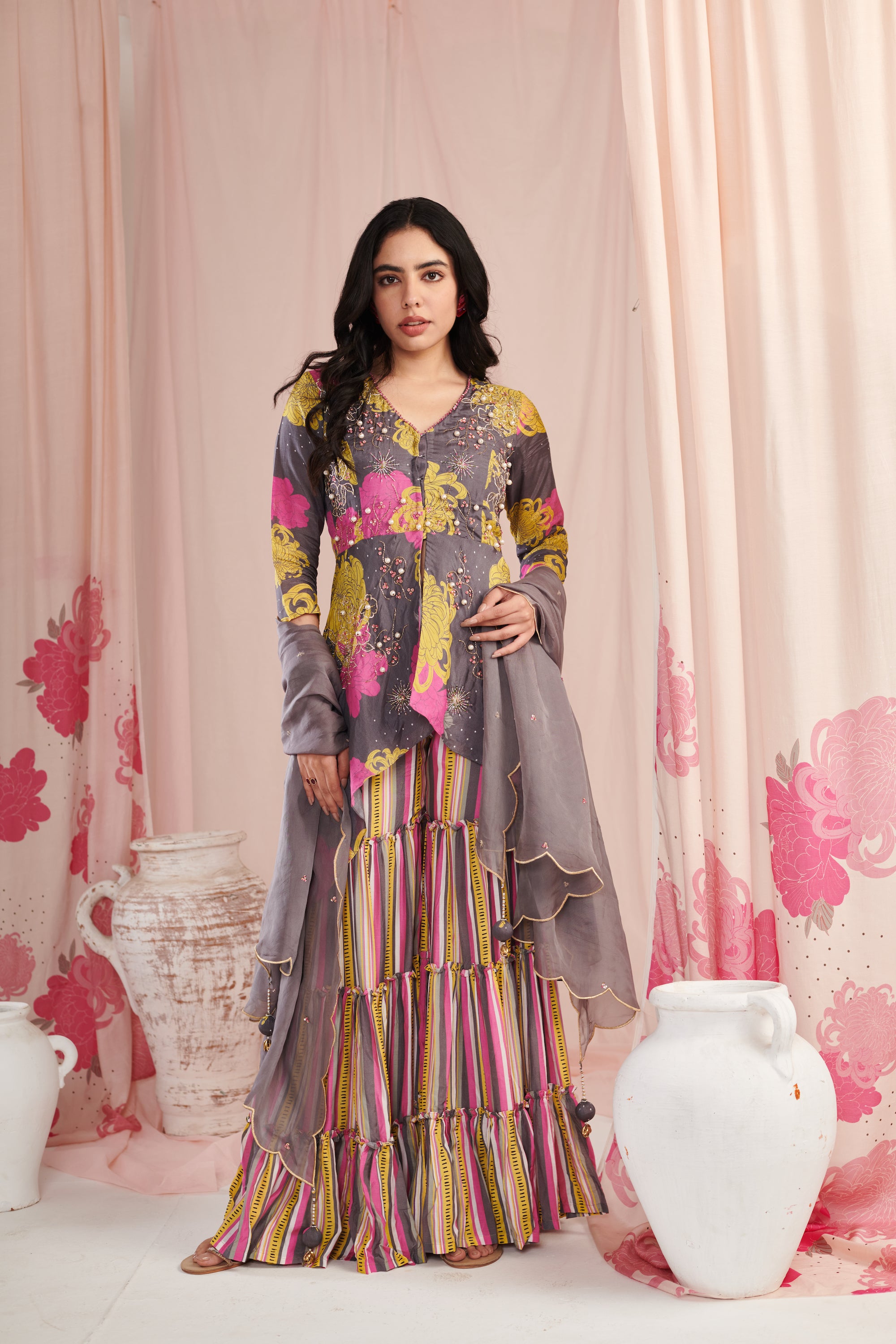 Digital printed cotton silk kurta with asymmetrical hemline with intricate hand embroidery. Paired with digital printed tiered sharara.