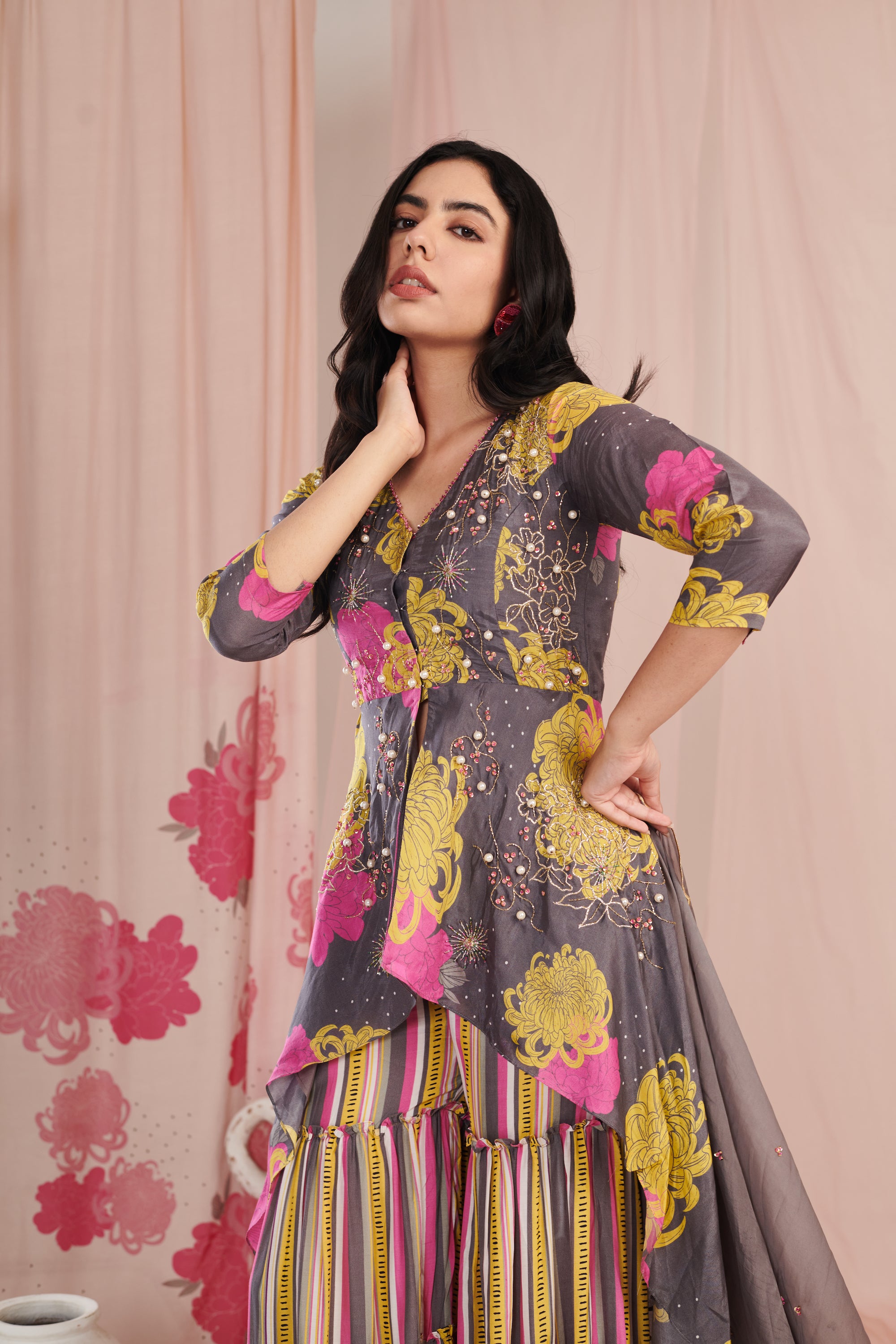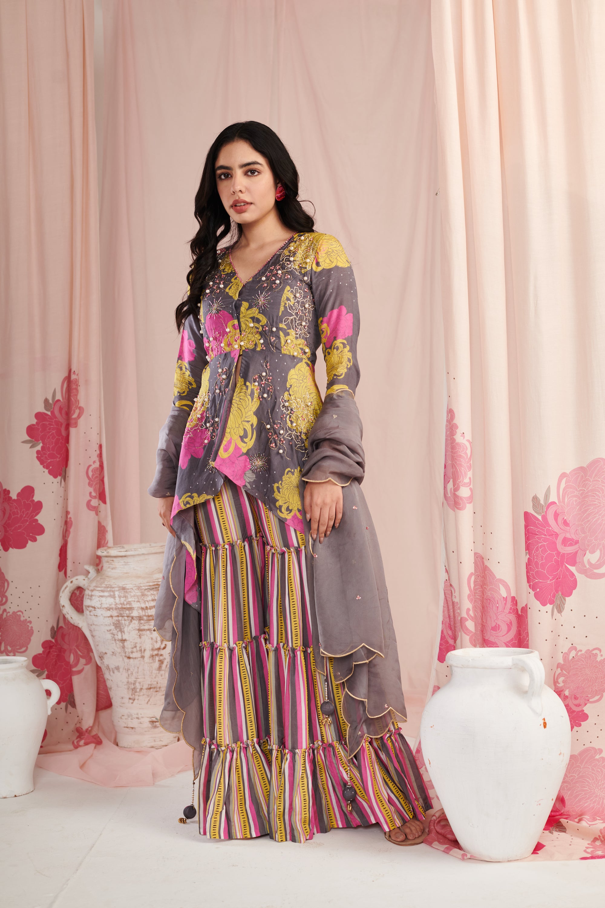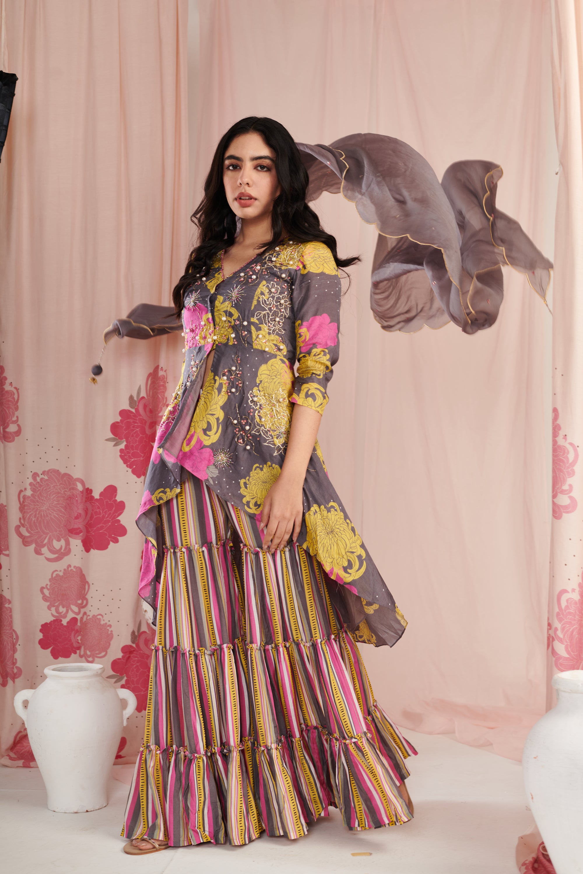 Digital printed cotton silk kurta with asymmetrical hemline with intricate hand embroidery. Paired with digital printed tiered sharara.