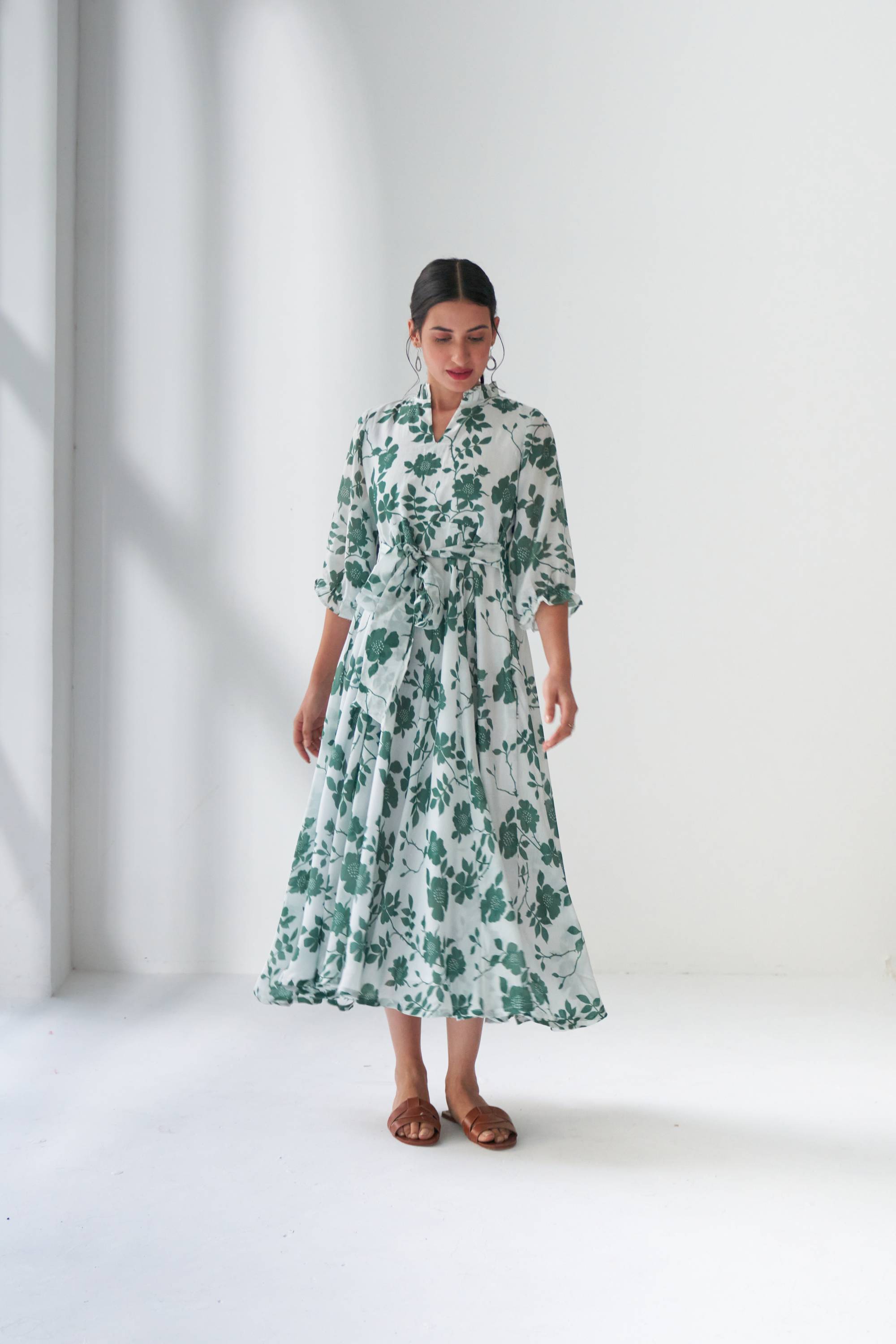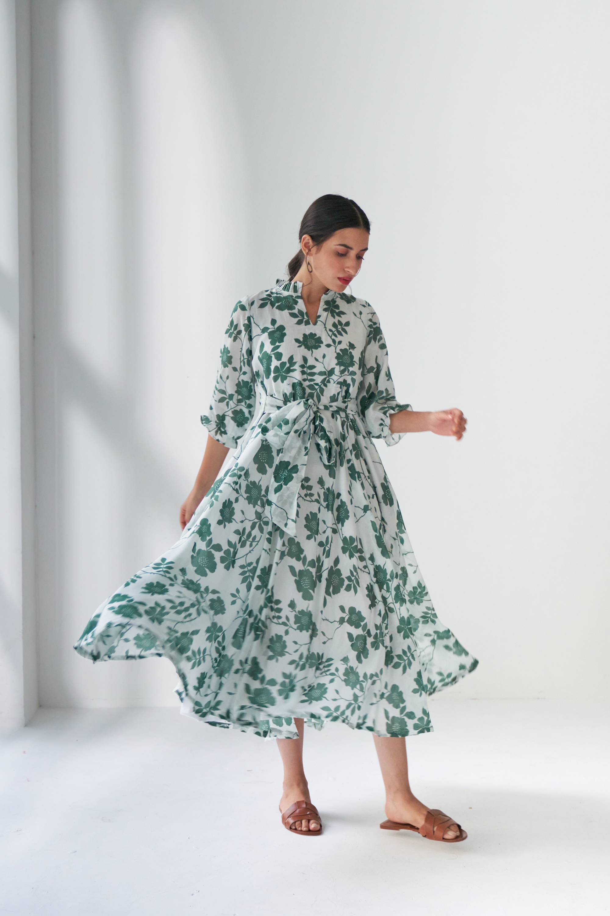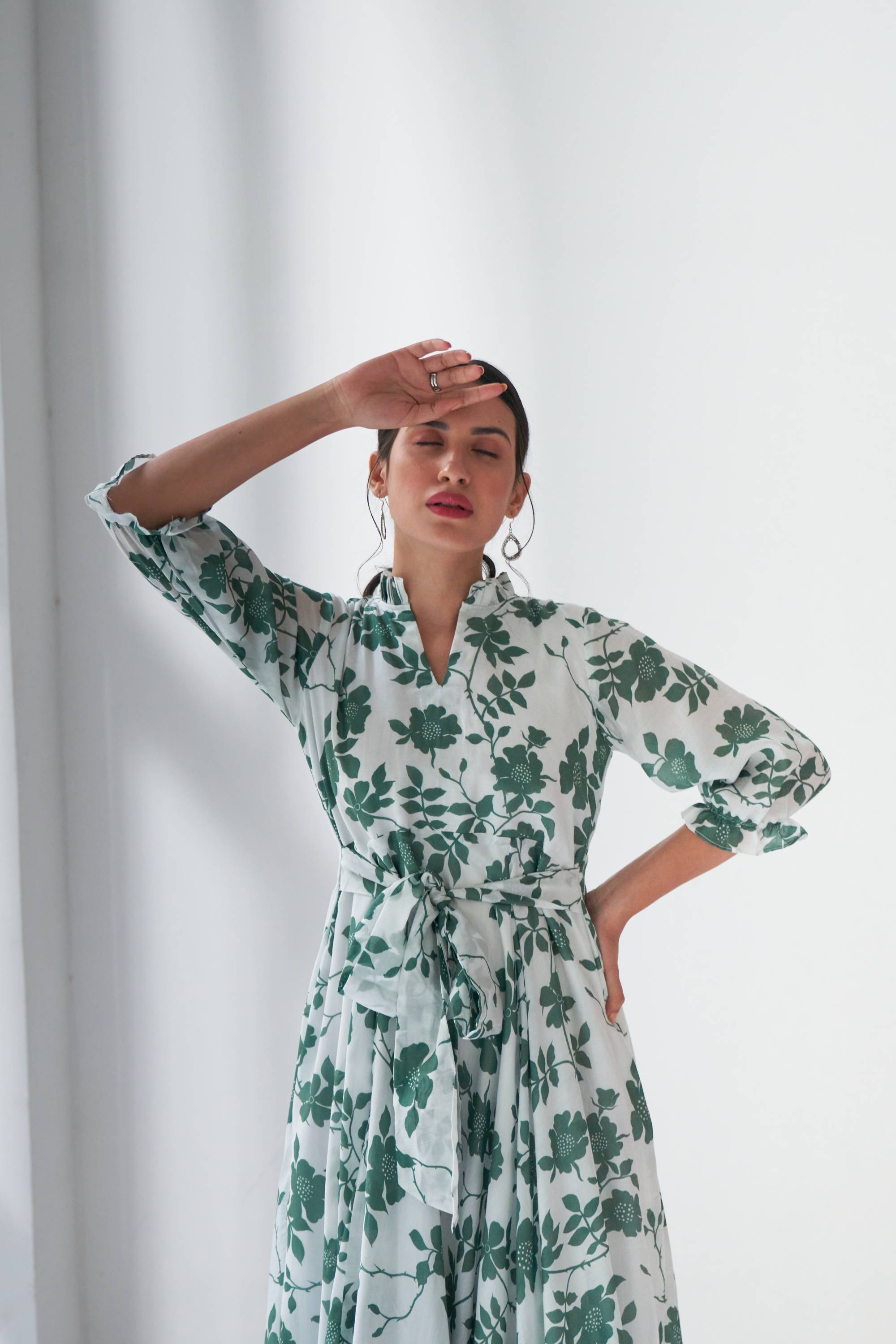 Our Lovestruck flared dress in cotton silk with beautiful bold floral digital print with a attached belt for fitting. This is dress is quintessence for summer time.