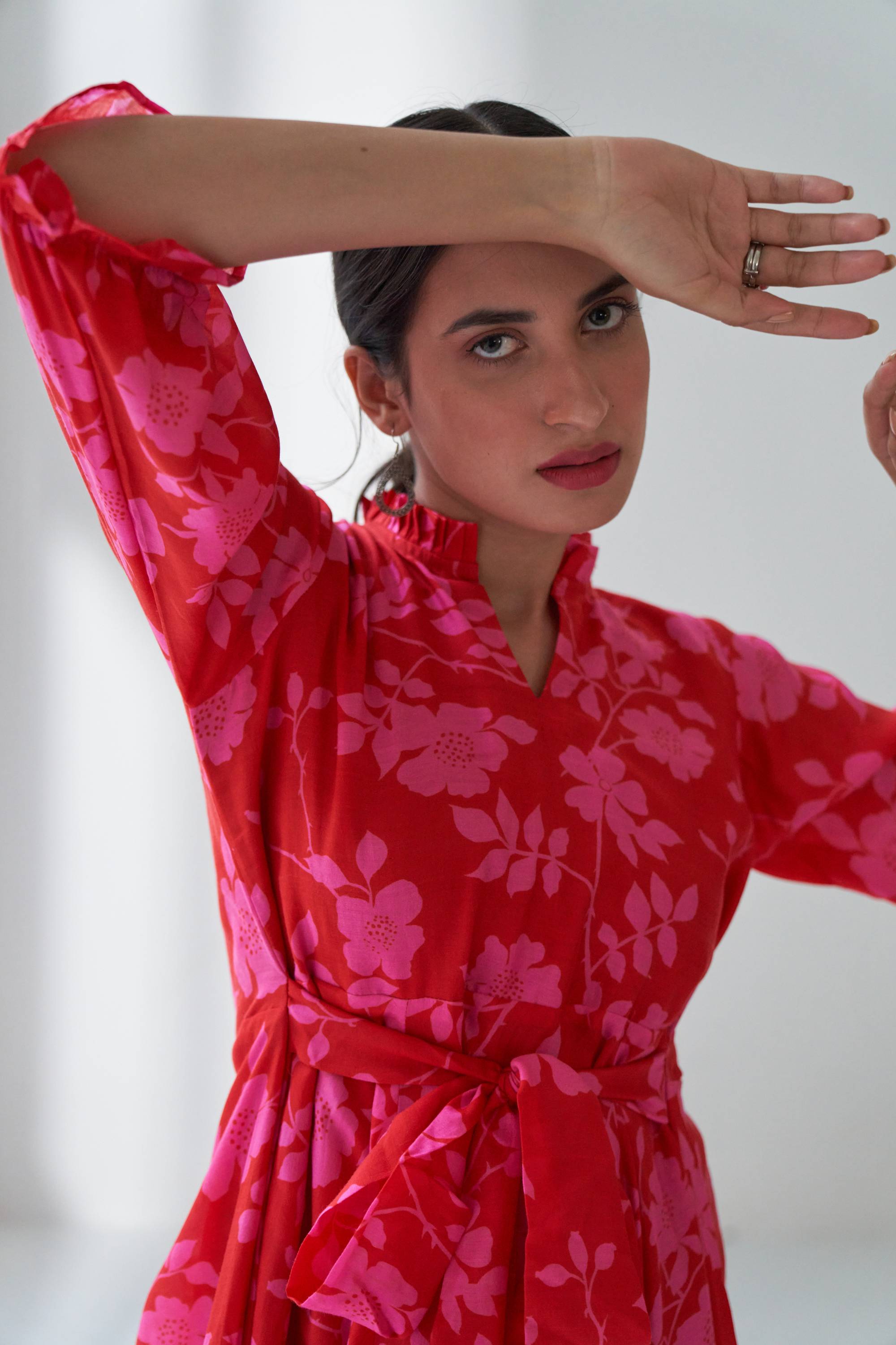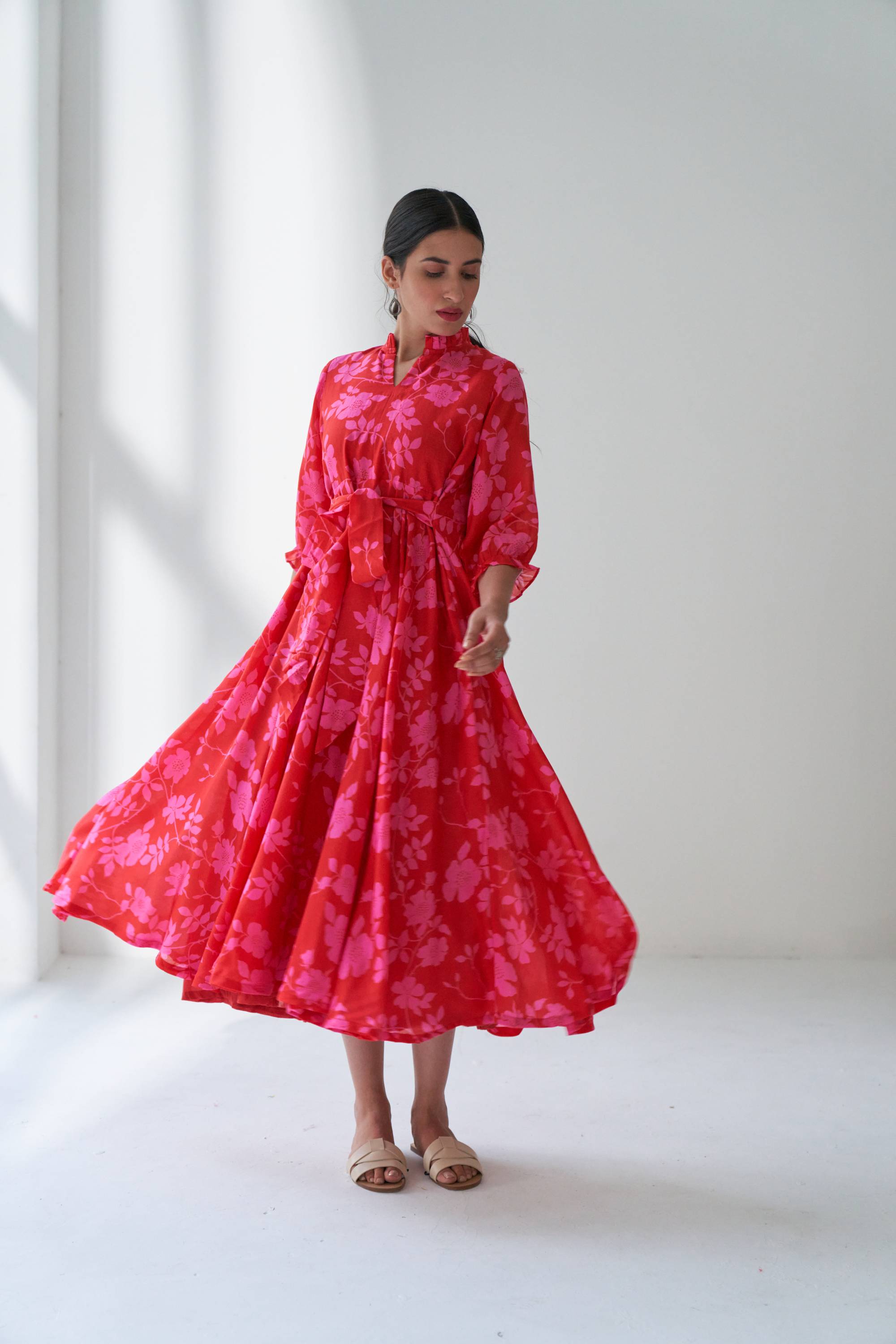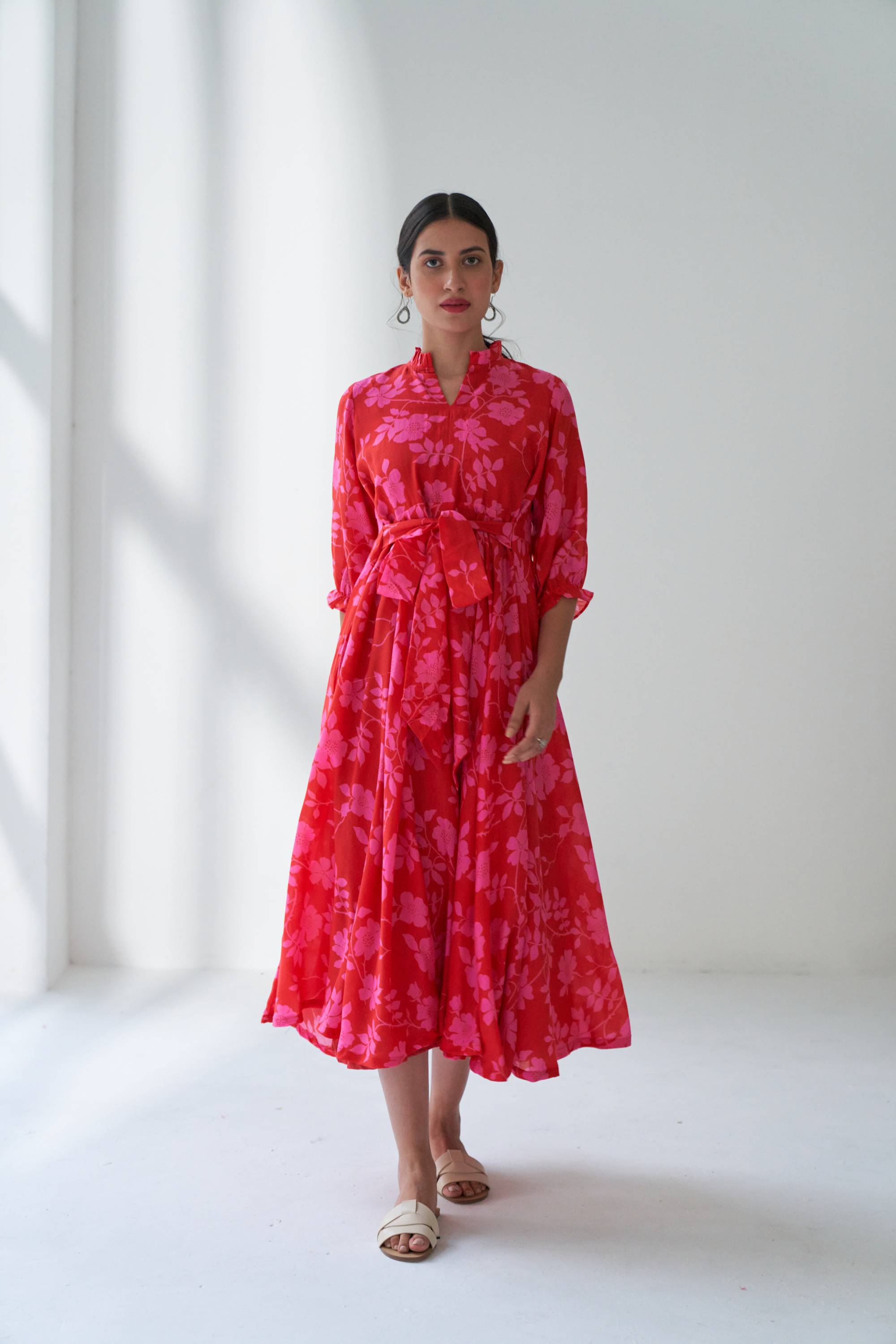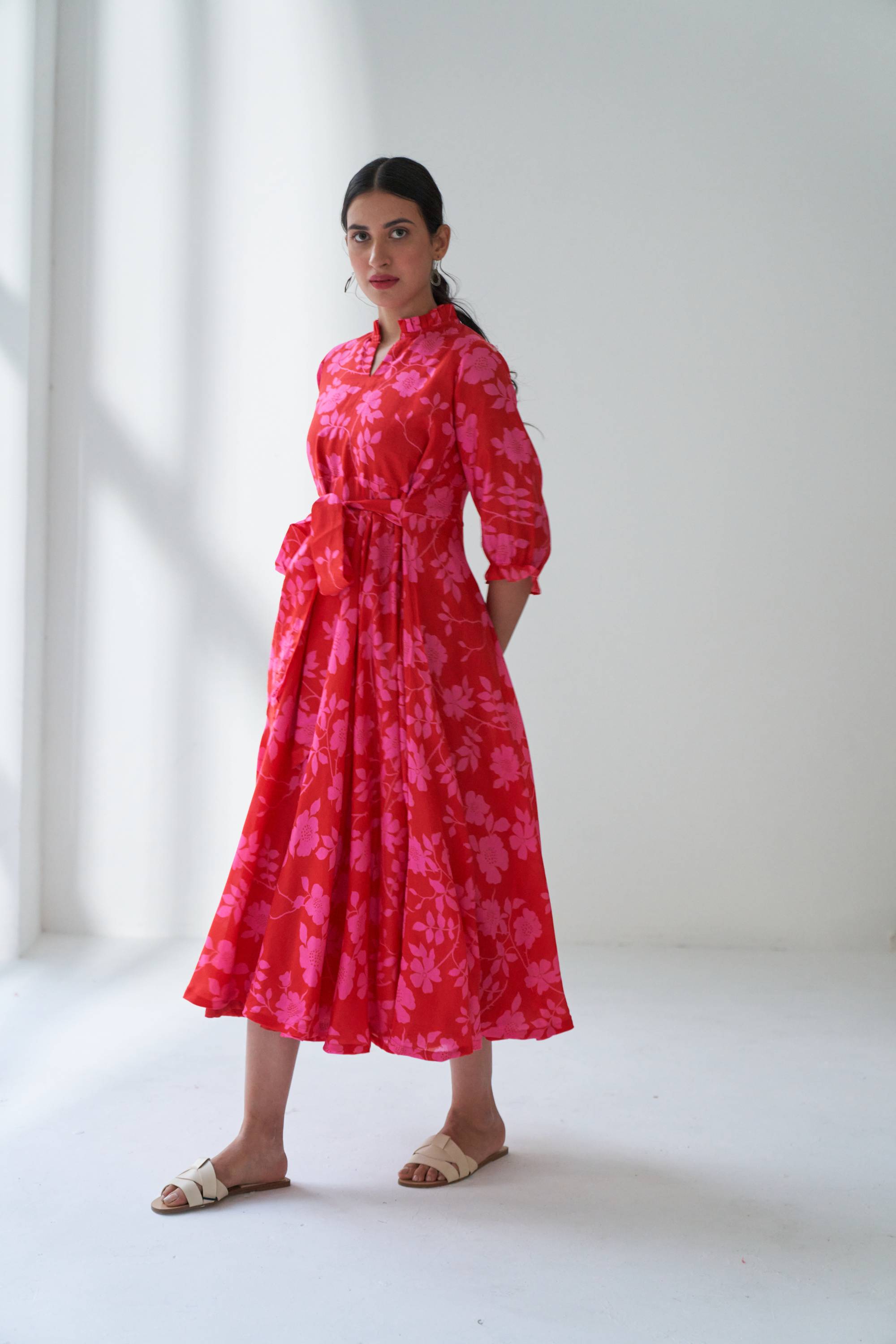 Our Lovestruck flared dress in cotton silk with beautiful bold floral digital print with a attached belt for fitting. This is dress is quintessence for summer time.